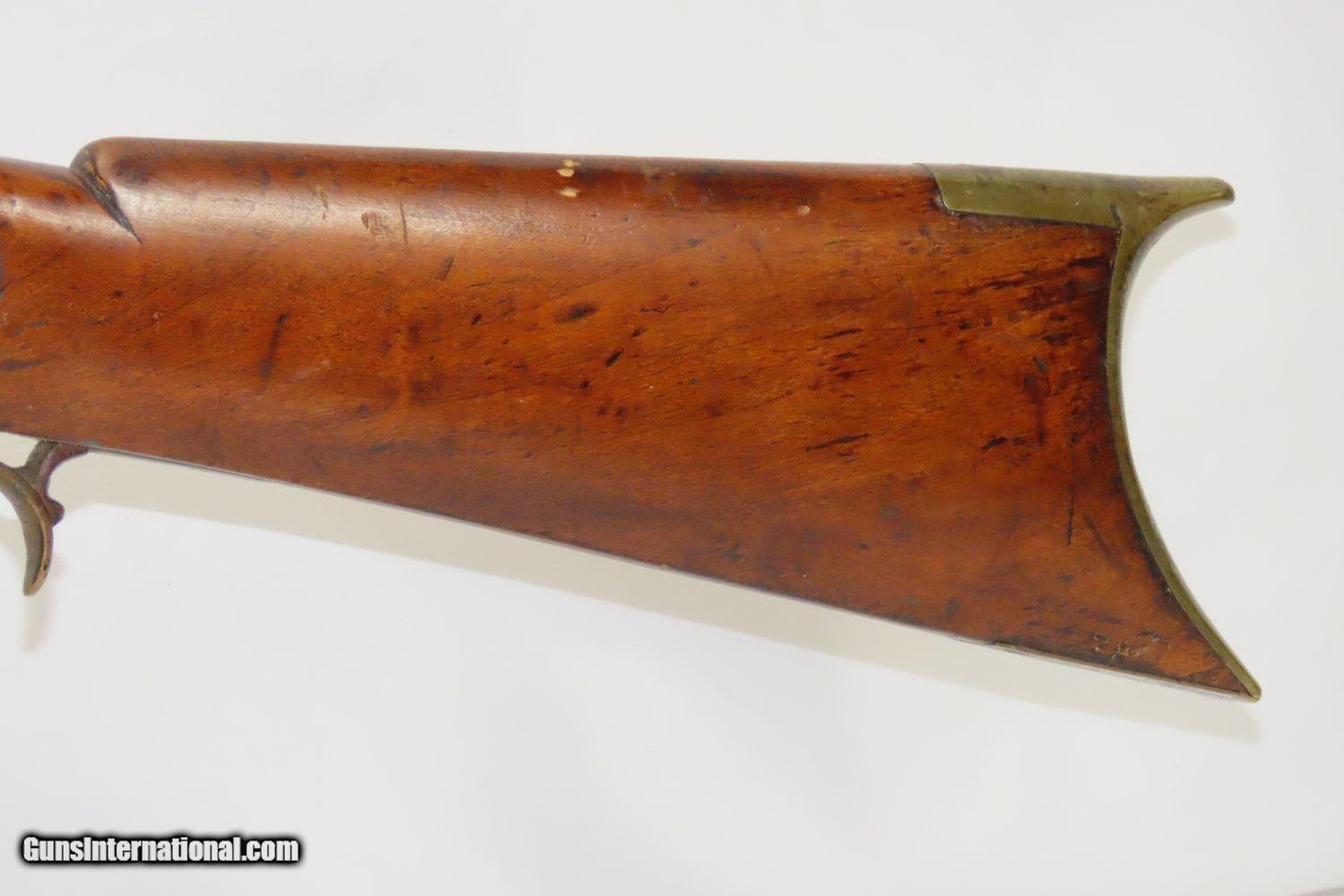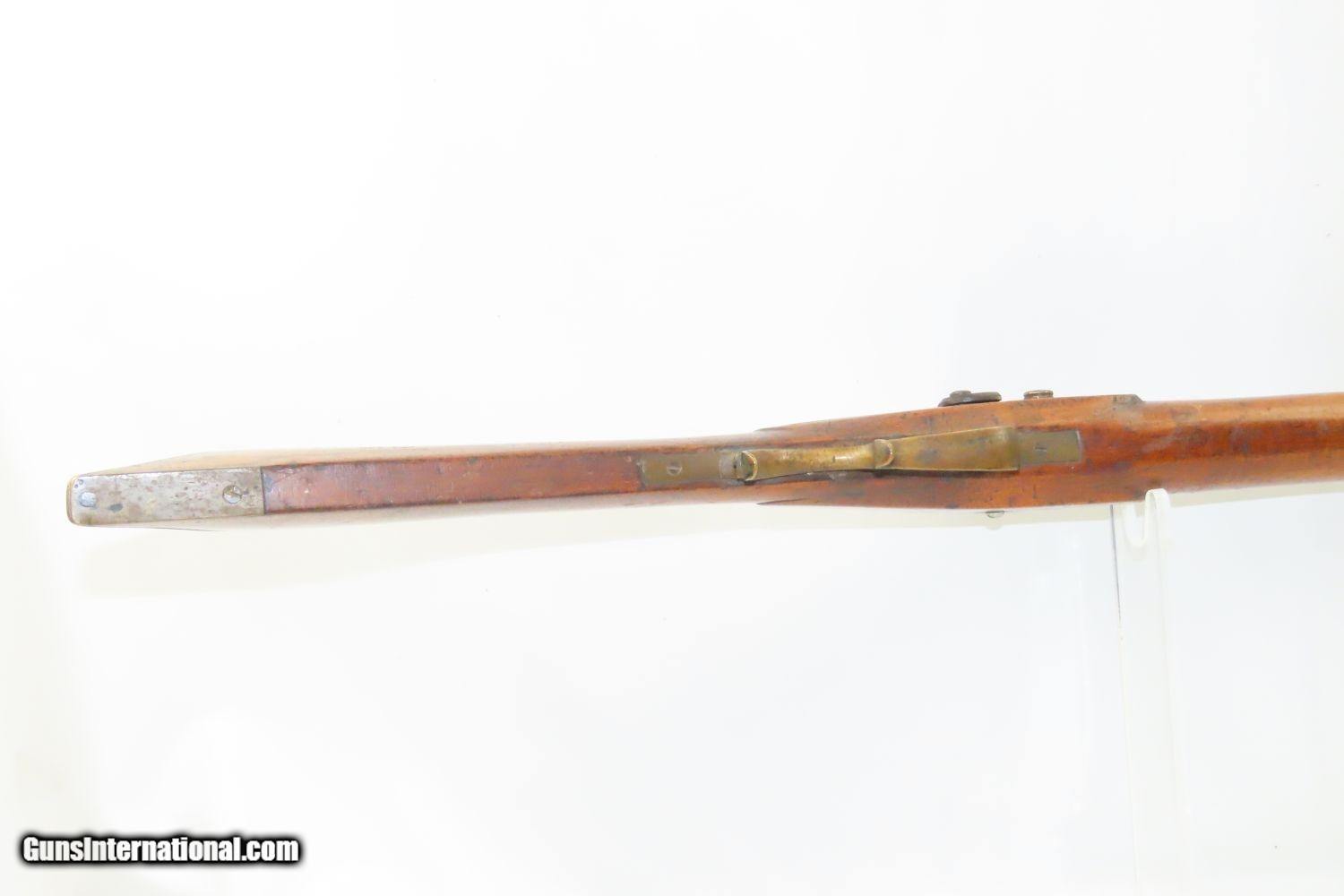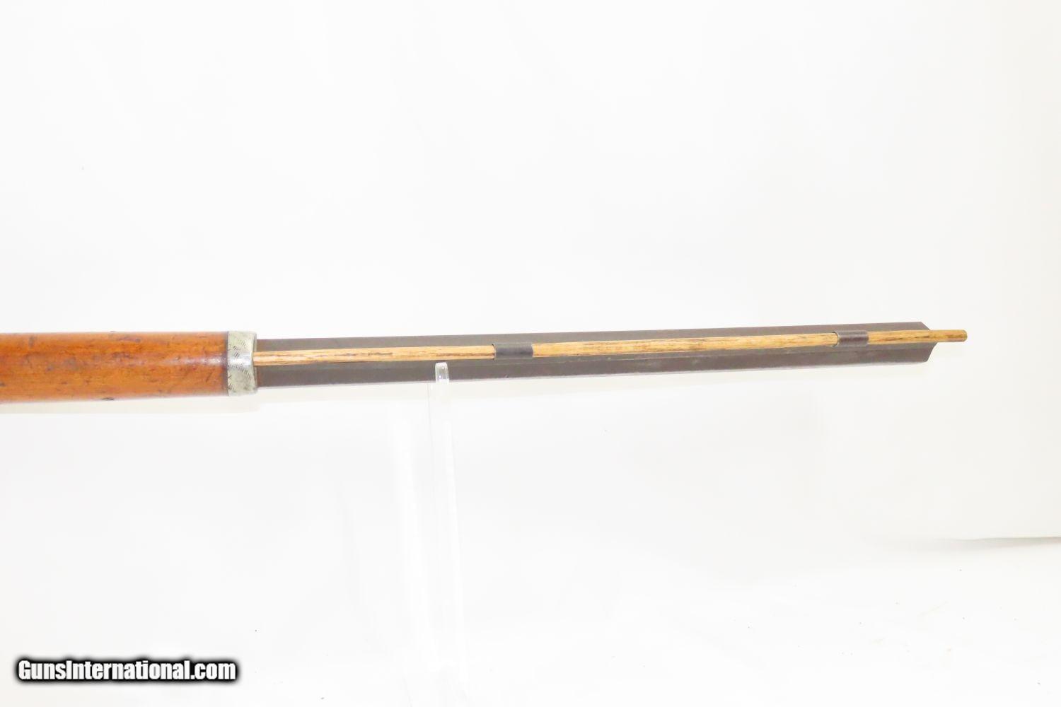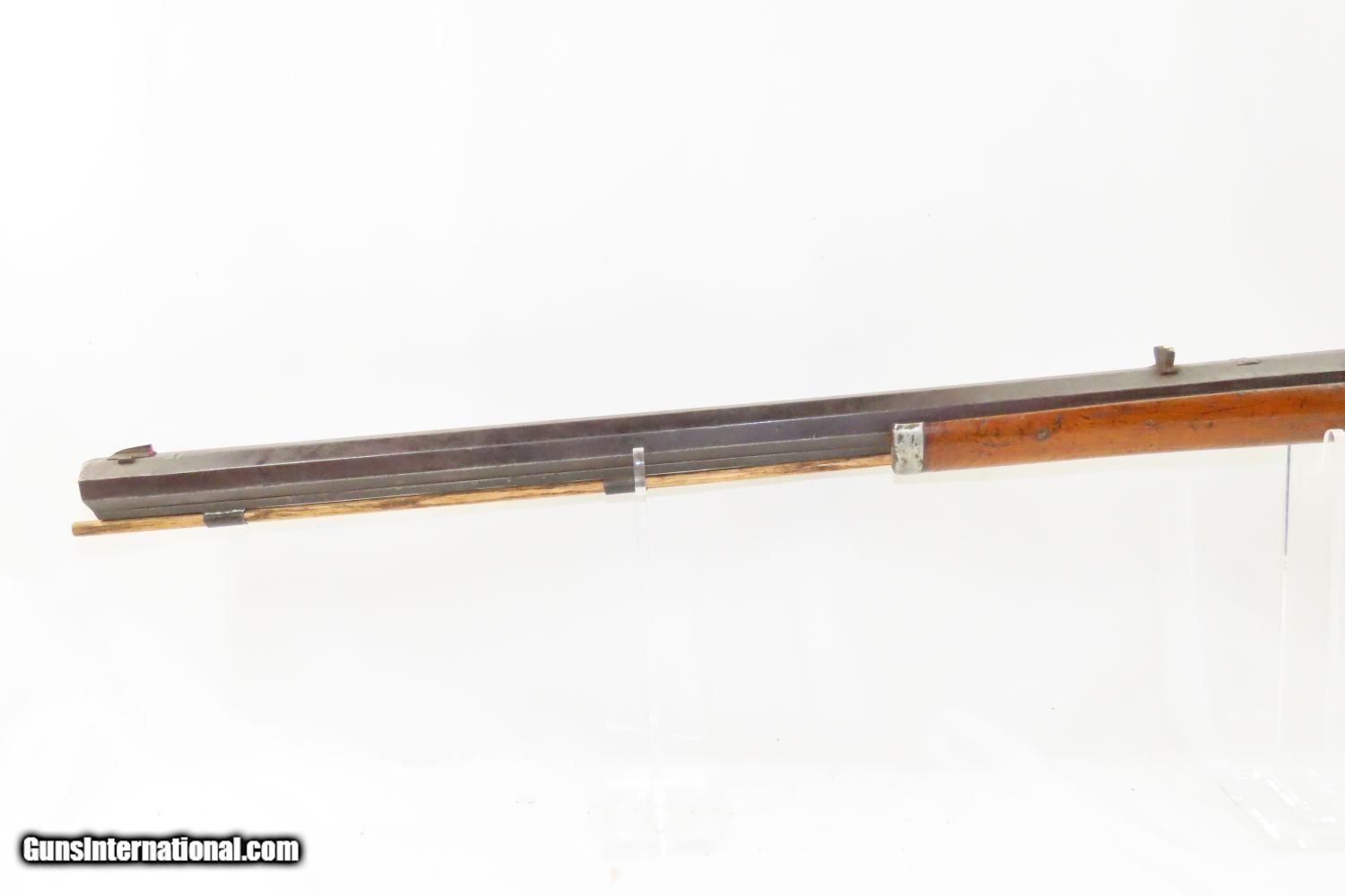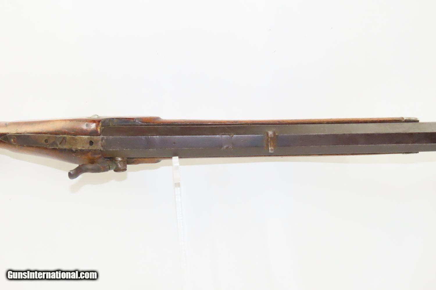 Description: Antique BACK ACTION Half Stock HEAVY BARREL Percussion .42 Cal. Long Rifle Kentucky Style Long Rifle Made Circa 1850! Here we present an antique Back Action Half Stock Heavy Barrel Percussion Long Rifle, made circa the mid-19th Century. Its stout octagonal barrel is in .42 caliber, large enough to take small to medium sized game or to defend the homestead against unwanted aggression. Rifle manufacture in the mid-to-late 19th Century was rapidly changing over from thousands of craftsmen all over the United States and on the Frontier making and selling their wares, to the large factories with standardized assembly lines and modern manufacturing techniques. Many makers’ names of the so-called Kentucky long rifles have been lost over time. This rifle is one such example. These locks were called “back action” because the mainspring hangs behind the tumbler. The back action is often used in double rifles and occasionally in single barrel shotguns where the need for strength requires as little steel as possible be removed from the bar of the action. This lock was popular on percussion guns made in St. Louis, New York, California, Ohio, England and Belgium. Back Action percussion locks were a “late” developed style of lock. Used primarily on the hardware store line of guns, these locks did, however, show up on some better pieces in the mid-to-late 1800′s. The overall condition is good. Strong action. Semi-bright bore. This example sports a solid stock all around! The barrel is massive, as this example weighs in at 13 lbs! Here is a hearty, antique back action rifle to add to the collection! Own the original! This is a legitimate antique and not a reproduction. Barrel is 32 inches. Caliber: .42 Percussion Overall condition as seen in photos. Very Fast. Very Safe. FREE SHIPPING WORLDWIDE. Delivered directly to your door by express mail! Guaranteed AUTHENTIC & Includes CERTIFICATE OF AUTHENTICITY. ancestryguns $1165 #210433 SOLD Antique: Yes |