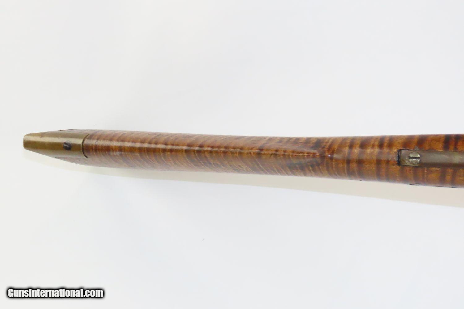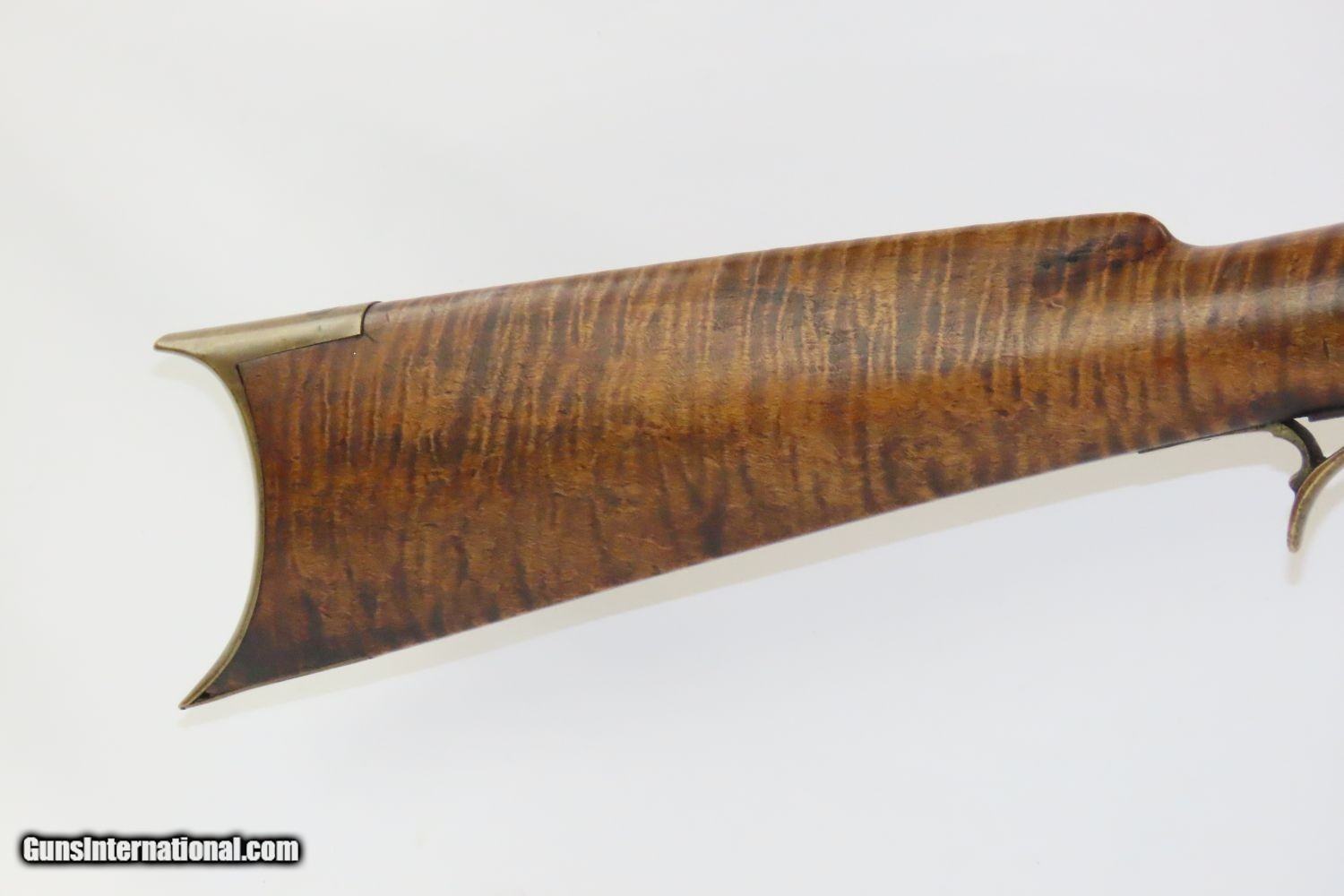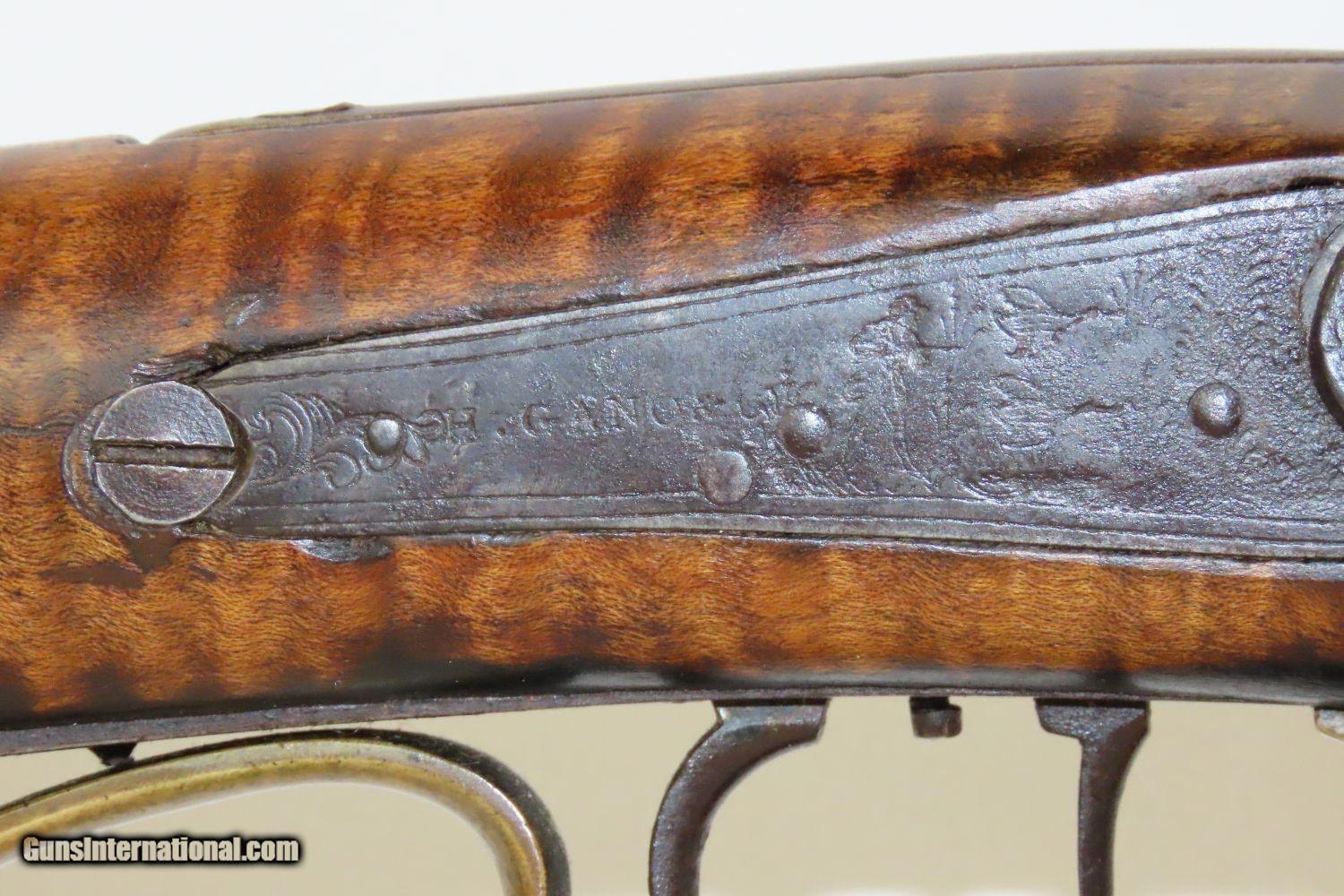 Description: Antique BACK ACTION Half Stock PERCUSSION Long Rifle with H. GANO & Co Lock Kentucky Style Long Rifle Made Circa 1850! Here we present an Antique Back Action Half Stock Percussion Long Rifle, made circa the mid-19th Century. Its stout octagonal barrel is in .40 caliber, large enough to take medium to large sized game or to defend the homestead against unwanted aggression. The American Longrifle, more commonly, but less correctly, known as the ‘Kentucky rifle’, was described by Captain John G. W. Dillin in the dedication to his seminal 1924 book, The Kentucky Rifle: “From a flat bar of soft iron, hand forged into a gun barrel; laboriously bored and rifled with crude tools; fitted with a stock hewn from a maple tree in the neighboring forest; and supplied with a lock hammered to shape on the anvil; an unknown smith, in a shop long since silent, fashioned a rifle which changed the whole course of world history; made possible the settlement of a continent; and ultimately freed our country of foreign domination. Light in weight; graceful in line; economical in consumption of powder and lead; fatally precise; distinctly American; it sprang into immediate popularity; and for a hundred years was a model often slightly varied but never radically changed.” These locks were called “back action” because the mainspring hangs behind the tumbler. The back action is often used in double rifles and occasionally in single barrel shotguns where the need for strength requires as little steel as possible be removed from the bar of the action. This lock was popular on percussion guns made in St. Louis, New York, California, Ohio, England and Belgium. Back Action percussion locks were a “late” developed style of lock. Used primarily on the hardware store line of guns, these locks did, however, show up on some better pieces in the mid-to-late 1800′s. Back Action locks are extremely fast and are often used on competition, squirrel, and light-weight boy’s rifles. The overall condition is good. The action functions. The bore remains in good shape. The stock is solid. “H. GANO & Co.” is engraved on the lock. Here is a handsome back action rifle to collect and display! Own the original! This is a legitimate antique and not a reproduction. Barrel is 35-1/2 inches. Caliber: .40 Overall condition as seen in photos. Very Fast. Very Safe. FREE SHIPPING WORLDWIDE. Delivered directly to your door by express mail! Guaranteed AUTHENTIC & Includes CERTIFICATE OF AUTHENTICITY. ancestryguns $1495 #20105 SOLD Antique: Yes |