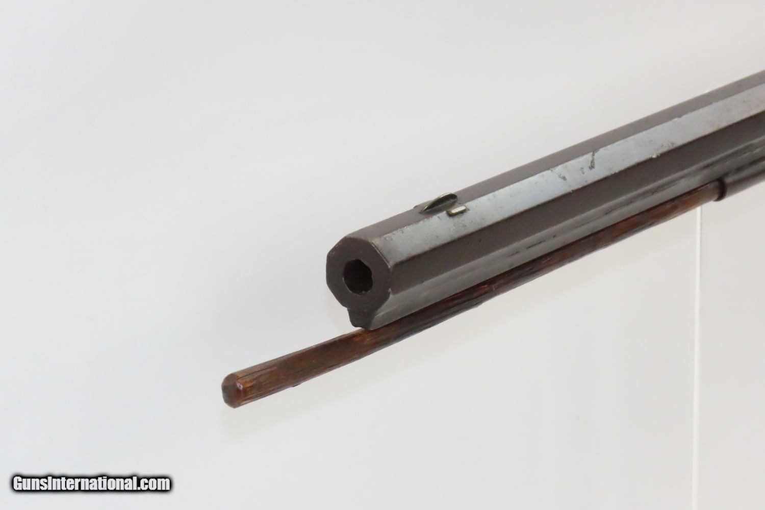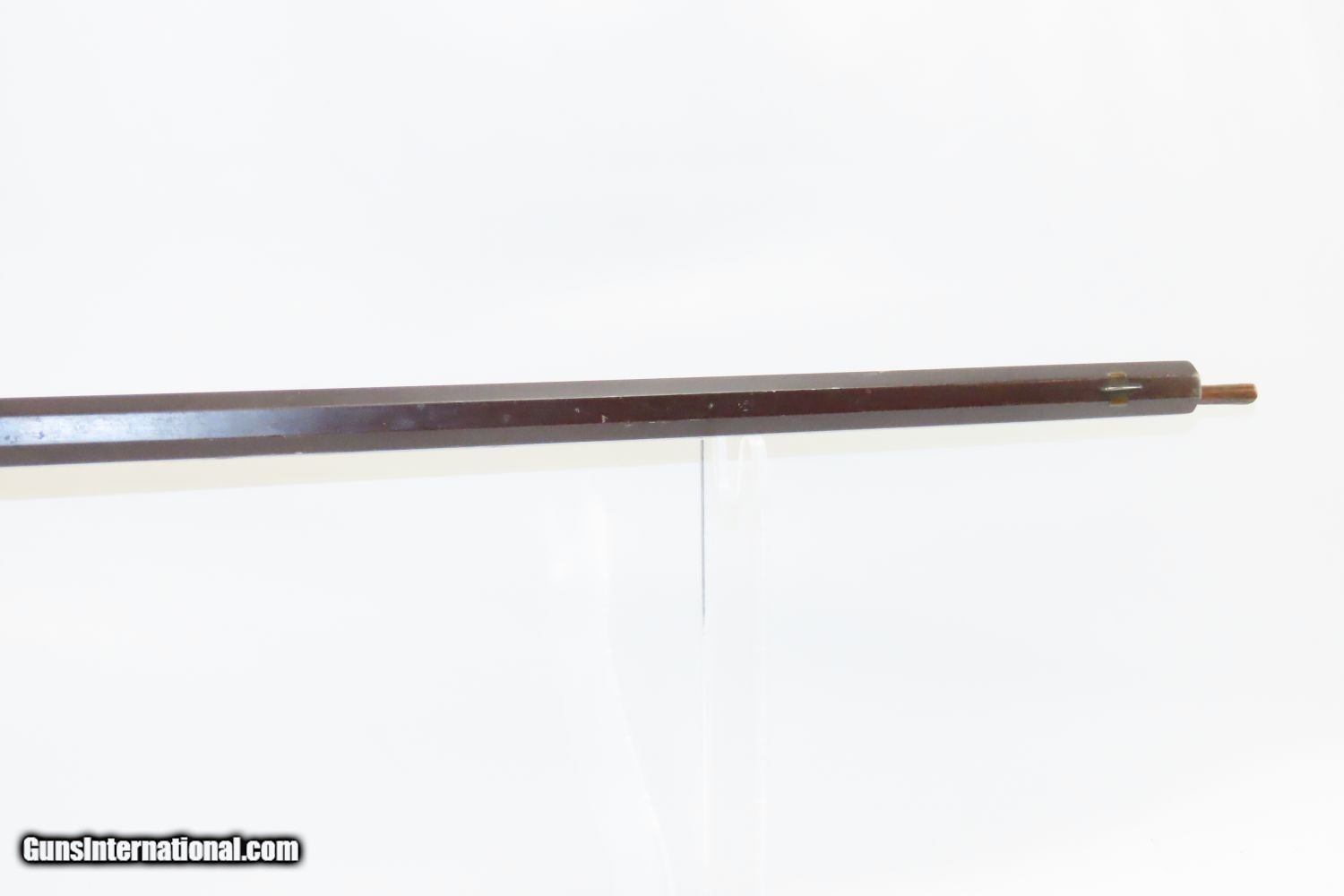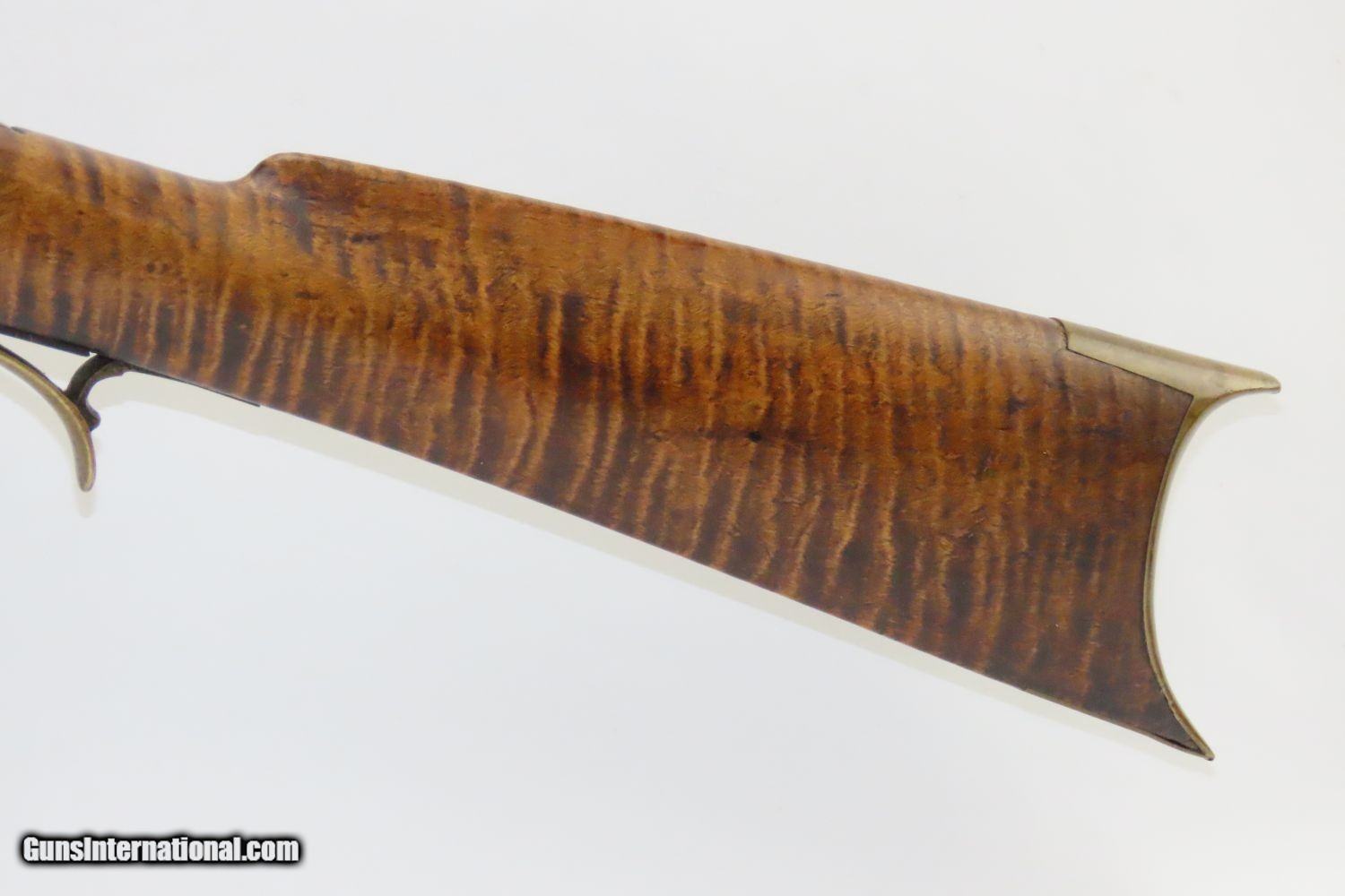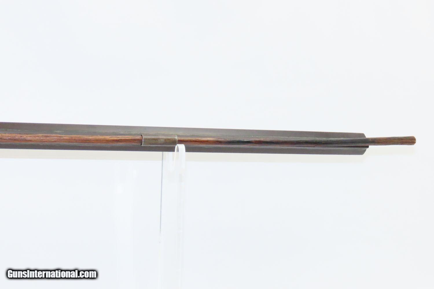 Description: Antique BACK ACTION Half Stock PERCUSSION Long Rifle with H. GANO & Co Lock Kentucky Style Long Rifle Made Circa 1850! Here we present an Antique Back Action Half Stock Percussion Long Rifle, made circa the mid-19th Century. Its stout octagonal barrel is in .40 caliber, large enough to take medium to large sized game or to defend the homestead against unwanted aggression. The American Longrifle, more commonly, but less correctly, known as the ‘Kentucky rifle’, was described by Captain John G. W. Dillin in the dedication to his seminal 1924 book, The Kentucky Rifle: “From a flat bar of soft iron, hand forged into a gun barrel; laboriously bored and rifled with crude tools; fitted with a stock hewn from a maple tree in the neighboring forest; and supplied with a lock hammered to shape on the anvil; an unknown smith, in a shop long since silent, fashioned a rifle which changed the whole course of world history; made possible the settlement of a continent; and ultimately freed our country of foreign domination. Light in weight; graceful in line; economical in consumption of powder and lead; fatally precise; distinctly American; it sprang into immediate popularity; and for a hundred years was a model often slightly varied but never radically changed.” These locks were called “back action” because the mainspring hangs behind the tumbler. The back action is often used in double rifles and occasionally in single barrel shotguns where the need for strength requires as little steel as possible be removed from the bar of the action. This lock was popular on percussion guns made in St. Louis, New York, California, Ohio, England and Belgium. Back Action percussion locks were a “late” developed style of lock. Used primarily on the hardware store line of guns, these locks did, however, show up on some better pieces in the mid-to-late 1800′s. Back Action locks are extremely fast and are often used on competition, squirrel, and light-weight boy’s rifles. The overall condition is good. The action functions. The bore remains in good shape. The stock is solid. “H. GANO & Co.” is engraved on the lock. Here is a handsome back action rifle to collect and display! Own the original! This is a legitimate antique and not a reproduction. Barrel is 35-1/2 inches. Caliber: .40 Overall condition as seen in photos. Very Fast. Very Safe. FREE SHIPPING WORLDWIDE. Delivered directly to your door by express mail! Guaranteed AUTHENTIC & Includes CERTIFICATE OF AUTHENTICITY. ancestryguns $1495 #20105 SOLD Antique: Yes |