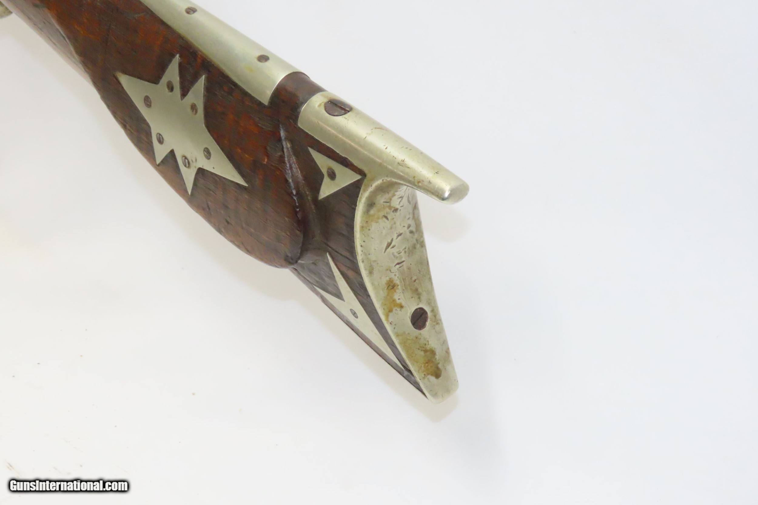 Description: Antique BACK ACTION Half Stock UNIQUE Percussion .54 Caliber Long Rifle Mid-1800s HOMESTEAD/HUNTING Rifle w/SET TRIGGER Here we present an antique Back Action Half Stock American Percussion Long Rifle, made circa the mid-19th Century. Its stout octagonal barrel is in .54 caliber, large enough to take medium to large sized game or to defend the homestead against unwanted aggression. Rifle manufacture in the mid-to-late 19th Century was rapidly changing over from thousands of craftsmen all over the United States and on the Frontier making and selling their wares, to the large factories with standardized assembly lines and modern manufacturing techniques. Many makers’ names of the so-called Kentucky long rifles have been lost over time. This rifle is one such example. These locks were called “back action” because the mainspring hangs behind the tumbler. The back action is often used in single and double rifles, and occasionally in single barrel shotguns where the need for strength requires as little steel as possible be removed from the bar of the action. The overall condition is good. Original patina. Strong action. The bore is in good shape for its age. The stock is well-used and is missing a chip around the barrel tang. Part octagonal/Part round barrel. Signature on the barrel, and markings on the lock are worn. Custom German silver accents. Own the original! This is a legitimate antique and not a reproduction. Barrel is 31-1/4 inches. Caliber: .55 Percussion Overall condition as seen in photos. Very Fast. Very Safe. FREE SHIPPING WORLDWIDE. Delivered directly to your door by express mail! Guaranteed AUTHENTIC & Includes CERTIFICATE OF AUTHENTICITY. ancestryguns $1200 #226956 SOLD Antique: Yes |