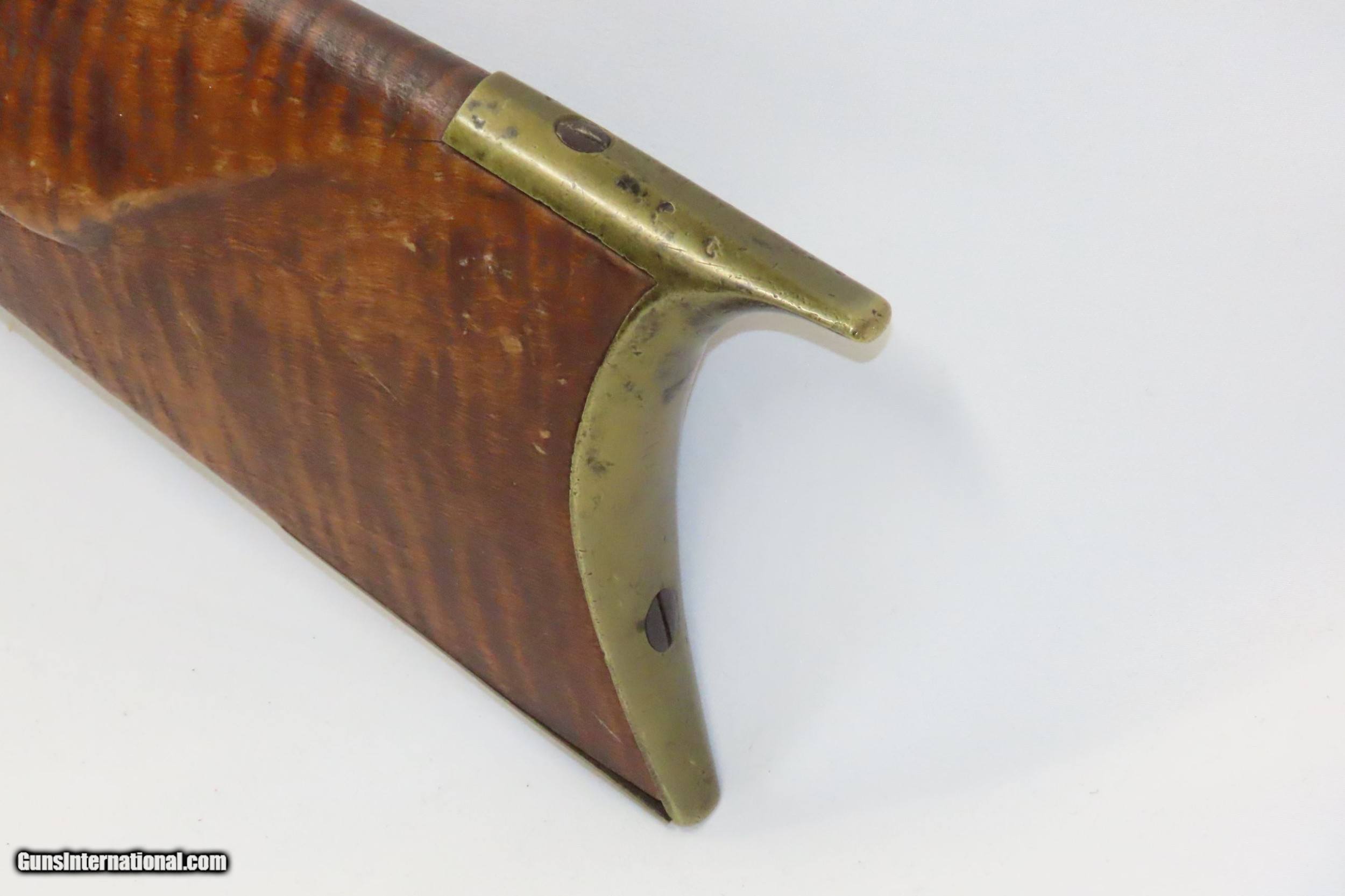 Description: Antique “M.B.” SIGNED Full-Stock .36 Caliber Percussion AMERICAN LONG RIFLE Kentucky Style Long Rifle with T. & C. NEAVE LOCK! Here we present an antique M.B. Signed Full Stock Percussion Long Rifle with a T. & C. Neave lock, made circa the mid-19th Century. Its stout octagonal barrel is in .36 caliber, large enough to take small to medium sized game or to defend the homestead against unwanted aggression. Rifle manufacture in the mid-to-late 19th Century was rapidly changing over from thousands of craftsmen all over the United States and on the Frontier making and selling their wares, to the large factories with standardized assembly lines and modern manufacturing techniques. Many makers’ names of the so-called Kentucky long rifles have been lost over time. This is one such rifle. The overall condition is good. Strong action. Dark bore, remains in good shape. The maple stock is in good shape, with a missing chip from the right side of the barrel tang and the wrist has been repaired with two brass plates. “MB” marked barrel top. Legible markings. Own the original! This is a legitimate antique and not a reproduction. Barrel is 42-1/2 inches. Caliber: .36 Percussion Overall condition as seen in photos. Very Fast. Very Safe. FREE SHIPPING WORLDWIDE. Delivered directly to your door by express mail! Guaranteed AUTHENTIC & Includes CERTIFICATE OF AUTHENTICITY. ancestryguns $1500 #217745 SOLD Antique: Yes |