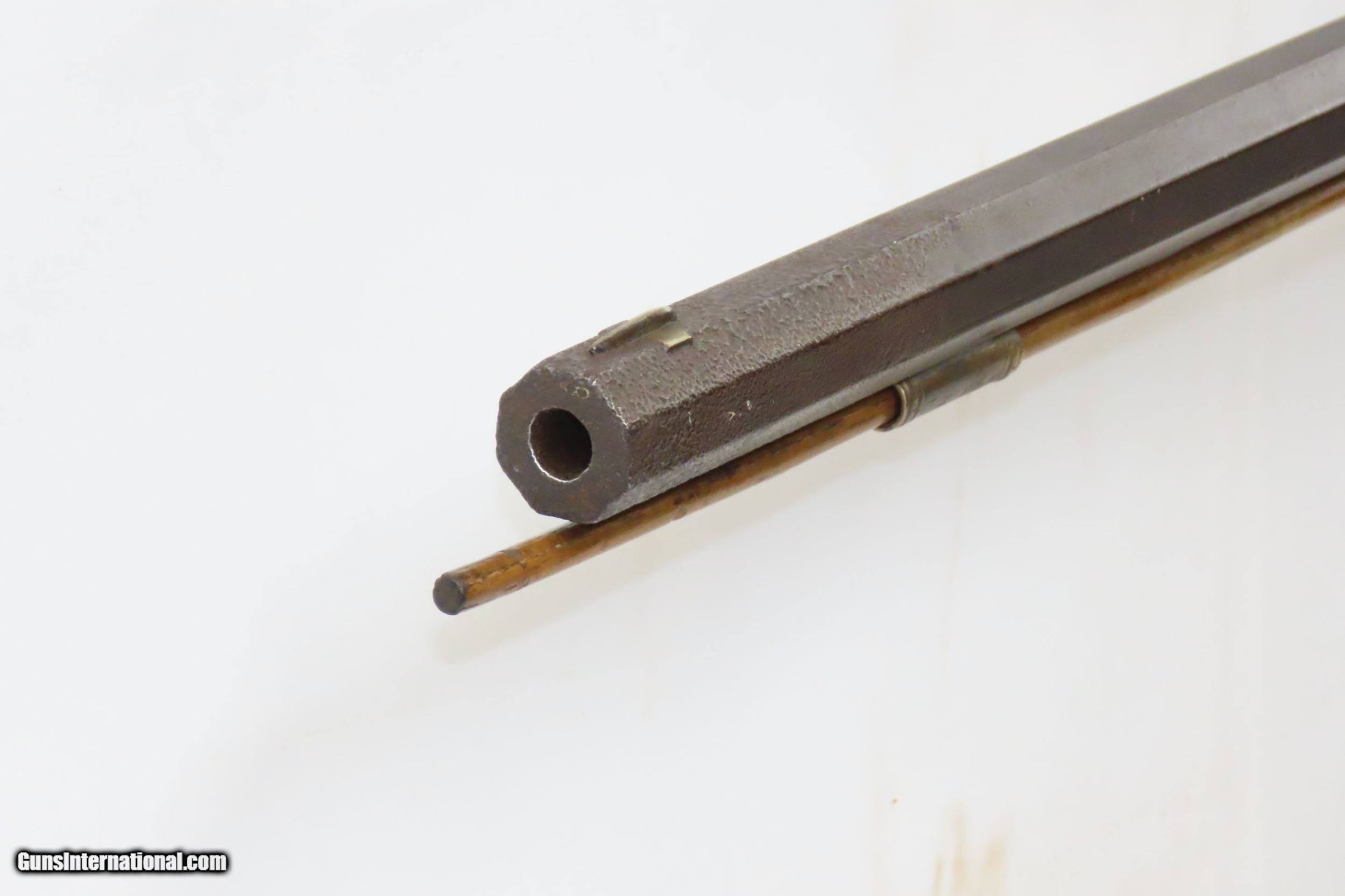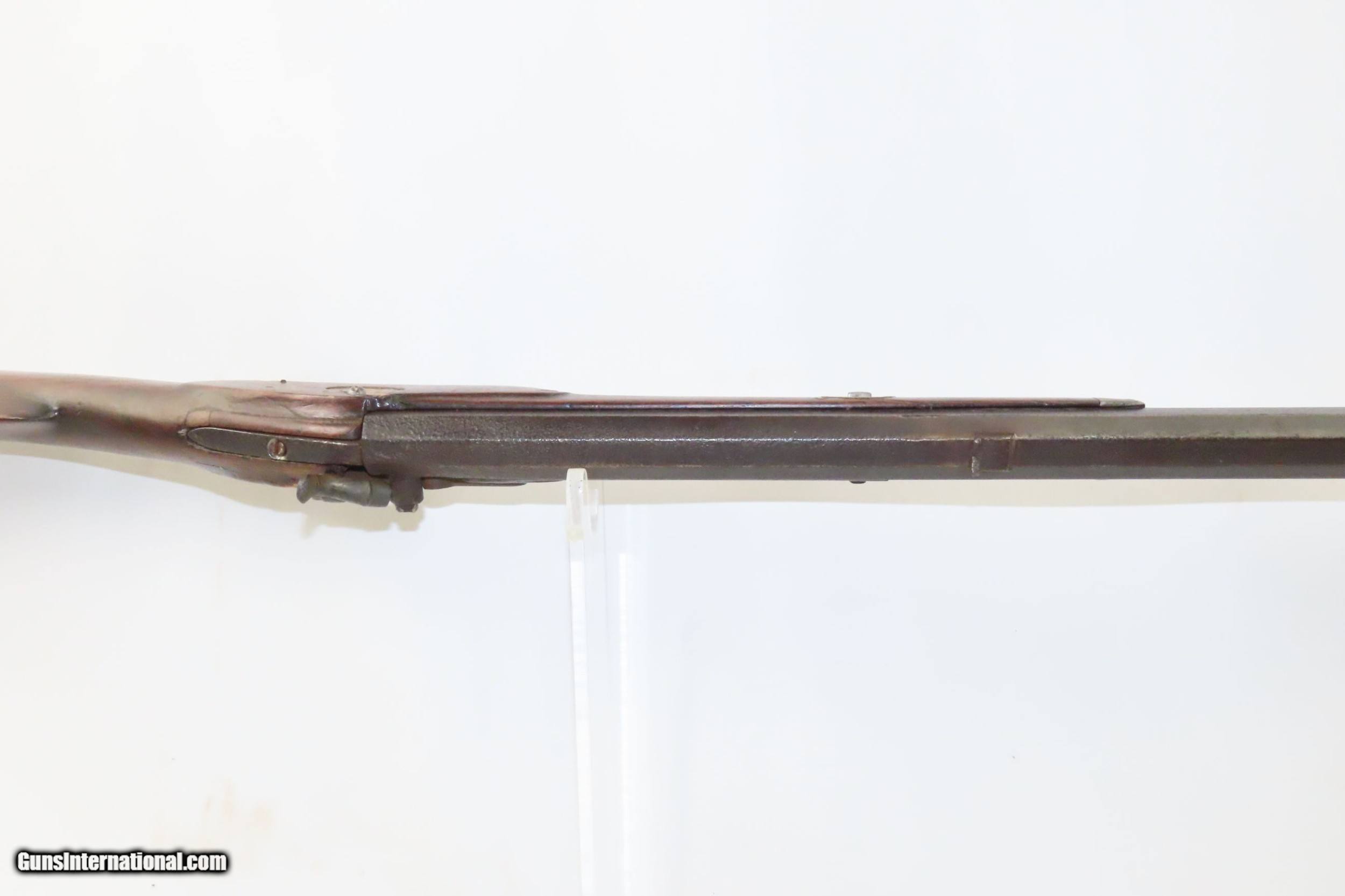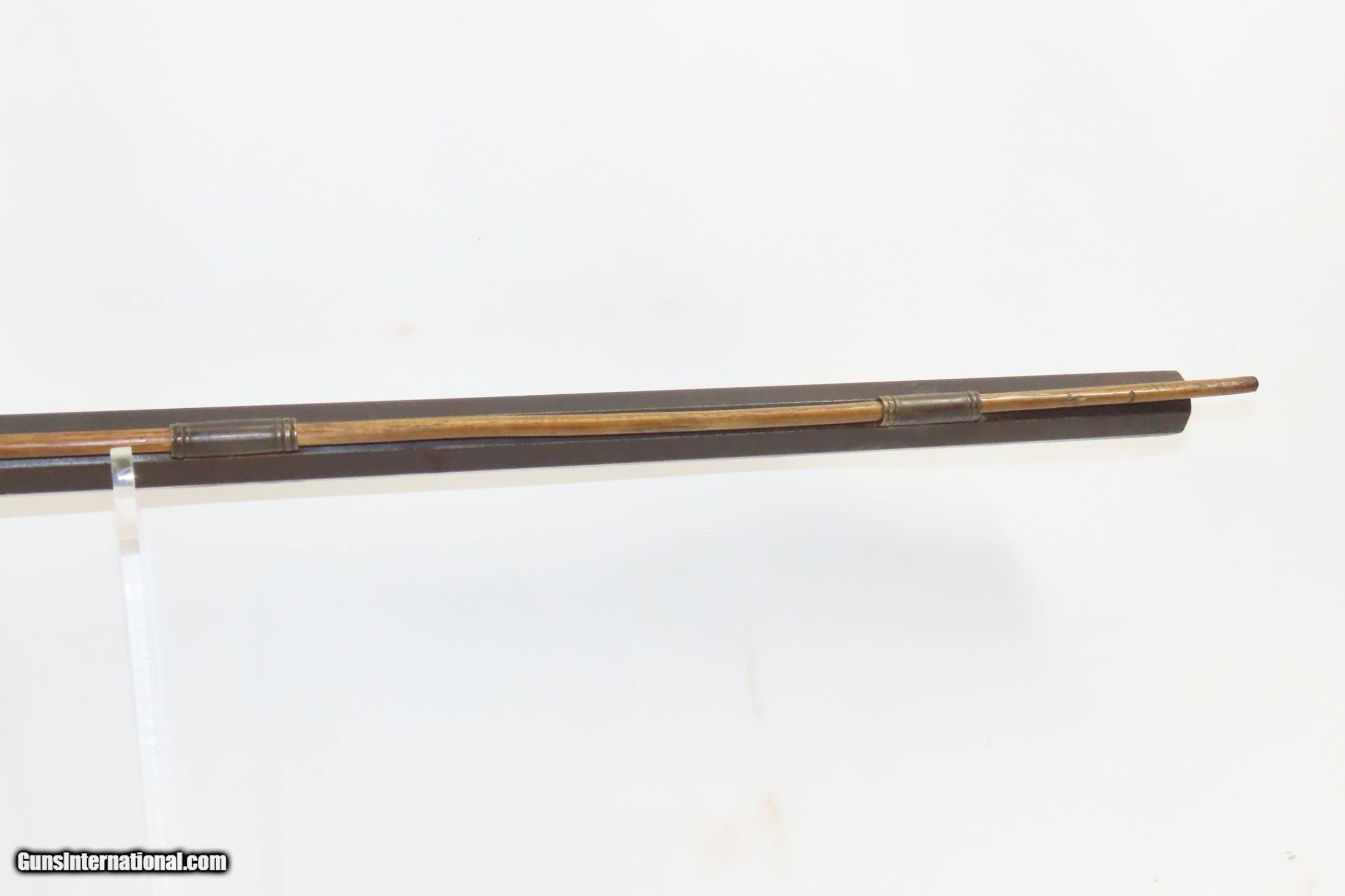 Description: Antique MID-19th CENTURY Half-Stock .40 Cal. Percussion American LONG RIFLE Kentucky Style HUNTING/HOMESTEAD Long Rifle Here we present an antique Half Stock Percussion Long Rifle, made circa the mid-19th Century. Its stout octagonal barrel is in .40 caliber, large enough to take small to medium sized game or to defend the homestead against unwanted aggression. Rifle manufacture in the mid-to-late 19th Century was rapidly changing over from thousands of craftsmen all over the United States and on the Frontier making and selling their wares, to the large factories with standardized assembly lines and modern manufacturing techniques. Many makers’ names of the so-called Kentucky long rifles have been lost over time. This rifle is one such example. The American Long Rifle, more commonly, but less correctly, known as the ‘Kentucky rifle’, was described by Captain John G. W. Dillin in the dedication to his seminal 1924 book, The Kentucky Rifle: “From a flat bar of soft iron, hand forged into a gun barrel; laboriously bored and rifled with crude tools; fitted with a stock hewn from a maple tree in the neighboring forest; and supplied with a lock hammered to shape on the anvil; an unknown smith, in a shop long since silent, fashioned a rifle which changed the whole course of world history; made possible the settlement of a continent; and ultimately freed our country of foreign domination. Light in weight; graceful in line; economical in consumption of powder and lead; fatally precise; distinctly American; it sprang into immediate popularity; and for a hundred years was a model often slightly varied but never radically changed.” The overall condition is good. Original weathered patina. The lock has been replaced with a more modern piece. The action is excellent. The bore is dim with thin, worn rifling. The stock is solid. Own the original! This is a legitimate antique and not a reproduction. Barrel is 34 inches. Caliber: .40 Percussion Overall condition as seen in photos. Very Fast. Very Safe. FREE SHIPPING WORLDWIDE. Delivered directly to your door by express mail! Guaranteed AUTHENTIC & Includes CERTIFICATE OF AUTHENTICITY. ancestryguns $1200 #226476 SOLD Antique: Yes |