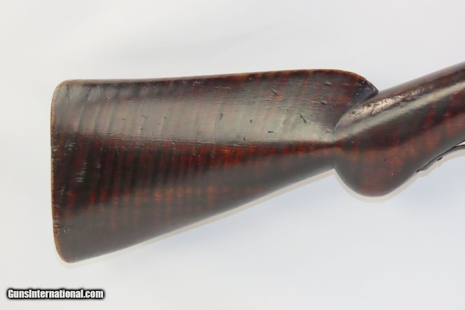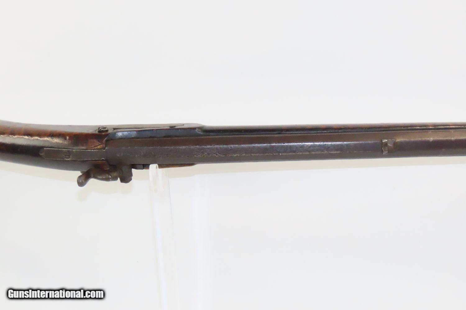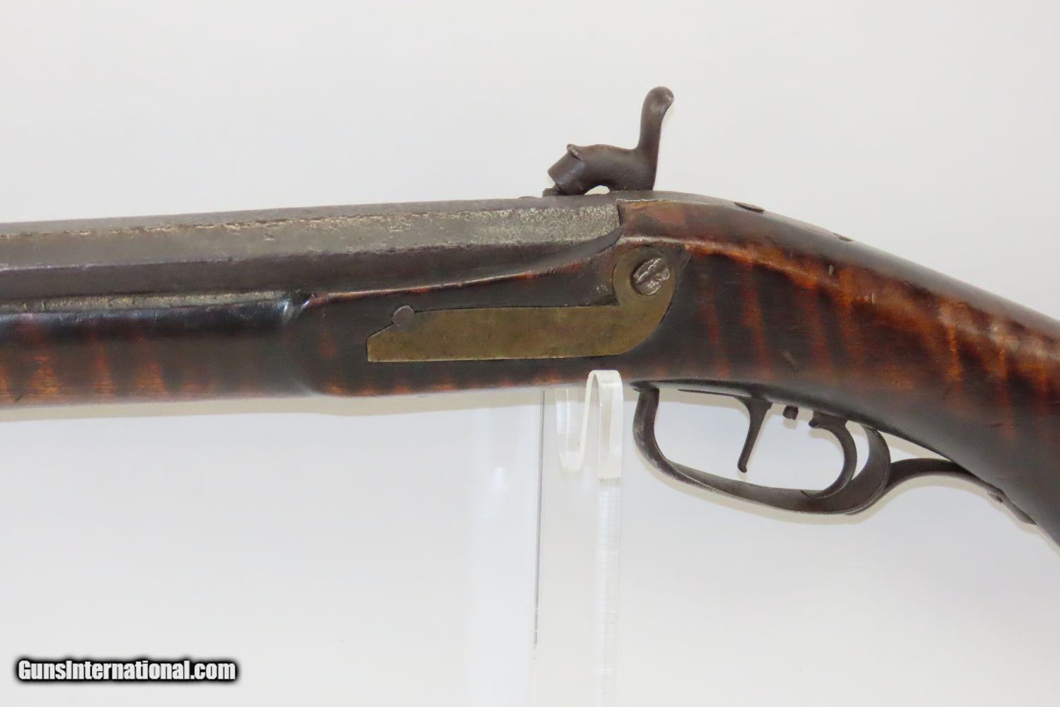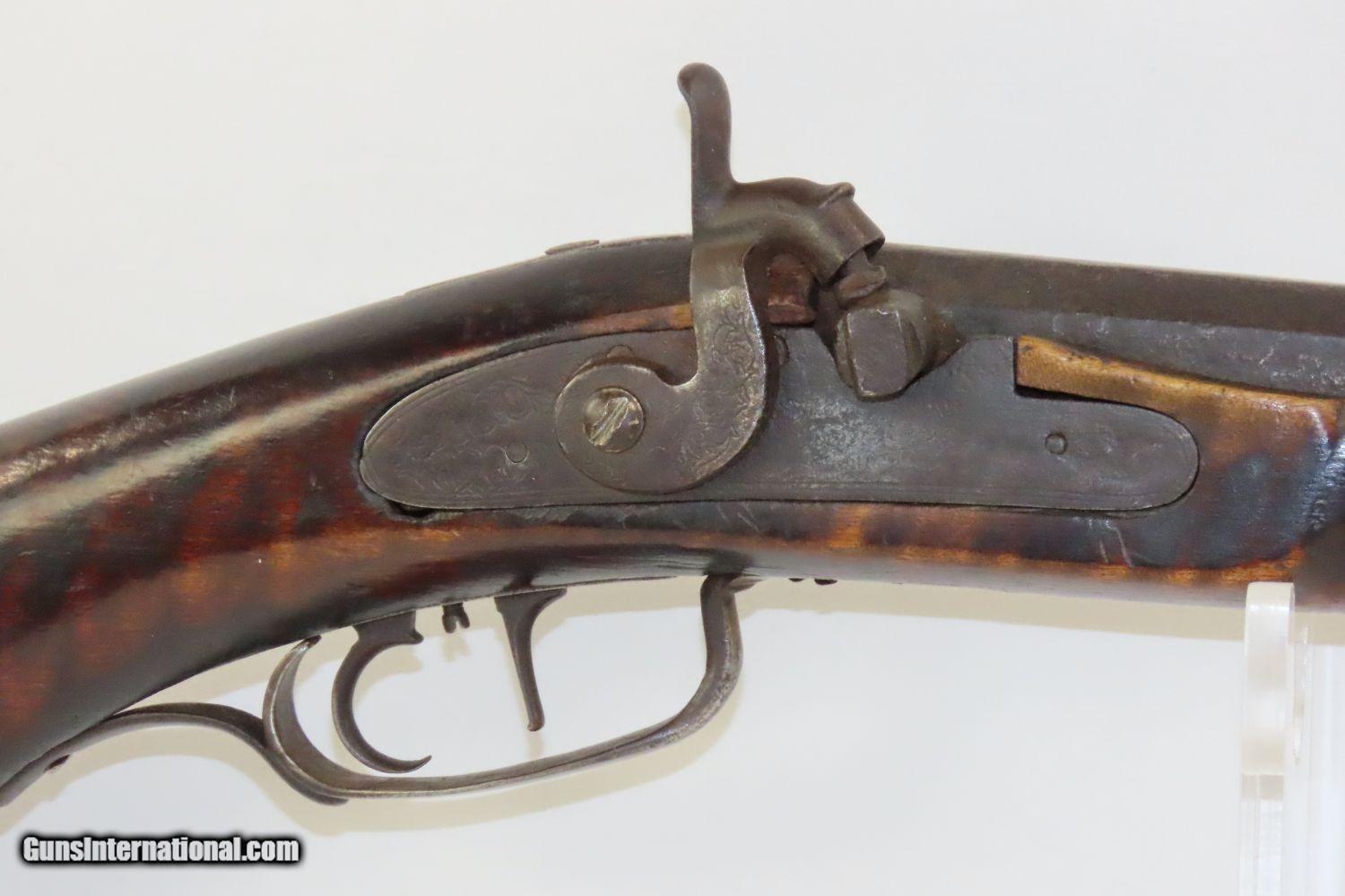 Description: Antique “POOR BOY” Half-Stock .47 Caliber Percussion American LONG RIFLE Kentucky Style Long Rifle with GOLCHER LOCK and DOUBLE SET TRIGGER! Here we present an antique “Poor Boy” Half Stock Percussion Long Rifle, made circa the mid-19th Century. For generations, terms like “Squirrel Rifle”, “Barn Gun”, or “Poor Boy” was used when referring to a plain, inexpensive, home grown working tool. This style of rifle could have possibly been made entirely by hand, using hand-operated tooling done in a frontier setting. There were strong pockets of recorded long rifle manufacture and use throughout the Appalachian Mountains of Virginia, Tennessee, Kentucky, Ohio and the Carolinas. This one has a smoothbore, octagonal barrel in .46 caliber, large enough to take medium sized game or to defend the homestead against unwanted aggression. It has a unique taper to the muzzle. The butt stock is significantly more substantial than the usual dainty long rifle. It is half-length, has a hand-filling shotgun-style pistol grip, and never had a buttplate. The trigger guard is of iron and Southern styling. Minimalistic brass sideplate. This is a neat old gun! The overall condition is good. The action is strong. The bore is good. This example has a lightly engraved lock. Here is a wonderful piece to collect and display! Own the original! This is a legitimate antique and not a reproduction. Barrel is 40 inches. Caliber: .46 Overall condition as seen in photos. Very Fast. Very Safe. FREE SHIPPING WORLDWIDE. Delivered directly to your door by express mail! Guaranteed AUTHENTIC & Includes CERTIFICATE OF AUTHENTICITY. ancestryguns $1295 #20109 SOLD Antique: Yes |