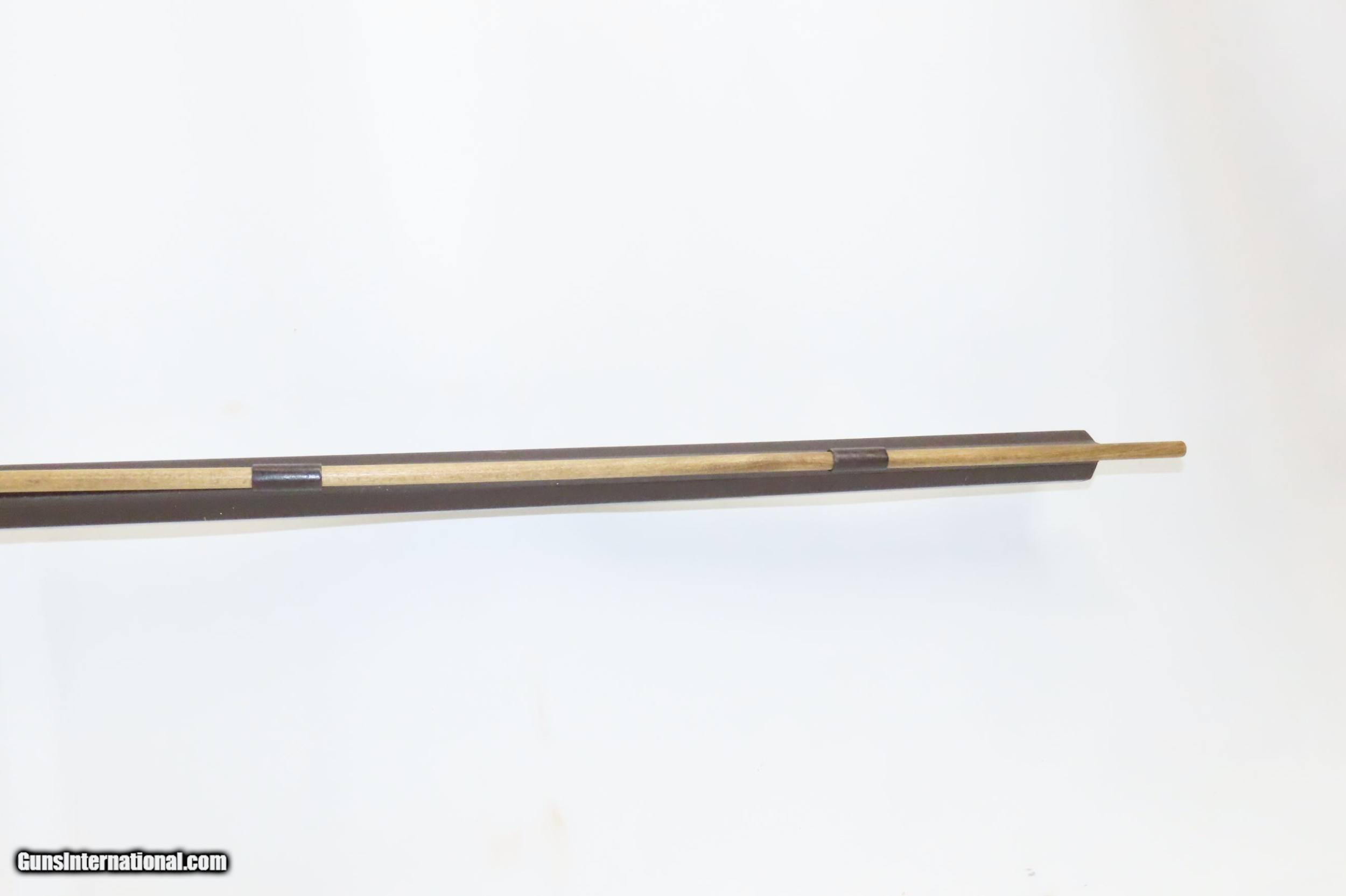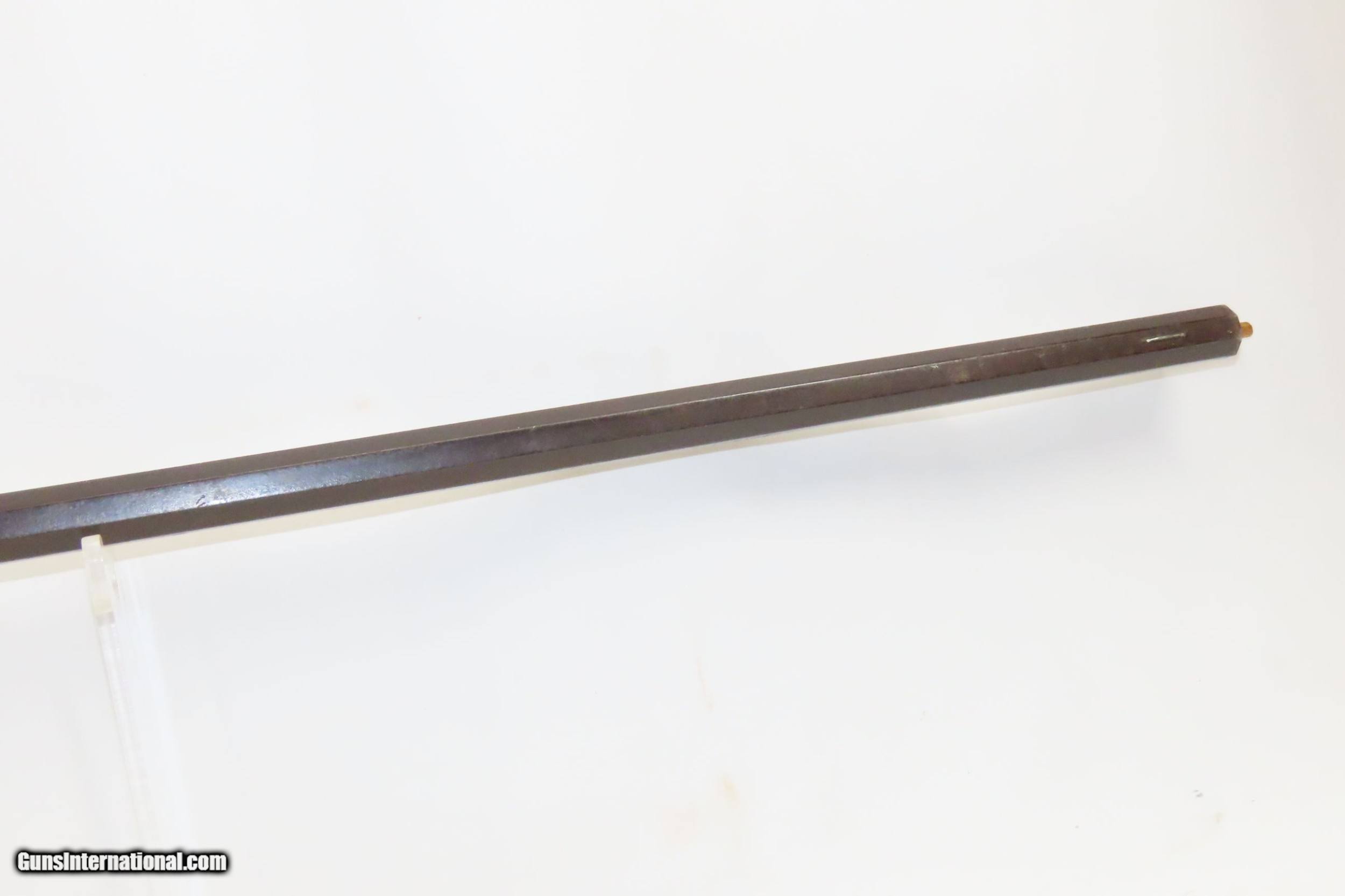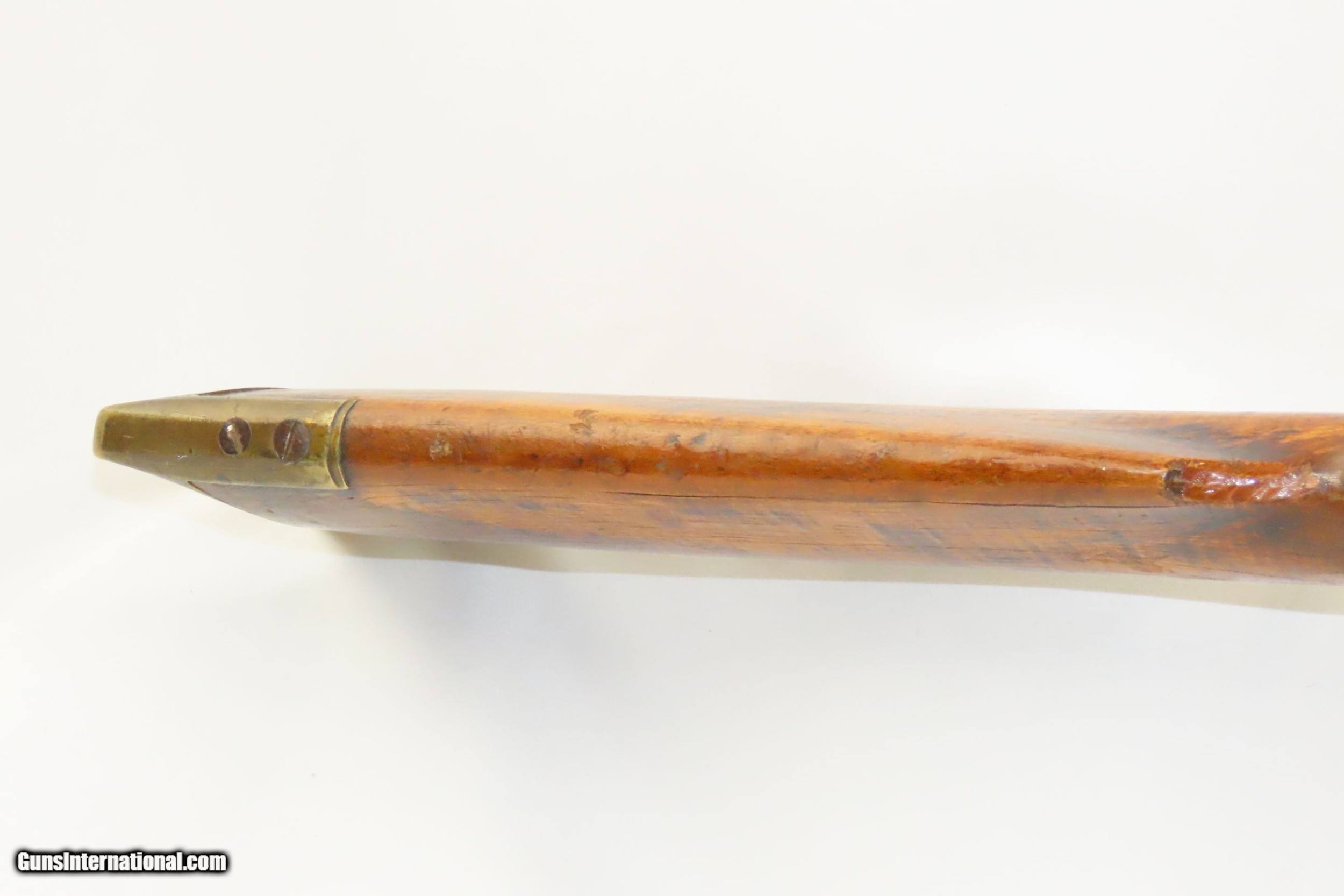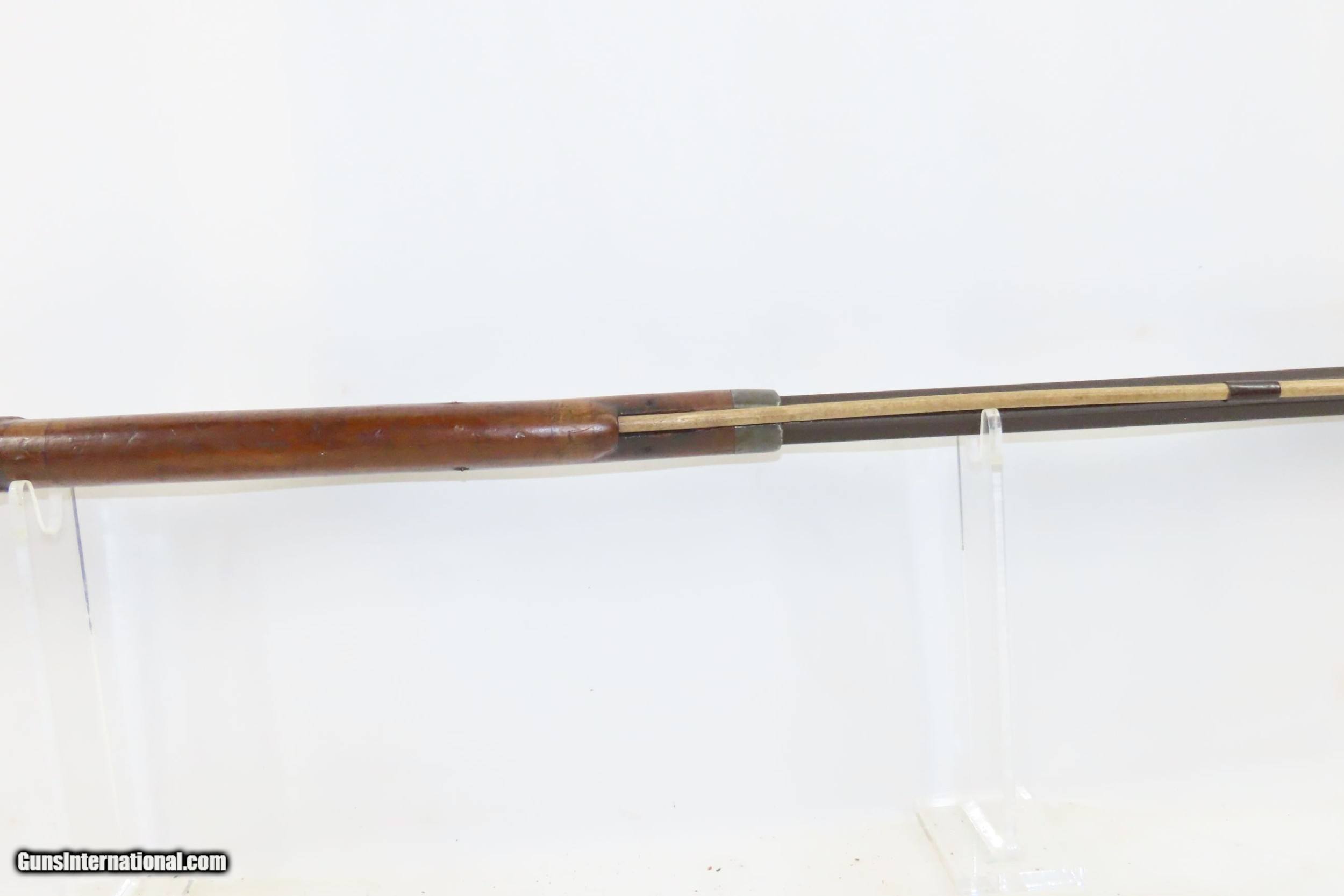 Description: Antique THOMAS & CO. Half Stock BACK ACTION Percussion .40 Cal. Long Rifle Mid-19th Century HOMESTEAD/HUNTING Rifle Here we present an antique Thomas & Company Back Action Half Stock American Percussion Long Rifle, made circa the mid-19th Century. Its stout octagonal barrel is in .40 caliber, large enough to take small to medium sized game or to defend the homestead against unwanted aggression. Rifle manufacture in the mid-to-late 19th Century was rapidly changing over from thousands of craftsmen all over the United States and on the Frontier making and selling their wares, to the large factories with standardized assembly lines and modern manufacturing techniques. Many makers’ names of the so-called Kentucky long rifles have been lost over time. This rifle is one such example. The American Long Rifle, more commonly, but less correctly, known as the ‘Kentucky rifle’, was described by Captain John G. W. Dillin in the dedication to his seminal 1924 book, The Kentucky Rifle: “From a flat bar of soft iron, hand forged into a gun barrel; laboriously bored and rifled with crude tools; fitted with a stock hewn from a maple tree in the neighboring forest; and supplied with a lock hammered to shape on the anvil; an unknown smith, in a shop long since silent, fashioned a rifle which changed the whole course of world history; made possible the settlement of a continent; and ultimately freed our country of foreign domination. Light in weight; graceful in line; economical in consumption of powder and lead; fatally precise; distinctly American; it sprang into immediate popularity; and for a hundred years was a model often slightly varied but never radically changed.” These locks were called “back action” because the mainspring hangs behind the tumbler. The back action is often used in single and double rifles, and occasionally in single barrel shotguns where the need for strength requires as little steel as possible be removed from the bar of the action. The overall condition is good. The action does not function. Good bore for its age. This example sports a solid stock with an expected amount of wear despite various period repairs. “THOMAS” is marked on the left barrel. The ramrod is replaced. Own the original! This is a legitimate antique and not a reproduction. Barrel is 39-5/8 inches. Caliber: .40 Percussion Overall condition as seen in photos. Very Fast. Very Safe. FREE SHIPPING WORLDWIDE. Delivered directly to your door by express mail! Guaranteed AUTHENTIC & Includes CERTIFICATE OF AUTHENTICITY. ancestryguns $1200 #226952 SOLD Antique: Yes |
