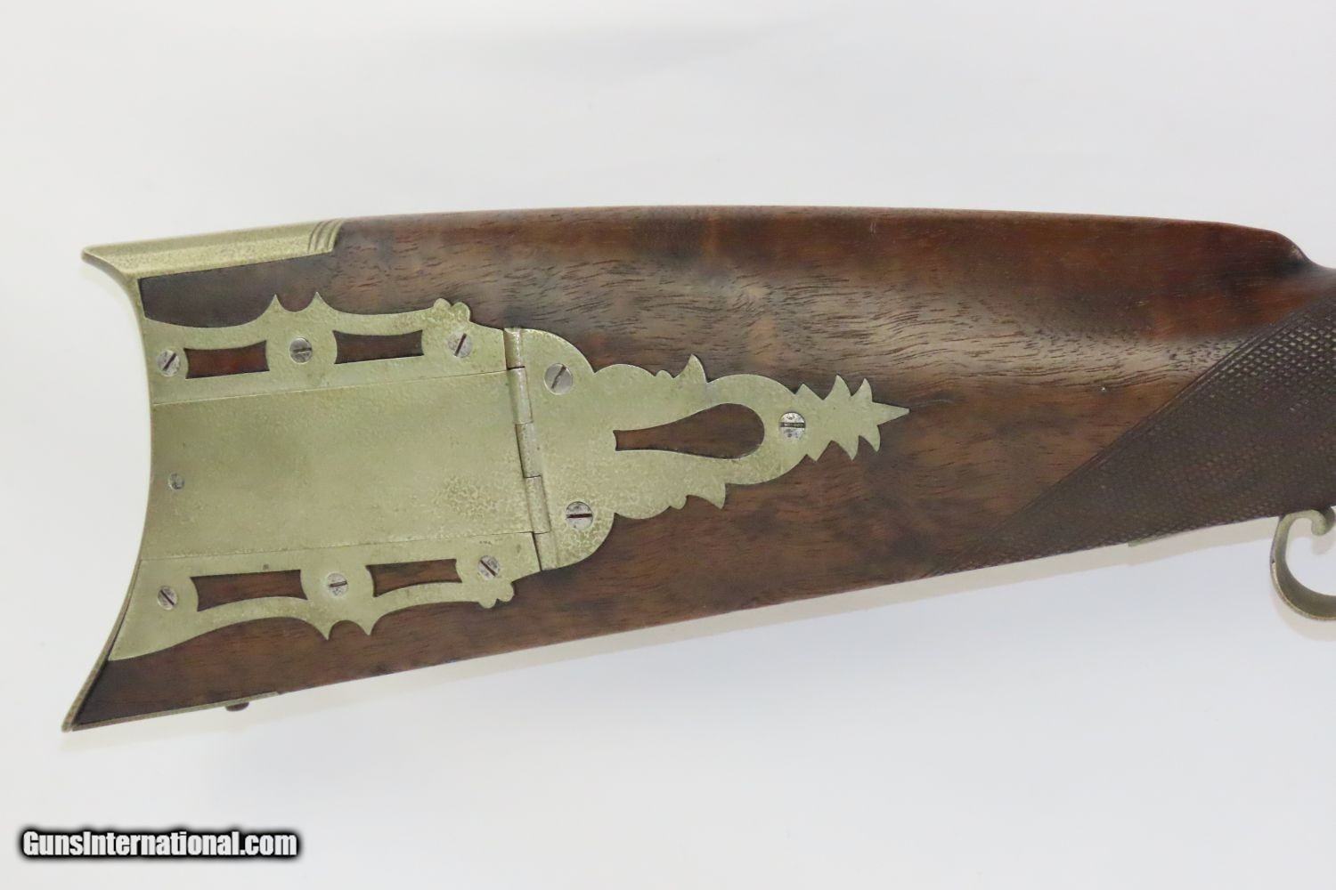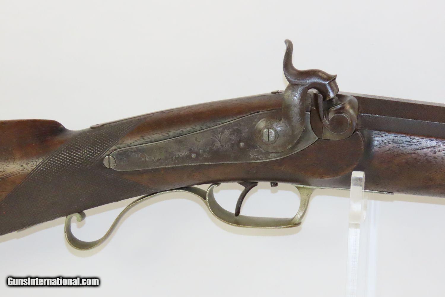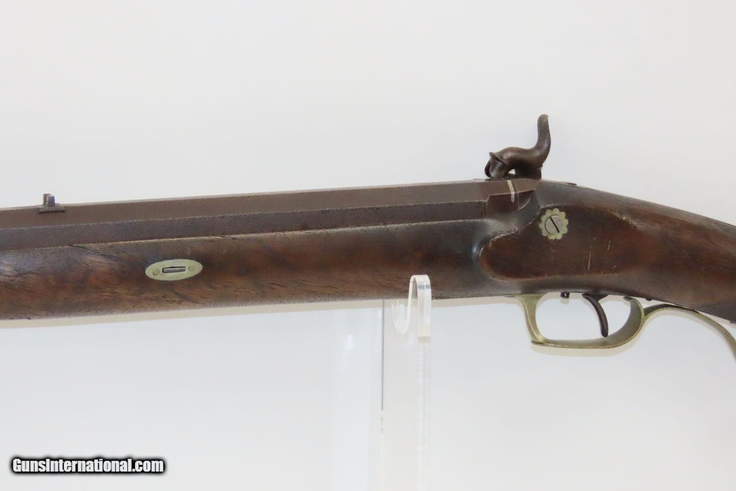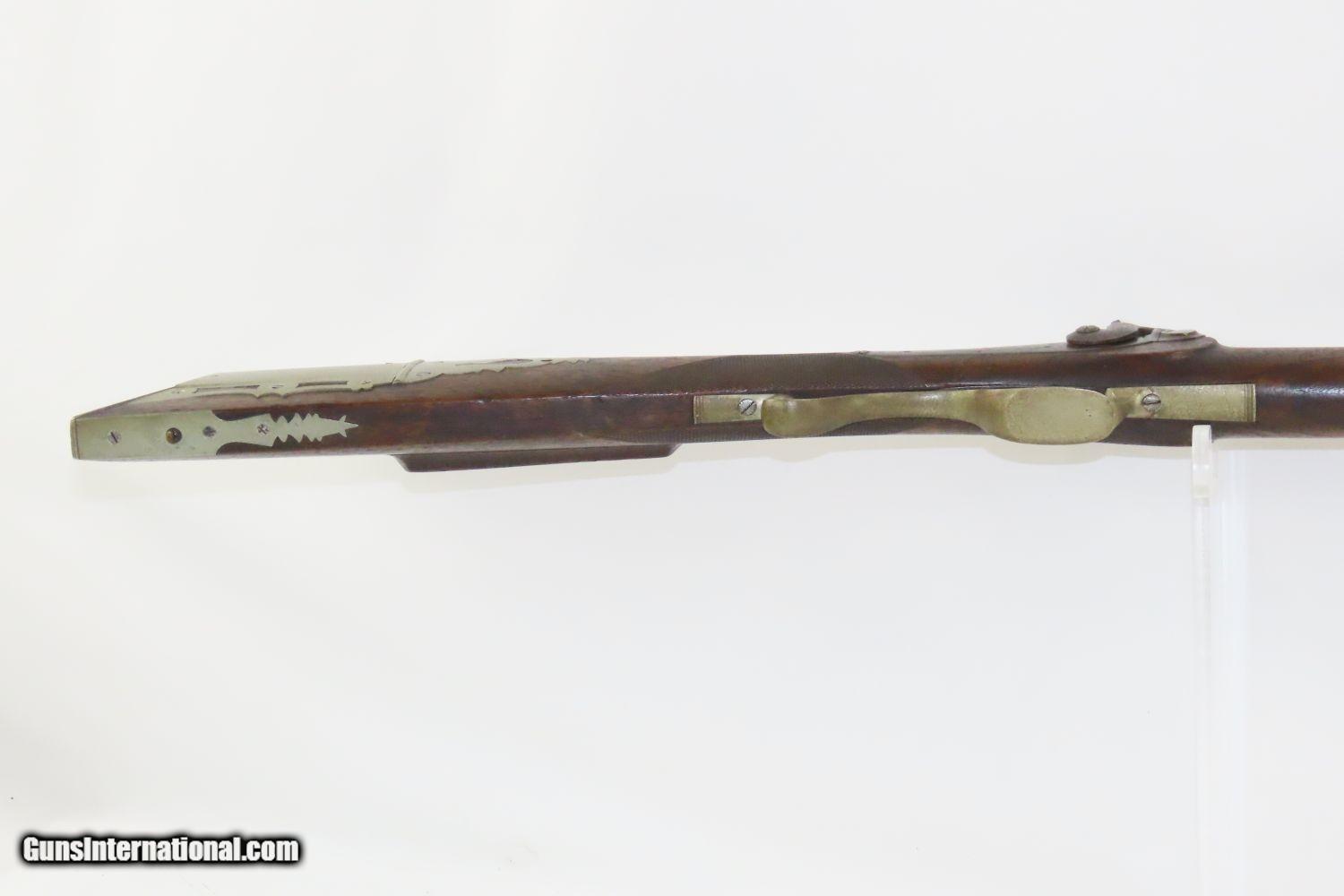 Description: BACK ACTION Half Stock .475 Caliber PERCUSSION American LONG RIFLE Kentucky Style Long Rifle with CONSTABLE Marked Lock! Here we present an Antique Back Action Half Stock Percussion Long Rifle, made circa the mid-19th Century. Its stout octagonal barrel is in .475 caliber, large enough to take medium to large sized game or to defend the homestead against unwanted aggression. Rifle manufacture in the mid-to-late 19th Century was rapidly changing over from thousands of craftsmen all over the United States and on the Frontier making and selling their wares, to the large factories with standardized assembly lines and modern manufacturing techniques. Many makers’ names of the so-called Kentucky long rifles have been lost over time. This rifle is one such example. The American Longrifle, more commonly, but less correctly, known as the ‘Kentucky rifle’, was described by Captain John G. W. Dillin in the dedication to his seminal 1924 book, The Kentucky Rifle: “From a flat bar of soft iron, hand forged into a gun barrel; laboriously bored and rifled with crude tools; fitted with a stock hewn from a maple tree in the neighboring forest; and supplied with a lock hammered to shape on the anvil; an unknown smith, in a shop long since silent, fashioned a rifle which changed the whole course of world history; made possible the settlement of a continent; and ultimately freed our country of foreign domination. Light in weight; graceful in line; economical in consumption of powder and lead; fatally precise; distinctly American; it sprang into immediate popularity; and for a hundred years was a model often slightly varied but never radically changed.” These locks were called “back action” because the mainspring hangs behind the tumbler. The back action is often used in double rifles and occasionally in single barrel shotguns where the need for strength requires as little steel as possible be removed from the bar of the action. This lock was popular on percussion guns made in St. Louis, New York, California, Ohio, England and Belgium. Back Action percussion locks were a “late” developed style of lock. Used primarily on the hardware store line of guns, these locks did, however, show up on some better pieces in the mid-to-late 1800′s. Back Action locks are extremely fast and are often used on competition, squirrel, and light-weight boy’s rifles. The overall condition is very good. The action is strong. The bore is in very nice shape with nice rifling. The breech in inlaid with a nice band of platinum. “CONSTABLE” is engraved on the lock. Here is a solid plains rifle to collect and display! Own the original! This is a legitimate antique and not a reproduction. Barrel is 40-3/4 inches. Caliber: .475 (from land to land) Overall condition as seen in photos. Very Fast. Very Safe. FREE SHIPPING WORLDWIDE. Delivered directly to your door by express mail! Guaranteed AUTHENTIC & Includes CERTIFICATE OF AUTHENTICITY. ancestryguns $1550 #20123 SOLD Antique: Yes |