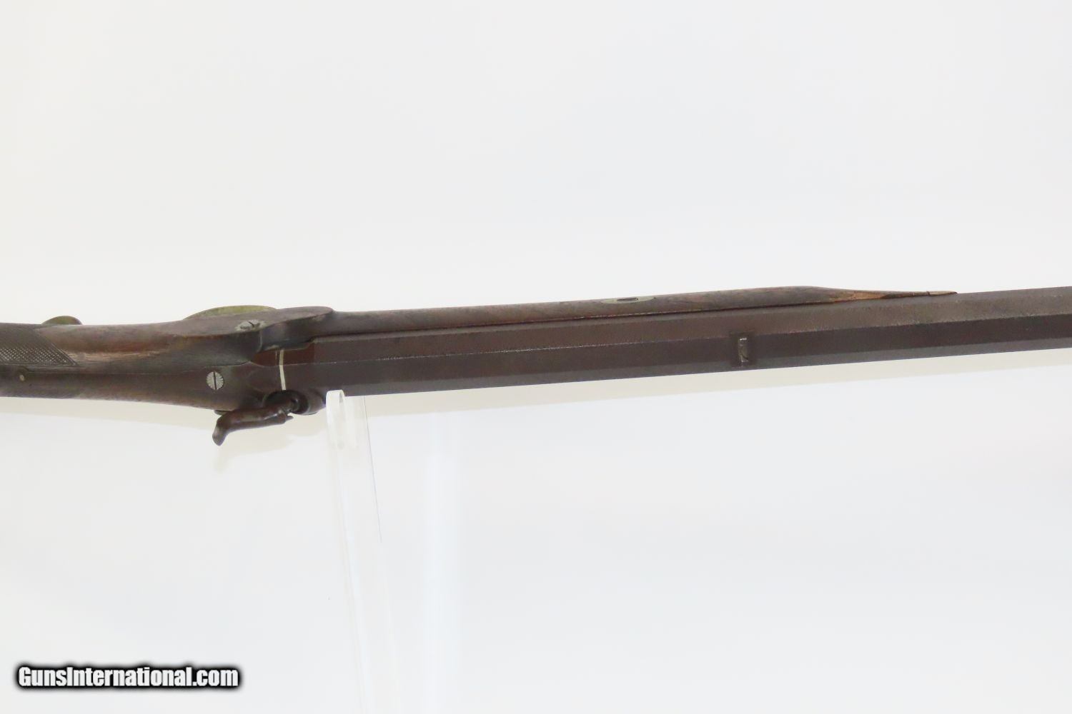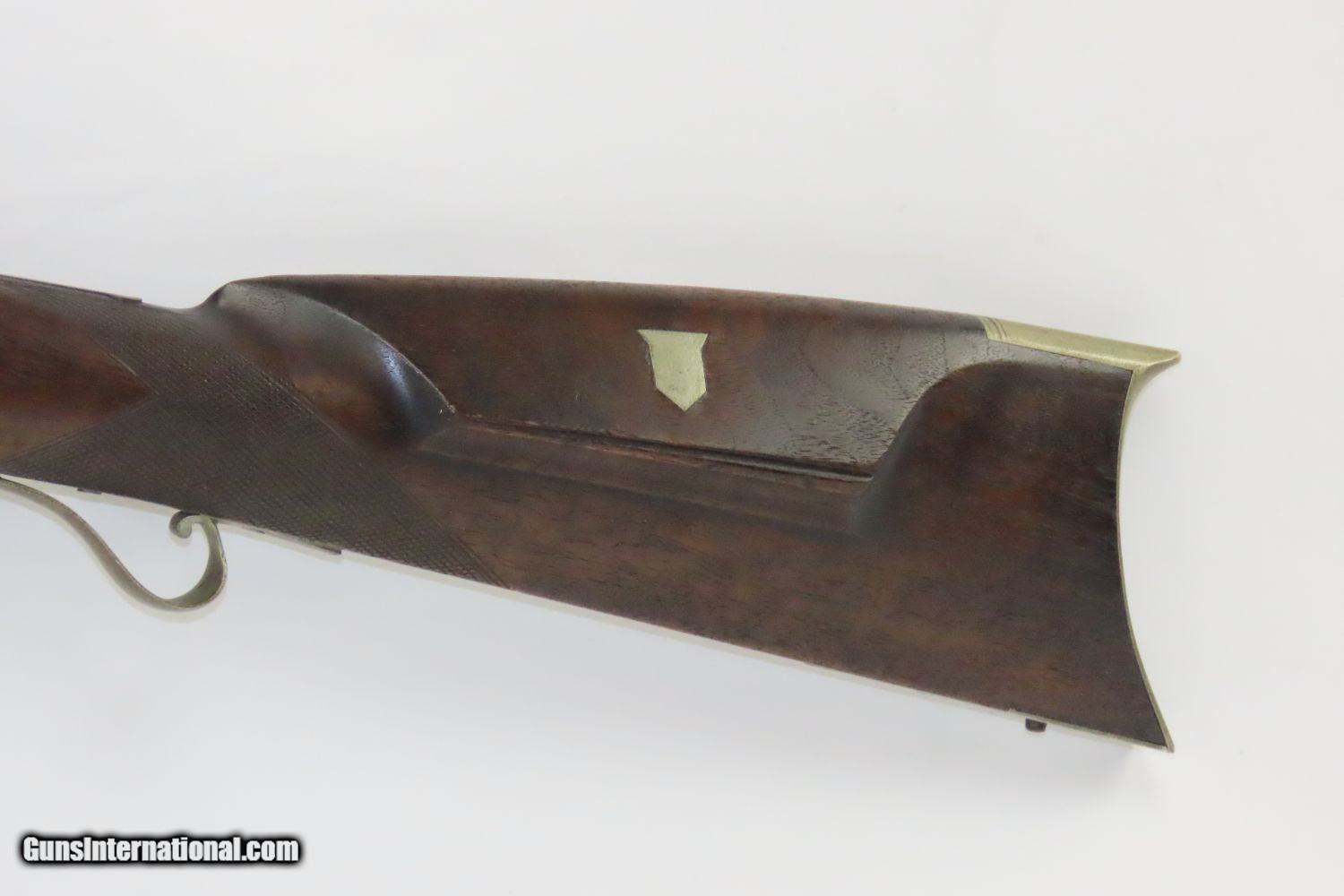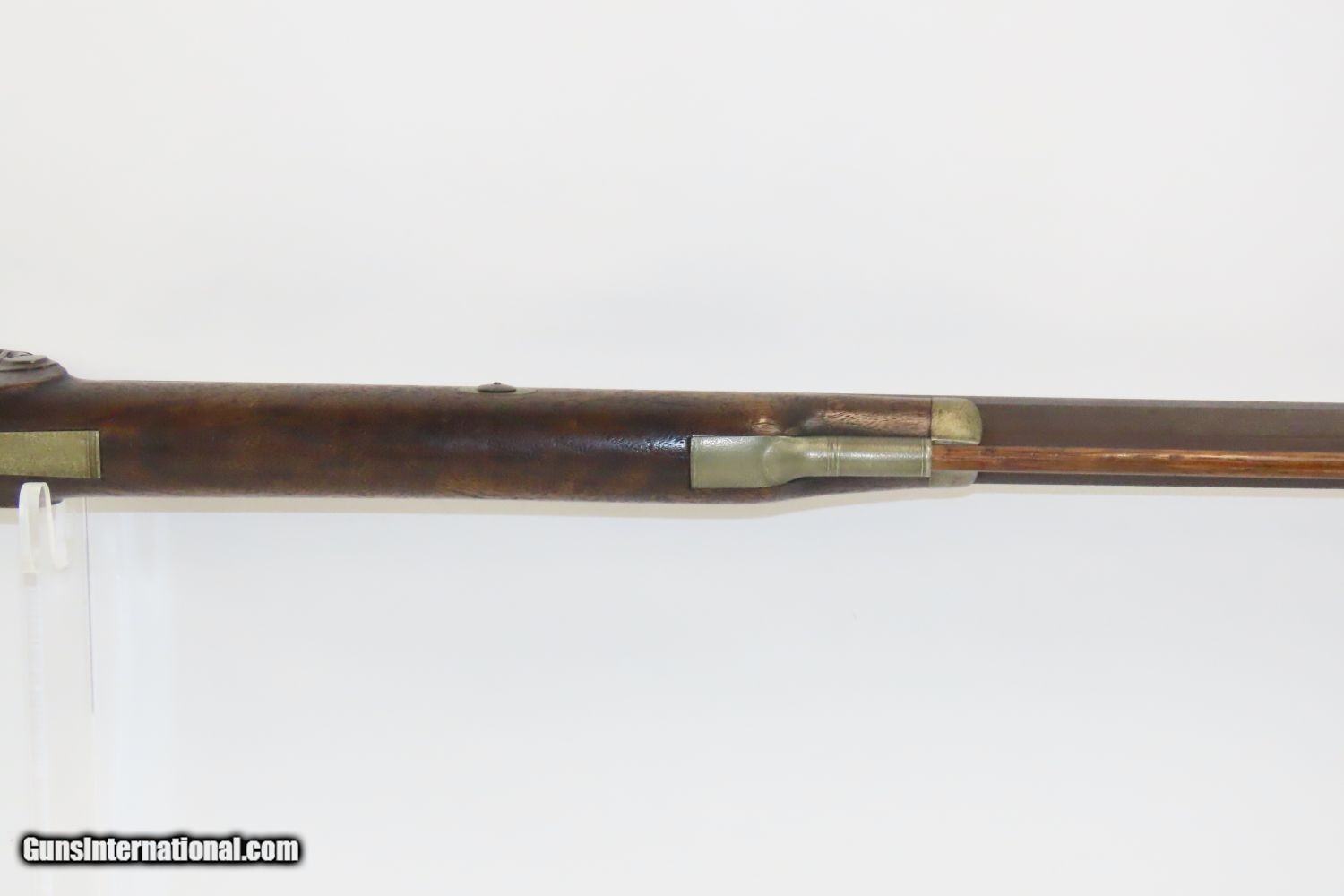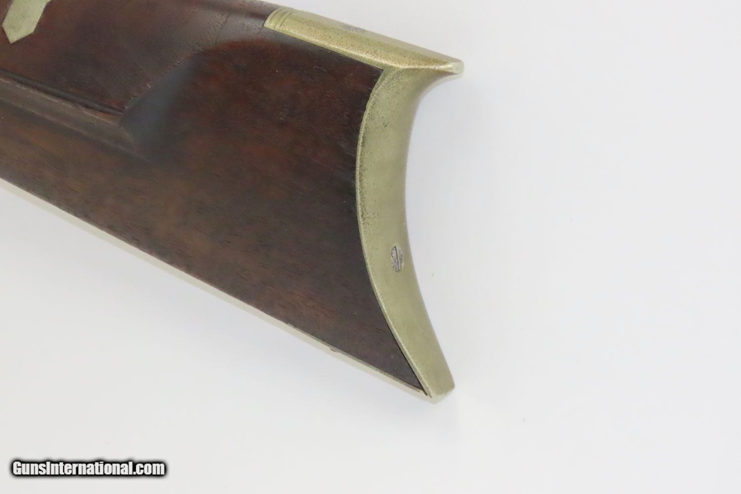 Description: BACK ACTION Half Stock .475 Caliber PERCUSSION American LONG RIFLE Kentucky Style Long Rifle with CONSTABLE Marked Lock! Here we present an Antique Back Action Half Stock Percussion Long Rifle, made circa the mid-19th Century. Its stout octagonal barrel is in .475 caliber, large enough to take medium to large sized game or to defend the homestead against unwanted aggression. Rifle manufacture in the mid-to-late 19th Century was rapidly changing over from thousands of craftsmen all over the United States and on the Frontier making and selling their wares, to the large factories with standardized assembly lines and modern manufacturing techniques. Many makers’ names of the so-called Kentucky long rifles have been lost over time. This rifle is one such example. The American Longrifle, more commonly, but less correctly, known as the ‘Kentucky rifle’, was described by Captain John G. W. Dillin in the dedication to his seminal 1924 book, The Kentucky Rifle: “From a flat bar of soft iron, hand forged into a gun barrel; laboriously bored and rifled with crude tools; fitted with a stock hewn from a maple tree in the neighboring forest; and supplied with a lock hammered to shape on the anvil; an unknown smith, in a shop long since silent, fashioned a rifle which changed the whole course of world history; made possible the settlement of a continent; and ultimately freed our country of foreign domination. Light in weight; graceful in line; economical in consumption of powder and lead; fatally precise; distinctly American; it sprang into immediate popularity; and for a hundred years was a model often slightly varied but never radically changed.” These locks were called “back action” because the mainspring hangs behind the tumbler. The back action is often used in double rifles and occasionally in single barrel shotguns where the need for strength requires as little steel as possible be removed from the bar of the action. This lock was popular on percussion guns made in St. Louis, New York, California, Ohio, England and Belgium. Back Action percussion locks were a “late” developed style of lock. Used primarily on the hardware store line of guns, these locks did, however, show up on some better pieces in the mid-to-late 1800′s. Back Action locks are extremely fast and are often used on competition, squirrel, and light-weight boy’s rifles. The overall condition is very good. The action is strong. The bore is in very nice shape with nice rifling. The breech in inlaid with a nice band of platinum. “CONSTABLE” is engraved on the lock. Here is a solid plains rifle to collect and display! Own the original! This is a legitimate antique and not a reproduction. Barrel is 40-3/4 inches. Caliber: .475 (from land to land) Overall condition as seen in photos. Very Fast. Very Safe. FREE SHIPPING WORLDWIDE. Delivered directly to your door by express mail! Guaranteed AUTHENTIC & Includes CERTIFICATE OF AUTHENTICITY. ancestryguns $1550 #20123 SOLD Antique: Yes |