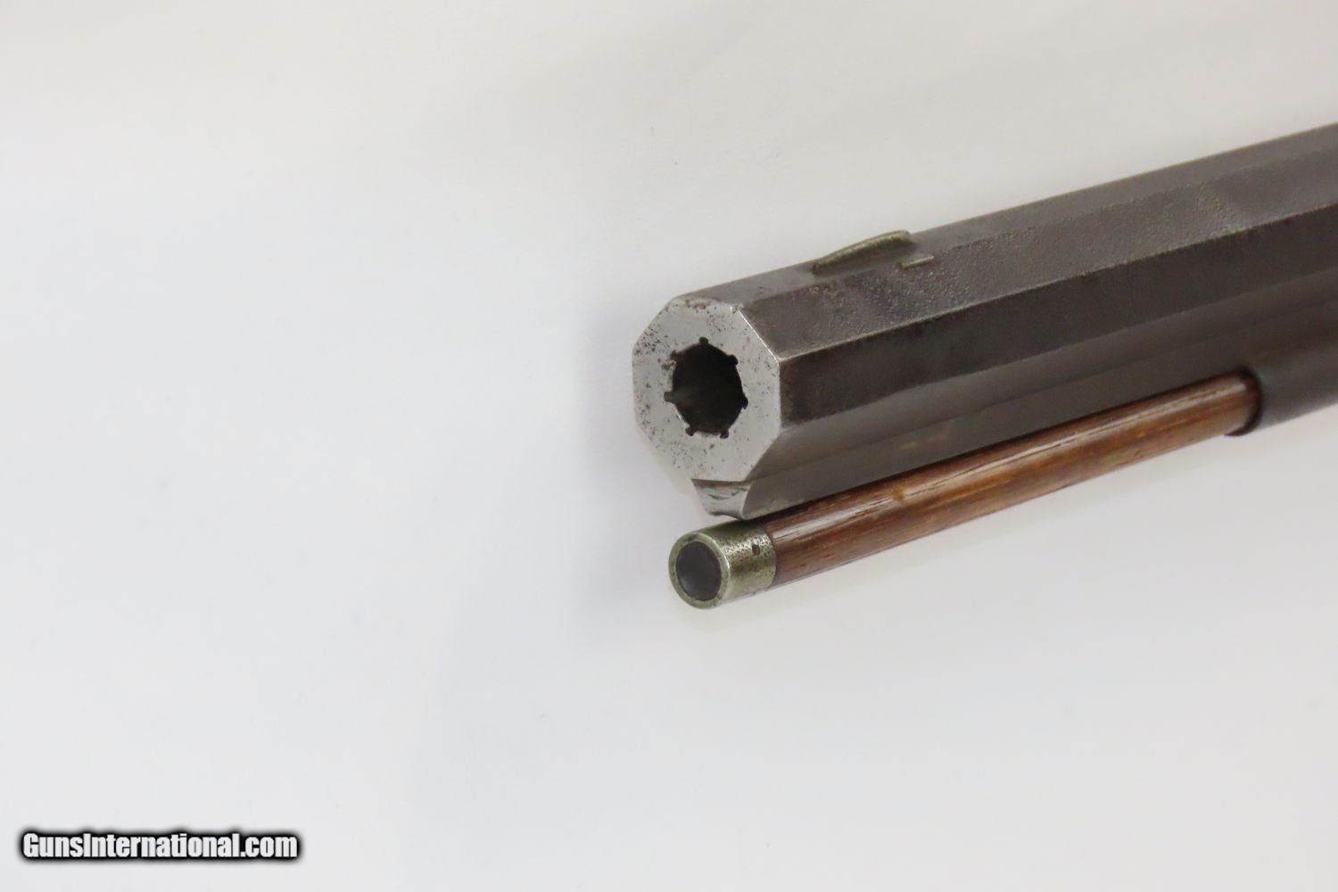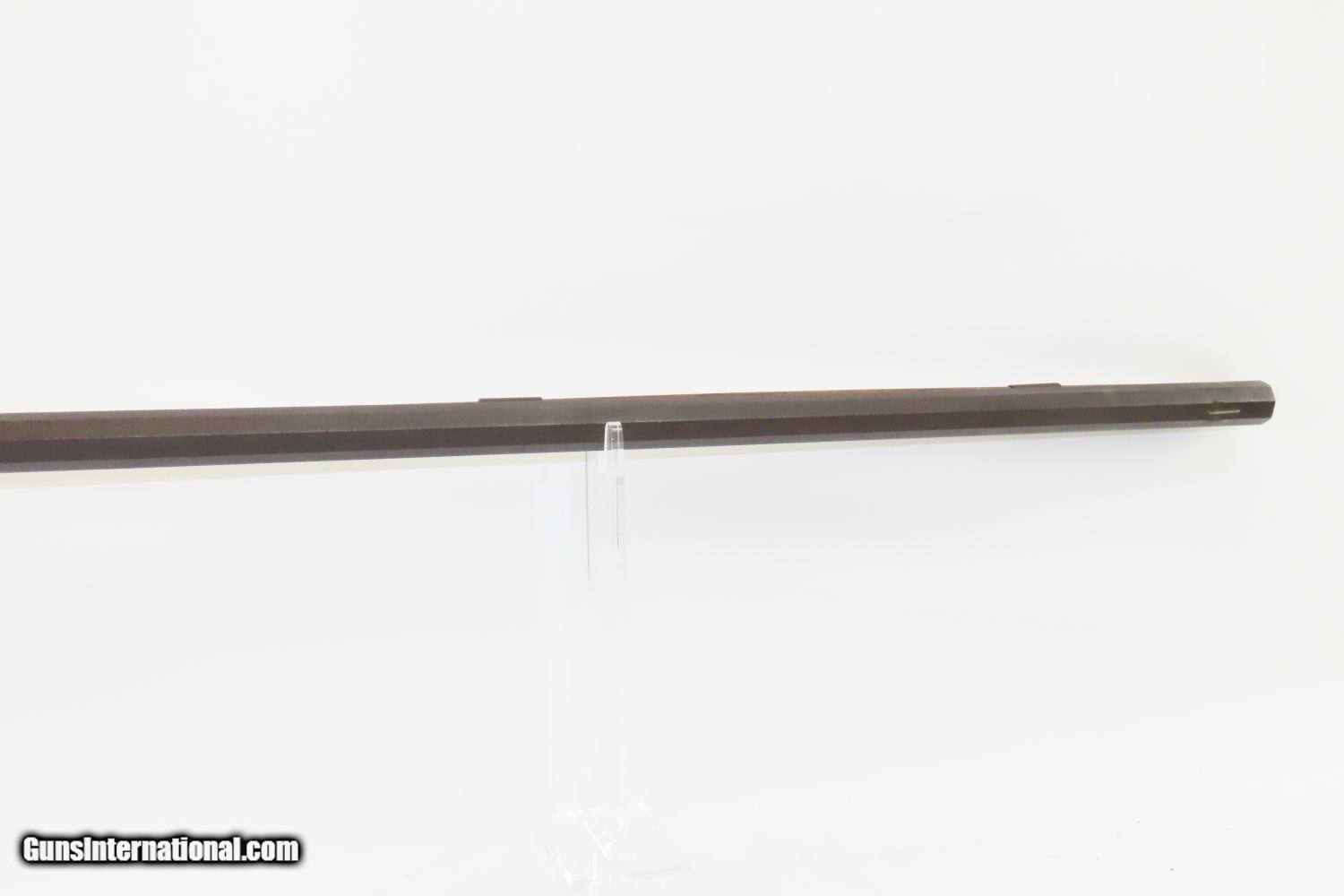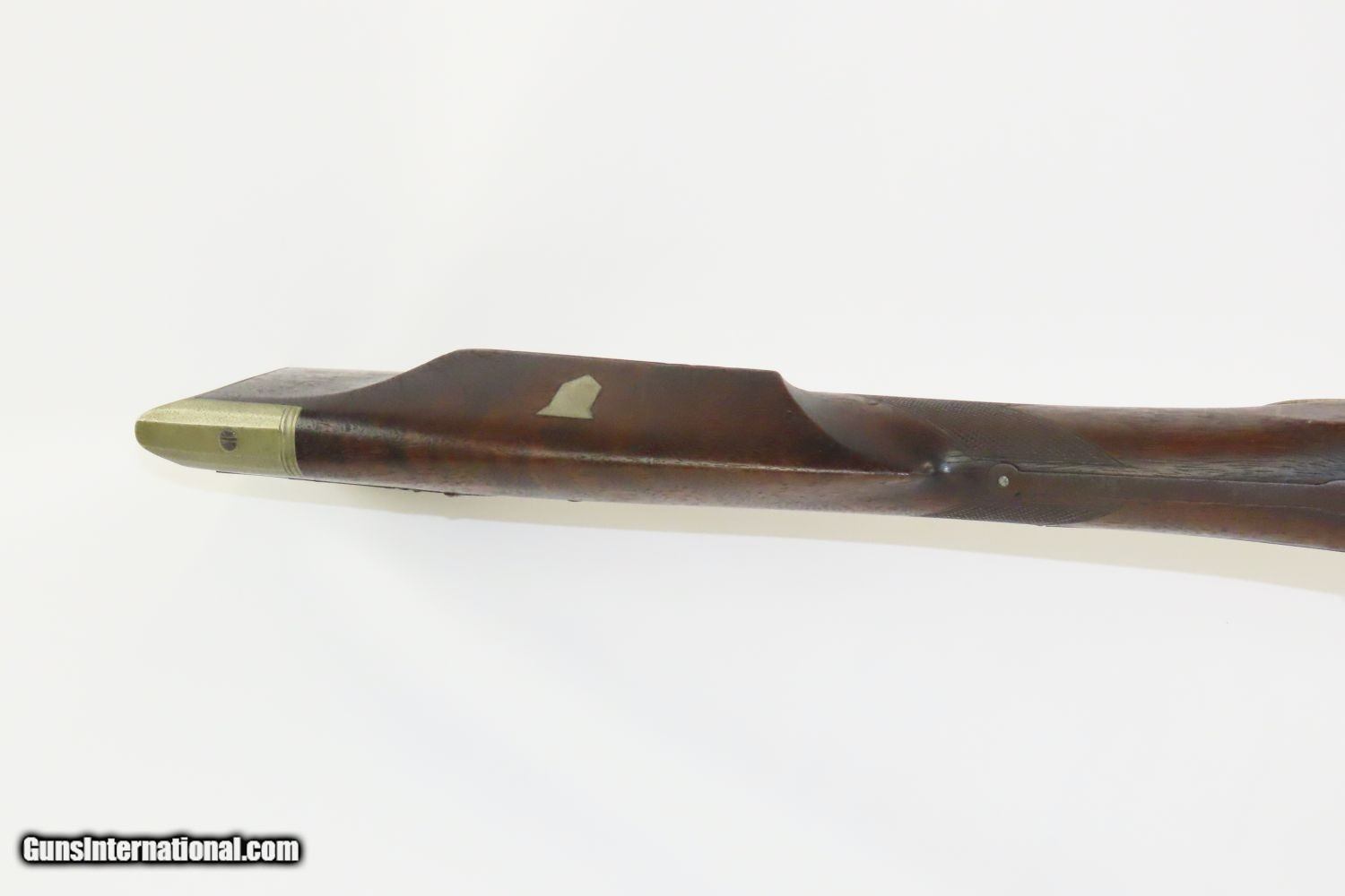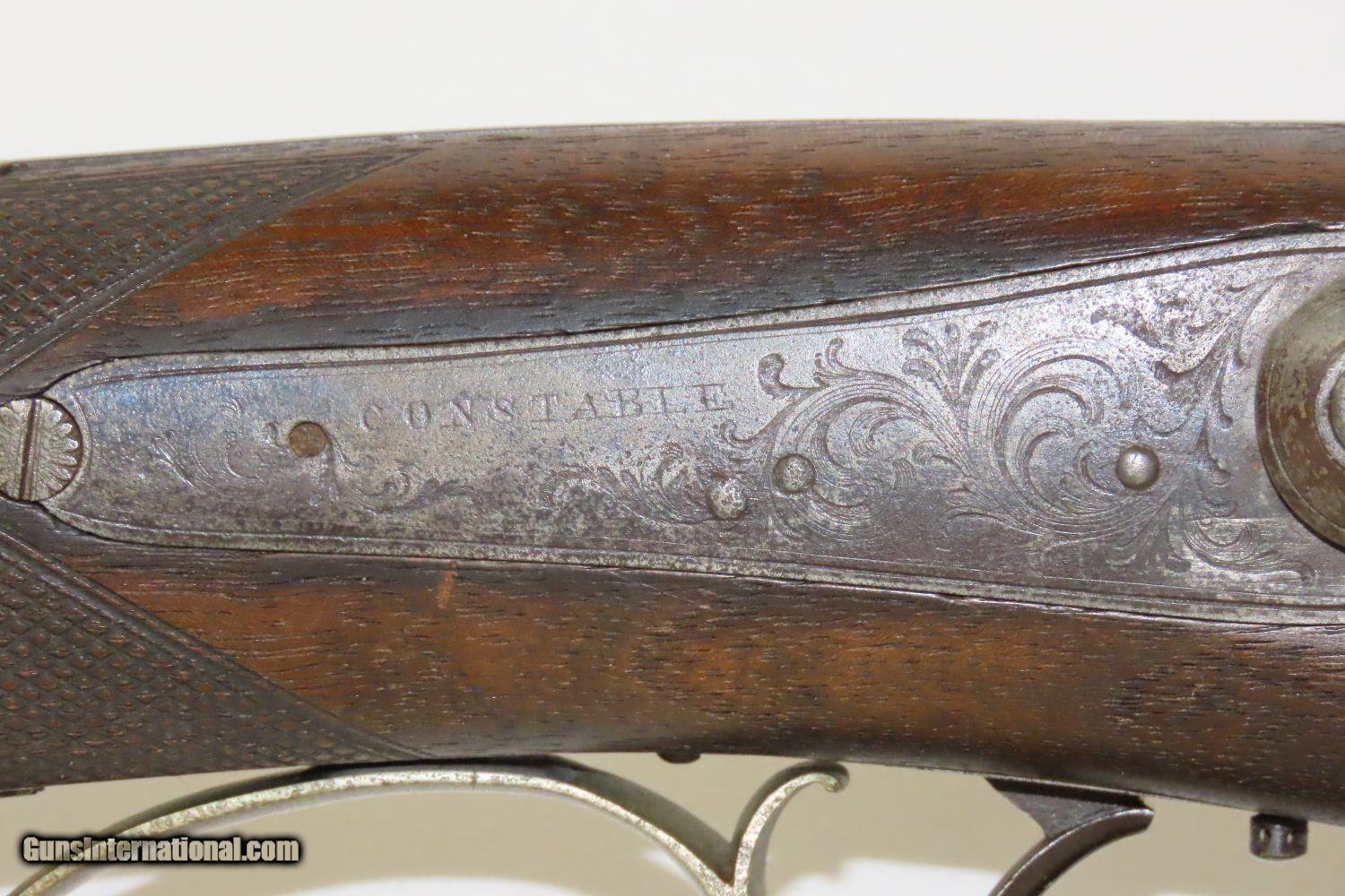 Description: BACK ACTION Half Stock .475 Caliber PERCUSSION American LONG RIFLE Kentucky Style Long Rifle with CONSTABLE Marked Lock! Here we present an Antique Back Action Half Stock Percussion Long Rifle, made circa the mid-19th Century. Its stout octagonal barrel is in .475 caliber, large enough to take medium to large sized game or to defend the homestead against unwanted aggression. Rifle manufacture in the mid-to-late 19th Century was rapidly changing over from thousands of craftsmen all over the United States and on the Frontier making and selling their wares, to the large factories with standardized assembly lines and modern manufacturing techniques. Many makers’ names of the so-called Kentucky long rifles have been lost over time. This rifle is one such example. The American Longrifle, more commonly, but less correctly, known as the ‘Kentucky rifle’, was described by Captain John G. W. Dillin in the dedication to his seminal 1924 book, The Kentucky Rifle: “From a flat bar of soft iron, hand forged into a gun barrel; laboriously bored and rifled with crude tools; fitted with a stock hewn from a maple tree in the neighboring forest; and supplied with a lock hammered to shape on the anvil; an unknown smith, in a shop long since silent, fashioned a rifle which changed the whole course of world history; made possible the settlement of a continent; and ultimately freed our country of foreign domination. Light in weight; graceful in line; economical in consumption of powder and lead; fatally precise; distinctly American; it sprang into immediate popularity; and for a hundred years was a model often slightly varied but never radically changed.” These locks were called “back action” because the mainspring hangs behind the tumbler. The back action is often used in double rifles and occasionally in single barrel shotguns where the need for strength requires as little steel as possible be removed from the bar of the action. This lock was popular on percussion guns made in St. Louis, New York, California, Ohio, England and Belgium. Back Action percussion locks were a “late” developed style of lock. Used primarily on the hardware store line of guns, these locks did, however, show up on some better pieces in the mid-to-late 1800′s. Back Action locks are extremely fast and are often used on competition, squirrel, and light-weight boy’s rifles. The overall condition is very good. The action is strong. The bore is in very nice shape with nice rifling. The breech in inlaid with a nice band of platinum. “CONSTABLE” is engraved on the lock. Here is a solid plains rifle to collect and display! Own the original! This is a legitimate antique and not a reproduction. Barrel is 40-3/4 inches. Caliber: .475 (from land to land) Overall condition as seen in photos. Very Fast. Very Safe. FREE SHIPPING WORLDWIDE. Delivered directly to your door by express mail! Guaranteed AUTHENTIC & Includes CERTIFICATE OF AUTHENTICITY. ancestryguns $1550 #20123 SOLD Antique: Yes |
