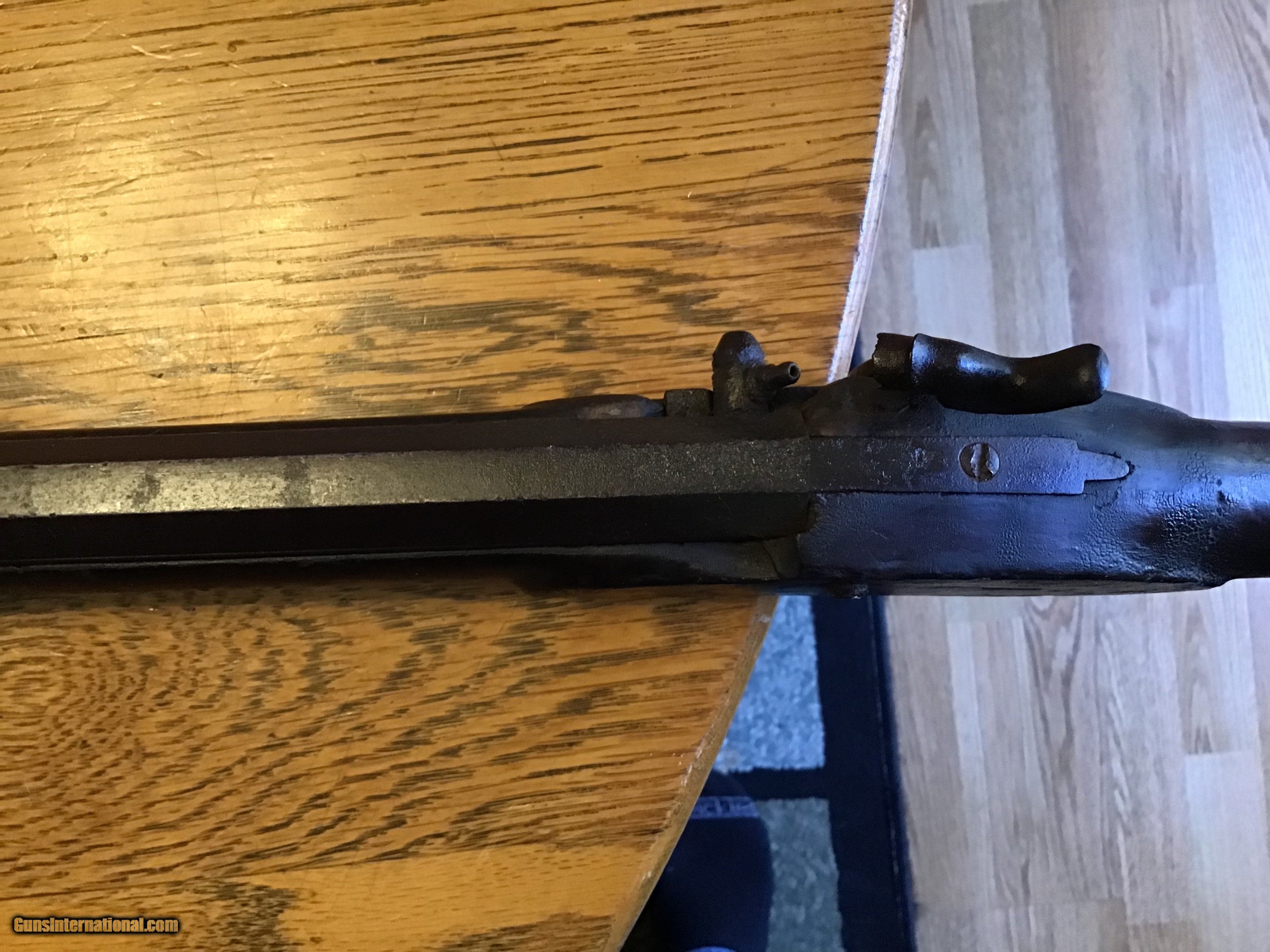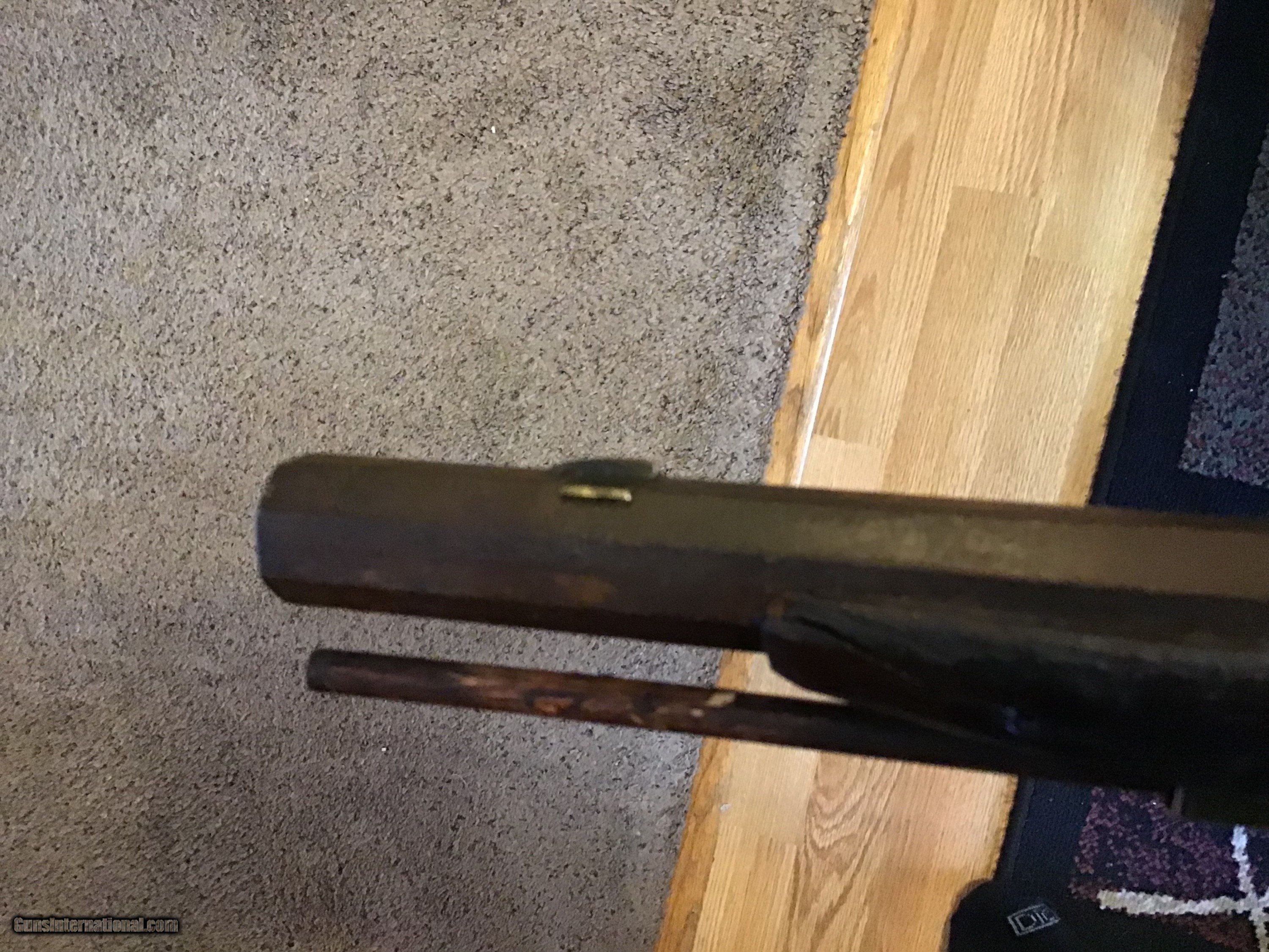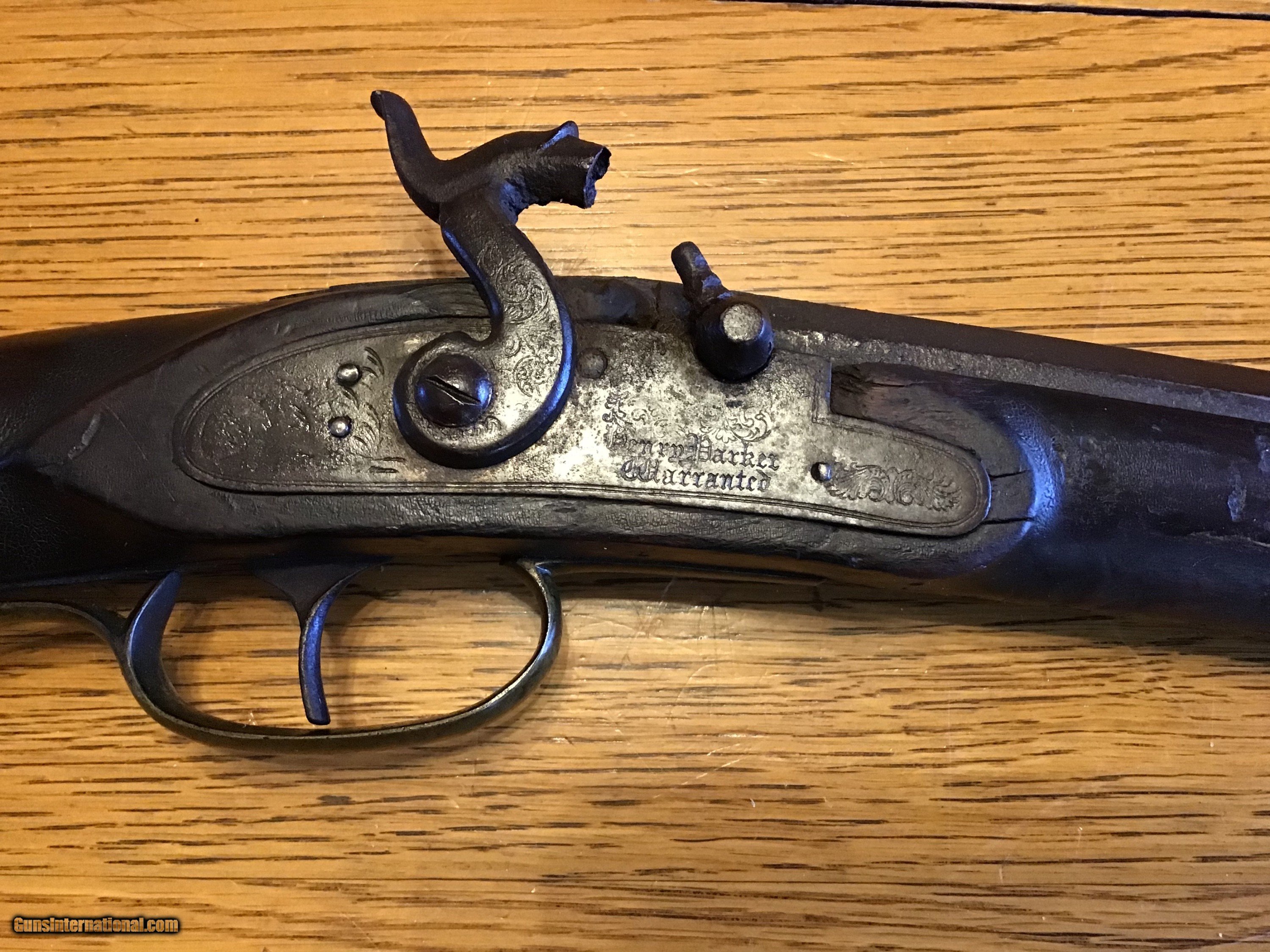 Description: Mid 1800s Kentucky long rifle by Henry Parker. This full stock long rifle is 63 inches long With a 54 caliber smooth bore barrel is dark brown with front and rear sights has scattered pitting. The full dark walnut stock shows much use with dents, scratches and chips. The functioning lock is marked Henry Parker warranted. The but plate, trigger guard and ram rod quides are brass with a brown patina. Please feel free to contact me with any questions. Shipping will be actual cost by usps insured priority mail with tracking. SOLD Antique: Yes |