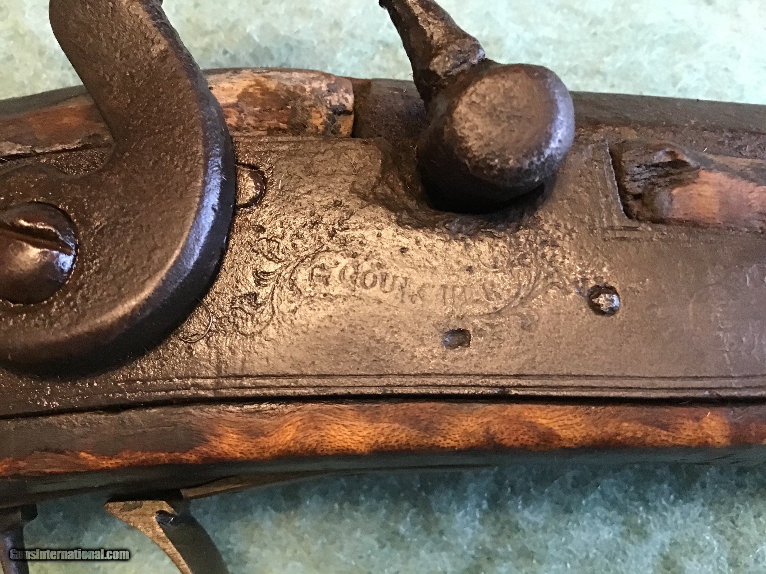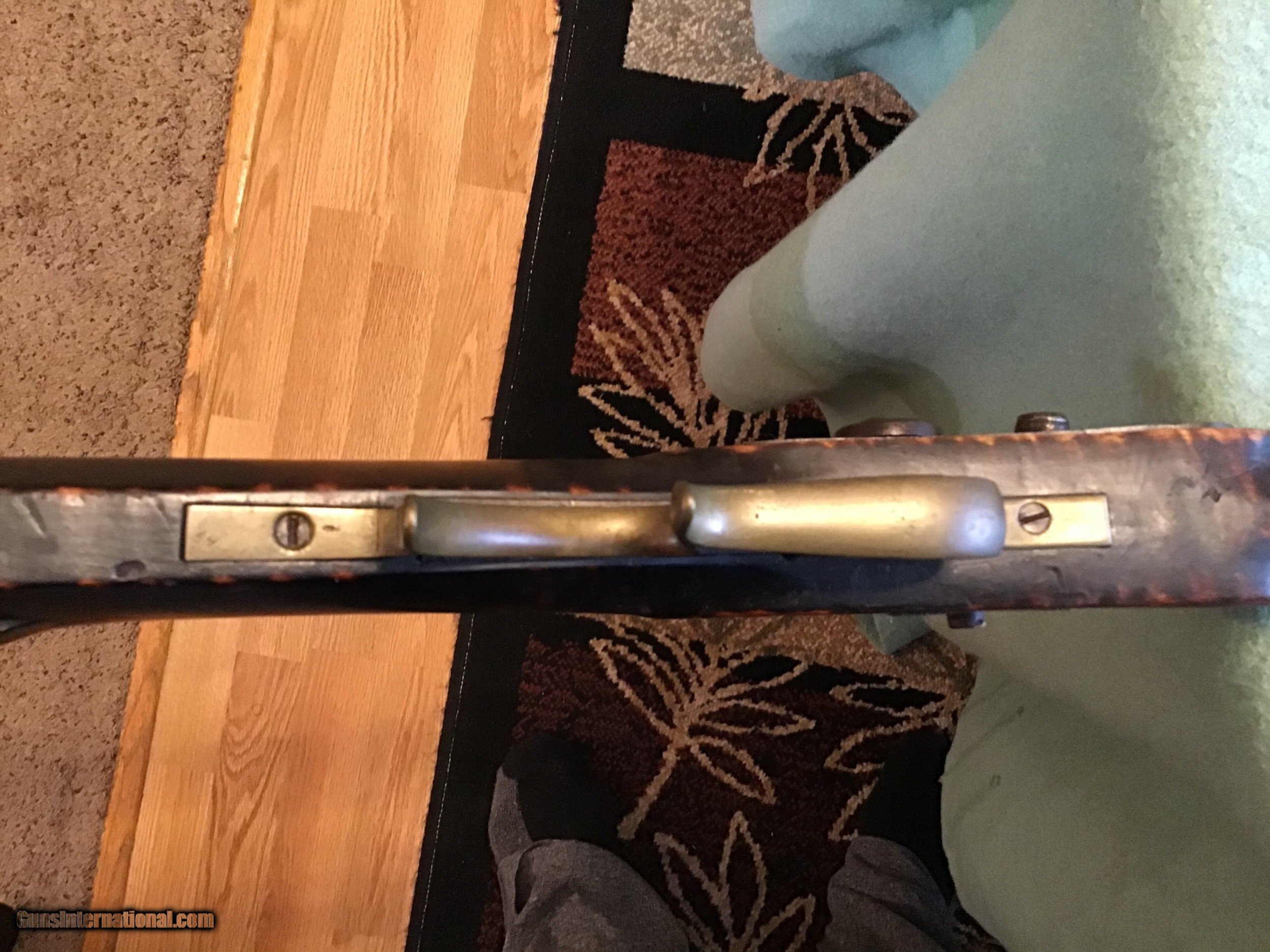 Description: On Hold Sale Pending Circa 1850's Kentucky/Pennsylvania 36 calibers rifle. The functioning lock with set trigger is Marked " Goulcher". The hammer is a bit loose but does function. The 35" barrel is signed (see photo) and has both front and rear sights. The approximately 36 Caliber bore is rifled but needs cleaning. The lock and barrel have a uncleaned dark brown patina. The brass but plate and trigger guard have a uncleaned brown patina. The dark wood probably maple has a tiger stripe appearance. Overall a good old Kentucky rifle. Shipping will be actual cost by insured priority mail mail with tracking. SOLD Antique: Yes |
