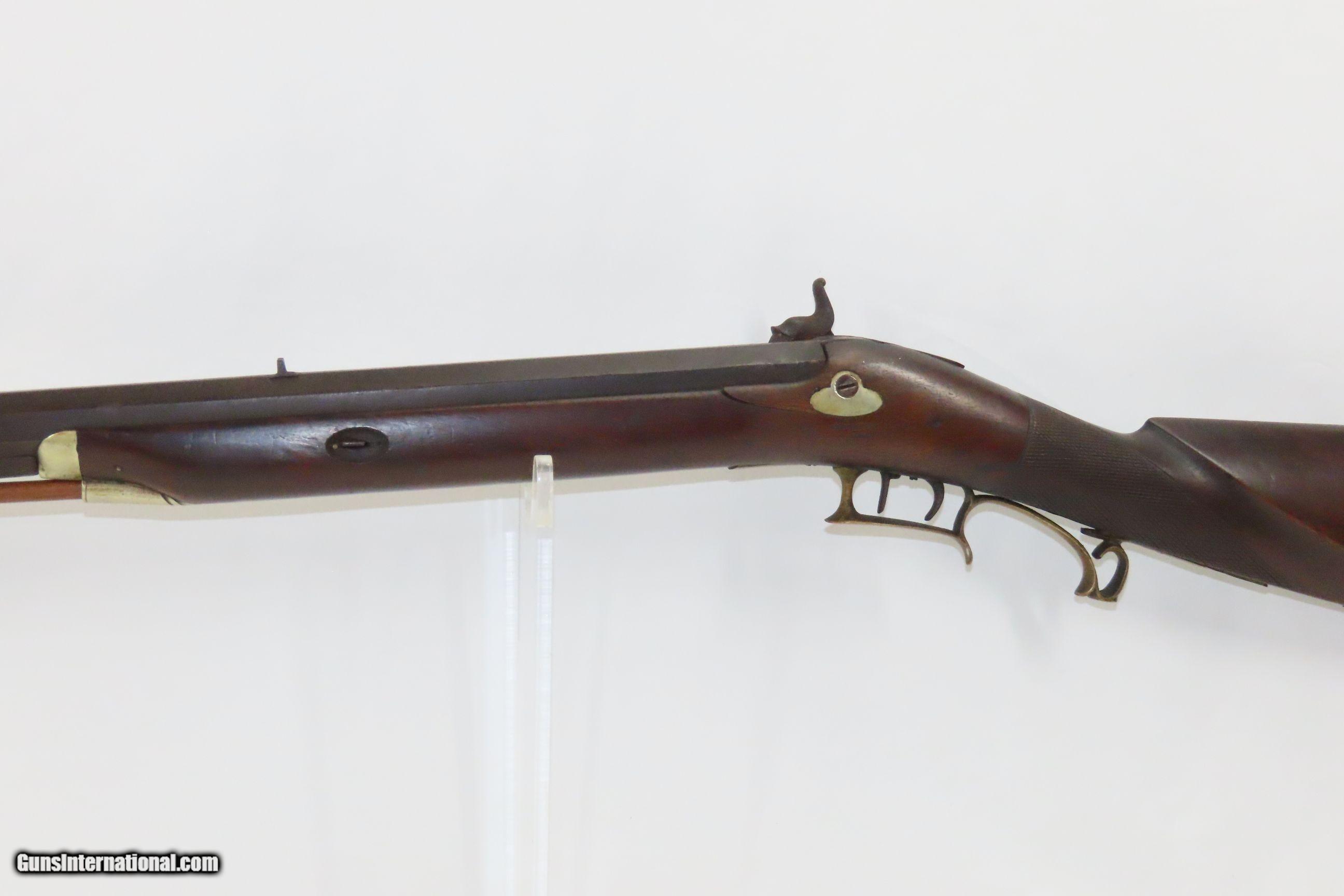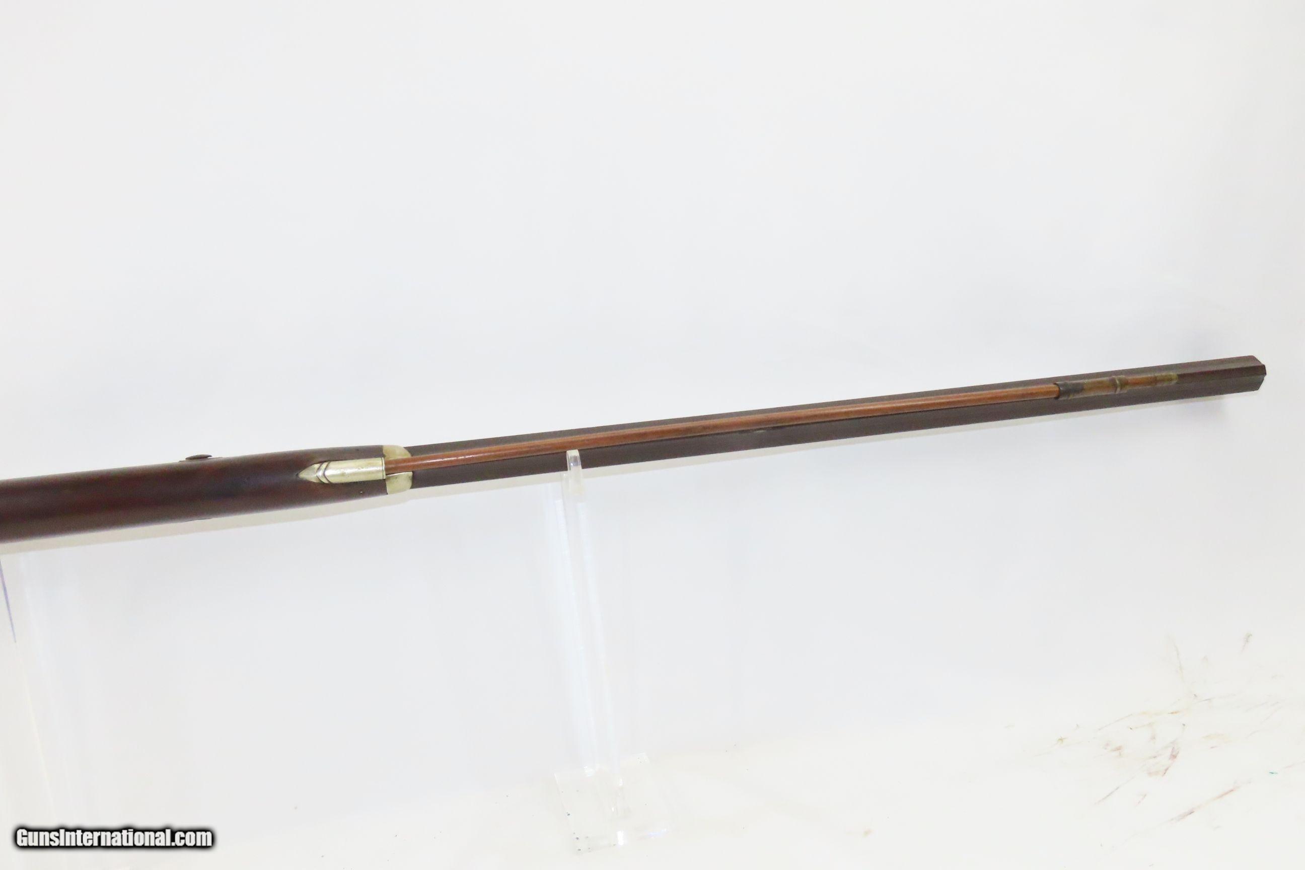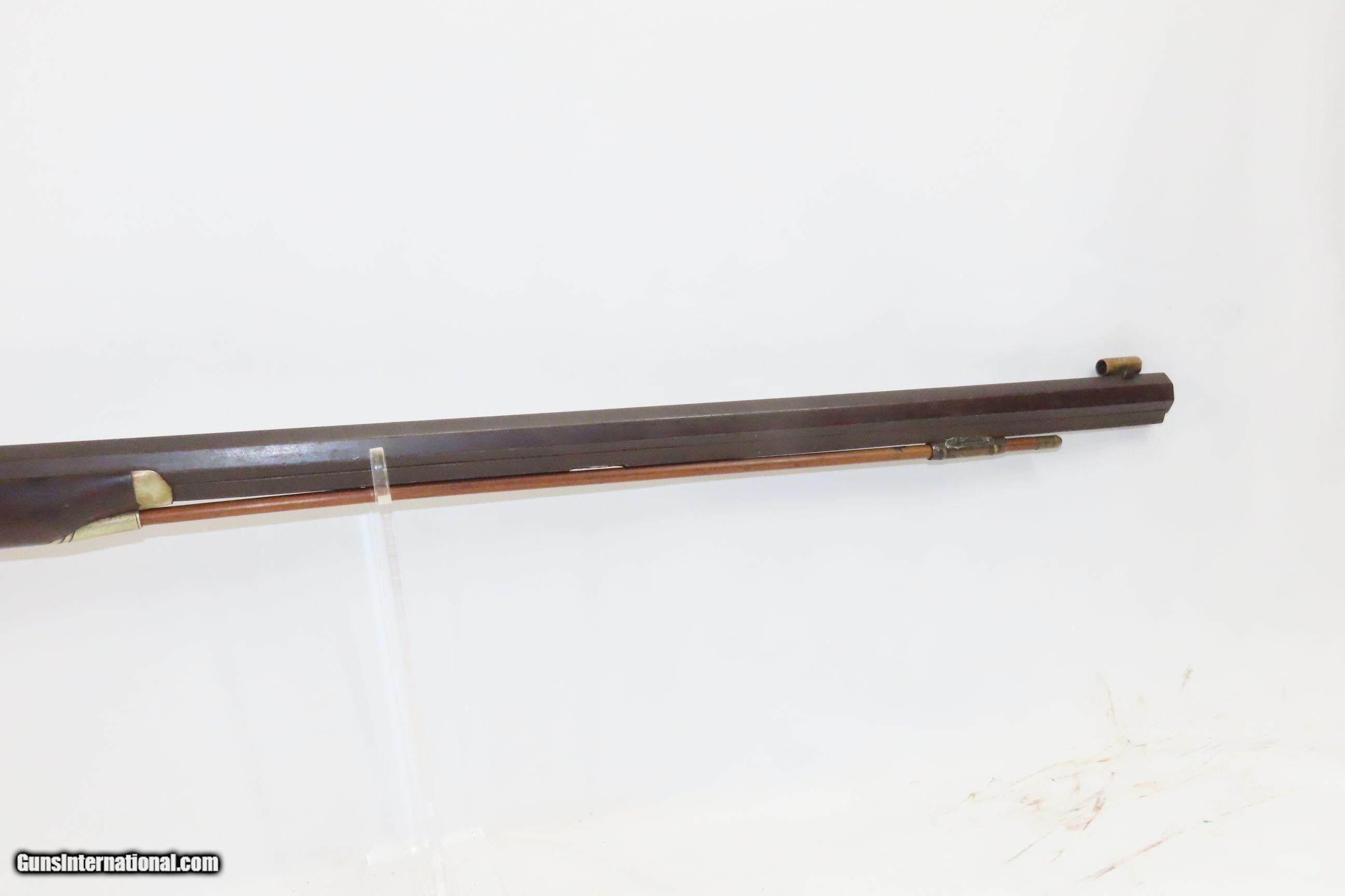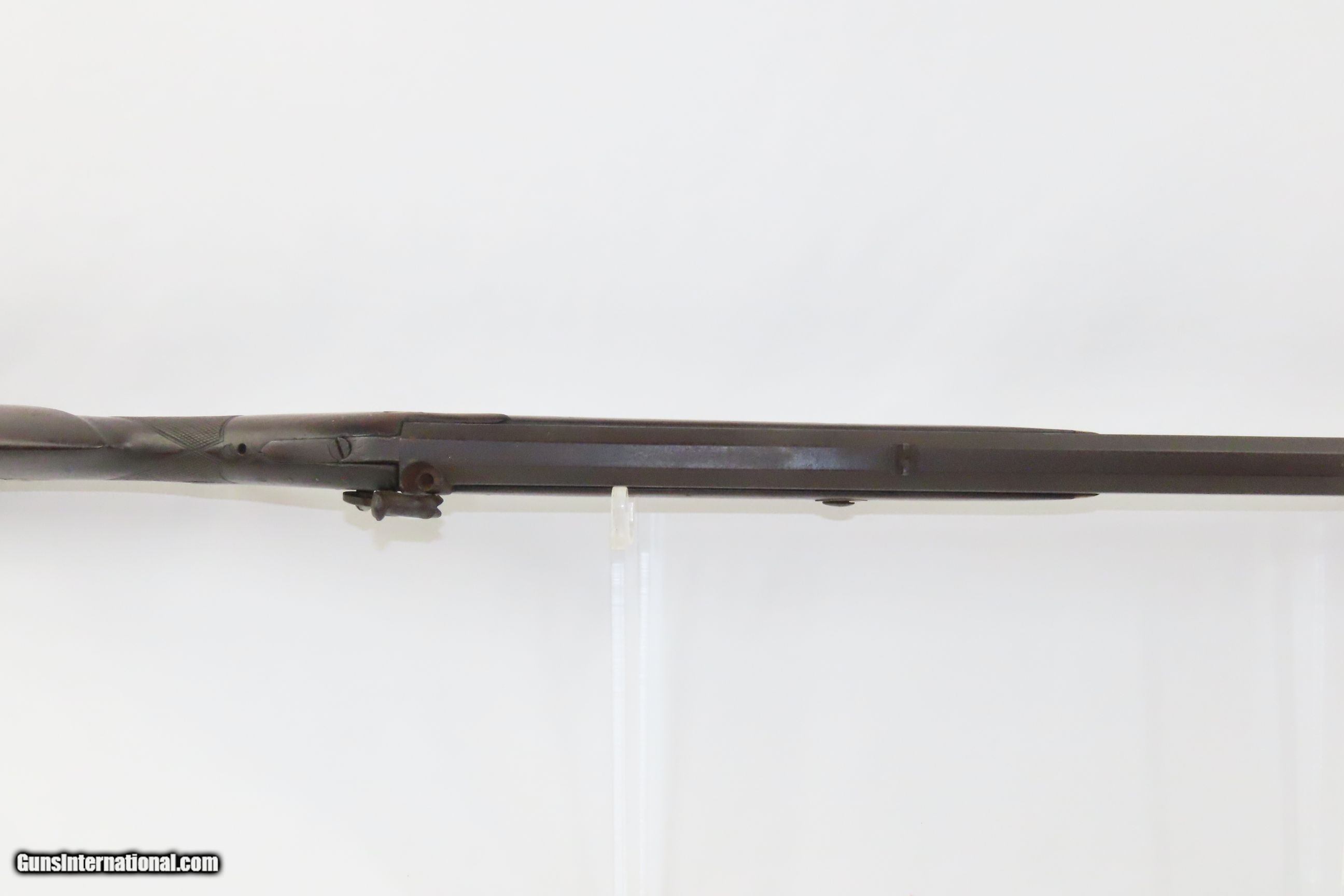 Description: ENGRAVED Antique Half Stock BACK ACTION Percussion .42 Long Rifle FRONTIER Mid-1800s HOMESTEAD/HUNTING Rifle Here we present an antique Back Action Half Stock American Percussion Long Rifle, made circa the mid-19th Century. Its stout octagonal barrel is in .45 caliber, large enough to take small to medium sized game or to defend the homestead against unwanted aggression. Rifle manufacture in the mid-to-late 19th Century was rapidly changing over from thousands of craftsmen all over the United States and on the Frontier making and selling their wares, to the large factories with standardized assembly lines and modern manufacturing techniques. Many makers’ names of the so-called Kentucky long rifles have been lost over time. This rifle is one such example. These locks were called “back action” because the mainspring hangs behind the tumbler. The back action is often used in single and double rifles, and occasionally in single barrel shotguns where the need for strength requires as little steel as possible be removed from the bar of the action. The action on this example does not function and the nipple is missing. Good bore. Soldi stock. “JB Badger” is stamped on the left flat. Nice brown barrel patina. The ramrod lug has been repaired and remains stable. The wrist has been drilled and tapped. German silver escutcheons. Own the original! This is a legitimate antique and not a reproduction. Barrel is 34 inches. Caliber: .45 Percussion Overall condition as seen in photos. Very Fast. Very Safe. FREE SHIPPING WORLDWIDE. Delivered directly to your door by express mail! Guaranteed AUTHENTIC & Includes CERTIFICATE OF AUTHENTICITY. ancestryguns $1200 #230889 SOLD Antique: Yes |