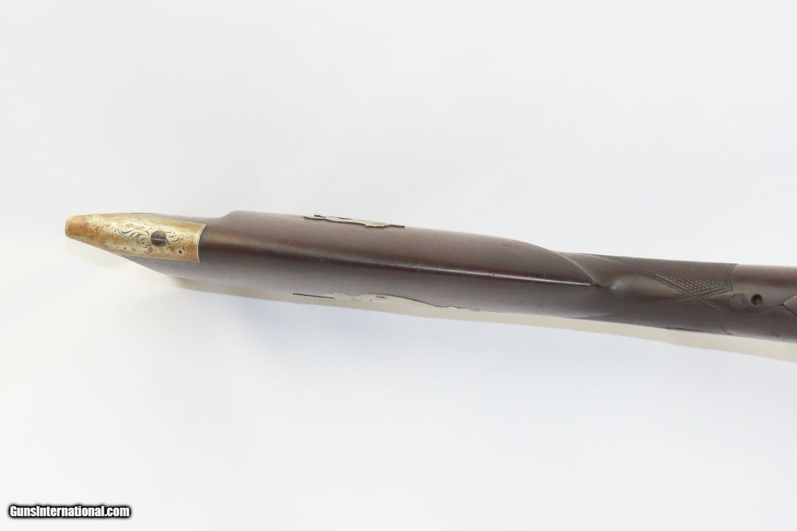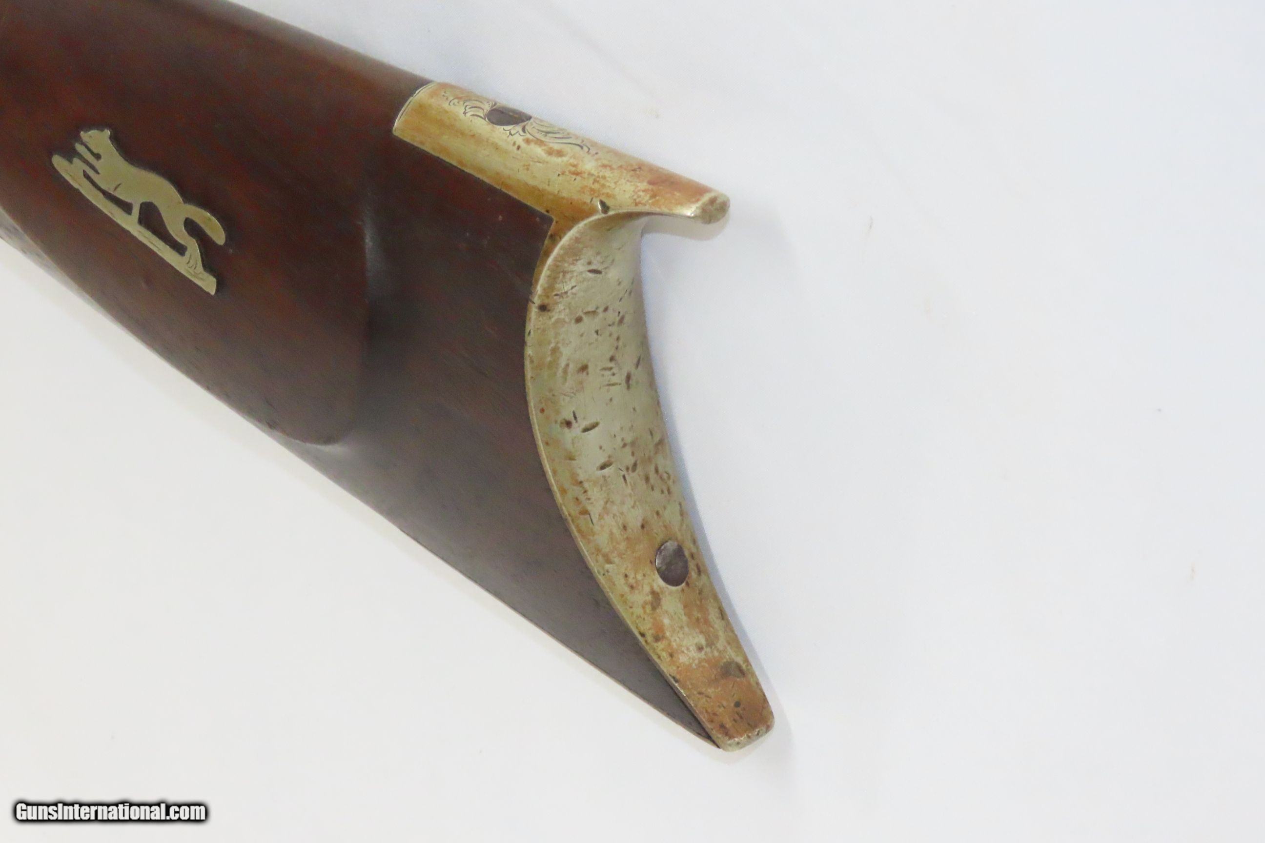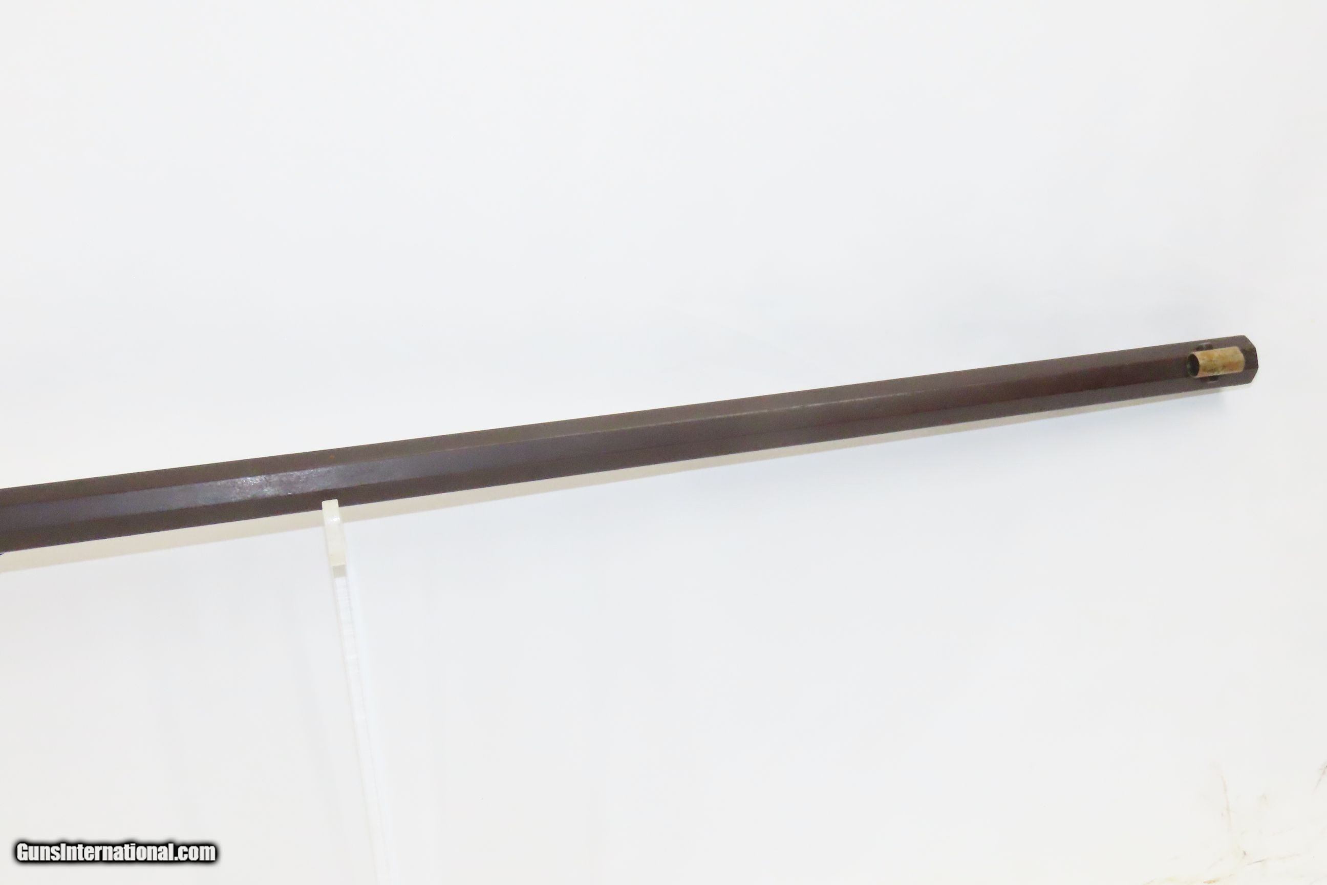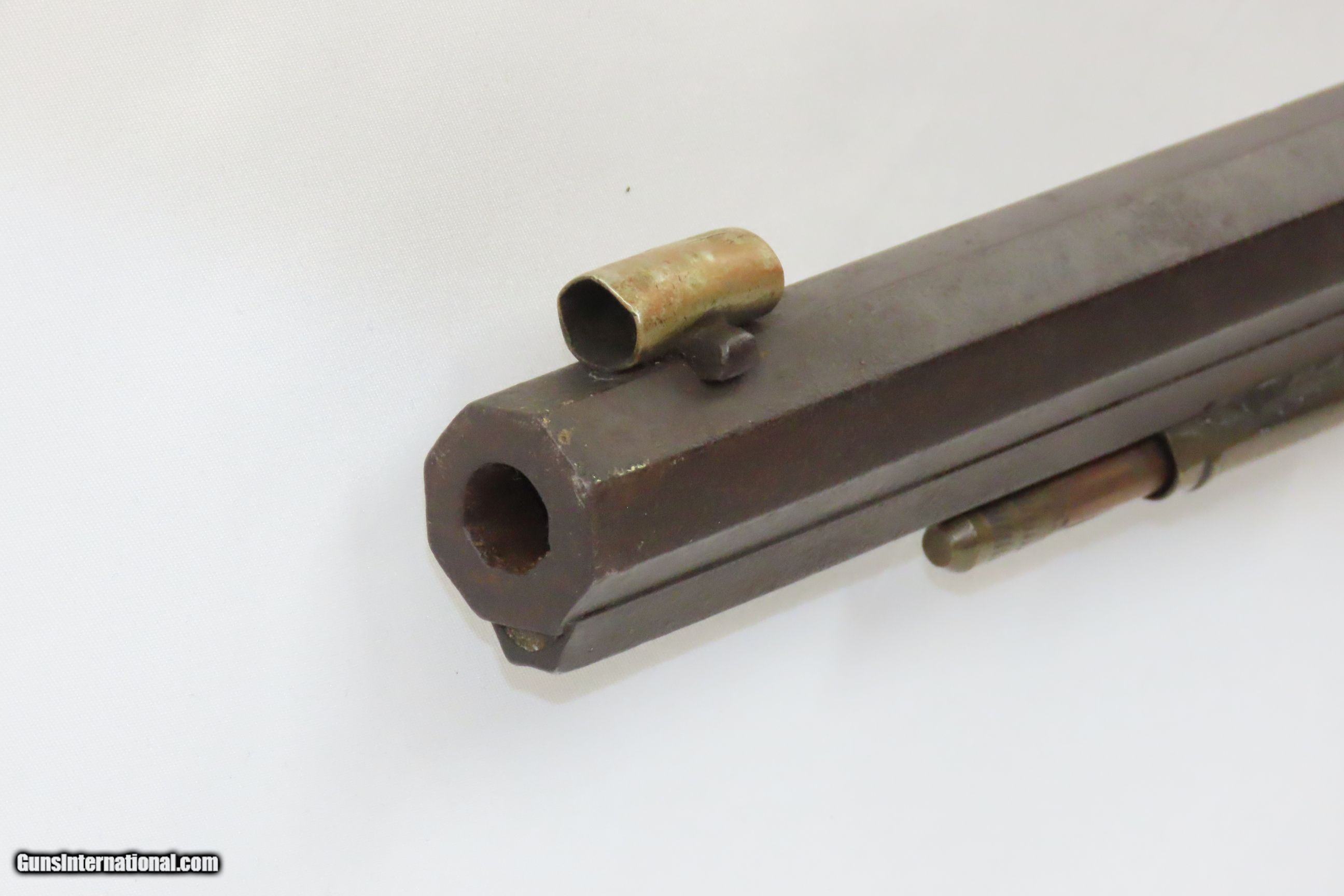 Description: ENGRAVED Antique Half Stock BACK ACTION Percussion .42 Long Rifle FRONTIER Mid-1800s HOMESTEAD/HUNTING Rifle Here we present an antique Back Action Half Stock American Percussion Long Rifle, made circa the mid-19th Century. Its stout octagonal barrel is in .45 caliber, large enough to take small to medium sized game or to defend the homestead against unwanted aggression. Rifle manufacture in the mid-to-late 19th Century was rapidly changing over from thousands of craftsmen all over the United States and on the Frontier making and selling their wares, to the large factories with standardized assembly lines and modern manufacturing techniques. Many makers’ names of the so-called Kentucky long rifles have been lost over time. This rifle is one such example. These locks were called “back action” because the mainspring hangs behind the tumbler. The back action is often used in single and double rifles, and occasionally in single barrel shotguns where the need for strength requires as little steel as possible be removed from the bar of the action. The action on this example does not function and the nipple is missing. Good bore. Soldi stock. “JB Badger” is stamped on the left flat. Nice brown barrel patina. The ramrod lug has been repaired and remains stable. The wrist has been drilled and tapped. German silver escutcheons. Own the original! This is a legitimate antique and not a reproduction. Barrel is 34 inches. Caliber: .45 Percussion Overall condition as seen in photos. Very Fast. Very Safe. FREE SHIPPING WORLDWIDE. Delivered directly to your door by express mail! Guaranteed AUTHENTIC & Includes CERTIFICATE OF AUTHENTICITY. ancestryguns $1200 #230889 SOLD Antique: Yes |