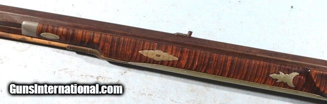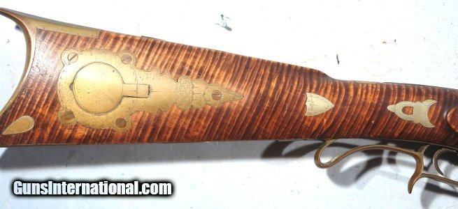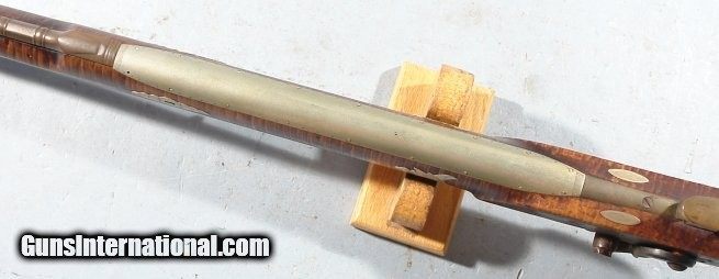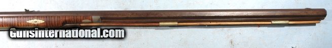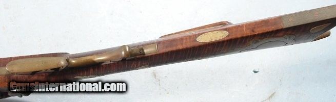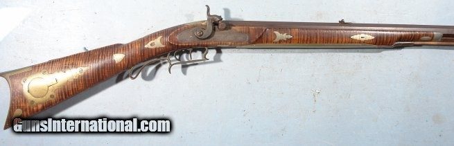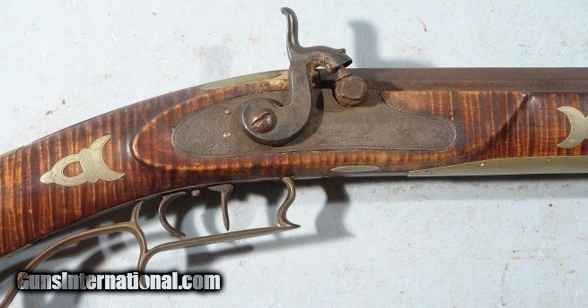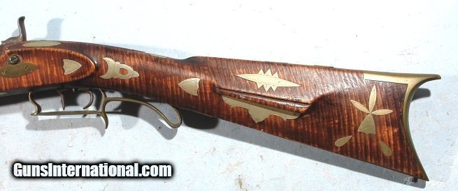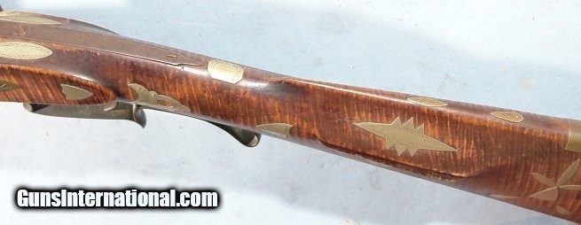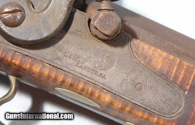 Description: EXCEPTIONAL HENRY LEMAN, LANCASTER, PENNSYLVANIA PERCUSSION HALF STOCK RIFLE CA. 1850. One of the most ornate Henry Leman rifles with 30 engraved German silver inlays and beautiful tiger maple stock. 53” o/a with 38” octagon deeply rifled .36 caliber barrel. Engraved lock signed “LEMAN/LANSTR, PA.”. Brass patch box with “ACORN” engraved finial. Beautifully engraved inlays with all present and original. German silver ramrod pipes. Double set triggers and very nice flat bottom brass trigger guard. Excellent all original condition with no cleaning or restoration. Real attic excellent condition. Excellent bore. For two examples of similar quality Leman rifles see Wood & Whisker’s “ARMS MAKERS OF LANCASTER COUNTY, PENNSYLVANIA” pages 130 & 131. Although Henry Leman was one of the most prolific of Lancaster makers examples of his inlaid ornate rifles are very scarce as much of his production were plain trade rifles and utilitarian quality rifles made for settlers going West. SOLD Antique: Yes |