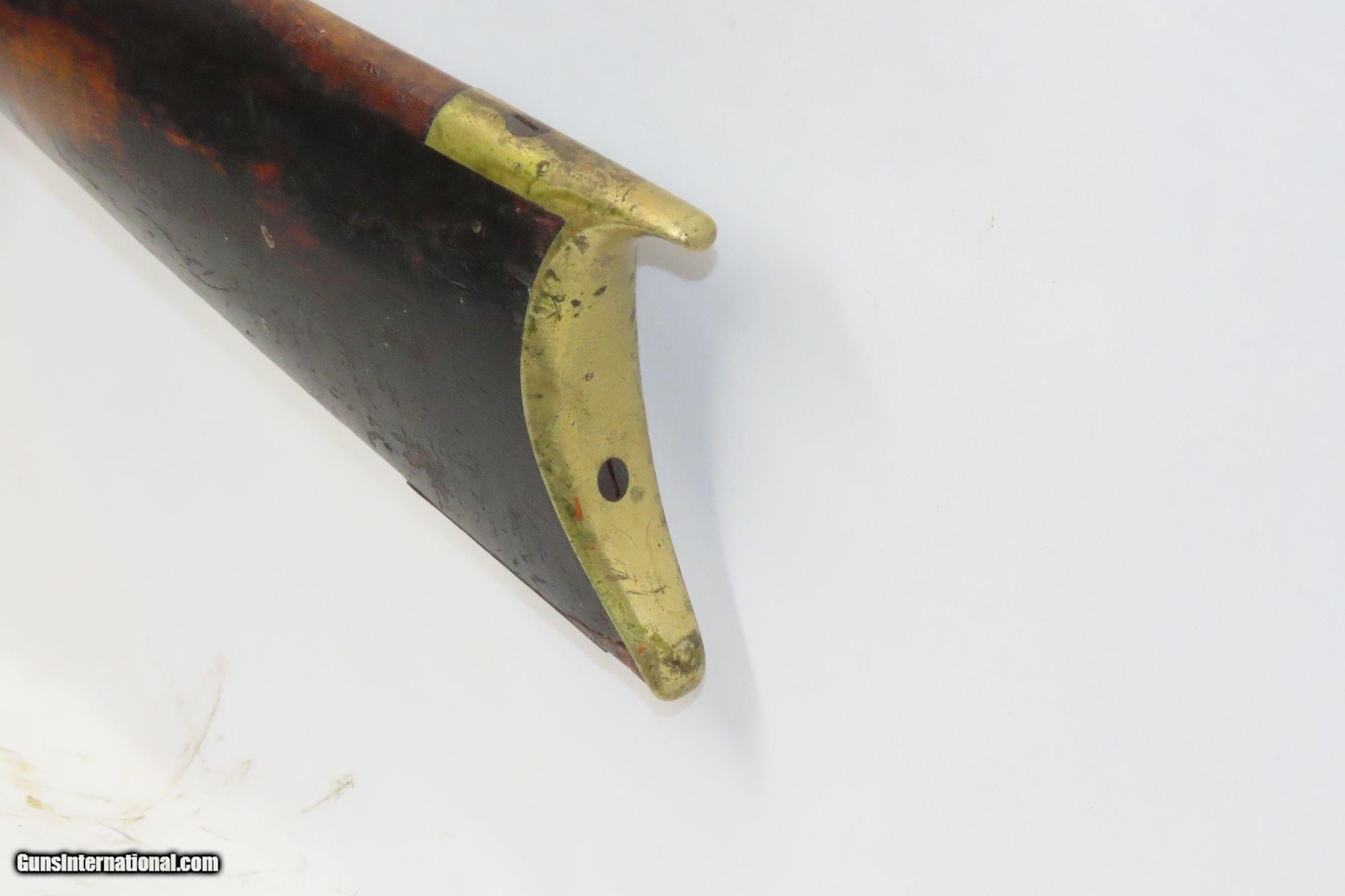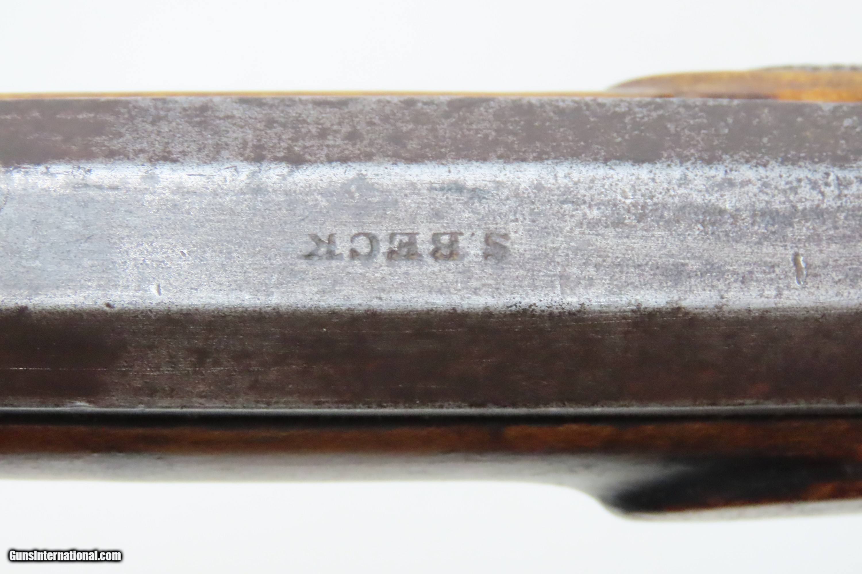 Description: INDIANAPOLIS LONG RIFLE by S. BECK c1860s .34 Cal Pioneer Frontier Antique MARION COUNTY, IN Gunmaking Family Here we present an antique S. Beck Half Stock Percussion Long Rifle, made circa the mid-1860s in Indianapolis, Indiana. In the Marion County and Indianapolis area in the mid-1800s, Christian Beck, Samuel Beck, Jacob Beck and William Beck worked as gunsmiths building flint lock rifles, percussion rifles, pistols, and shot guns. Their firearms are marked with their names stamped or signed into the barrels. The Becks had gun shops listed in Indianapolis and they were listed in the Indianapolis City Directory from 1858 onward. Samuel Beck was born in Pennsylvania in 1809. He built full and half stock rifles, pistols, flintlocks, percussion rifles & shotguns in Indianapolis, Indiana from 1861-1885. He is listed as the owner of the gun manufacturing company “Samuel Beck & Son” in Indianapolis. The business was located at 63 East Washington Street, Indianapolis. The overall condition is good. Original patina on the barrel. The action is strong. The bore is dim with decent rifling. The stock is solid and shows use. No ramrod. One of the ramrod tubes is absent. A well-used long rifle from Indiana! Own the original! This is a legitimate antique and not a reproduction. Barrel is 35-1/4 inches. Caliber: .34 Percussion Overall condition as seen in photos. Very Fast. Very Safe. FREE SHIPPING WORLDWIDE. Delivered directly to your door by express mail! Guaranteed AUTHENTIC & Includes CERTIFICATE OF AUTHENTICITY. ancestryguns $1300 #230741 SOLD Antique: Yes |
