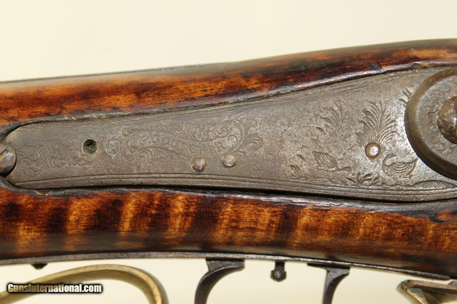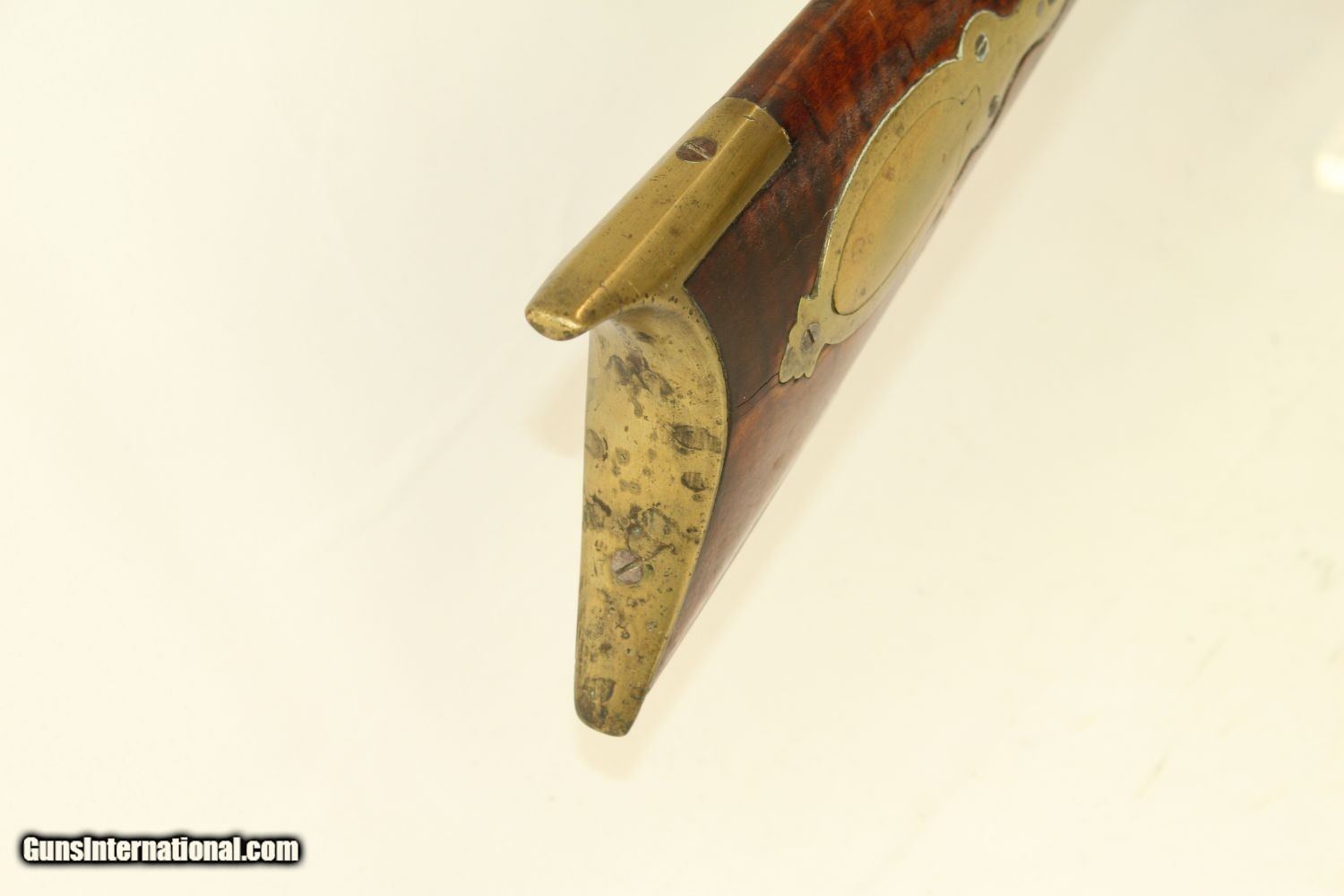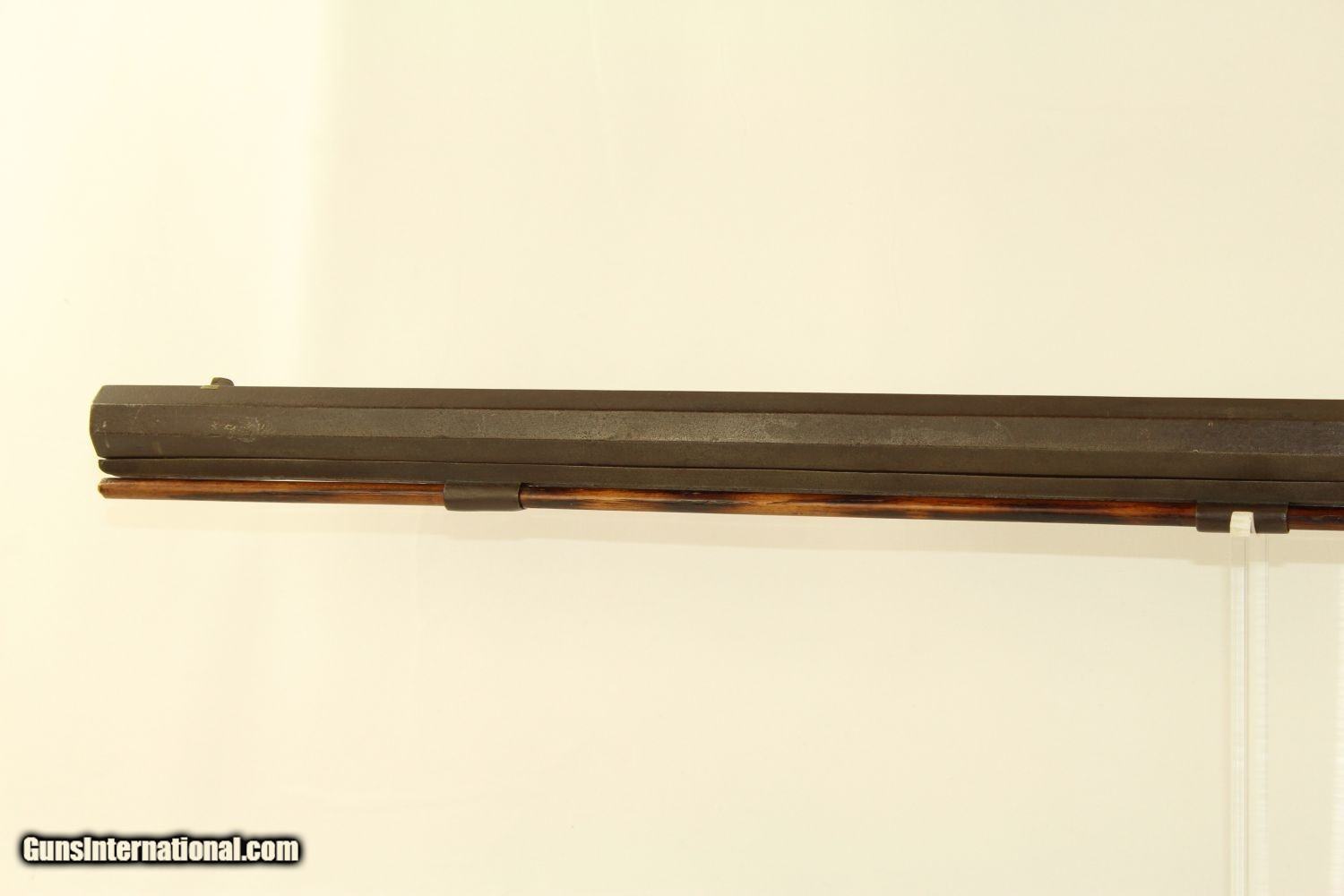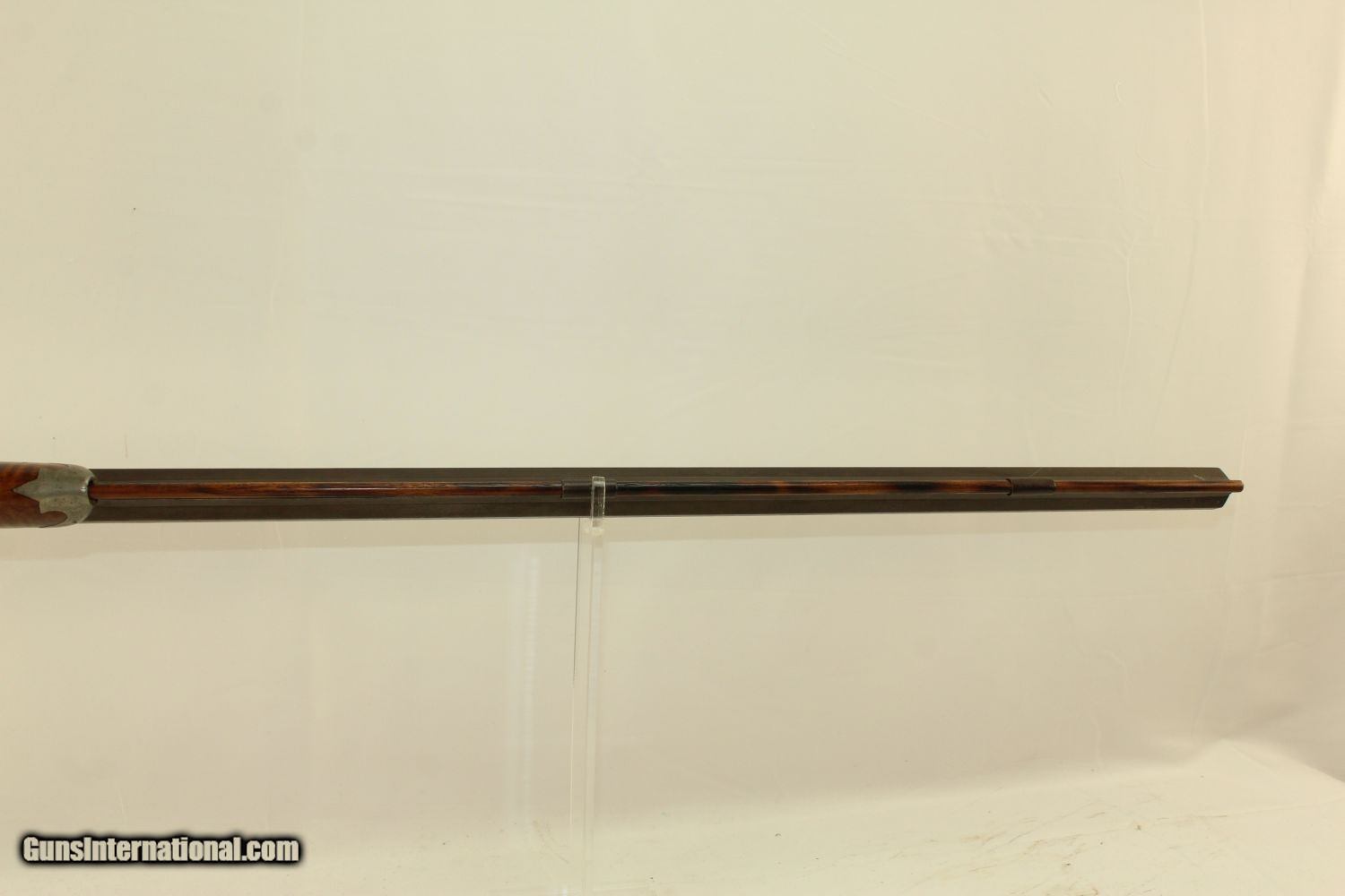 Description: J. SCHARP Antique BACK ACTION Half-Stock .42 Caliber OHIO Made LONG RIFLE Manufactured in SIDNEY, OHIO Here we present an antique John Scharp Half-Stock Back Action Long Rifle, made circa the 1850s in Sidney, Ohio. Scharp was an active gunmaker out of Sidney, Ohio around the 1850s into the 1870s. The American Longrifle, more commonly, but less correctly, known as the ‘Kentucky rifle’, was described by Captain John G. W. Dillin in the dedication to his seminal 1924 book, The Kentucky Rifle: “From a flat bar of soft iron, hand forged into a gun barrel; laboriously bored and rifled with crude tools; fitted with a stock hewn from a maple tree in the neighboring forest; and supplied with a lock hammered to shape on the anvil; an unknown smith, in a shop long since silent, fashioned a rifle which changed the whole course of world history; made possible the settlement of a continent; and ultimately freed our country of foreign domination. Light in weight; graceful in line; economical in consumption of powder and lead; fatally precise; distinctly American; it sprang into immediate popularity; and for a hundred years was a model often slightly varied but never radically changed.” The overall condition is Fair. The action is strong. The bore is dark and dusty with age. A crack has been repaired on the left side of the stock under the side plate. The crack has no movement. The top of the barrel reads “J. SCHARP”. The lock says “G. GOULCHER”. The pin is missing from the forend that secures the barrel, so they pull away from each other. A good old rifle with nice maple! Own the original! This is a legitimate antique and not a reproduction. Barrel is 38-1/4 inches. Caliber: .40 Percussion Overall condition as seen in photos. Very Fast. Very Safe. FREE SHIPPING WORLDWIDE. Delivered directly to your door by express mail! Guaranteed AUTHENTIC & Includes CERTIFICATE OF AUTHENTICITY. ancestryguns $1100 #190817 SOLD Antique: Yes |