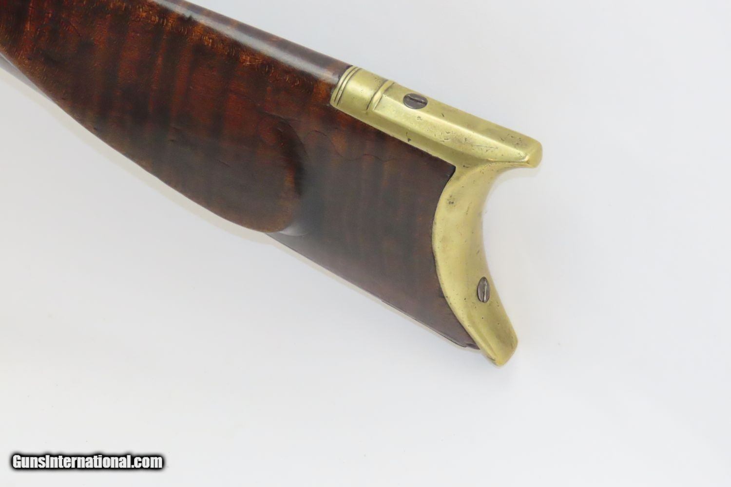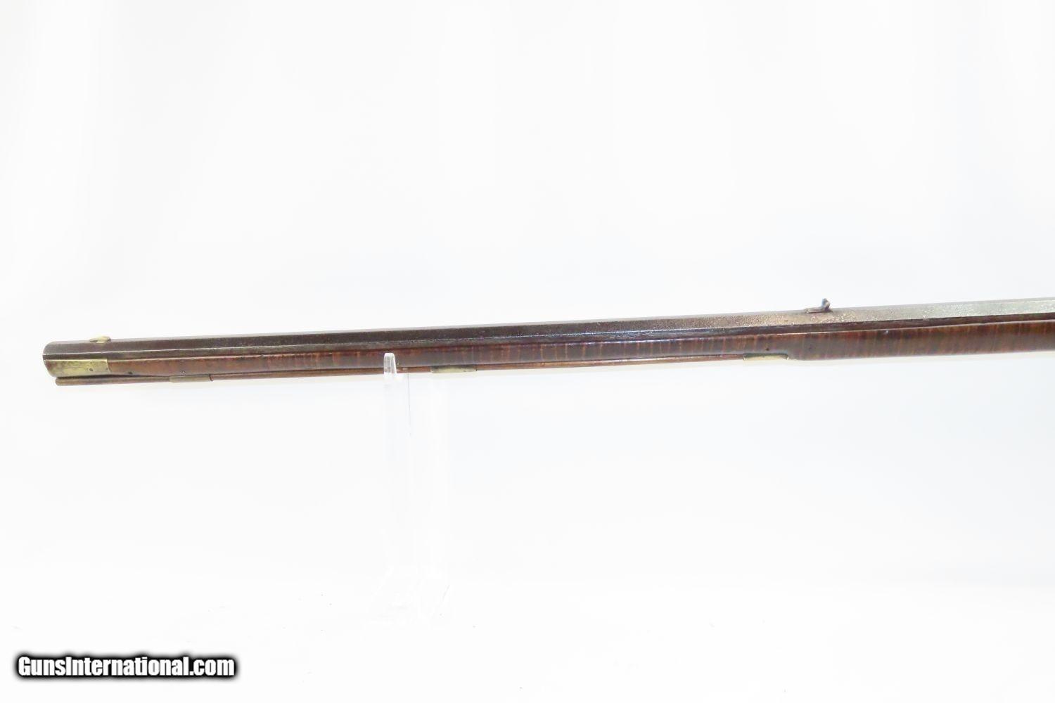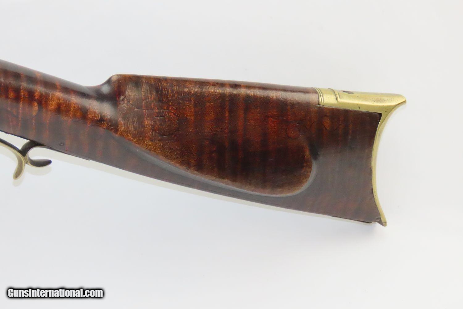 Description: JOHN SOWERS Antique FLINTLOCK American Full Stock LONG RIFLE Nice, Striped Maple Stock w Brass Hardware! Here we present an antique John Sowers American Flintlock Half Stock Long Rifle made circa 1830 in Philadelphia, Pennsylvania. Pennsylvania and Kentucky rifles were the order of the day and were essential tools for providing meat for the table, pest control for the crops and livestock, and protection against beast and man for the homestead. Rifles in this caliber were used for taking medium to large-sized game on the frontier to include elk and even buffalo. Frontiersmen, homesteaders, pioneers, trappers and traders would have used a rifle like this for all of the above. The American Long rifle, more commonly, but less correctly, known as the 'Kentucky rifle', was described by Captain John G. W. Dillin in the dedication to his seminal 1924 book, The Kentucky Rifle: “From a flat bar of soft iron, hand forged into a gun barrel; laboriously bored and rifled with crude tools; fitted with a stock hewn from a maple tree in the neighboring forest; and supplied with a lock hammered to shape on the anvil; an unknown smith, in a shop long since silent, fashioned a rifle which changed the whole course of world history; made possible the settlement of a continent; and ultimately freed our country of foreign domination. Light in weight; graceful in line; economical in consumption of powder and lead; fatally precise; distinctly American; it sprang into immediate popularity; and for a hundred years was a model often slightly varied but never radically changed.” This tiger maple stocked rifle features brass hardware and patchbox. Again, these type rifles would have been crucial and utilitarian tools on the frontier for gathering food and protecting the homestead The overall condition is good. The action functions properly. The bore is relatively bright with sharp rifling, re-bored to a larger caliber. The stock is solid and remains in good shape. “J*SOWERS” is engraved atop the barrel. Here is an American plains style rifle to collect and display! Own the original! This is a legitimate antique and not a reproduction. Barrel is 38-5/8 inches. Caliber: .43 Overall condition as seen in photos. Very Fast. Very Safe. FREE SHIPPING WORLDWIDE. Delivered directly to your door by express mail! Guaranteed AUTHENTIC & Includes CERTIFICATE OF AUTHENTICITY. ancestryguns $2195 #20104 SOLD Antique: Yes |