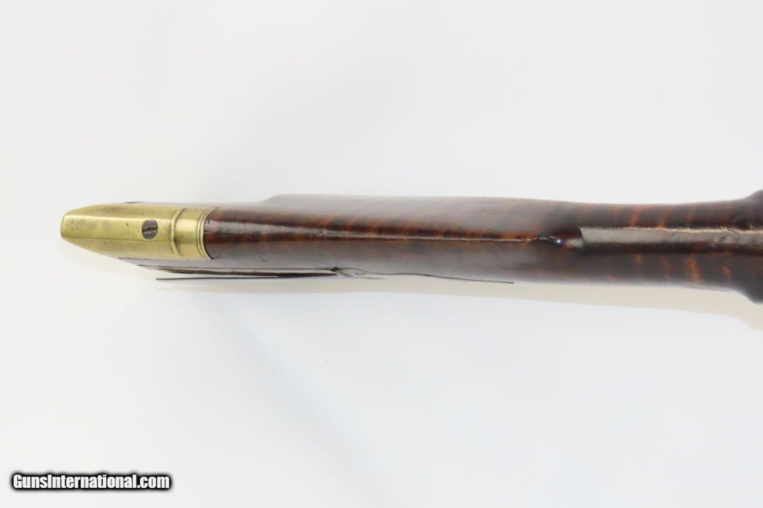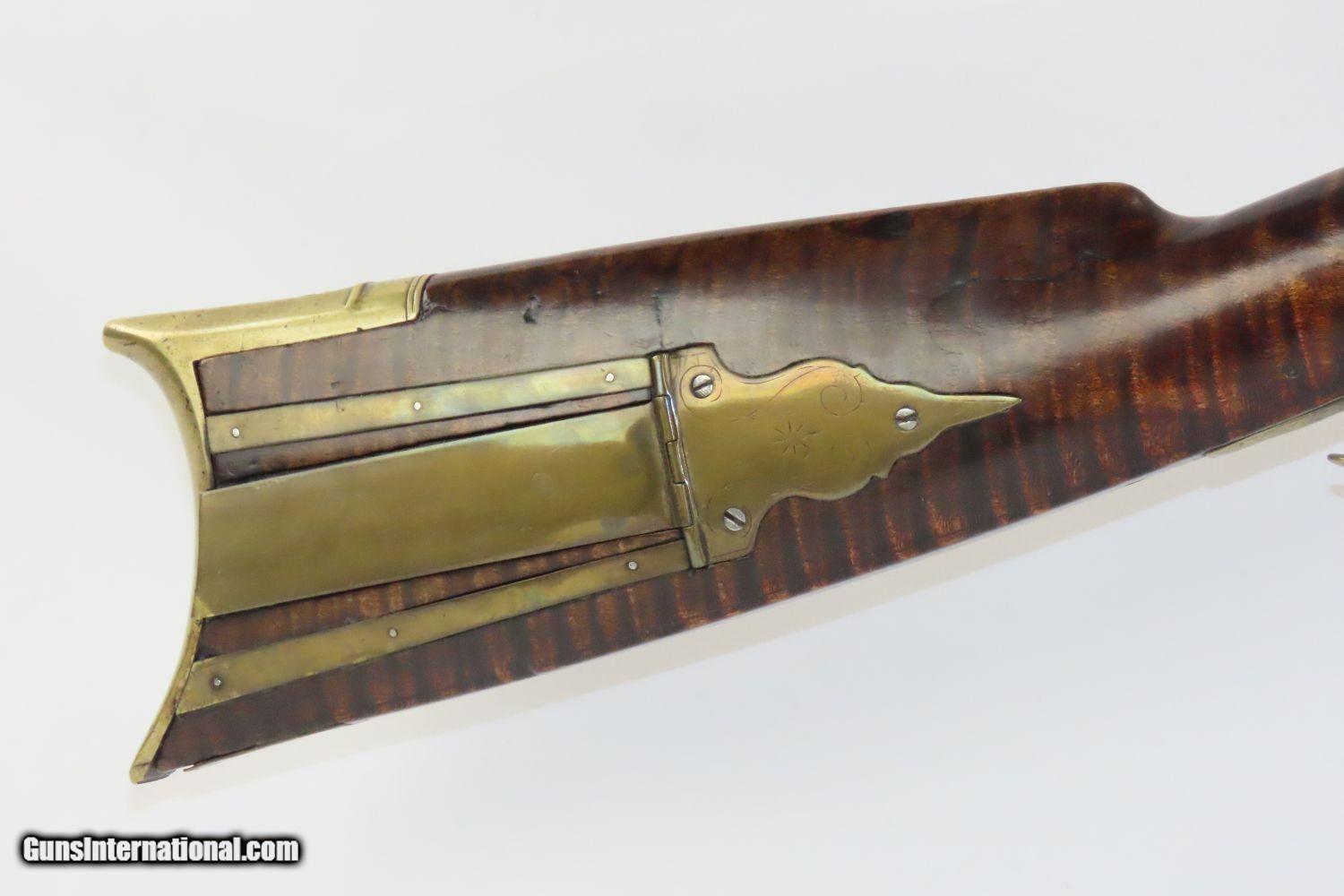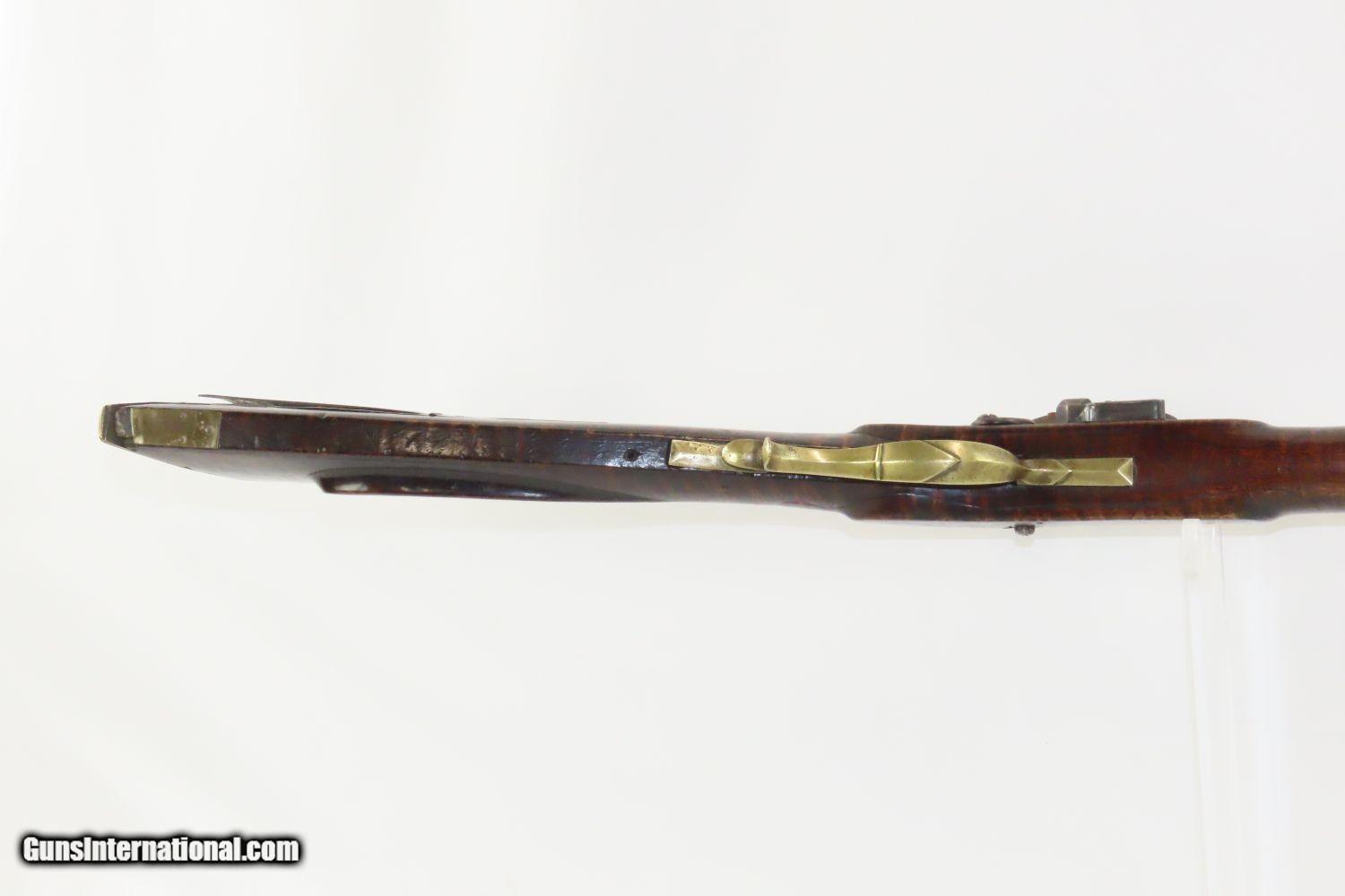 Description: JOHN SOWERS Antique FLINTLOCK American Full Stock LONG RIFLE Nice, Striped Maple Stock w Brass Hardware! Here we present an antique John Sowers American Flintlock Half Stock Long Rifle made circa 1830 in Philadelphia, Pennsylvania. Pennsylvania and Kentucky rifles were the order of the day and were essential tools for providing meat for the table, pest control for the crops and livestock, and protection against beast and man for the homestead. Rifles in this caliber were used for taking medium to large-sized game on the frontier to include elk and even buffalo. Frontiersmen, homesteaders, pioneers, trappers and traders would have used a rifle like this for all of the above. The American Long rifle, more commonly, but less correctly, known as the 'Kentucky rifle', was described by Captain John G. W. Dillin in the dedication to his seminal 1924 book, The Kentucky Rifle: “From a flat bar of soft iron, hand forged into a gun barrel; laboriously bored and rifled with crude tools; fitted with a stock hewn from a maple tree in the neighboring forest; and supplied with a lock hammered to shape on the anvil; an unknown smith, in a shop long since silent, fashioned a rifle which changed the whole course of world history; made possible the settlement of a continent; and ultimately freed our country of foreign domination. Light in weight; graceful in line; economical in consumption of powder and lead; fatally precise; distinctly American; it sprang into immediate popularity; and for a hundred years was a model often slightly varied but never radically changed.” This tiger maple stocked rifle features brass hardware and patchbox. Again, these type rifles would have been crucial and utilitarian tools on the frontier for gathering food and protecting the homestead The overall condition is good. The action functions properly. The bore is relatively bright with sharp rifling, re-bored to a larger caliber. The stock is solid and remains in good shape. “J*SOWERS” is engraved atop the barrel. Here is an American plains style rifle to collect and display! Own the original! This is a legitimate antique and not a reproduction. Barrel is 38-5/8 inches. Caliber: .43 Overall condition as seen in photos. Very Fast. Very Safe. FREE SHIPPING WORLDWIDE. Delivered directly to your door by express mail! Guaranteed AUTHENTIC & Includes CERTIFICATE OF AUTHENTICITY. ancestryguns $2195 #20104 SOLD Antique: Yes |