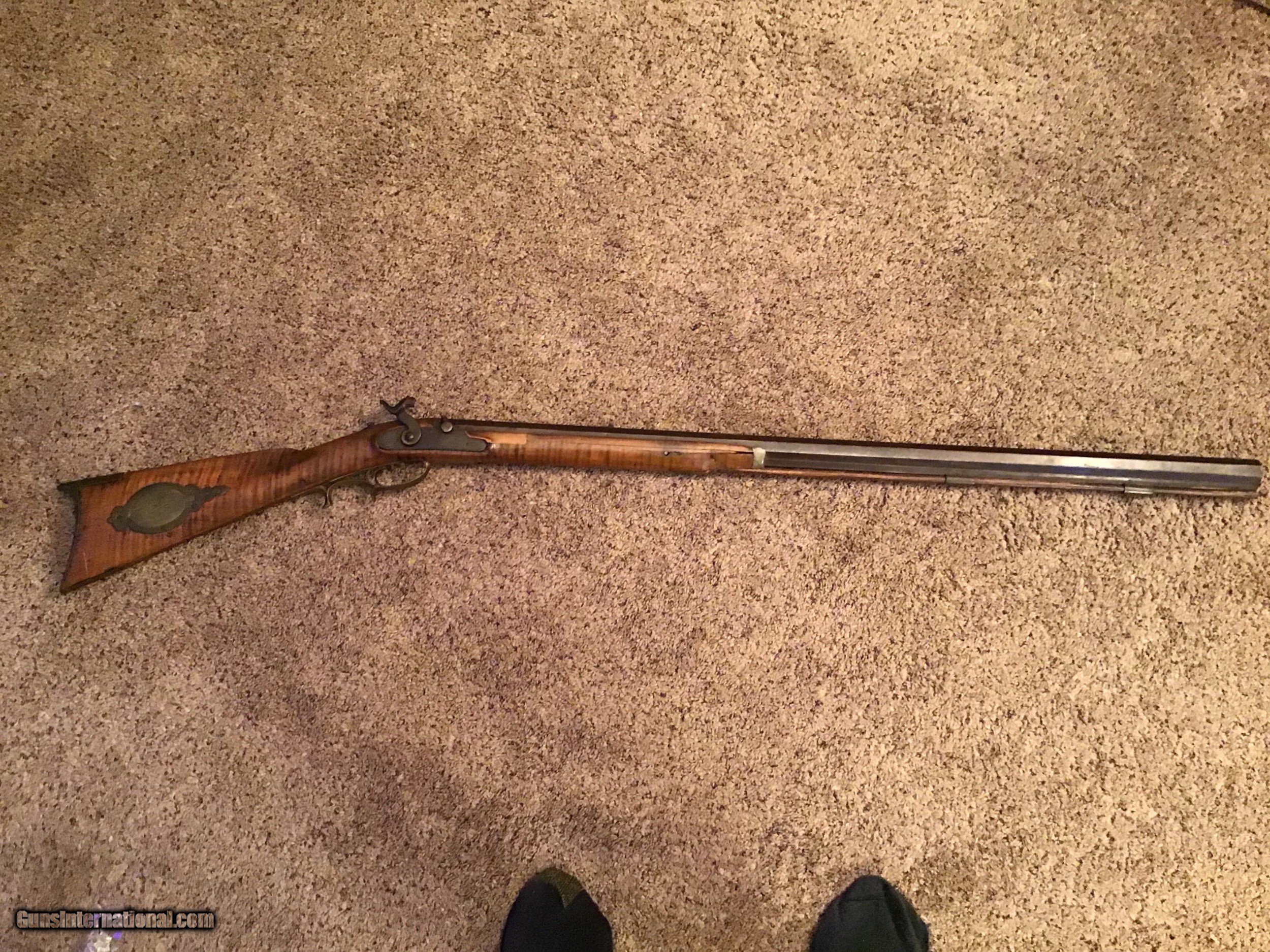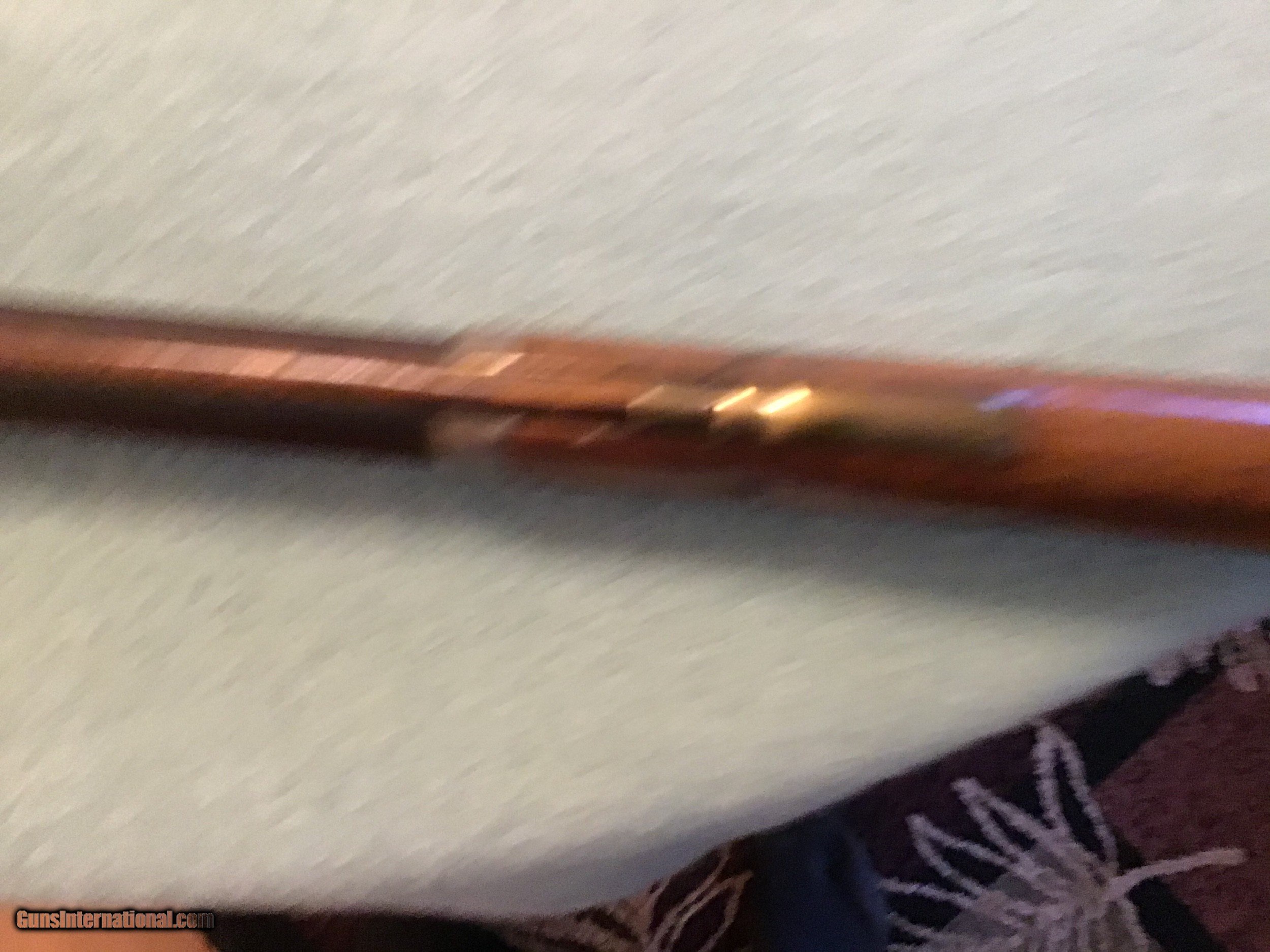 Description: On Hold Sale Pending Half stock circa 1850 Kentucky/ Pennsylvania rifle lock marked A.B. Semple & Brothers, Louisville. They are listed in the database of USA Gunmakers. The 35.5" rifled barrel is dark brown with both front and rear sights present. The bore has good rifling and is about 44 caliber and has good rifling but needs cleaning. The barrel is medium weight about 1 1/16 " across at the muzzle. The tiger stripe half stock is probably maple and has a repair in front of the lock, a couple cracks and chip near the German silver (I think) nose cap (see photos). The brass patch box trigger gaurd, and but plate have a nice light brown patina. The lock/set triggers functions as they should. A nice old Kentucky percussion rifle. Please feel free to contact me with any questions. Shipping will be actual cost by insured usps priority mail with tracking. On Hold Sale Pending SOLD Antique: Yes Manufacturer: A.B. Semple Barrel Length: 35.5” Condition: Good |