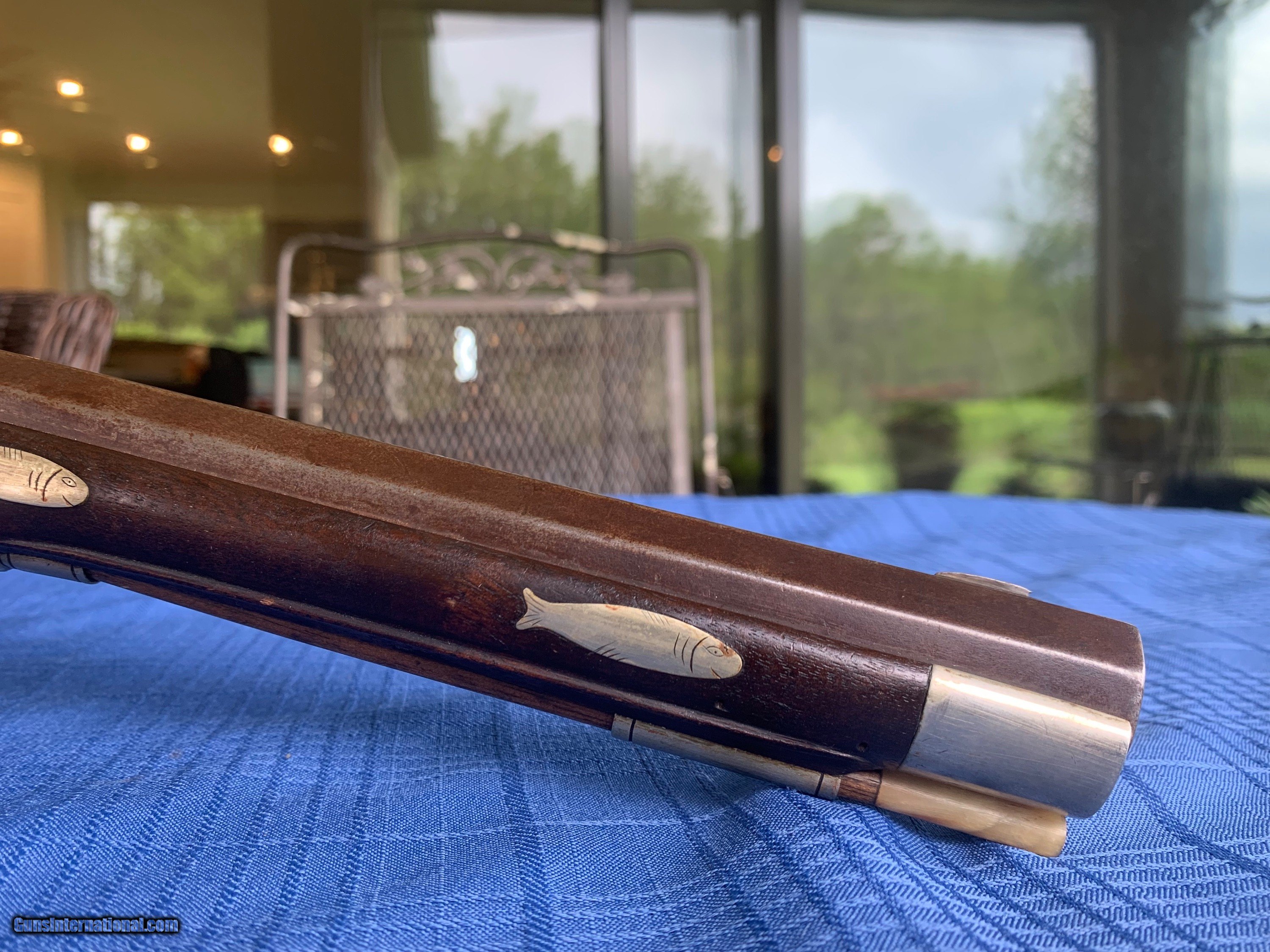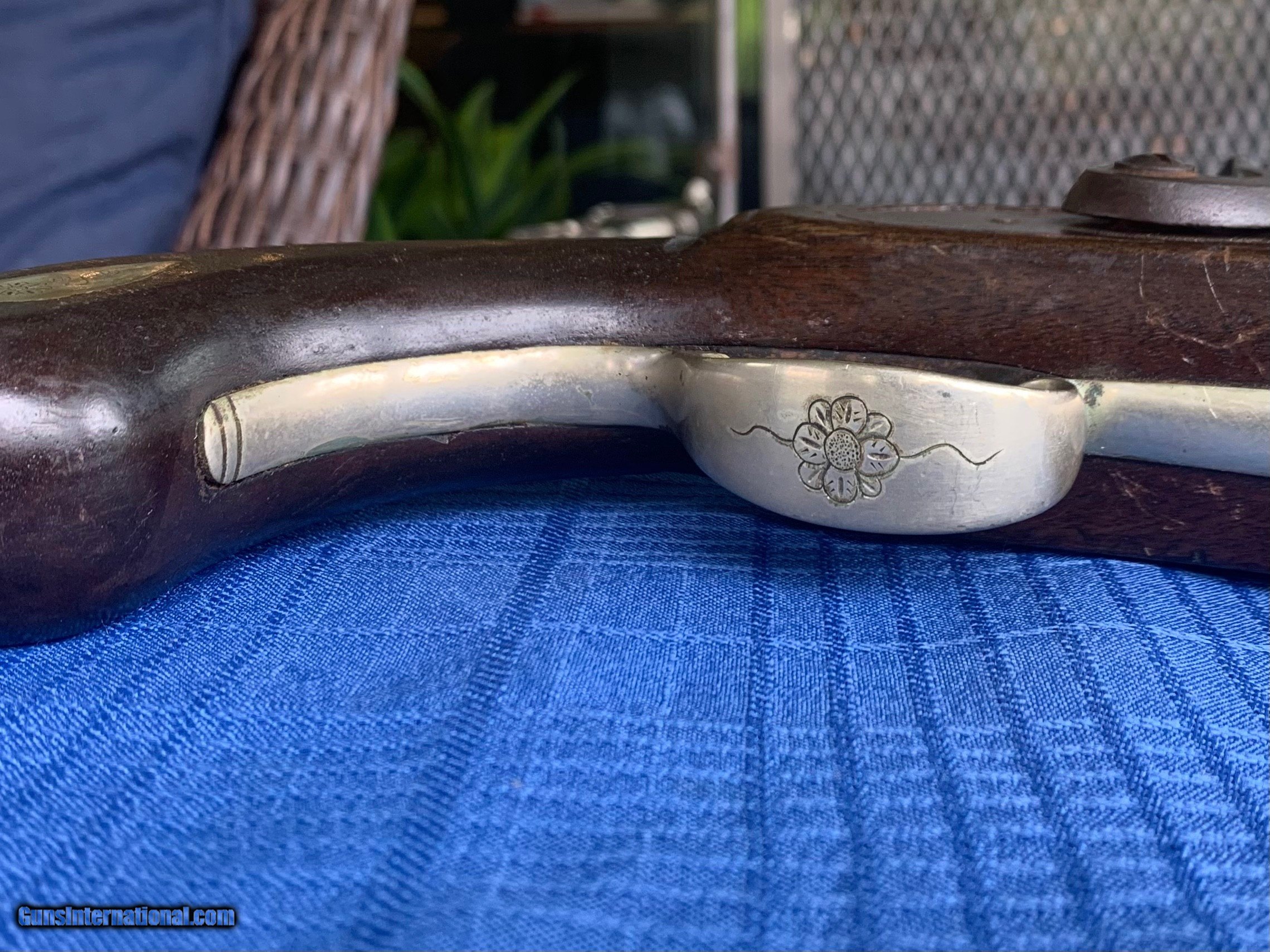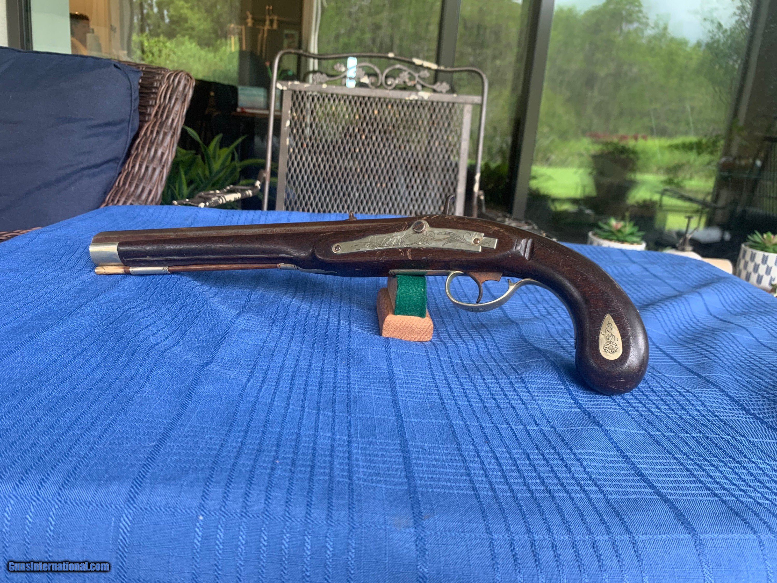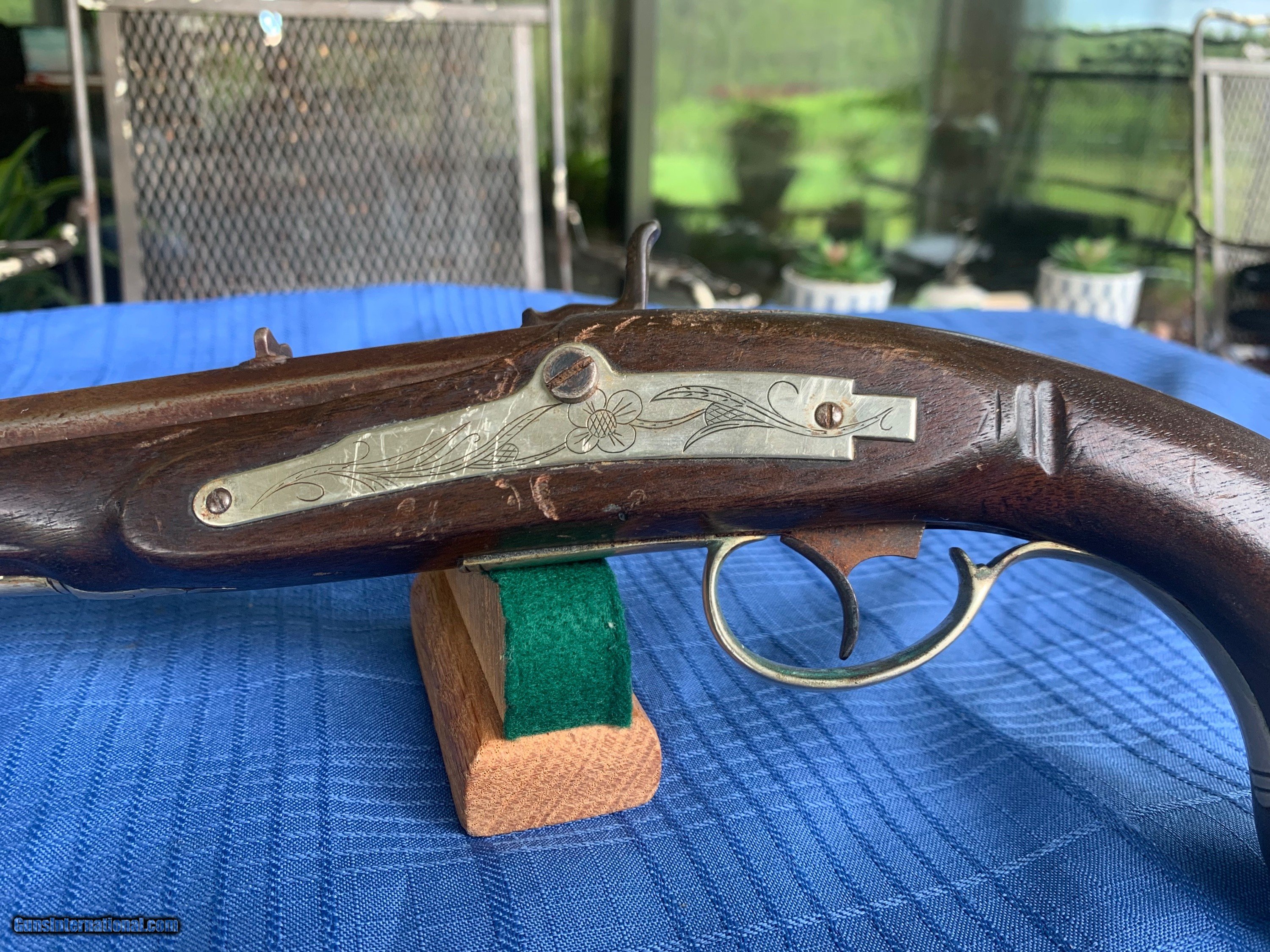 Description: Here's a Excellent Example of a American Kentucky pistol 45 caliber! Barrel measures Apx . 10" Rifled Bore. Very well made percussion pistol with Fish and flower inlays . The lock is marked TRENTON . No other markings visible on the outside of gun . Barrel has a nice even brown patina . Walnut stock is in very good condition with scars a mars from use . The original finish on wood has so slight freckling around the grip . Bore and mechanics very good ! Guns in excellent working condition! Very nice American Kentucky Pistol ! Please review my photos and please email me with any questions ? 3 day inspection as allways! Thank you for looking , Little Jo SOLD Antique: Yes Manufacturer: American Model: Kentucky Pistol Condition: Very Good ! |