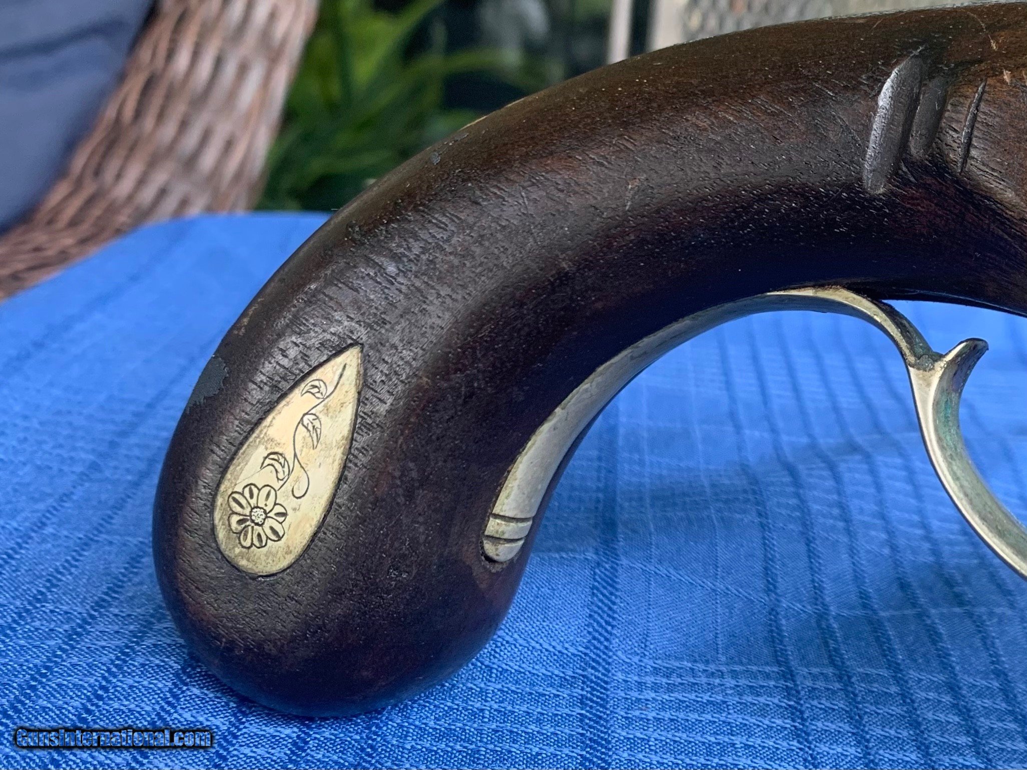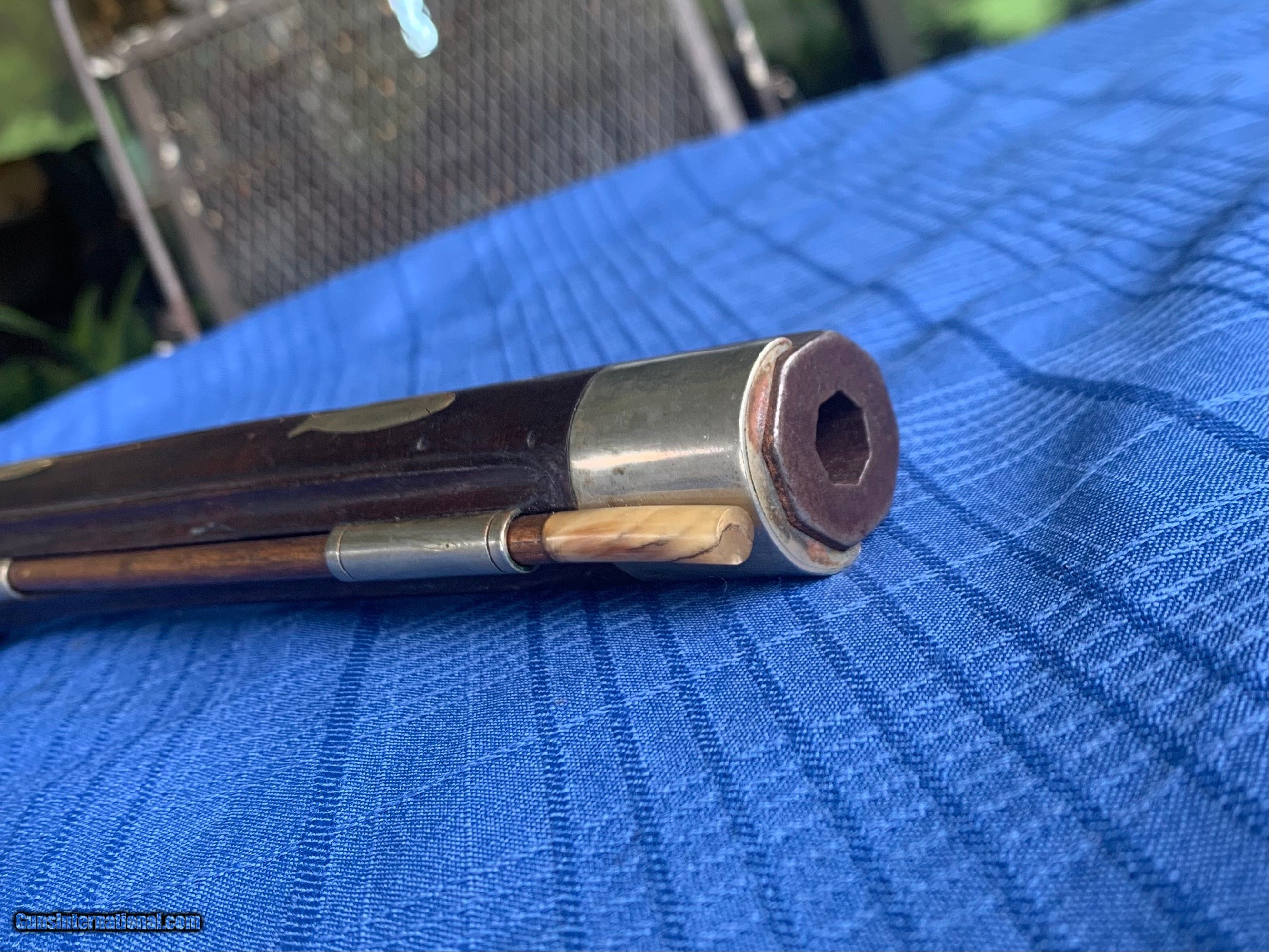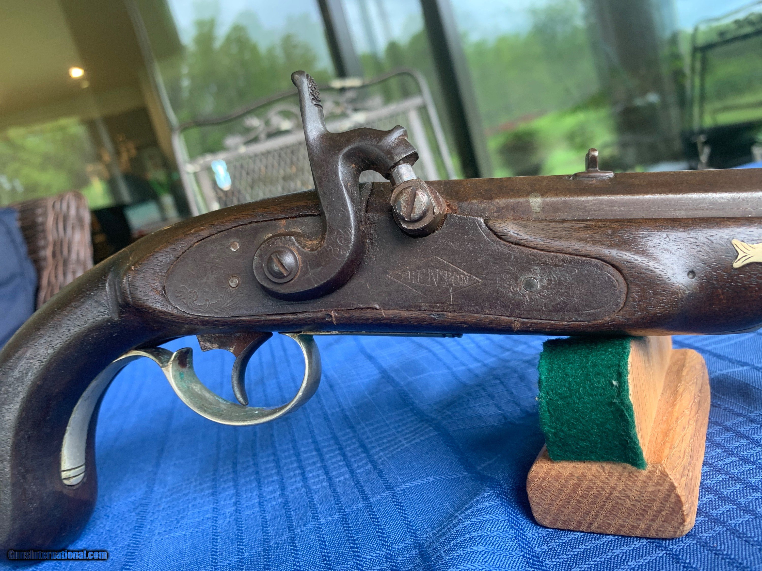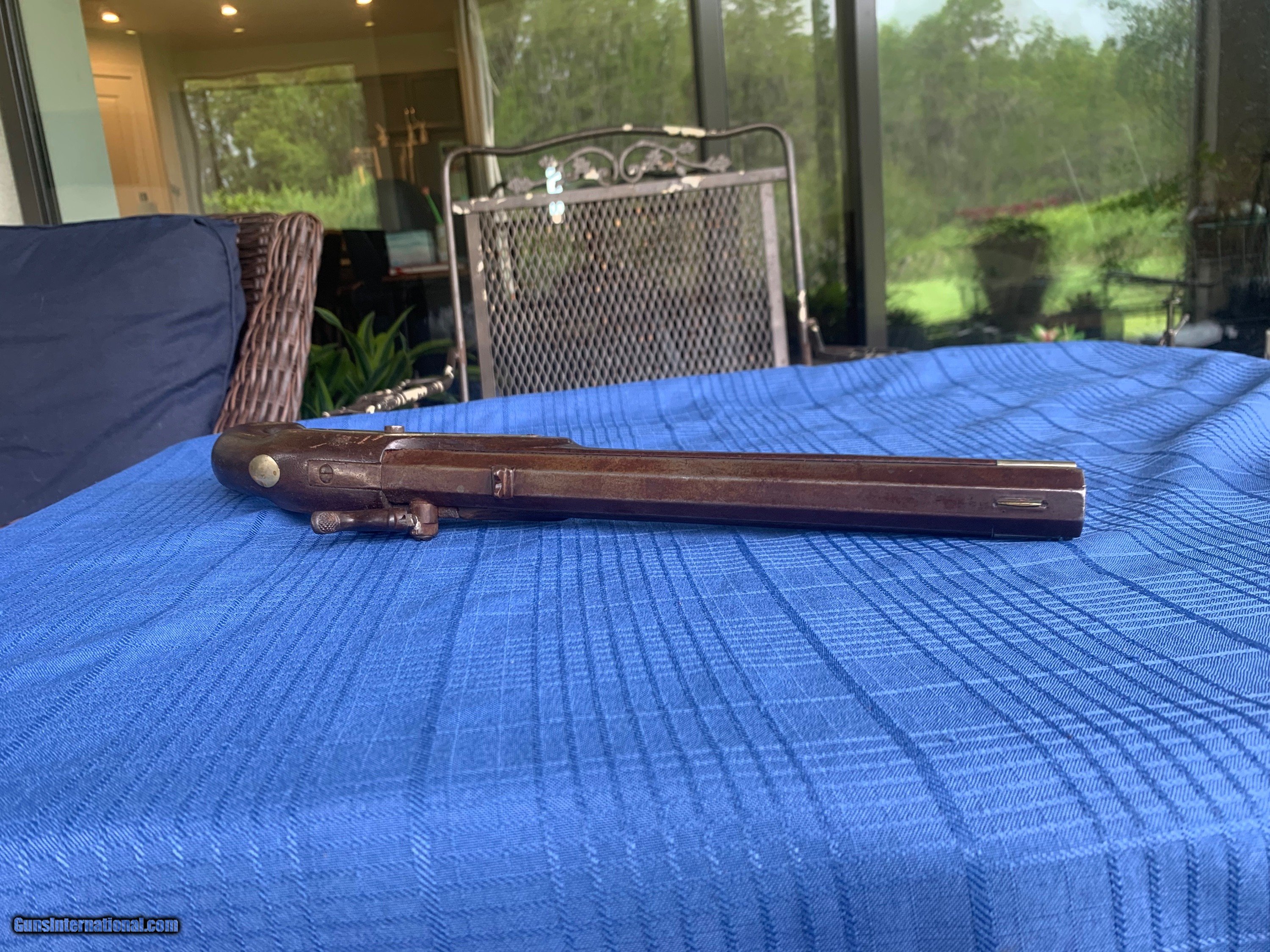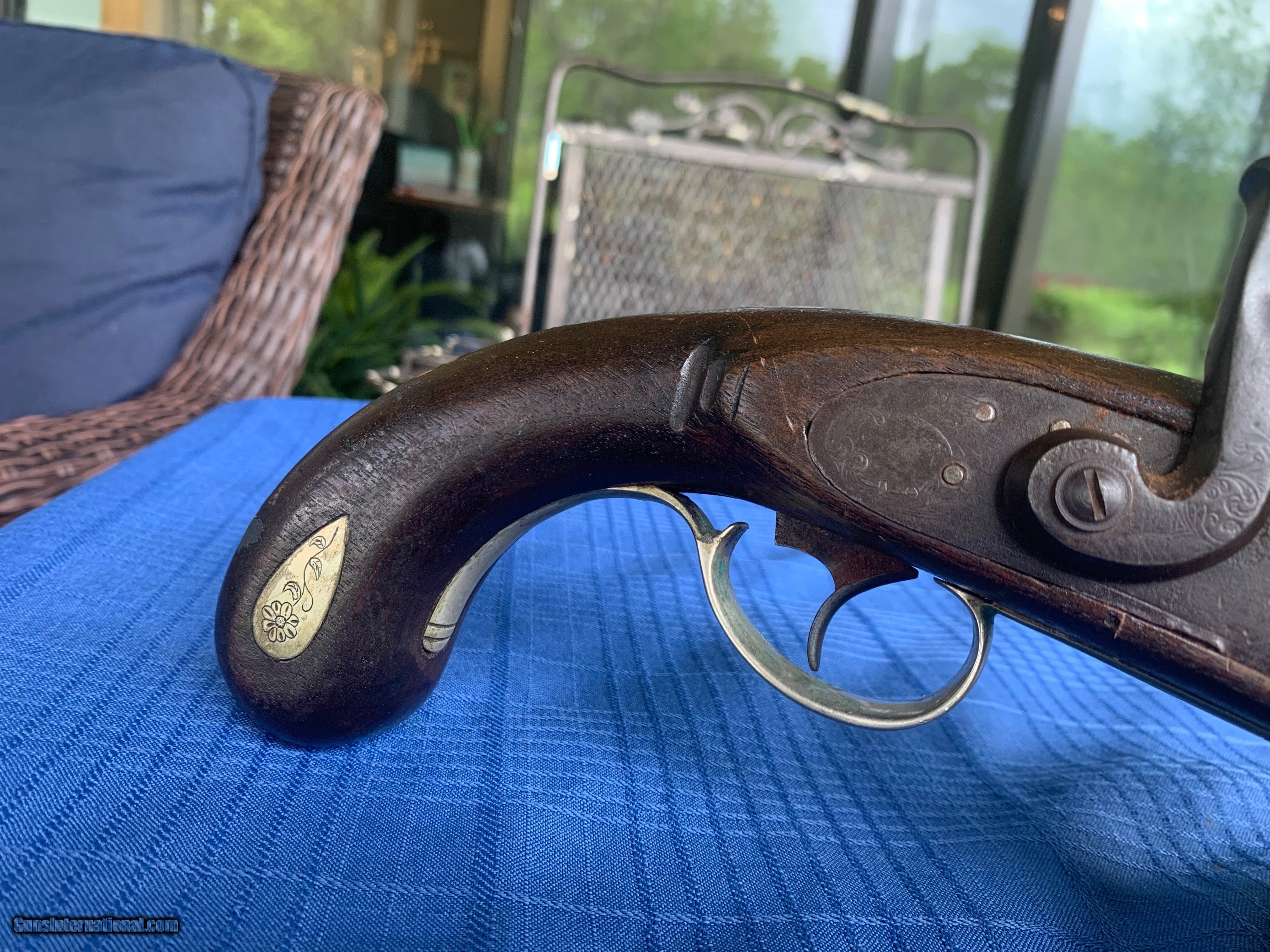 Description: Here's a Excellent Example of a American Kentucky pistol 45 caliber! Barrel measures Apx . 10" Rifled Bore. Very well made percussion pistol with Fish and flower inlays . The lock is marked TRENTON . No other markings visible on the outside of gun . Barrel has a nice even brown patina . Walnut stock is in very good condition with scars a mars from use . The original finish on wood has so slight freckling around the grip . Bore and mechanics very good ! Guns in excellent working condition! Very nice American Kentucky Pistol ! Please review my photos and please email me with any questions ? 3 day inspection as allways! Thank you for looking , Little Jo SOLD Antique: Yes Manufacturer: American Model: Kentucky Pistol Condition: Very Good ! |