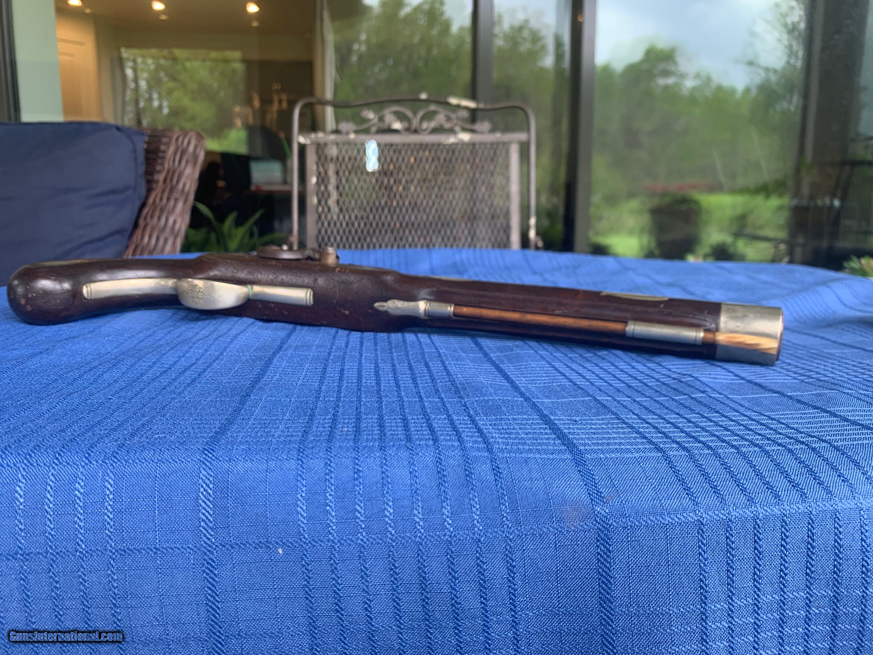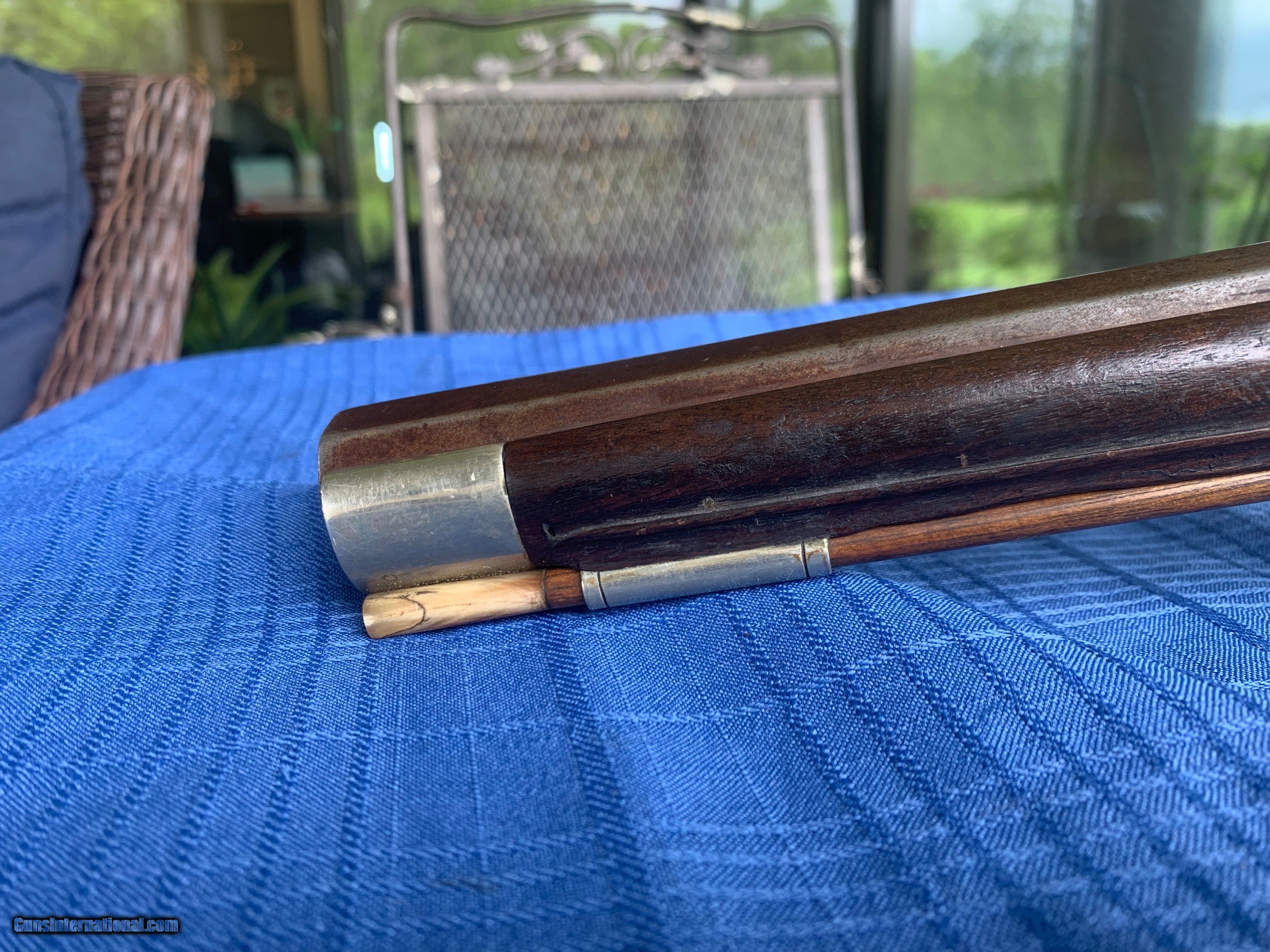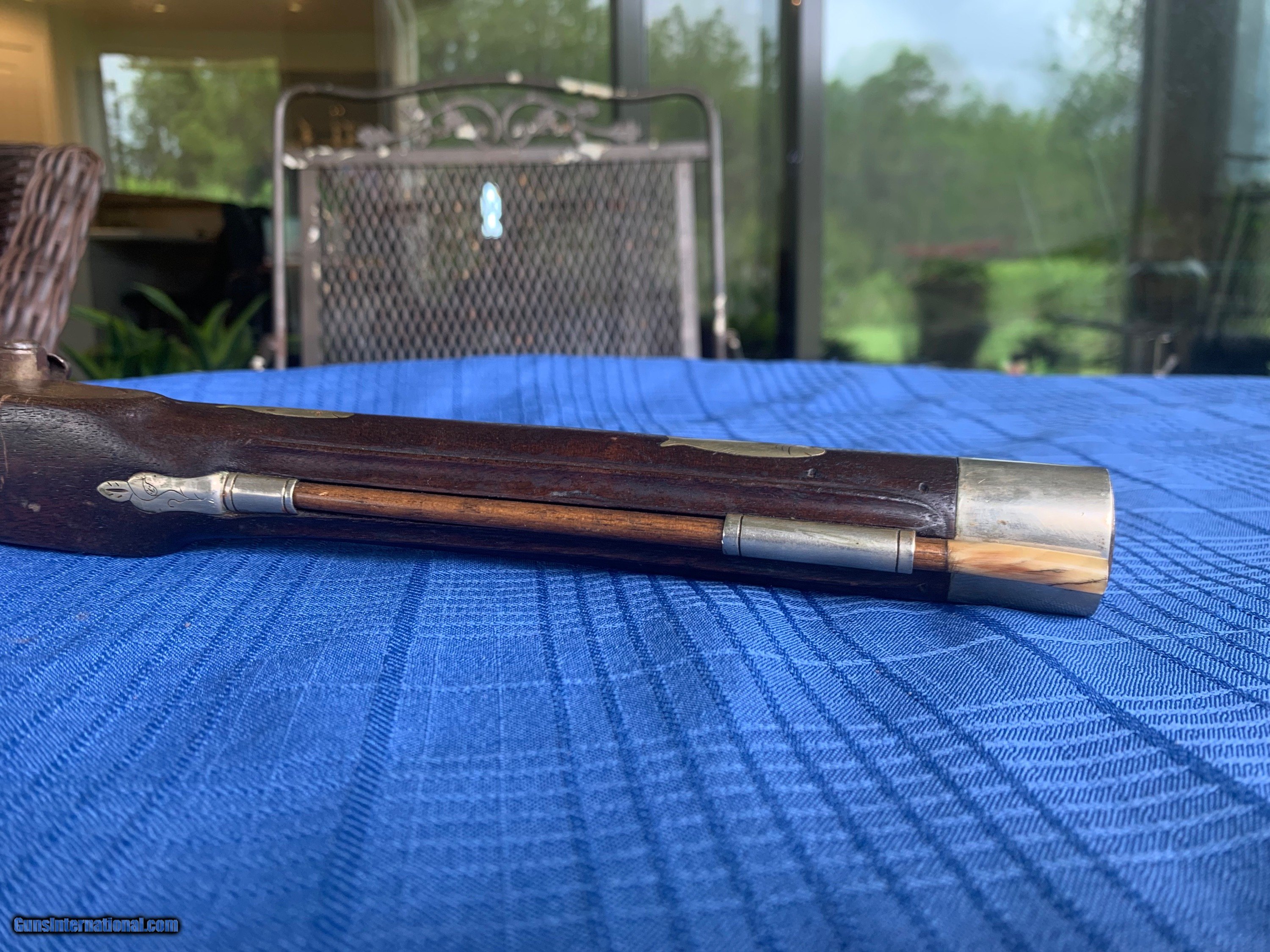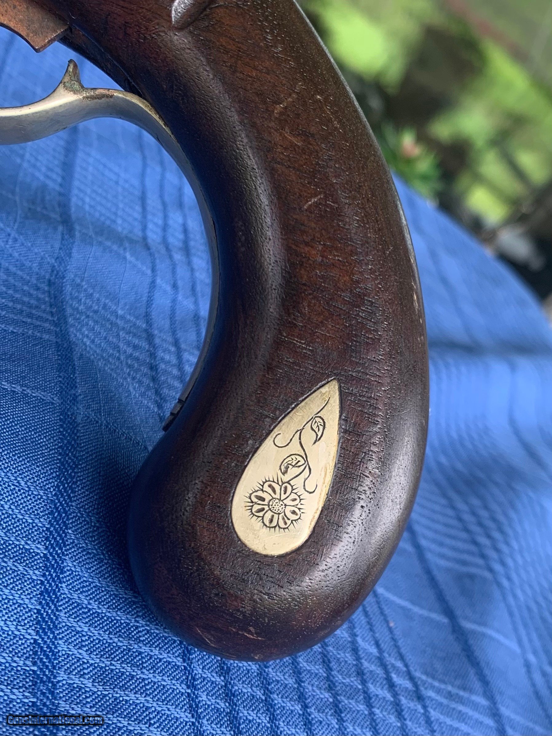 Description: Here's a Excellent Example of a American Kentucky pistol 45 caliber! Barrel measures Apx . 10" Rifled Bore. Very well made percussion pistol with Fish and flower inlays . The lock is marked TRENTON . No other markings visible on the outside of gun . Barrel has a nice even brown patina . Walnut stock is in very good condition with scars a mars from use . The original finish on wood has so slight freckling around the grip . Bore and mechanics very good ! Guns in excellent working condition! Very nice American Kentucky Pistol ! Please review my photos and please email me with any questions ? 3 day inspection as allways! Thank you for looking , Little Jo SOLD Antique: Yes Manufacturer: American Model: Kentucky Pistol Condition: Very Good ! |