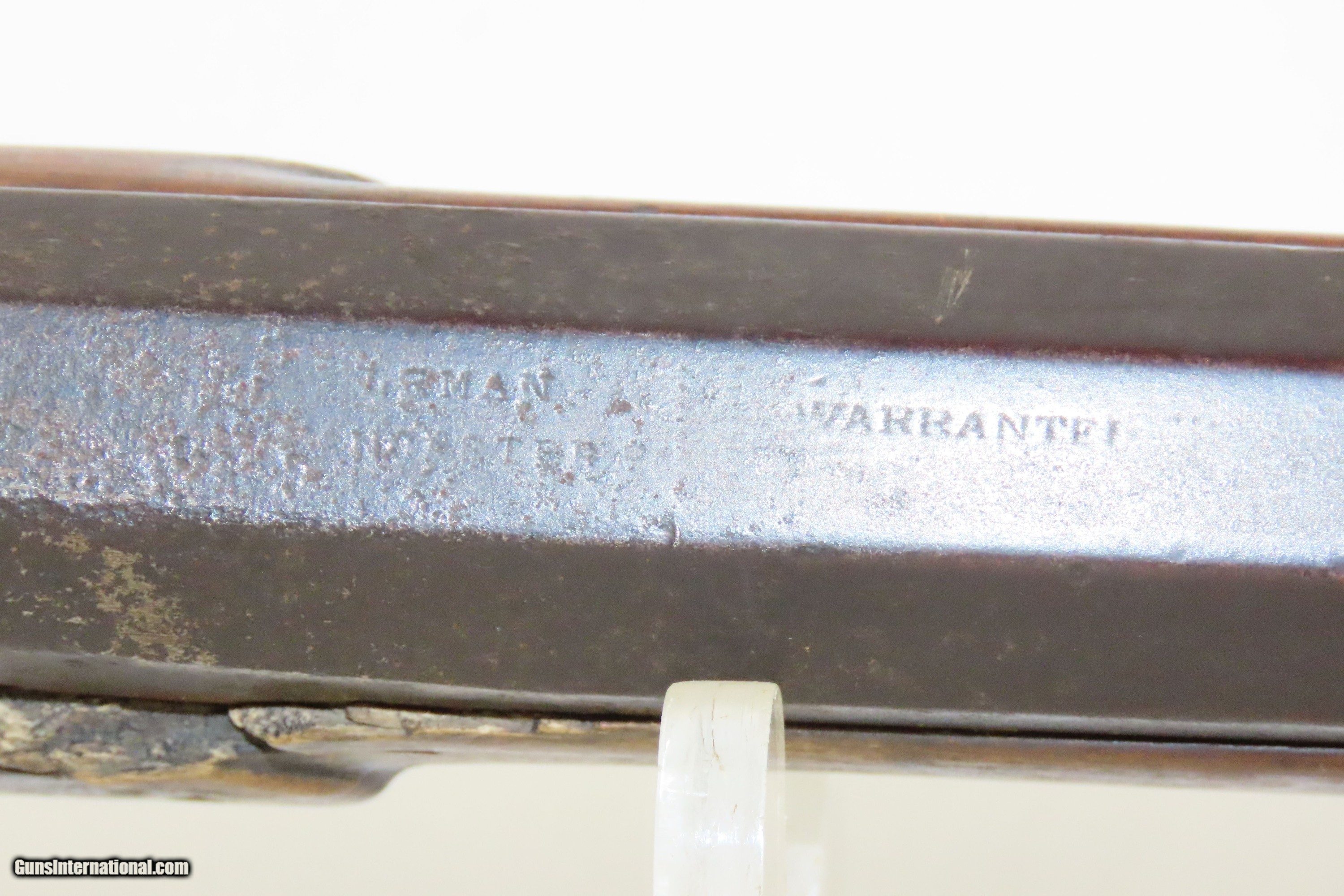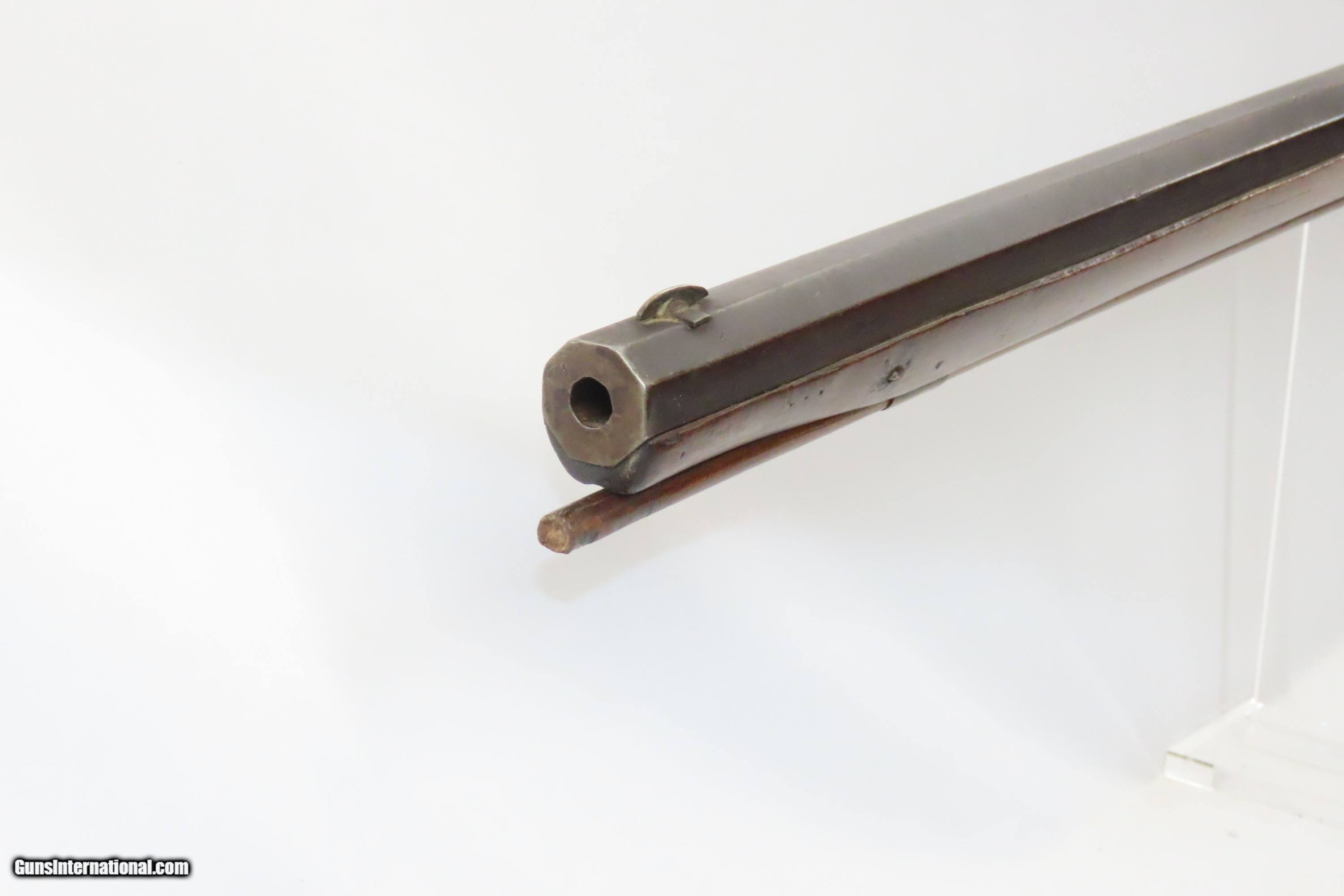 Description: LEMAN Antique FULL-STOCK Percussion PENNSYLVANIA Long Rifle INDIAN TRADE Possible INDIAN TRADE Rifle made in LANCASTER, PA Here we present an antique Henry Leman Full Stock Percussion Long Rifle, made circa the mid-19th Century in Lancaster, Pennsylvania. Henry Eichholz Leman was born in Lancaster, Pennsylvania, March 8, 1812, and died there March 12, 1887. His ancestors had lived in Lancaster County for generations but there is no evidence that any of them were gunmakers, making him a first generation gunmaker. Its stout octagonal barrel is in .45 caliber, large enough to take medium to large sized game or to defend the homestead against unwanted aggression. Henry E. Leman's business career, 1834 to 1887, covered an important transition period in the evolution of fire-arms, changing from flintlock over to percussion, and then to cartridges. Leman started his career making flintlocks. Soon he changed to the muzzle-loading, percussion-cap rifles which made him famous. And, he long outlived the years when the modern cartridge breech-loading guns came into general battlefield use. Leman was also noted to be very active in firearms trade with the early American Indians. Frank R. Diffenderffer, always a close observer as well as an accurate historian, noted this: "Between 1857 and 1870 I was engaged in trades over the West and Southwest, making trips across the plains from Missouri to Mexico, and also from the Gulf of Mexico into Arizona. During that time it was my fortune to meet many tribes of Indians,—Apaches, Navajos, Comanches, Cheyennes, Kaws and Arapahoes, and most of them carried guns as well as bows and arrows. When occasion offered, I took pains to look at the names of the makers stamped on the weapons. By far the largest number were Leman rifles, and inquiry always revealed the preference of these Indians for the Lancaster-made guns over all others. It was possible to barter with the Indians for almost any of their possessions, but never for a Leman rifle." The overall condition is good. Original, plum patina. Strong action. The bore is bright and nicely rifled. This example sports a solid stock, but does have a small chip missing around the lock. Markings are legible. Own the original! This is a legitimate antique and not a reproduction. Barrel is 38-1/4 inches. Caliber: .45 Percussion Overall condition as seen in photos. Very Fast. Very Safe. FREE SHIPPING WORLDWIDE. Delivered directly to your door by express mail! Guaranteed AUTHENTIC & Includes CERTIFICATE OF AUTHENTICITY. ancestryguns $1200 #233028 SOLD Antique: Yes |