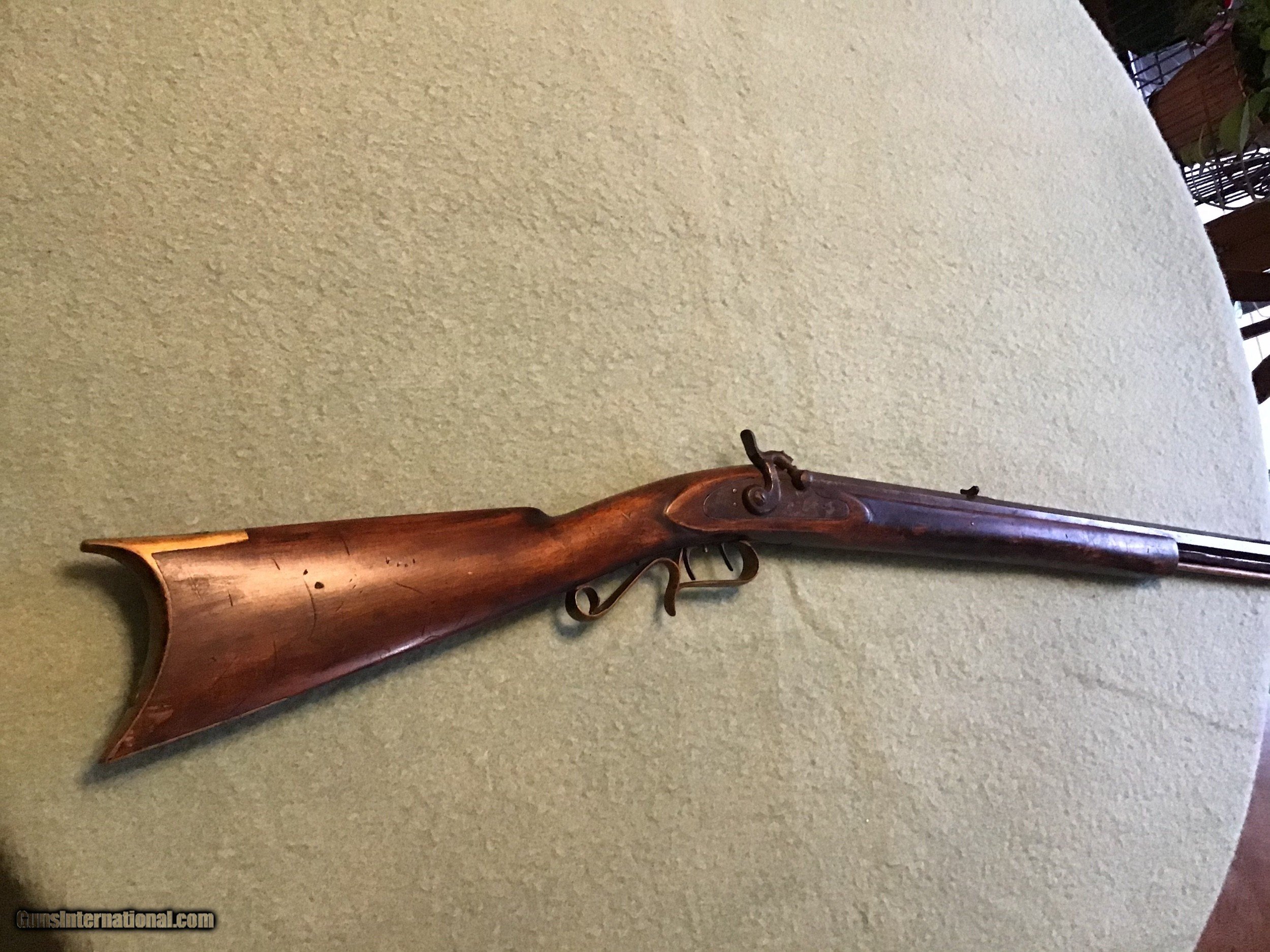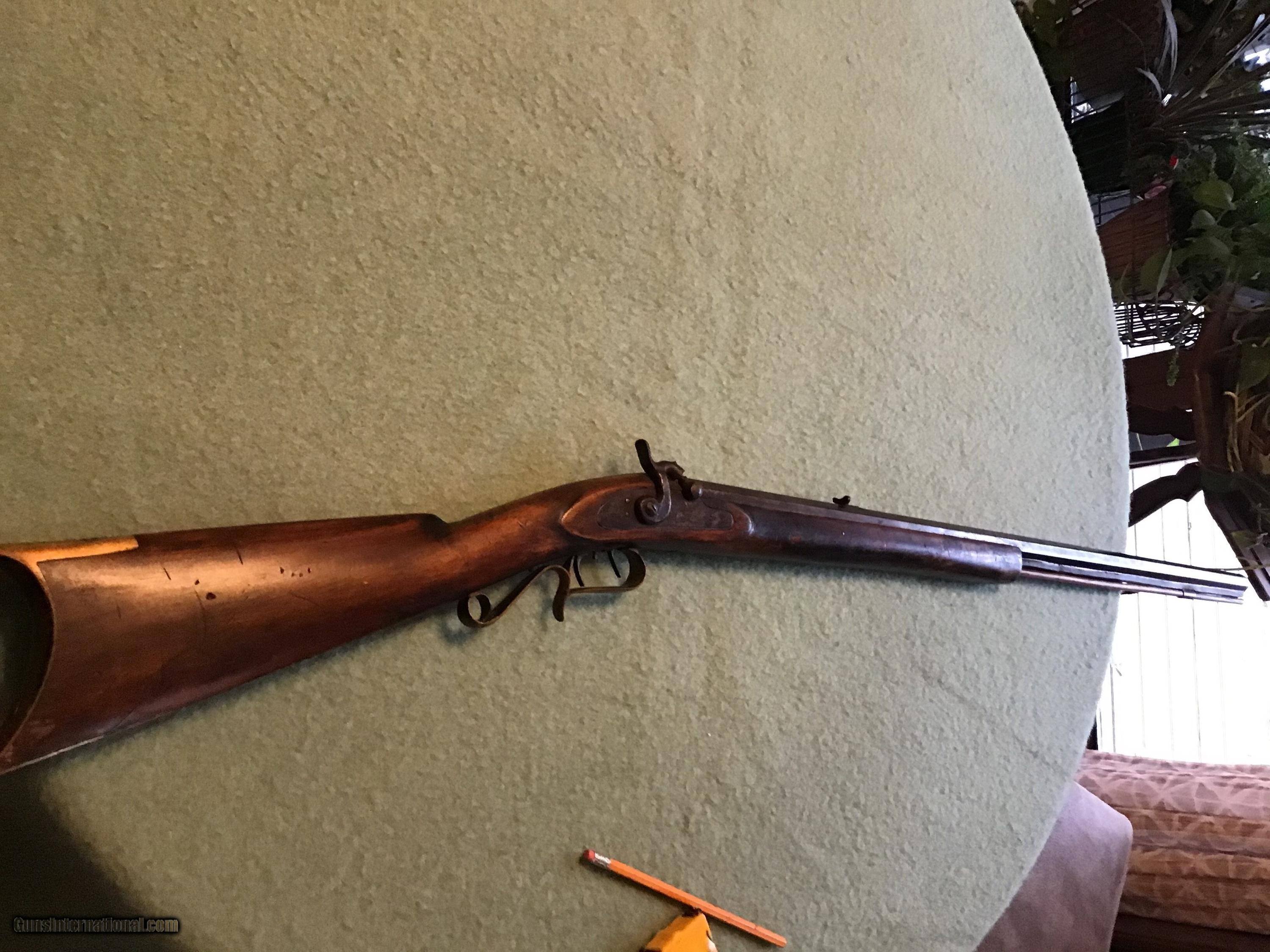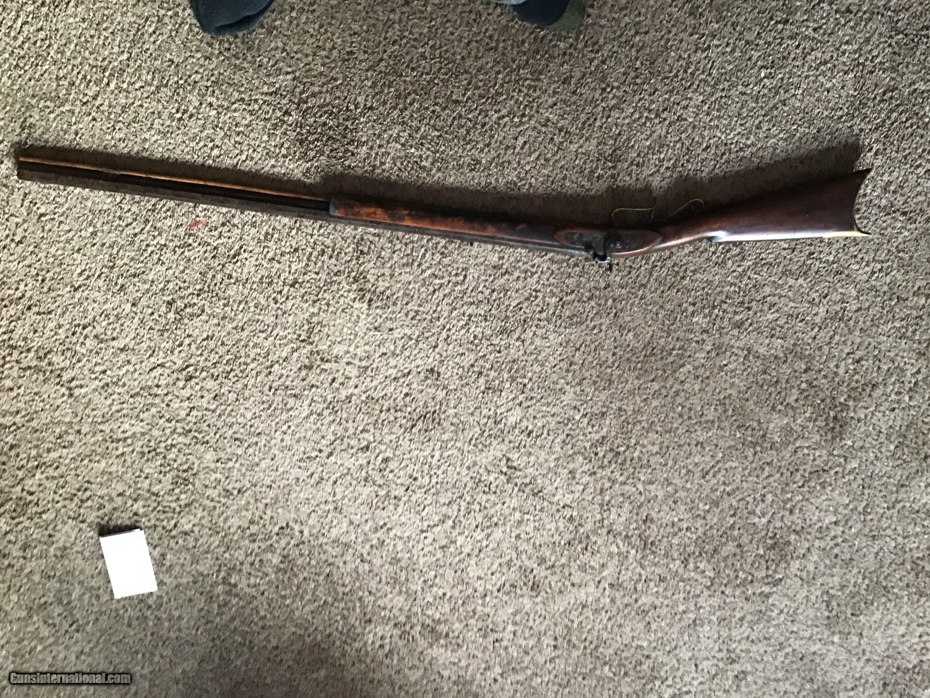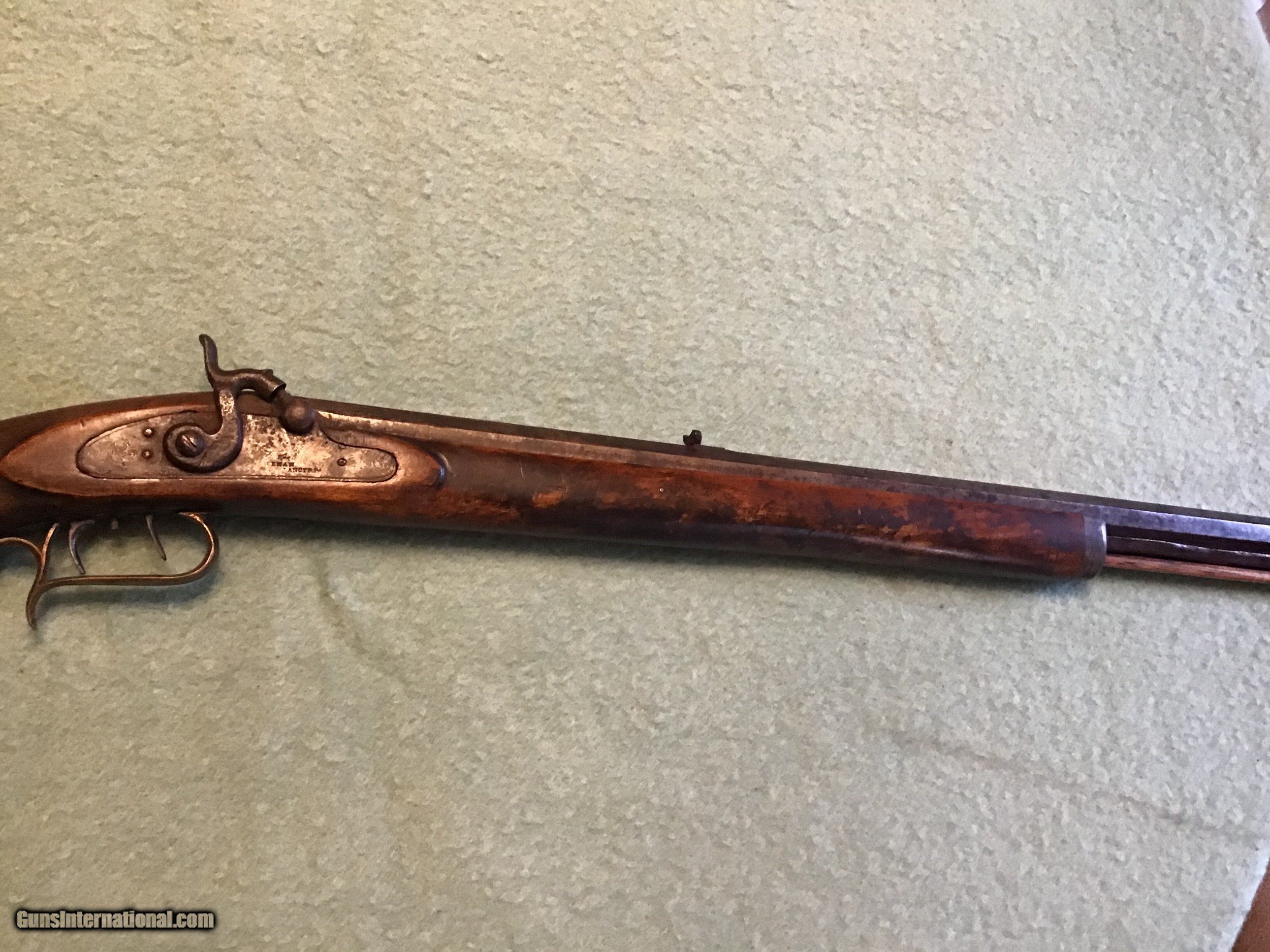 Description: On Hold Sale Pending I'm not sure if this is considered a Kentucky, Pennsylvania or plains rifle made by Leman of Lancaster Pennsylvania circa 1850 in approximately 38-40 caliber. The wood stock is in very good condition showing normal wear with a nice natural patina. The 35 inch barrel has both front and rear sights in place. The lock is marked Leman Lancaster, Pa.. the lock and barrel have a brown patina. The but plate and trigger gaurd are brass with a light brown patina. The lock and set trigger seem to work fine. Overal good to very good condition . Please feel free to contact me with any questions. Shipping will be actual cost by usps insured priority or ups. On Hold Sale Pending is SOLD Antique: Yes Manufacturer: Leman Barrel Length: 35” |