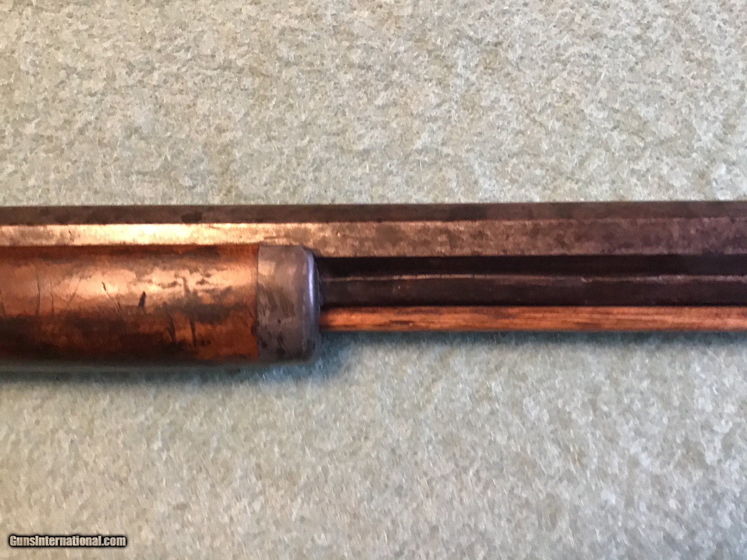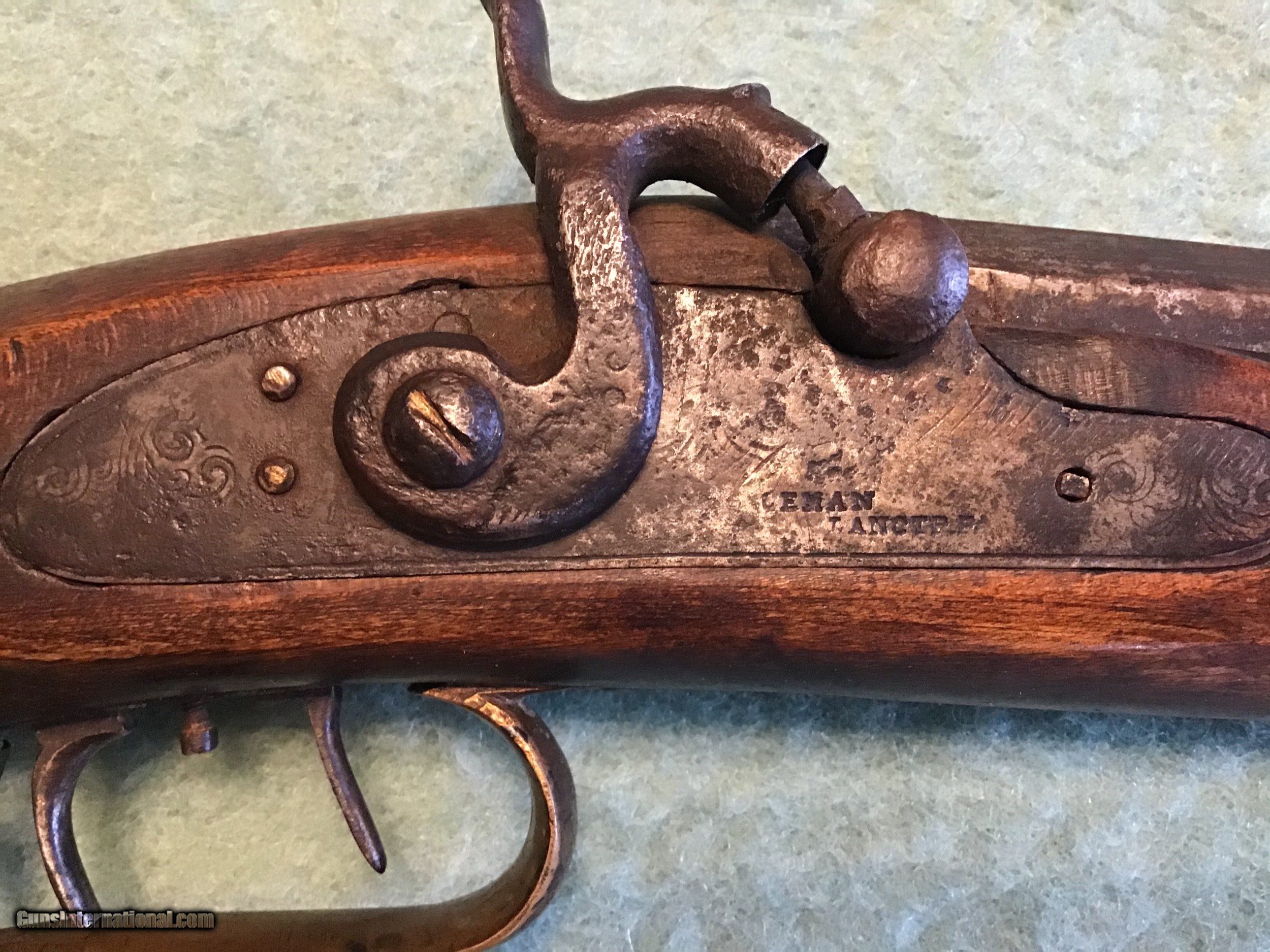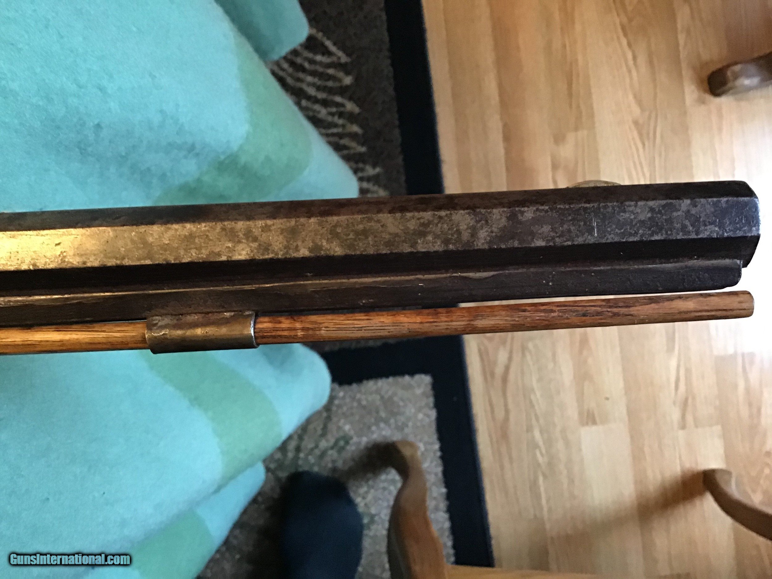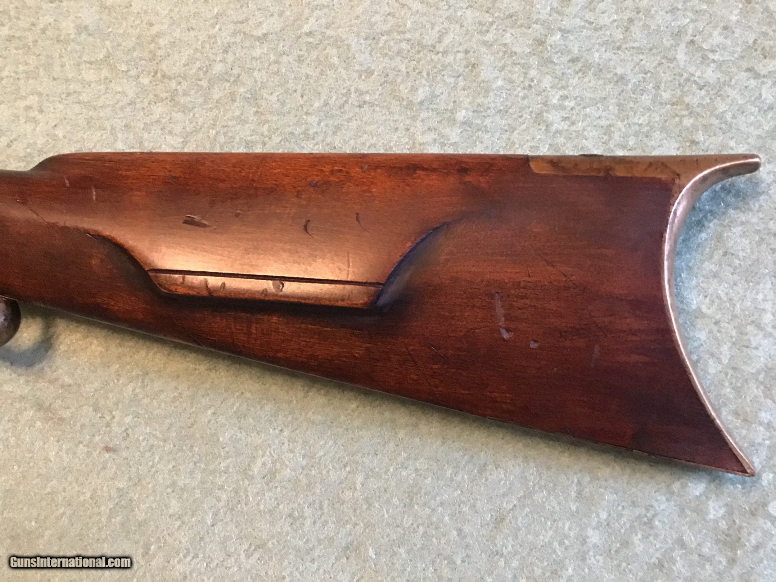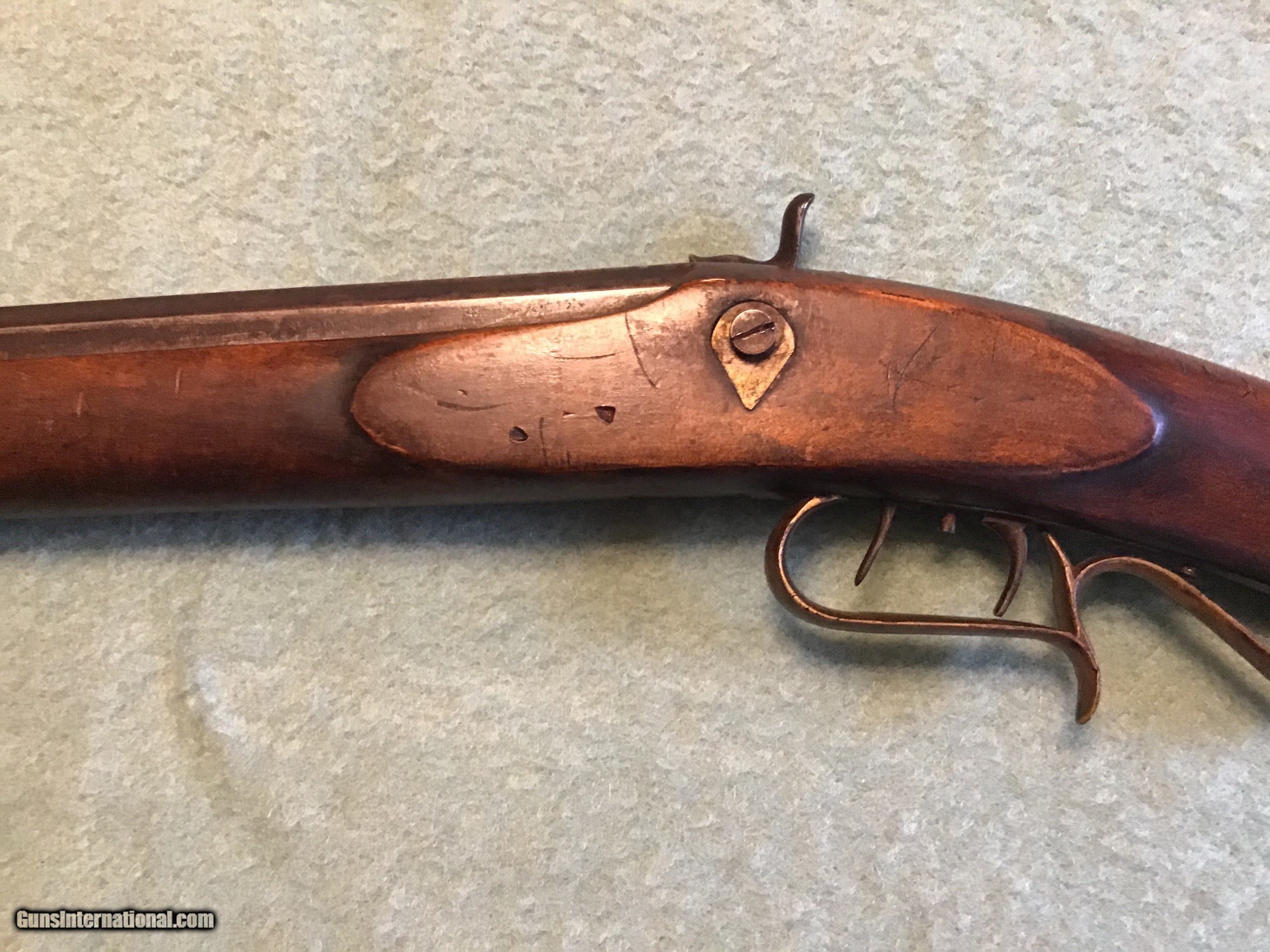 Description: On Hold Sale Pending I'm not sure if this is considered a Kentucky, Pennsylvania or plains rifle made by Leman of Lancaster Pennsylvania circa 1850 in approximately 38-40 caliber. The wood stock is in very good condition showing normal wear with a nice natural patina. The 35 inch barrel has both front and rear sights in place. The lock is marked Leman Lancaster, Pa.. the lock and barrel have a brown patina. The but plate and trigger gaurd are brass with a light brown patina. The lock and set trigger seem to work fine. Overal good to very good condition . Please feel free to contact me with any questions. Shipping will be actual cost by usps insured priority or ups. On Hold Sale Pending is SOLD Antique: Yes Manufacturer: Leman Barrel Length: 35” |