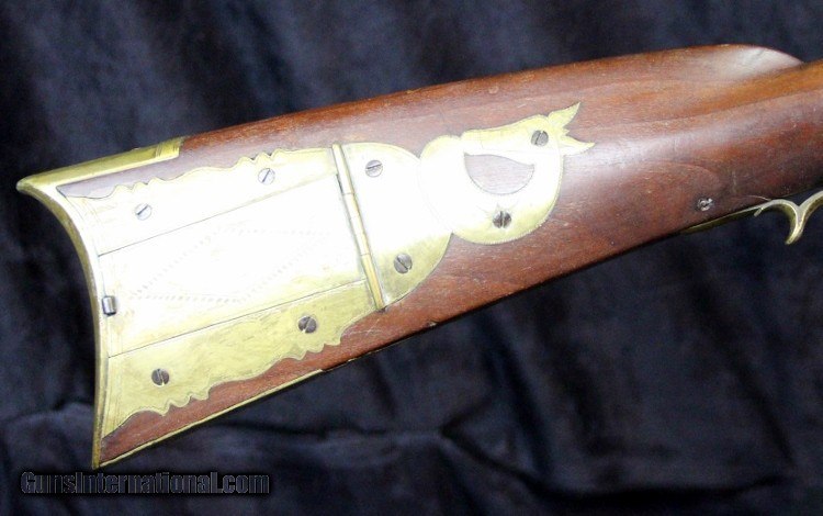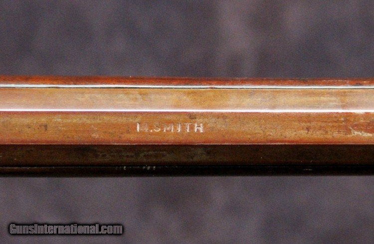 Description: .55 cal smooth bore, converted from flint to percussion, NVSN, 40 inch barrel, plum finish, full stock, ":Adams" on lock plate, "M SMITH" on barrel, brass patch box and furniture, oval escutcheon plate at wrist, single trigger, original sights, early 1800's. Believe maker is Marvin Smith. Located in Greenville, Mass in the early 1800's. Have not found a lock maker "Adams" that fits. Condition: bore is dark, barrel retains 90% brown, brass is aged mustard color, old repair on trigger guard at front of guard bow, there is the usually wood and metal degradation where the flash pan was originally, marks very good, mechanically very good. SOLD Antique: Yes |