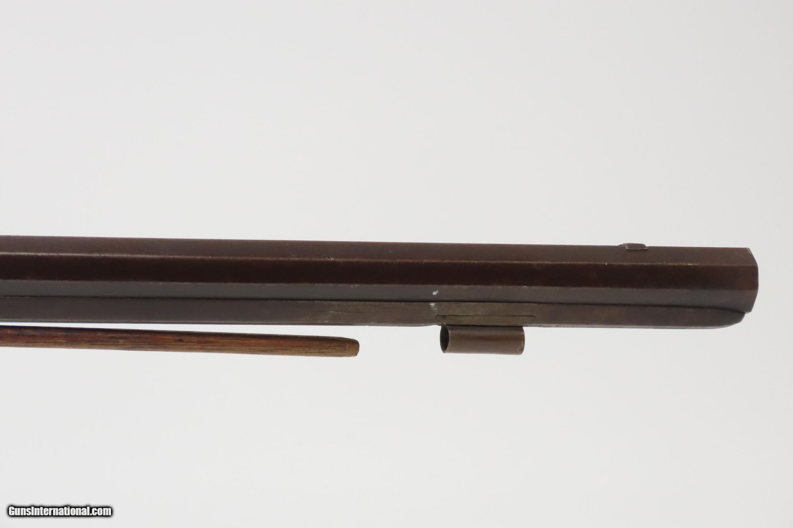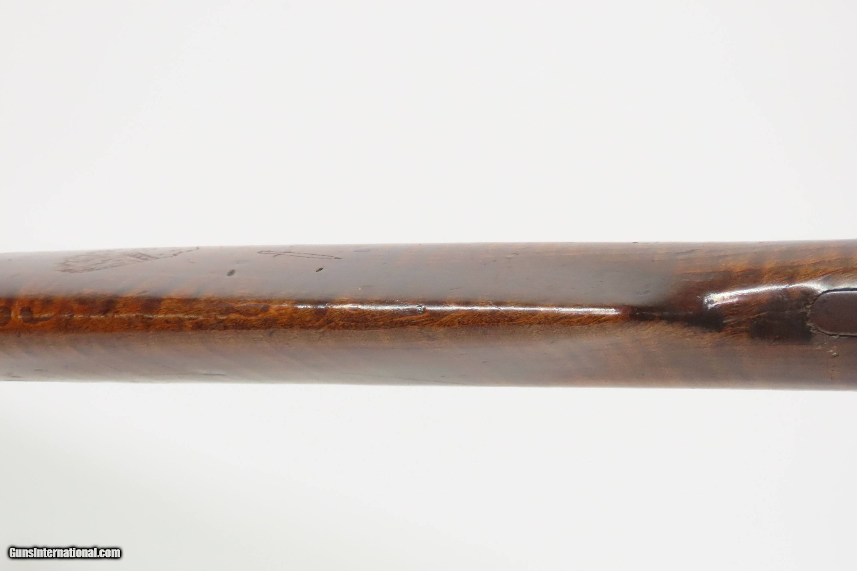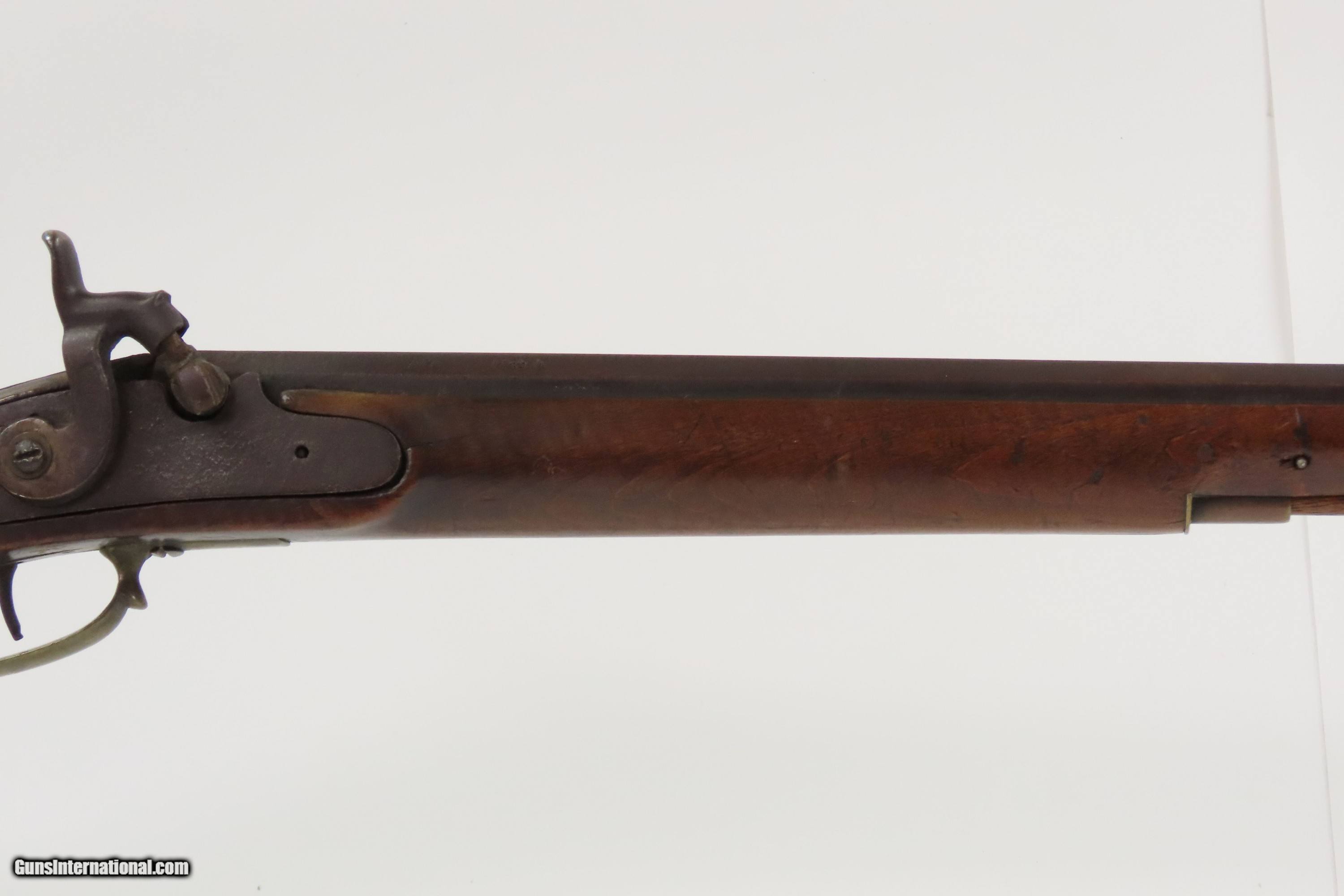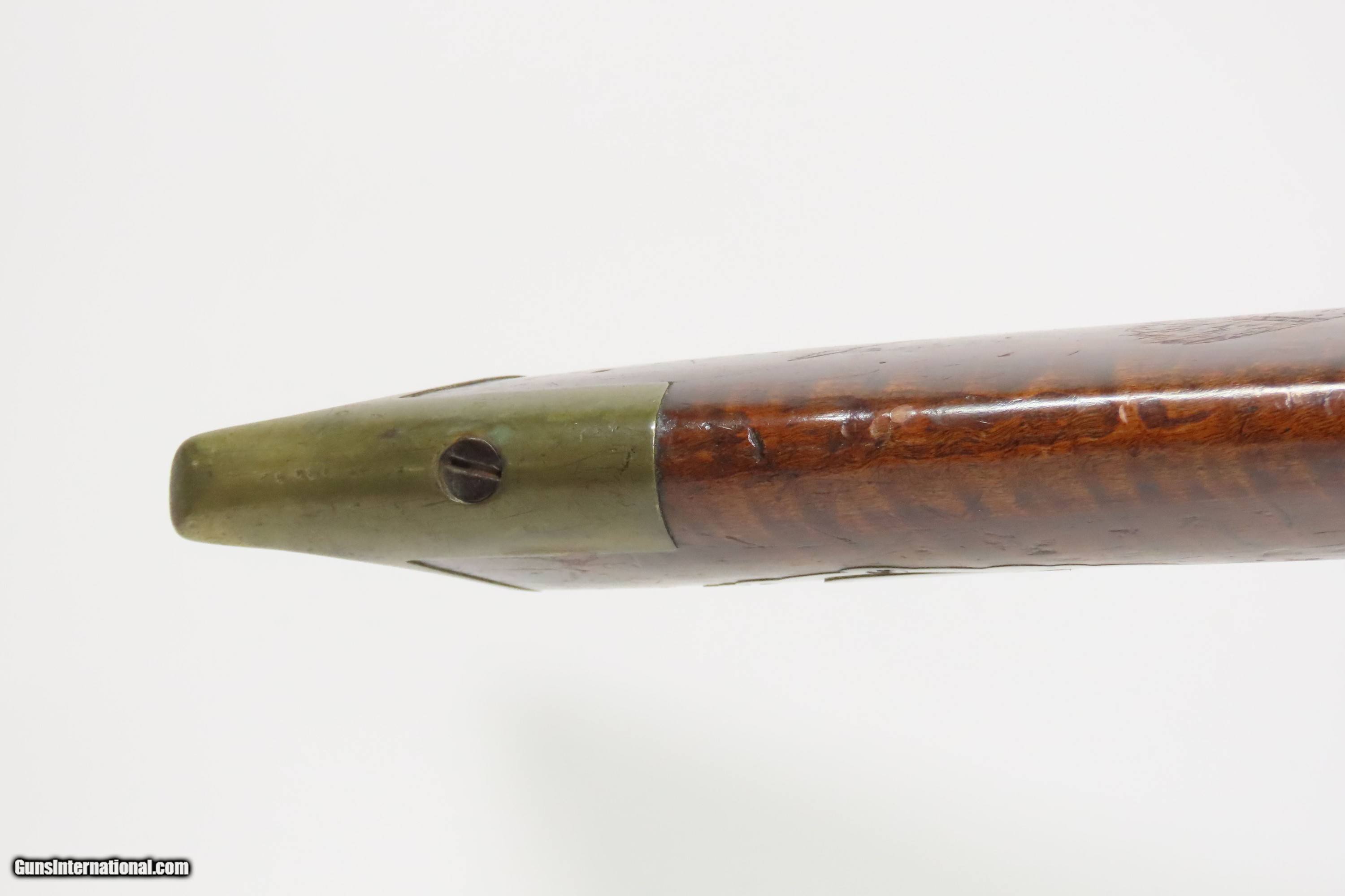 Description: Mid-1800s Antique AMERICAN Half Stock Percussion HOMESTEAD/HUNTING Rifle Game Getting Rifle w/ Indian/Native THEMED CARVINGS Here we present an antique Percussion Half Stock Rifle made circa the mid-1800s. The percussion rifle was a type of rifle that utilized the percussion lock mechanism to fire a bullet or musket ball. The Percussion lock mechanism was an evolution of the flintlock mechanism used on earlier muskets and rifles, with the percussion rifle being introduced somewhere around 1820. The percussion rifle had a slight advantage when it came to rate of fire over its flintlock counterparts. The use of a percussion cap reduced the reloading time, meaning the average number of shots per minute would consistently fall between three and four per minute. The percussion lock was also very reliable in wet conditions, and the reverse is true for the flintlocks with the primer not being affected by having water in contact with it, while the powder was virtually incapable of being exposed to water. This example’s stout octagonal barrel is in .32 caliber, large enough to take small to medium sized game or to defend the homestead against unwanted aggression. Rifle manufacture in the mid-to-late 19th Century was rapidly changing over from thousands of craftsmen all over the United States and on the Frontier making and selling their wares, to the large factories with standardized assembly lines and modern manufacturing techniques. Many of the maker’s names of these percussion rifles have been lost over time. This is one such example. This rifle would have also been used to put food on the table or defend the homestead against unwanted intruders! The overall condition is good. Original dark brown patina. The stock has a crack through the wrist with some movement and a repair at the rear of lock but remains solid. Good rifled bore. Strong action. The blade is missing from the front sight. “A.F.R 1074” marked on the right barrel flat. Hand carvings are present on the left buttstock. Own the original! This is a legitimate antique and not a reproduction. Barrel is 43 inches. Caliber: .32 Percussion Overall condition as seen in photos. Very Fast. Very Safe. FREE SHIPPING WORLDWIDE. Delivered directly to your door by express mail! Guaranteed AUTHENTIC & Includes CERTIFICATE OF AUTHENTICITY. ancestryguns $1800 #250640 SOLD Antique: Yes |