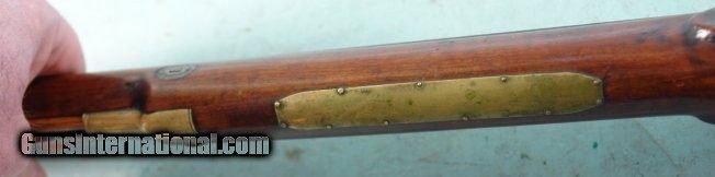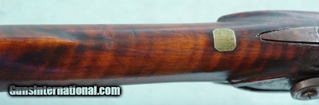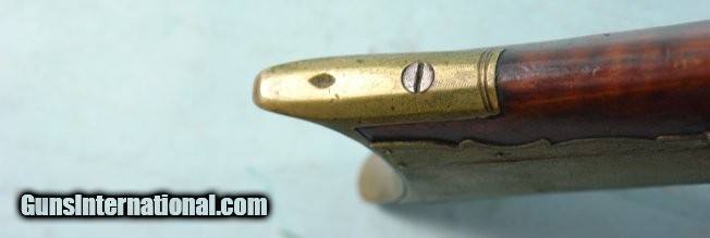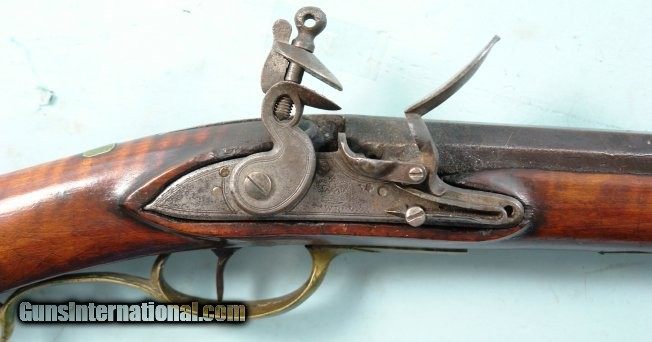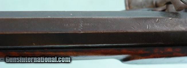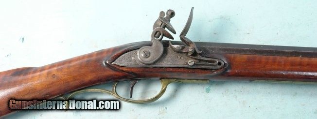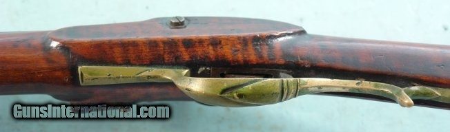 Description: PENNSYLVANIA / OHIO FLINTLOCK KENTUCKY STYLE LONGRIFLE BY REUBEN HOLMES CIRCA LATE 1830’S. Handsome conversion from percussion to flintlock using a British early Victorian era Royal Ordnance inspected original rifle flint lock that fits the mortise quite well. 37” octagon rifled .32 cal. barrel signed “R. HOLMES”. Tiger maple stock with brass mounts and patchbox. Coin silver, wedge escutcheons and cheek rest and wrist inlays. Excellent condition with stock having the original finish and barrel with original brown finish and patina mix. Working order and excellent bore. Holmes originally from Beaver County, Pennsylvania moved to Petersburg, Ohio in 1837. SOLD Antique: Yes |