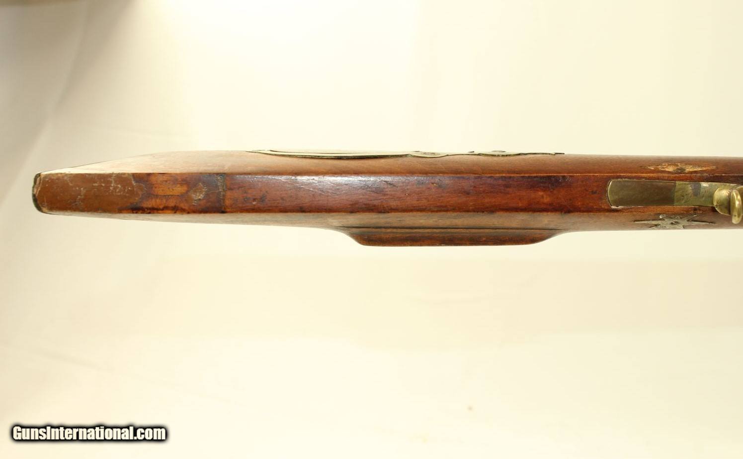 Description: PHILADELPHIA Antique PENNSYLVANIA Long Rifle .46 FULL STOCK Long Rifle with Brass Hardware Here we present an antique engraved American Full Stock Long Rifle, made circa 1840. This .46 caliber rifle features double set triggers. These type rifles would have been crucial and utilitarian tools on the frontier for gathering food and protecting the homestead. This one is marked with the maker’s name “TOBY” on the top flat of the barrel and “PHILA” for Philadelphia. The overall condition is fair. The bore shows promise and will clean up nicely. The action functions. There is no percussion nipple present and the threads look good in the bolster. There are various cracks, and some repairs, as seen in the photos. A good old gun that was used hard back in its heyday. Own the original! This is a legitimate antique and not a reproduction. Barrel is 34-1/4 inches in length. Caliber: .46 Percussion Overall condition as seen in photos. Very Fast. Very Safe. FREE SHIPPING WORLDWIDE. Delivered directly to your door by express mail! Guaranteed AUTHENTIC & Includes CERTIFICATE OF AUTHENTICITY. ancestryguns $800 #190827 SOLD Antique: Yes |