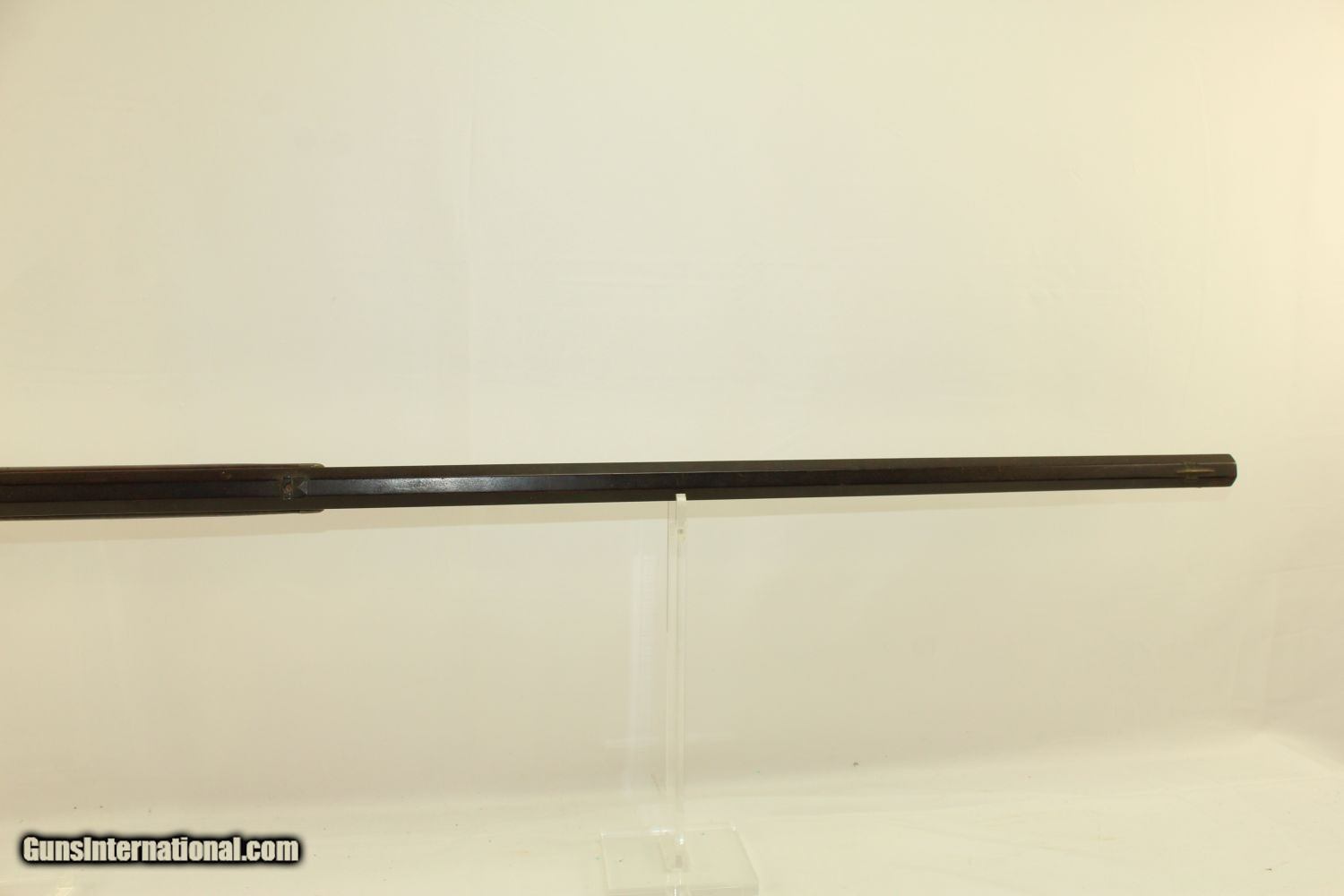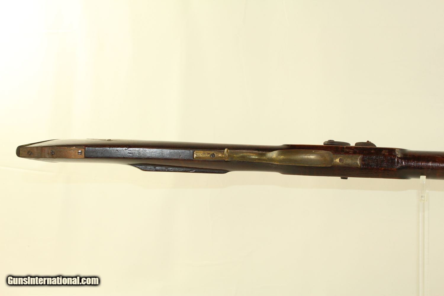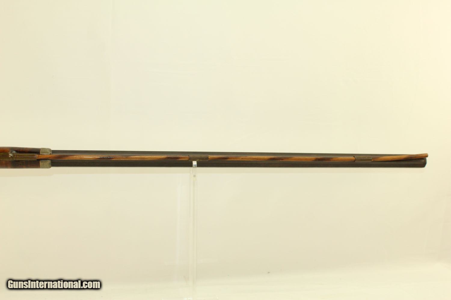 Description: QUINTESSENTIAL Frontier Rifle Full-Stock Kentucky Rifle Circa 1850s Here we present an antique American Full-Stock Kentucky style Long Rifle, made circa the 1850s. Rifle manufacture in the mid-to-late 19th Century was rapidly changing over from thousands of craftsman all over the United States and on the Frontier making and selling their wares, to the large factories with standardized assembly lines and modern manufacturing techniques. Many makers’ names of the so-called Kentucky long rifles have been lost over time and some were never marked at all. This rifle is one such example. This rifle is all business with a small patchbox mounted into the plain maple stock. Heavy octagonal barrel. No markings or engraving. Brass furniture. Double set triggers. This would have been a great rifle for small to medium game in the mid-19th Century. The overall condition is good. The iron parts are an even plum color. There are no noticeable markings on the exterior. The maple stock is dark in colors and remains in good condition, with just the slightest fracture at the point of the toe. The bore is in good condition with good rifling and an untouched layer of dust. The action remains strong. Double set triggers still work! Own the original! This is a legitimate antique and not a reproduction. Barrel is 39-3/4 inches. Caliber: .34 (about .345 from land to land) Overall condition as seen in photos. Very Fast. Very Safe. FREE SHIPPING WORLDWIDE. Delivered directly to your door by express mail! Guaranteed AUTHENTIC & Includes CERTIFICATE OF AUTHENTICITY. ancestryguns $1000 #190850 SOLD Antique: Yes |