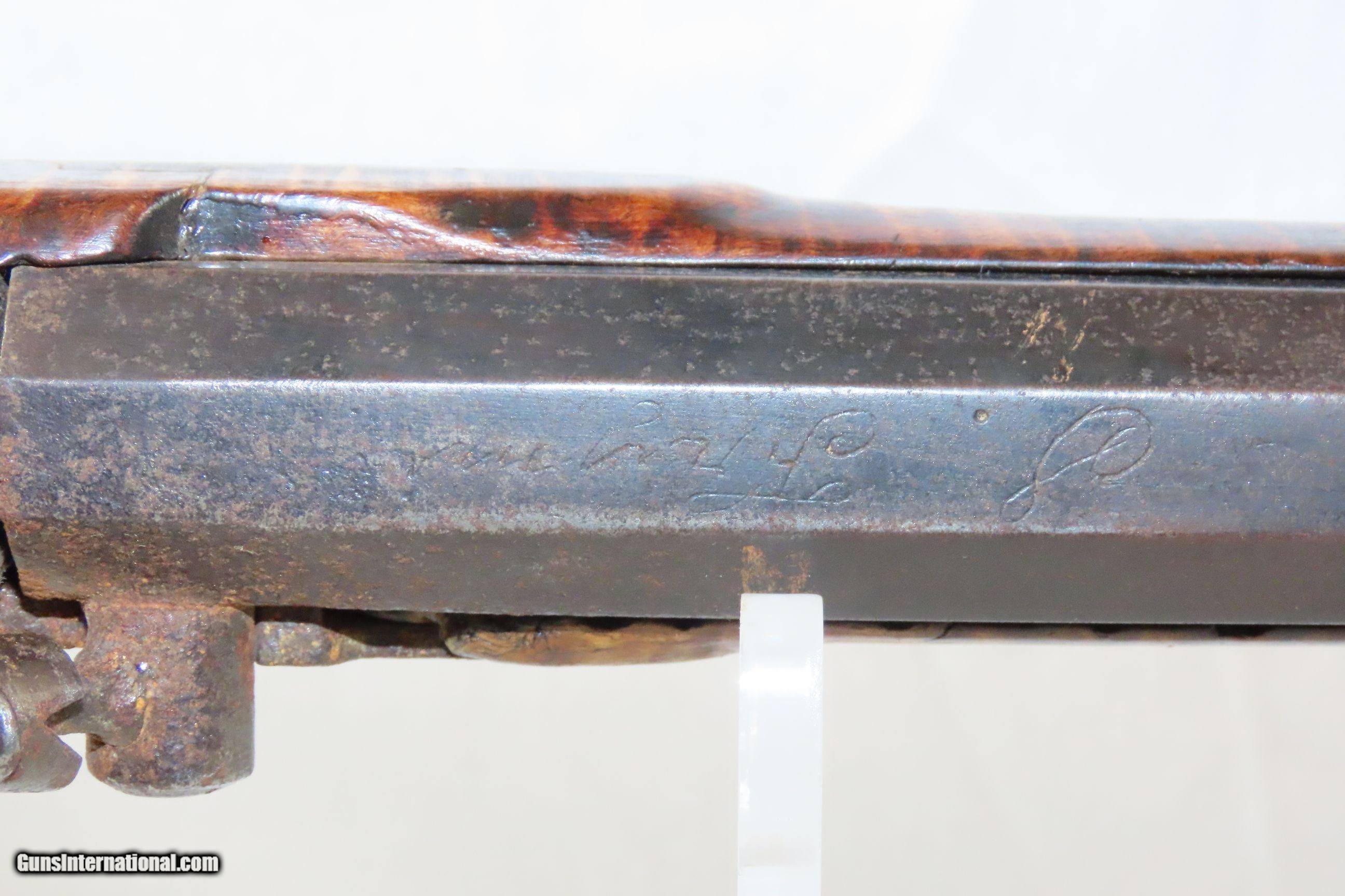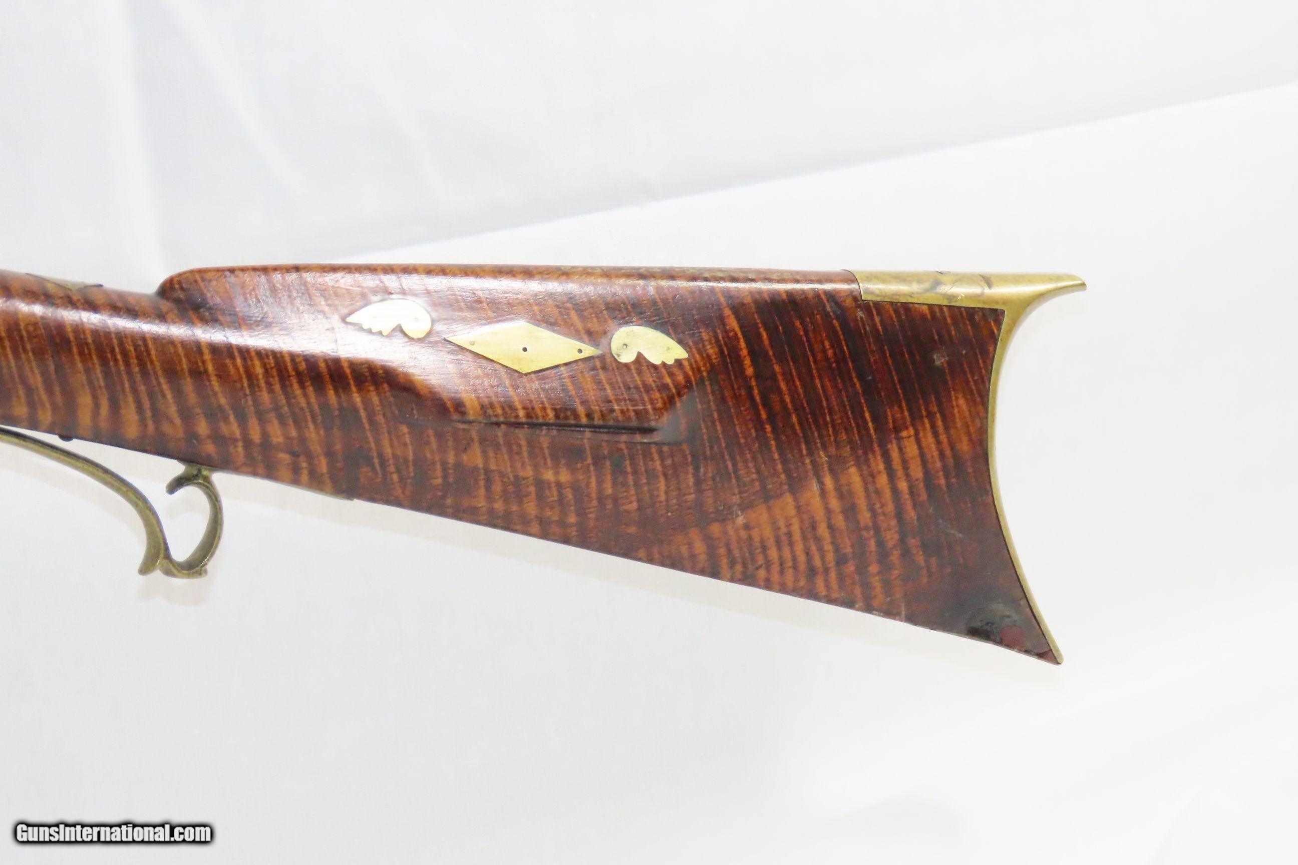 Description: S. Fry__ Antique 19th CENTURY Half-Stock .40 Percussion American LONG RIFLE Kentucky Style HUNTING/HOMESTEAD Long Rifle Here we present an antique Half Stock Percussion Long Rifle by S. Fry__, made circa the mid-19th Century. Its stout octagonal barrel is in .40 caliber, large enough to take small to medium sized game or to defend the homestead against unwanted aggression. Rifle manufacture in the mid-to-late 19th Century was rapidly changing over from thousands of craftsmen all over the United States and on the Frontier making and selling their wares, to the large factories with standardized assembly lines and modern manufacturing techniques. Many makers’ names of the so-called Kentucky long rifles have been lost over time. The overall condition is fair. The signature is a bit light after the “S. Fry__” but it appears there is more to the name. The action is not presently functional: the hammer will not hold the cocked position unless it is held back and the set trigger pressed at the same time; the hammer will not drop unless the front trigger is pressed and the hammer thumbed back slightly; good spring tension though. The bore is untouched and quite dusty with good rifling visible. The stock shows much use and has a nice figure. Ramrod absent. The top tang is cracked at the screw but does not move. This one has a shapely patchbox as well. Own the original! This is a legitimate antique and not a reproduction. Barrel is 38-5/8 inches. Caliber: .40 Percussion Overall condition as seen in photos. Very Fast. Very Safe. FREE SHIPPING WORLDWIDE. Delivered directly to your door by express mail! Guaranteed AUTHENTIC & Includes CERTIFICATE OF AUTHENTICITY. ancestryguns $1500 #227526 SOLD Antique: Yes |