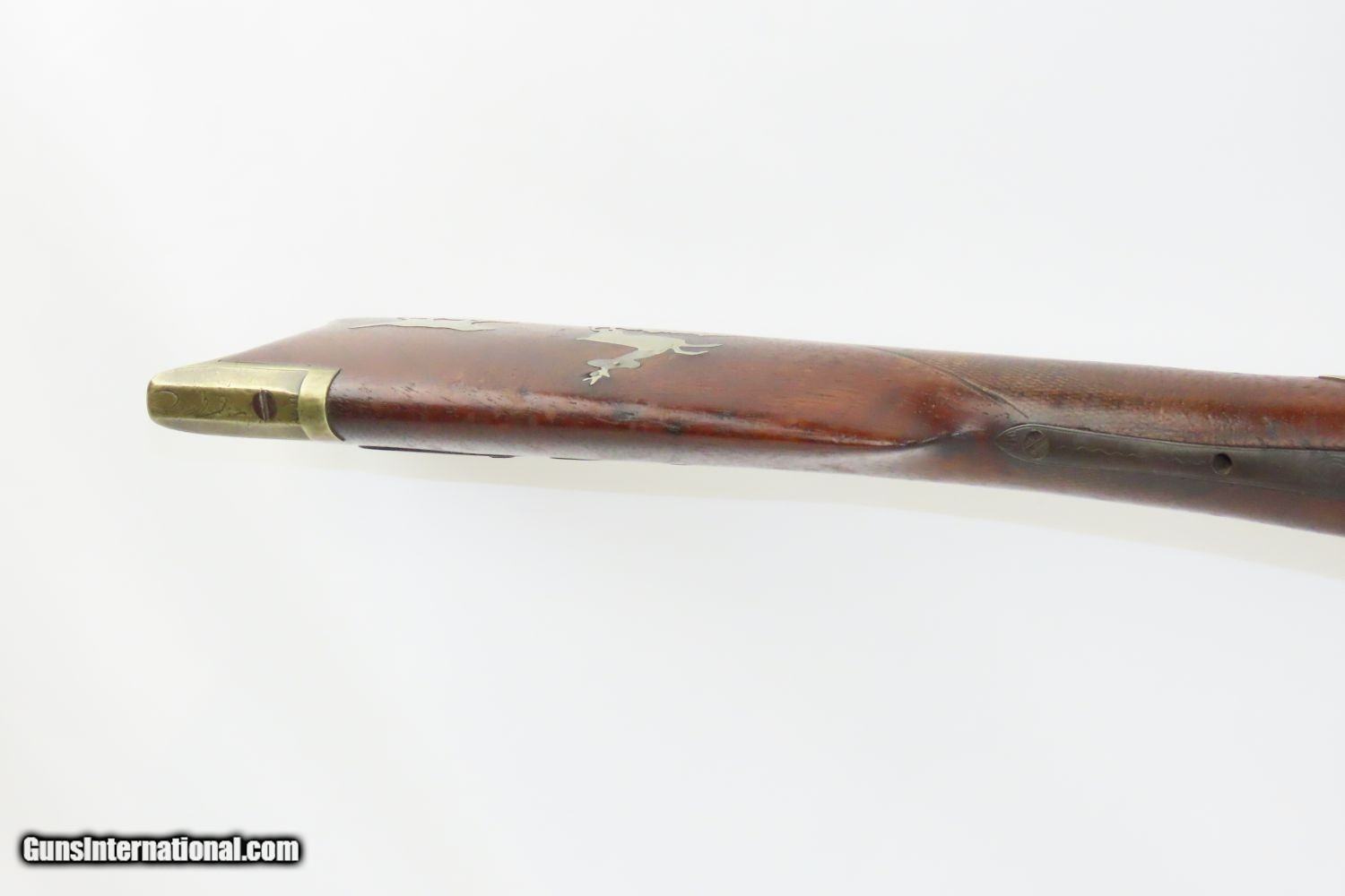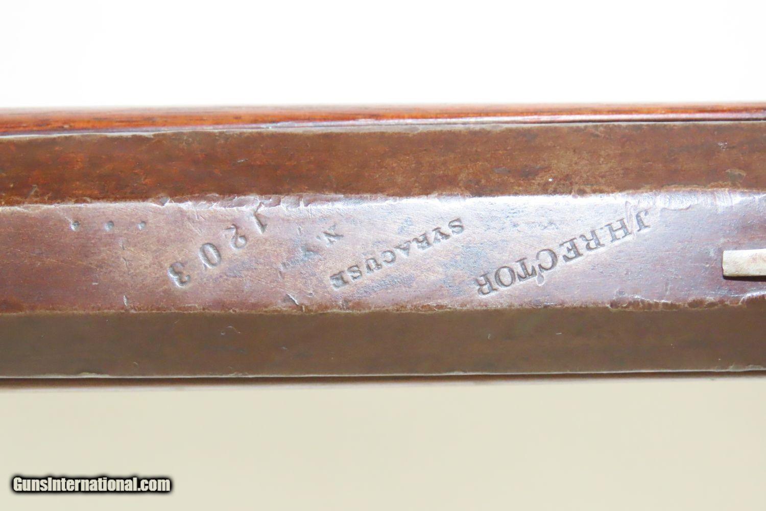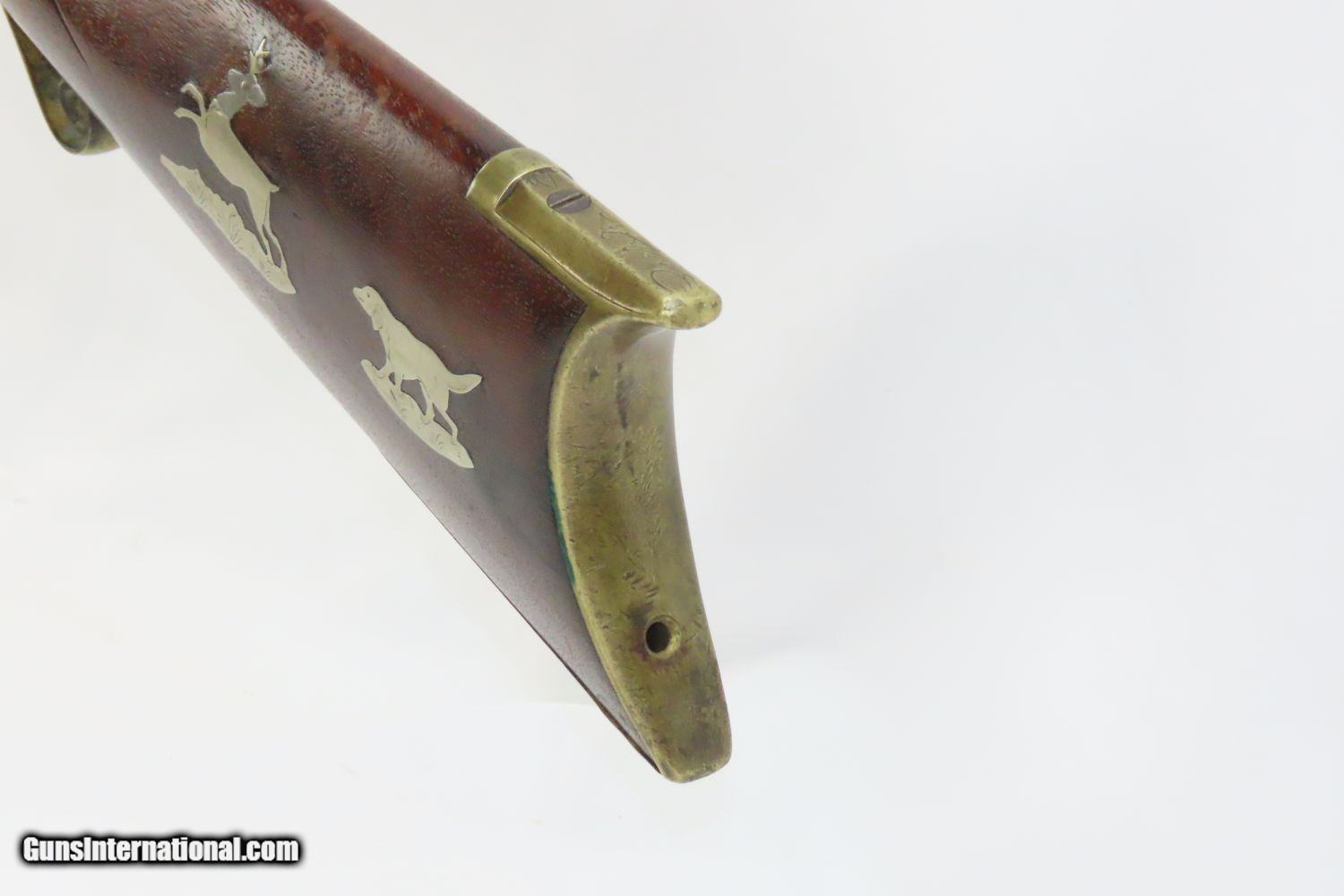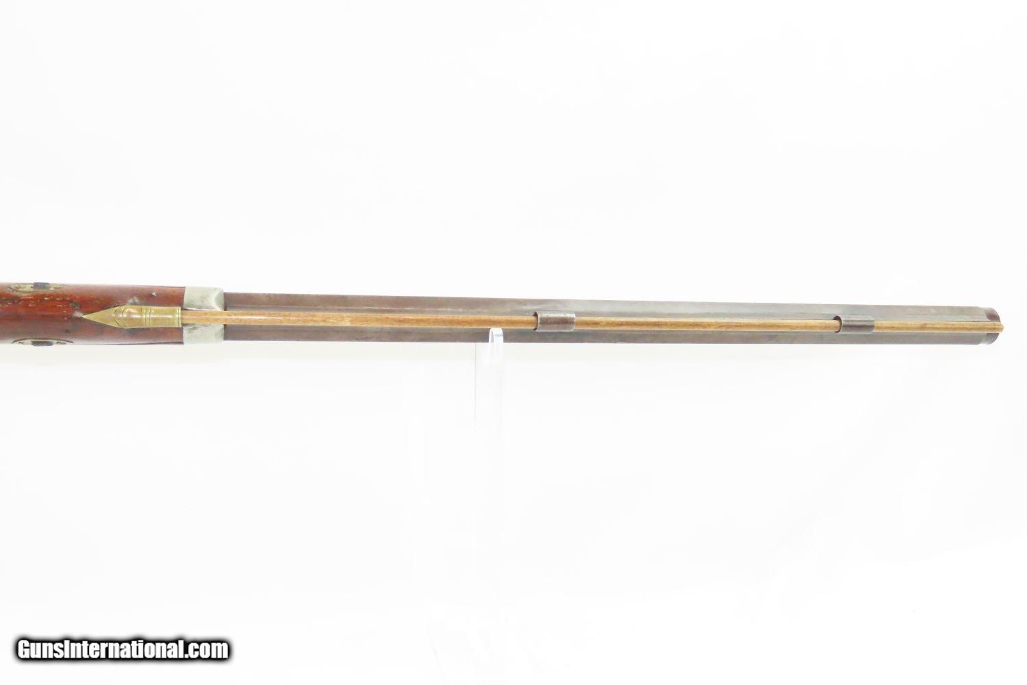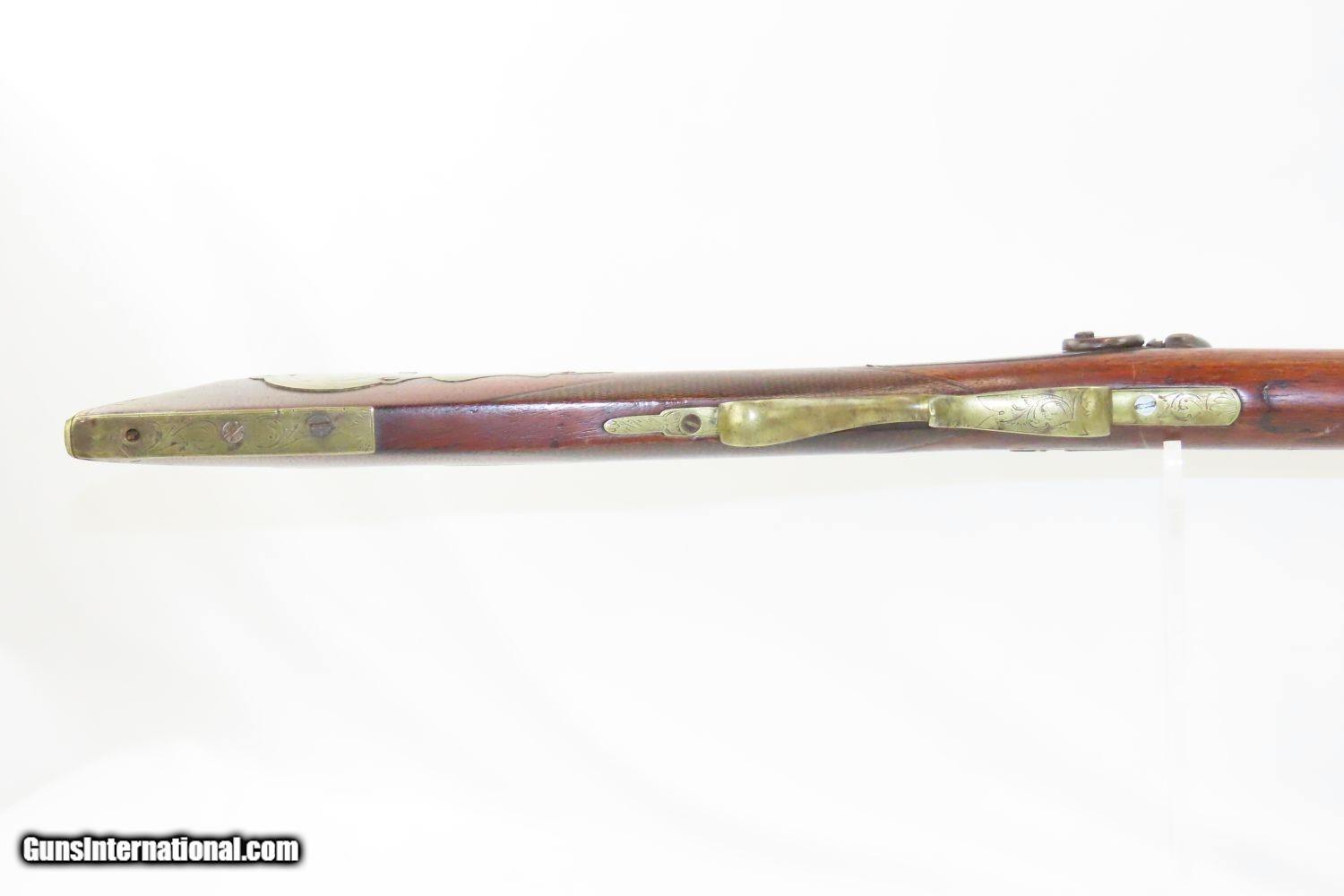 Description: SAN FRANCISCO CALIFORNIA Long Rifle by RECTOR of NY, Sold by Robert LIDDLE c1850s Smoothbore for the Western Market Here we present an antique J.H. Rector of Syracuse, New York Long Rifle, made circa the 1850s, and Sold by Robert Liddle & Co. of San Francisco, California. John Rector was a local gunsmith in Syracuse, NY who produced high quality firearms from the 1830’s through the 1860’s. Rector’s specialty was heavy percussion rifles and plains rifles for westward expansion. A historical directory from 1850 shows that his gun making business was located on Water Street in Syracuse. His maker’s mark is on one side of the rear sight, and Robert Liddle’s mark and “S.F. CAL” is on the other. Liddle’s first company was named for only himself: “R. Liddle & Co.” He would also work under the name Sportsmen’s Emporium as well as Liddle & Kaeding. This piece features an octagonal barrel with the aforementioned markings stamped into the top flat around the rear sight. There is a turned down, round segment at the muzzle. This almost certainly once had a smaller, rifled bore in a very heavy barrel that was bored larger (.585 approximately) and smooth to suit somebody’s use, perhaps against larger animals such as bears or bison on the Western Frontier. The front sight is part of an old US silver coin that was fit for the purpose, the silver being a fairly bright and visible choice of metal. The barrel tang has a spot for a rear aperture sight. The butt stock is decorated on one side with a stag and a dog in German silver. The other side features a brass patch box. Double set triggers round out this very interesting muzzle loader that made its way from coast to coast right before or around the time of the Civil War! The overall condition is good. The action is strong. The bore is in good shape, smooth and dark. All markings are clear and legible. All around the stock is solid and stable. The barrel tang was cracked at the screw and subsequently reinforced. The nipple is a bit peened but could be replaced if desired. The barrel is marked “JH RECTOR & Co./SYRACUSE/N.Y./1203” and “H. LIDDLE & Co. S.F. CAL”. The lock is marked “C. BAKER”. This example comes with a stag game scene embossed powder flask that is in very good condition. This is a great piece of history that would be excellent on display! Own the original! This is a legitimate antique and not a reproduction. Barrel is 31-1/8 inches. Caliber: .585 Percussion Overall condition as seen in photos. Very Fast. Very Safe. FREE SHIPPING WORLDWIDE. Delivered directly to your door by express mail! Guaranteed AUTHENTIC & Includes CERTIFICATE OF AUTHENTICITY. ancestryguns $2785 #201019 SOLD Antique: Yes |