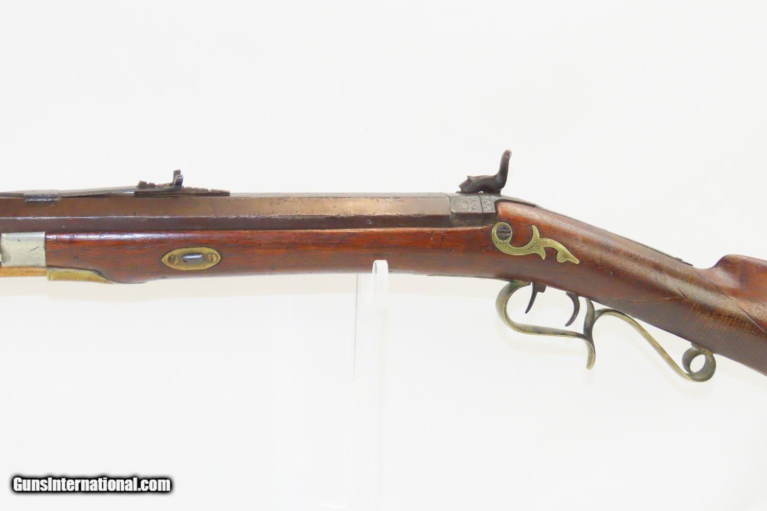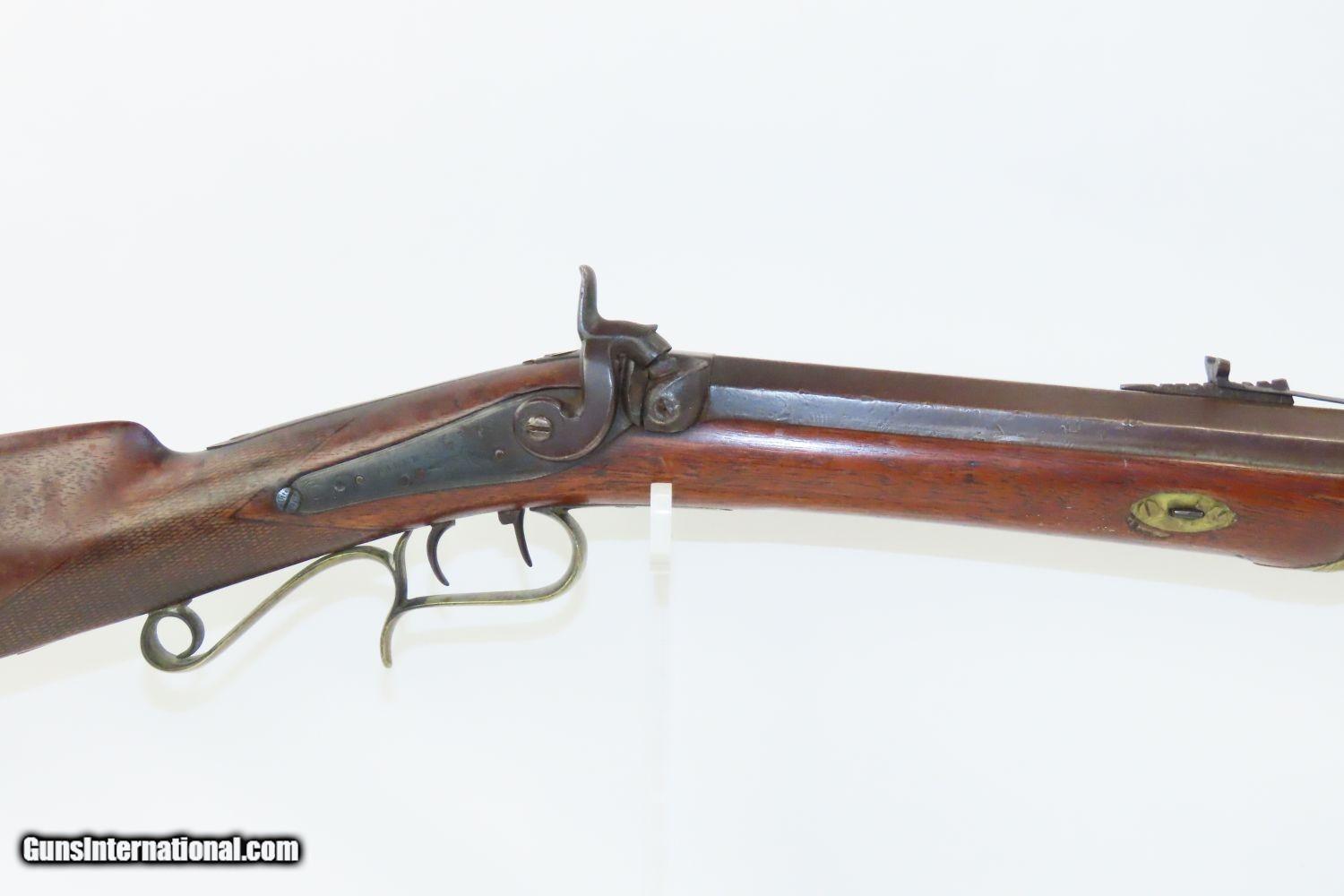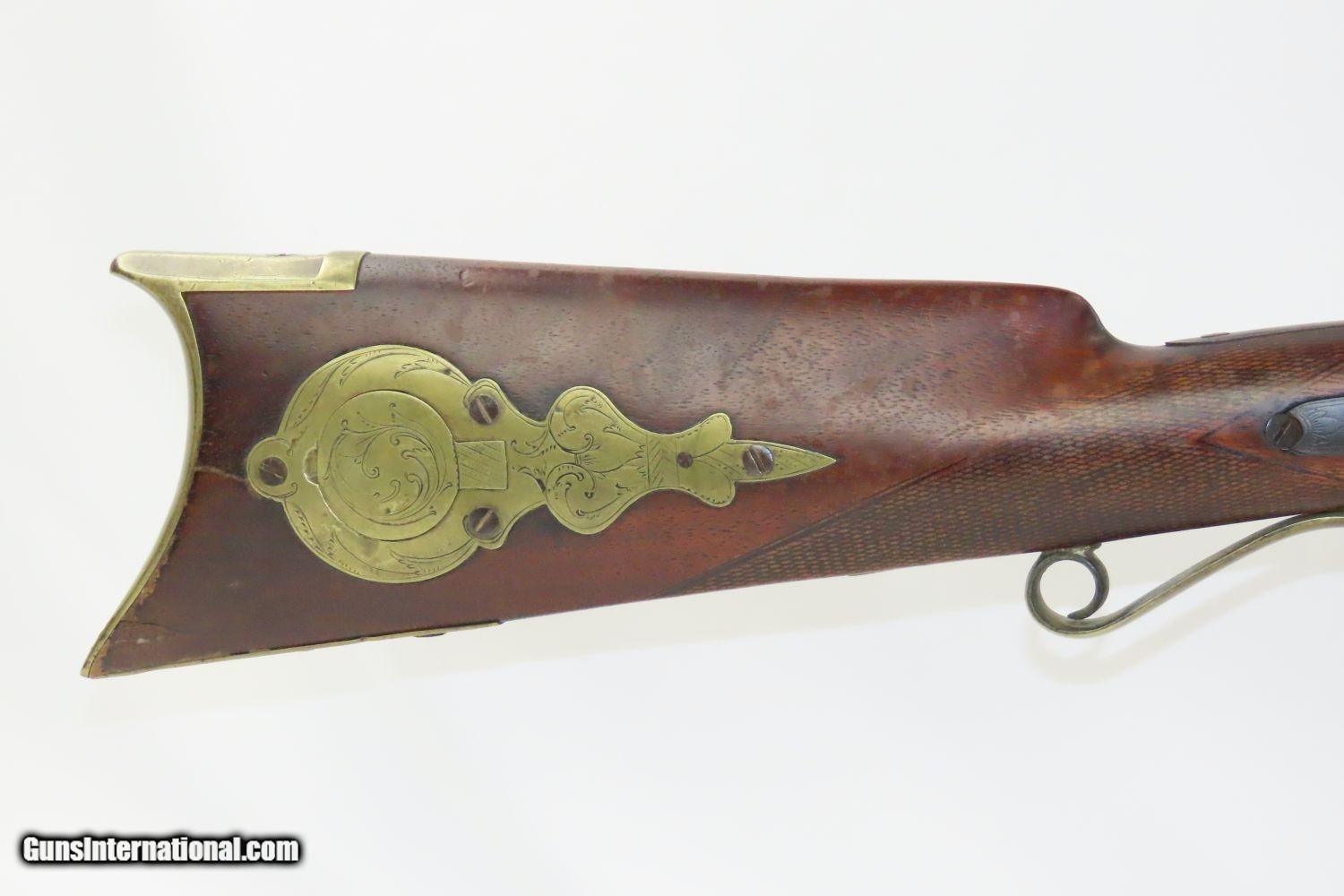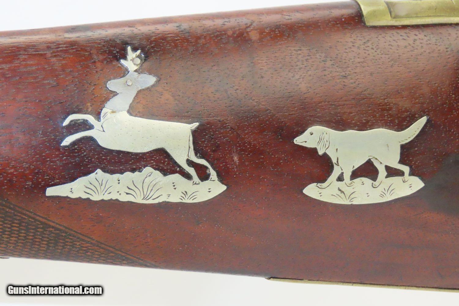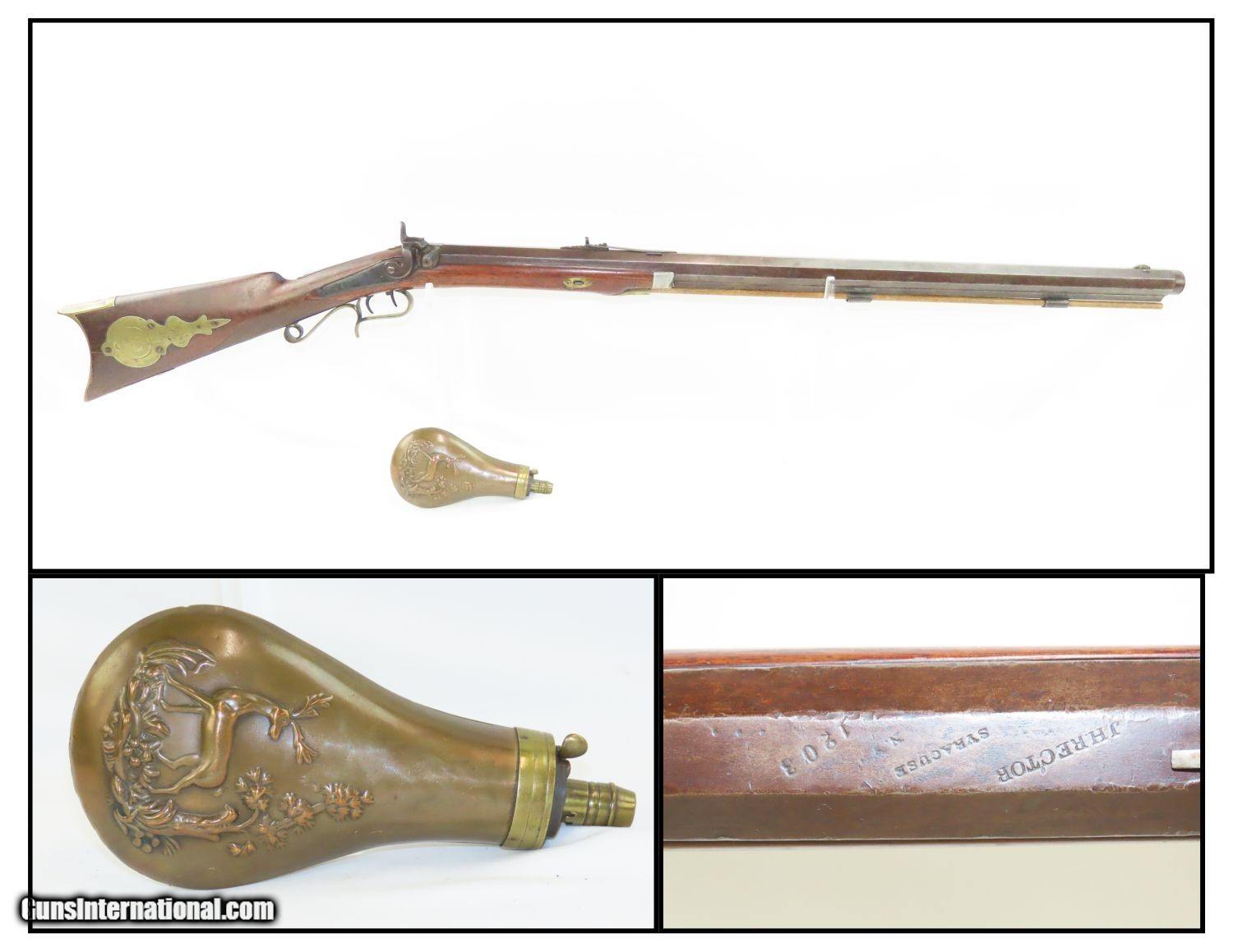 Description: SAN FRANCISCO CALIFORNIA Long Rifle by RECTOR of NY, Sold by Robert LIDDLE c1850s Smoothbore for the Western Market Here we present an antique J.H. Rector of Syracuse, New York Long Rifle, made circa the 1850s, and Sold by Robert Liddle & Co. of San Francisco, California. John Rector was a local gunsmith in Syracuse, NY who produced high quality firearms from the 1830’s through the 1860’s. Rector’s specialty was heavy percussion rifles and plains rifles for westward expansion. A historical directory from 1850 shows that his gun making business was located on Water Street in Syracuse. His maker’s mark is on one side of the rear sight, and Robert Liddle’s mark and “S.F. CAL” is on the other. Liddle’s first company was named for only himself: “R. Liddle & Co.” He would also work under the name Sportsmen’s Emporium as well as Liddle & Kaeding. This piece features an octagonal barrel with the aforementioned markings stamped into the top flat around the rear sight. There is a turned down, round segment at the muzzle. This almost certainly once had a smaller, rifled bore in a very heavy barrel that was bored larger (.585 approximately) and smooth to suit somebody’s use, perhaps against larger animals such as bears or bison on the Western Frontier. The front sight is part of an old US silver coin that was fit for the purpose, the silver being a fairly bright and visible choice of metal. The barrel tang has a spot for a rear aperture sight. The butt stock is decorated on one side with a stag and a dog in German silver. The other side features a brass patch box. Double set triggers round out this very interesting muzzle loader that made its way from coast to coast right before or around the time of the Civil War! The overall condition is good. The action is strong. The bore is in good shape, smooth and dark. All markings are clear and legible. All around the stock is solid and stable. The barrel tang was cracked at the screw and subsequently reinforced. The nipple is a bit peened but could be replaced if desired. The barrel is marked “JH RECTOR & Co./SYRACUSE/N.Y./1203” and “H. LIDDLE & Co. S.F. CAL”. The lock is marked “C. BAKER”. This example comes with a stag game scene embossed powder flask that is in very good condition. This is a great piece of history that would be excellent on display! Own the original! This is a legitimate antique and not a reproduction. Barrel is 31-1/8 inches. Caliber: .585 Percussion Overall condition as seen in photos. Very Fast. Very Safe. FREE SHIPPING WORLDWIDE. Delivered directly to your door by express mail! Guaranteed AUTHENTIC & Includes CERTIFICATE OF AUTHENTICITY. ancestryguns $2785 #201019 SOLD Antique: Yes |