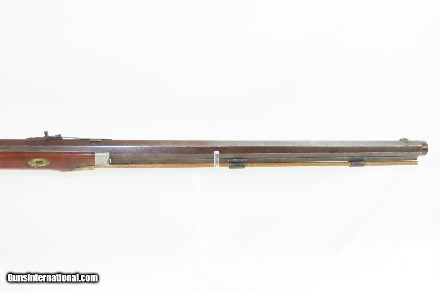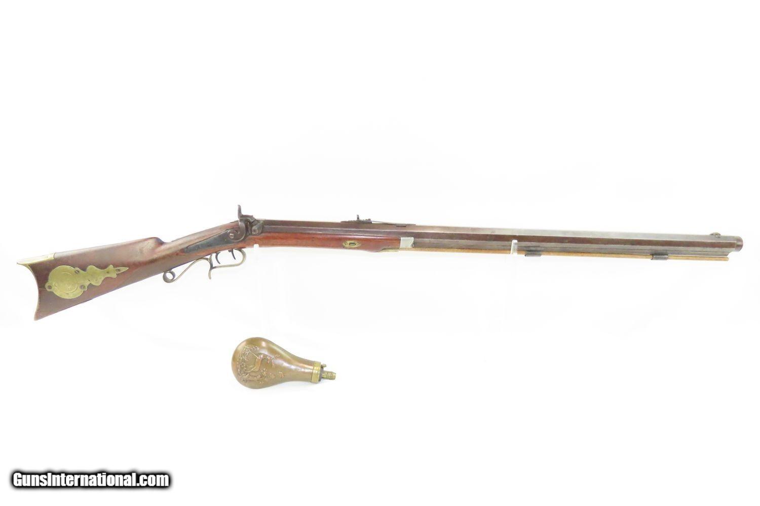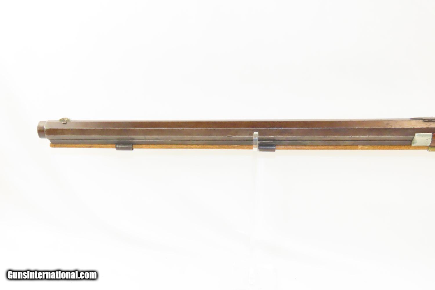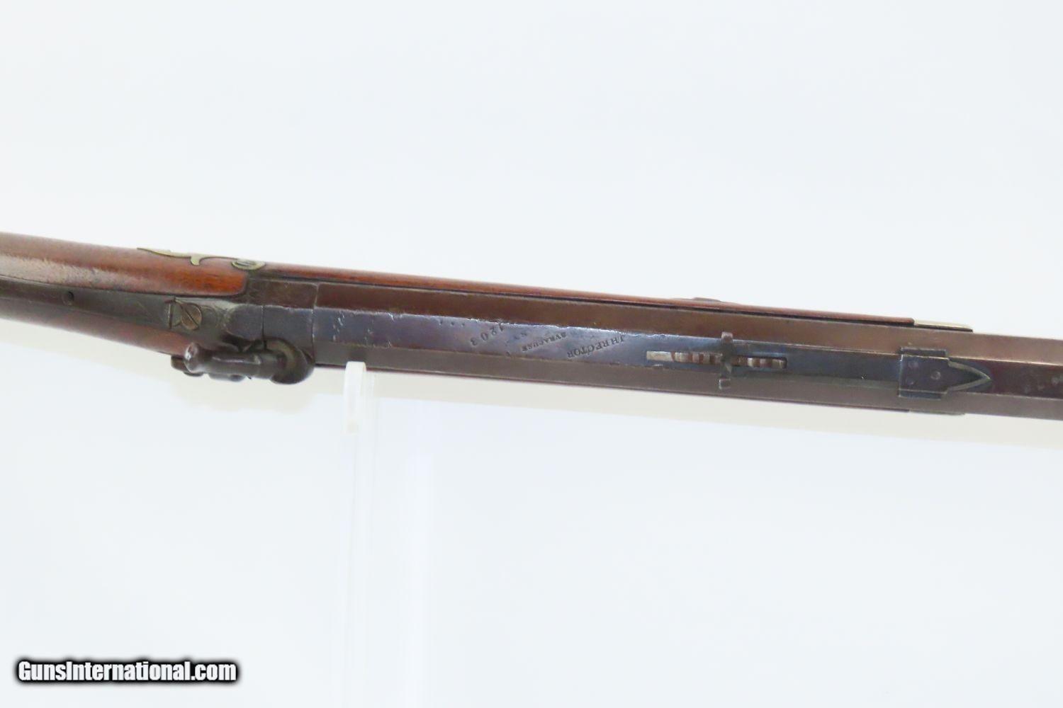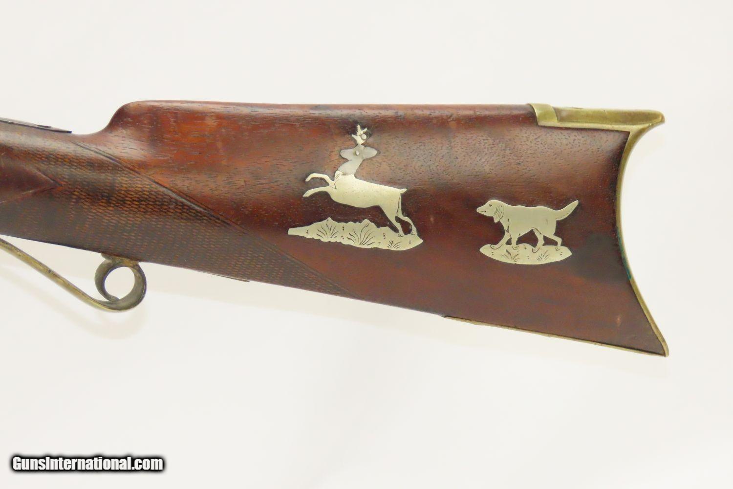 Description: SAN FRANCISCO CALIFORNIA Long Rifle by RECTOR of NY, Sold by Robert LIDDLE c1850s Smoothbore for the Western Market Here we present an antique J.H. Rector of Syracuse, New York Long Rifle, made circa the 1850s, and Sold by Robert Liddle & Co. of San Francisco, California. John Rector was a local gunsmith in Syracuse, NY who produced high quality firearms from the 1830’s through the 1860’s. Rector’s specialty was heavy percussion rifles and plains rifles for westward expansion. A historical directory from 1850 shows that his gun making business was located on Water Street in Syracuse. His maker’s mark is on one side of the rear sight, and Robert Liddle’s mark and “S.F. CAL” is on the other. Liddle’s first company was named for only himself: “R. Liddle & Co.” He would also work under the name Sportsmen’s Emporium as well as Liddle & Kaeding. This piece features an octagonal barrel with the aforementioned markings stamped into the top flat around the rear sight. There is a turned down, round segment at the muzzle. This almost certainly once had a smaller, rifled bore in a very heavy barrel that was bored larger (.585 approximately) and smooth to suit somebody’s use, perhaps against larger animals such as bears or bison on the Western Frontier. The front sight is part of an old US silver coin that was fit for the purpose, the silver being a fairly bright and visible choice of metal. The barrel tang has a spot for a rear aperture sight. The butt stock is decorated on one side with a stag and a dog in German silver. The other side features a brass patch box. Double set triggers round out this very interesting muzzle loader that made its way from coast to coast right before or around the time of the Civil War! The overall condition is good. The action is strong. The bore is in good shape, smooth and dark. All markings are clear and legible. All around the stock is solid and stable. The barrel tang was cracked at the screw and subsequently reinforced. The nipple is a bit peened but could be replaced if desired. The barrel is marked “JH RECTOR & Co./SYRACUSE/N.Y./1203” and “H. LIDDLE & Co. S.F. CAL”. The lock is marked “C. BAKER”. This example comes with a stag game scene embossed powder flask that is in very good condition. This is a great piece of history that would be excellent on display! Own the original! This is a legitimate antique and not a reproduction. Barrel is 31-1/8 inches. Caliber: .585 Percussion Overall condition as seen in photos. Very Fast. Very Safe. FREE SHIPPING WORLDWIDE. Delivered directly to your door by express mail! Guaranteed AUTHENTIC & Includes CERTIFICATE OF AUTHENTICITY. ancestryguns $2785 #201019 SOLD Antique: Yes |