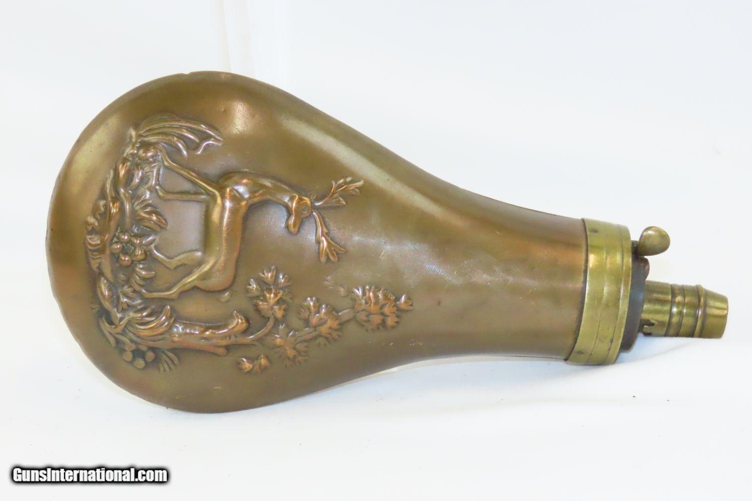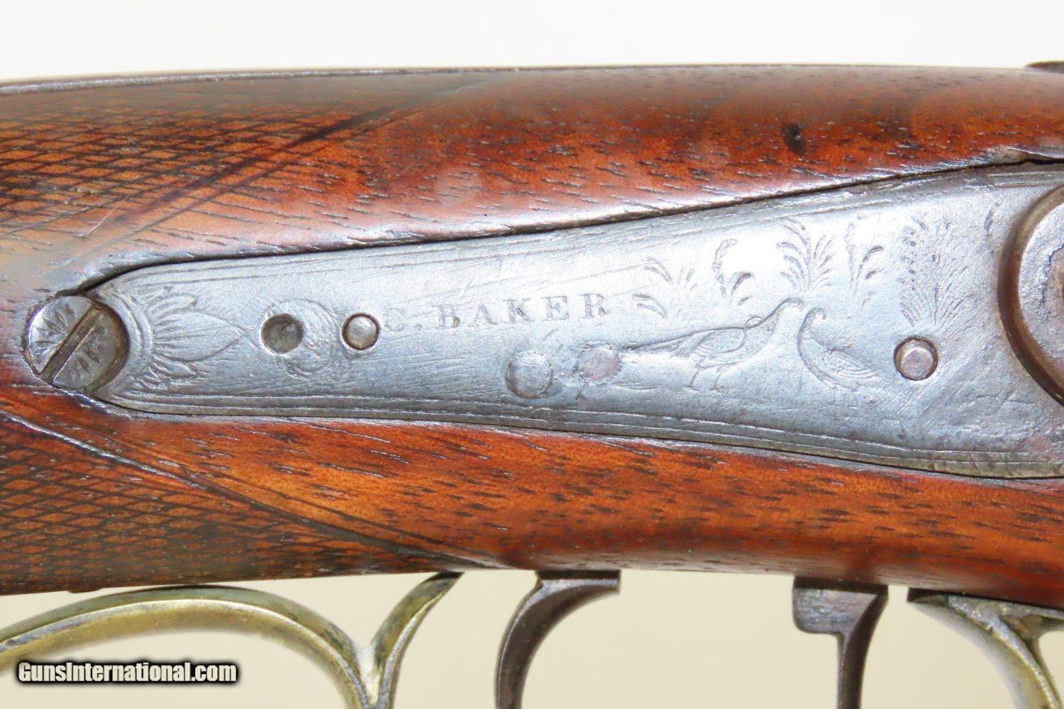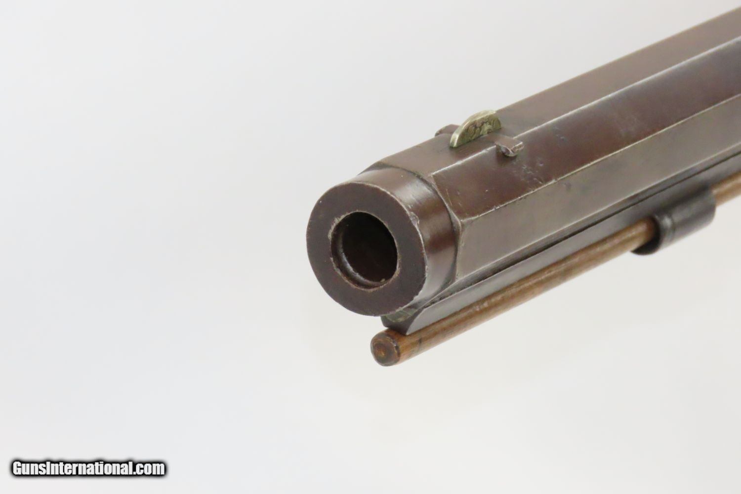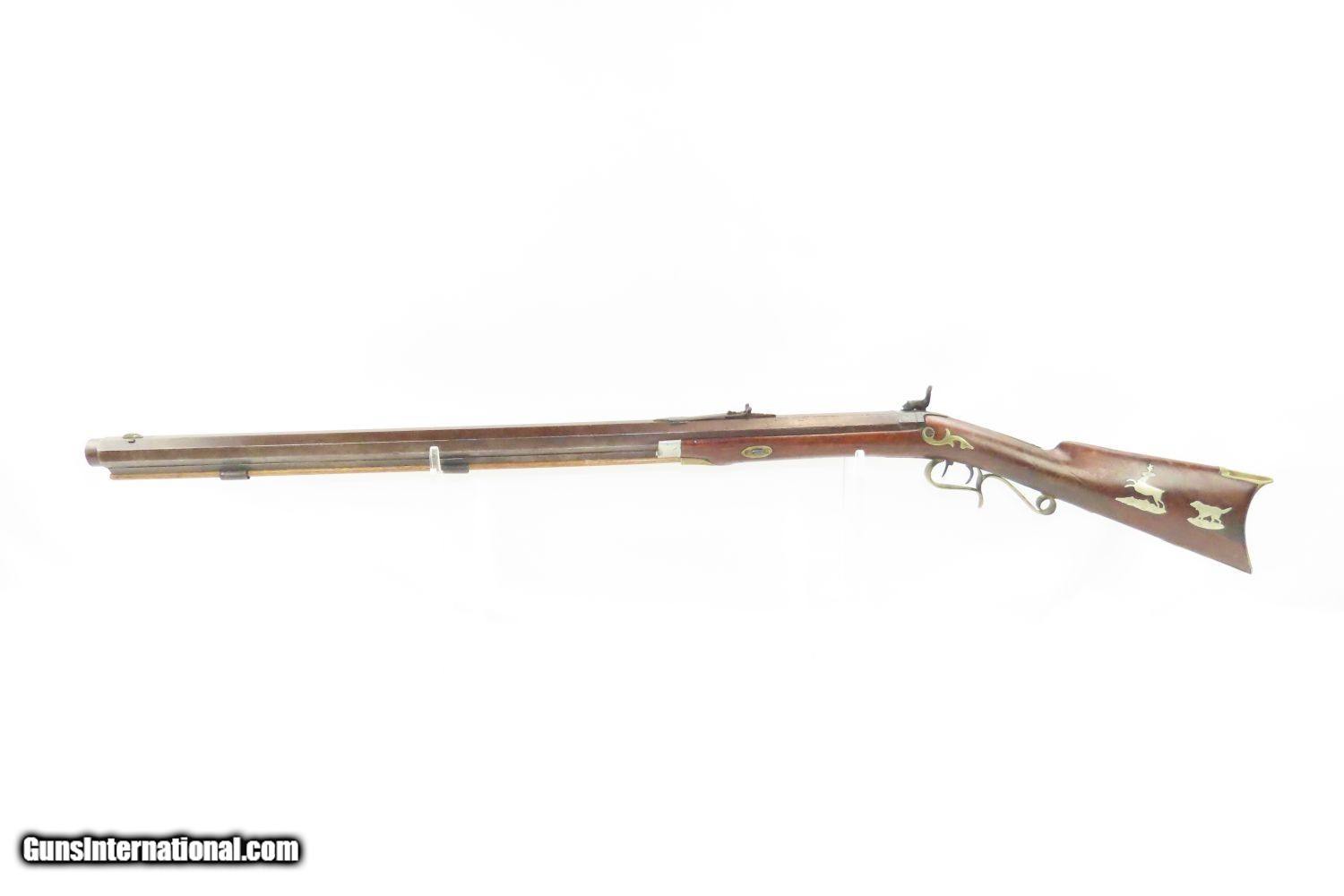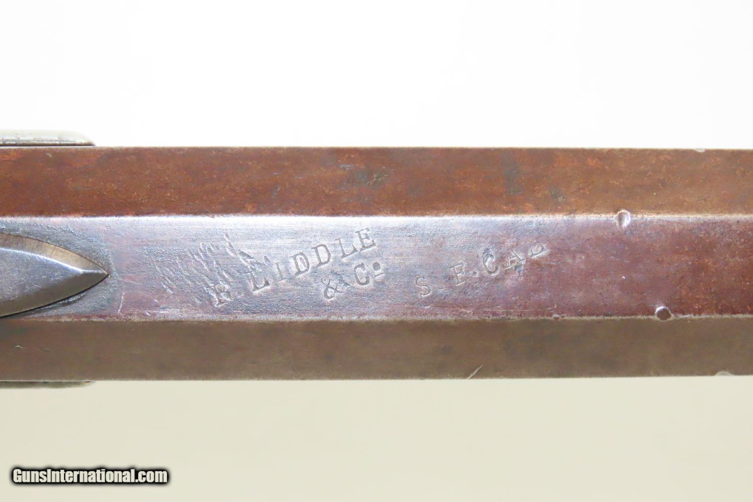 Description: SAN FRANCISCO CALIFORNIA Long Rifle by RECTOR of NY, Sold by Robert LIDDLE c1850s Smoothbore for the Western Market Here we present an antique J.H. Rector of Syracuse, New York Long Rifle, made circa the 1850s, and Sold by Robert Liddle & Co. of San Francisco, California. John Rector was a local gunsmith in Syracuse, NY who produced high quality firearms from the 1830’s through the 1860’s. Rector’s specialty was heavy percussion rifles and plains rifles for westward expansion. A historical directory from 1850 shows that his gun making business was located on Water Street in Syracuse. His maker’s mark is on one side of the rear sight, and Robert Liddle’s mark and “S.F. CAL” is on the other. Liddle’s first company was named for only himself: “R. Liddle & Co.” He would also work under the name Sportsmen’s Emporium as well as Liddle & Kaeding. This piece features an octagonal barrel with the aforementioned markings stamped into the top flat around the rear sight. There is a turned down, round segment at the muzzle. This almost certainly once had a smaller, rifled bore in a very heavy barrel that was bored larger (.585 approximately) and smooth to suit somebody’s use, perhaps against larger animals such as bears or bison on the Western Frontier. The front sight is part of an old US silver coin that was fit for the purpose, the silver being a fairly bright and visible choice of metal. The barrel tang has a spot for a rear aperture sight. The butt stock is decorated on one side with a stag and a dog in German silver. The other side features a brass patch box. Double set triggers round out this very interesting muzzle loader that made its way from coast to coast right before or around the time of the Civil War! The overall condition is good. The action is strong. The bore is in good shape, smooth and dark. All markings are clear and legible. All around the stock is solid and stable. The barrel tang was cracked at the screw and subsequently reinforced. The nipple is a bit peened but could be replaced if desired. The barrel is marked “JH RECTOR & Co./SYRACUSE/N.Y./1203” and “H. LIDDLE & Co. S.F. CAL”. The lock is marked “C. BAKER”. This example comes with a stag game scene embossed powder flask that is in very good condition. This is a great piece of history that would be excellent on display! Own the original! This is a legitimate antique and not a reproduction. Barrel is 31-1/8 inches. Caliber: .585 Percussion Overall condition as seen in photos. Very Fast. Very Safe. FREE SHIPPING WORLDWIDE. Delivered directly to your door by express mail! Guaranteed AUTHENTIC & Includes CERTIFICATE OF AUTHENTICITY. ancestryguns $2785 #201019 SOLD Antique: Yes |