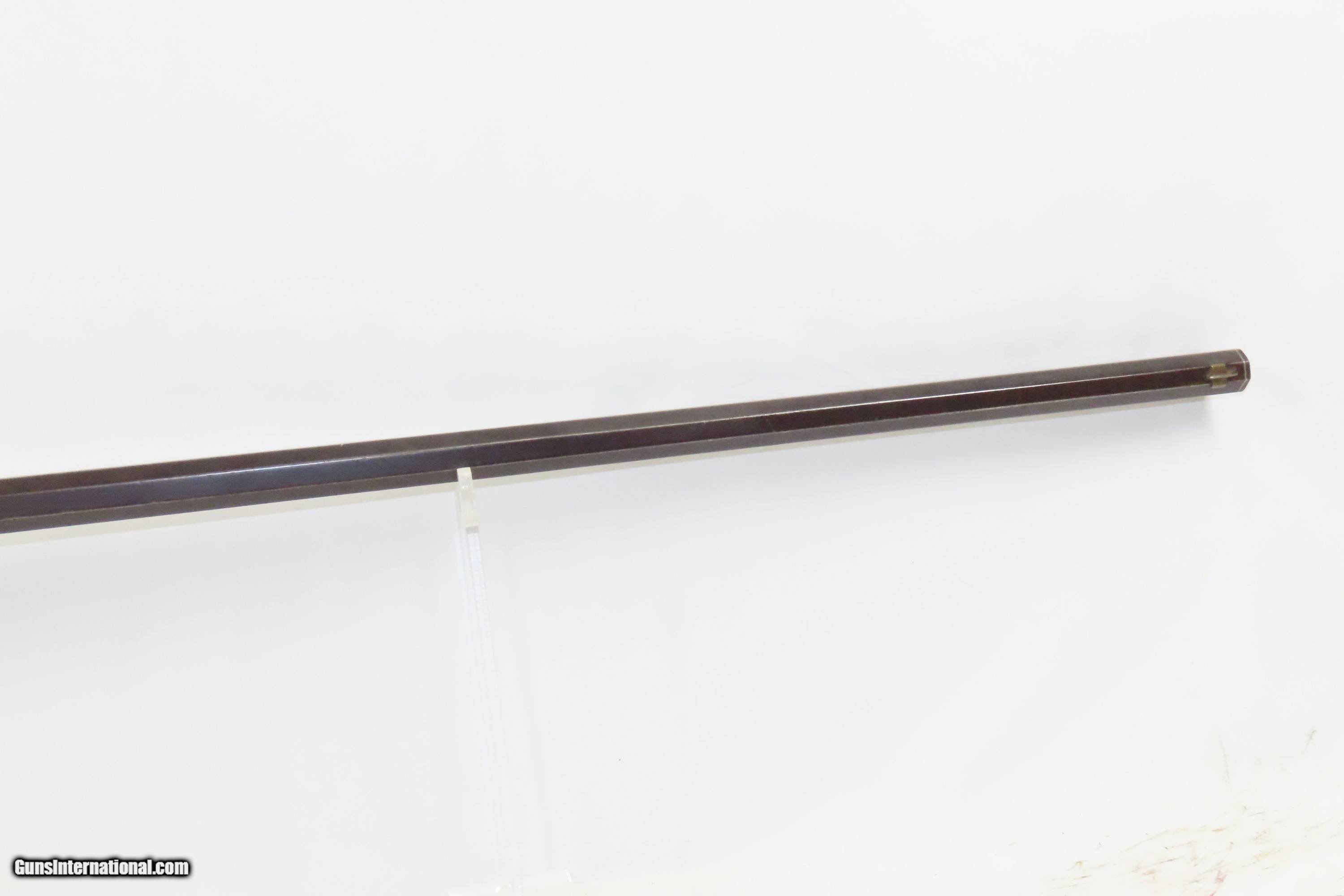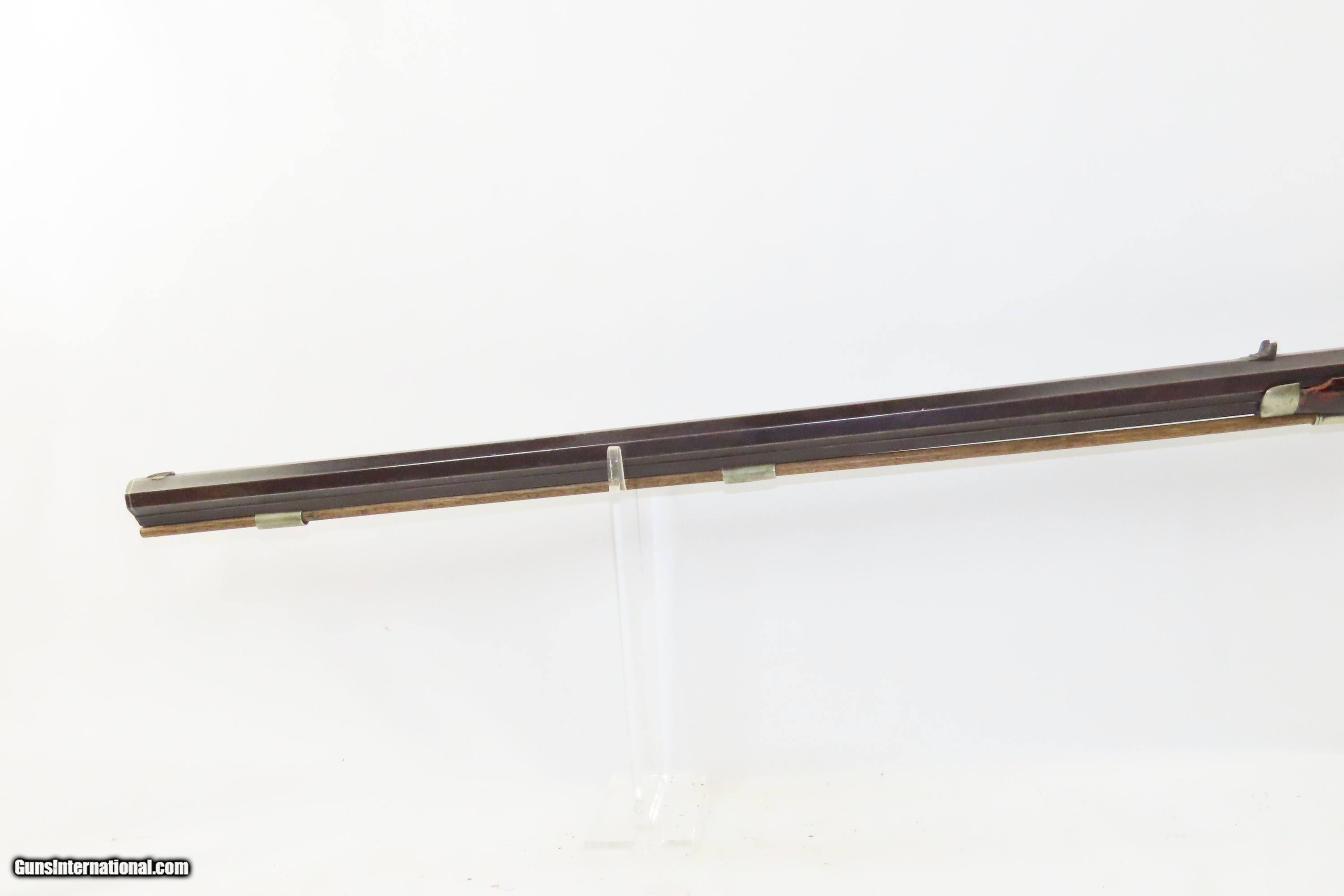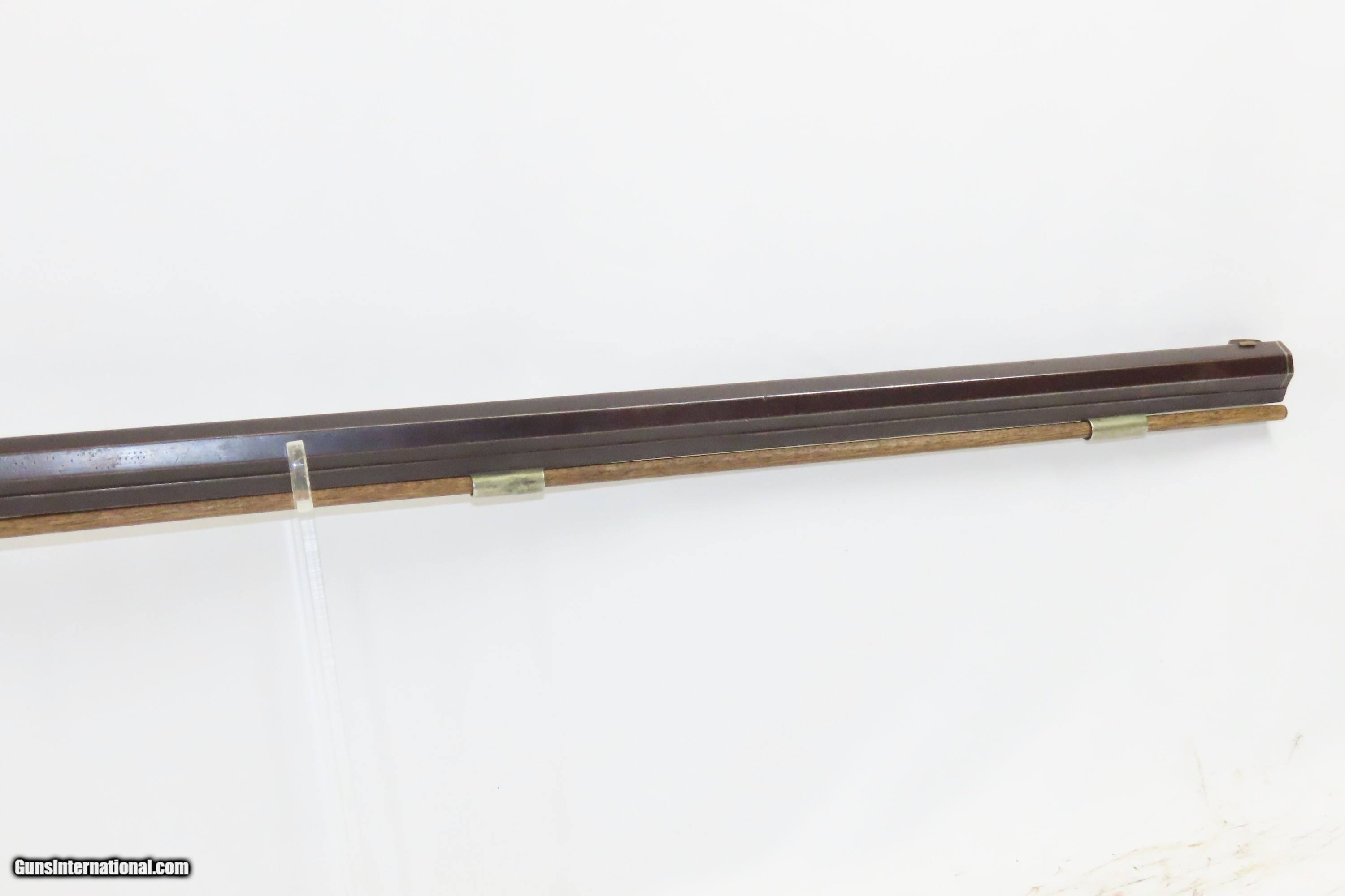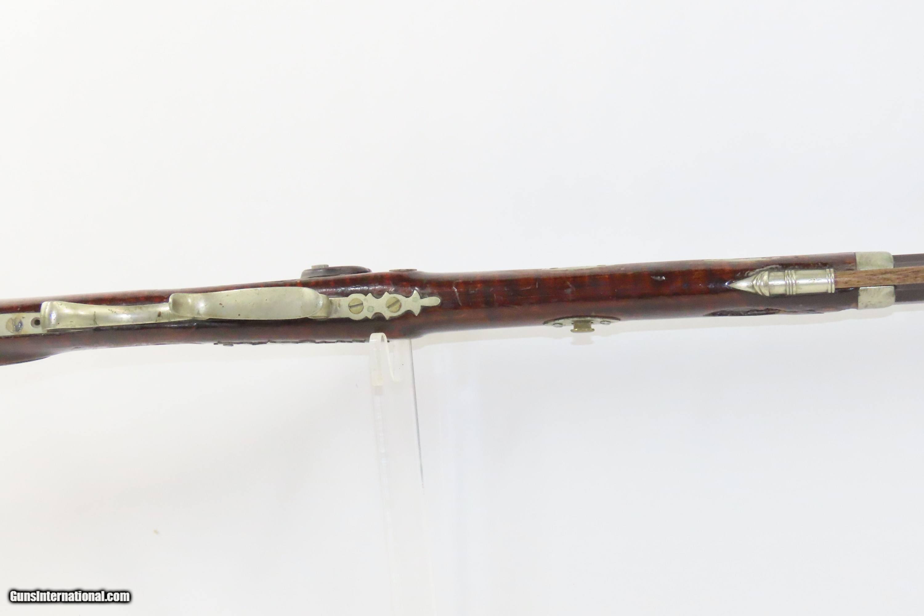Description: SILVER INLAID Antique Half Stock BACK ACTION .42 Perc. AMERICAN Long Rifle Mid-1800s HOMESTEAD/HUNTING Rifle Here we present an antique Back Action Half Stock American Percussion Long Rifle, made circa the mid-19th Century. Its stout octagonal barrel is in .42 caliber, large enough to take small to medium sized game or to defend the homestead against unwanted aggression. Rifle manufacture in the mid-to-late 19th Century was rapidly changing over from thousands of craftsmen all over the United States and on the Frontier making and selling their wares, to the large factories with standardized assembly lines and modern manufacturing techniques. Many makers’ names of the so-called Kentucky long rifles have been lost over time. This rifle is one such example. The American Long Rifle, more commonly, but less correctly, known as the ‘Kentucky rifle’, was described by Captain John G. W. Dillin in the dedication to his seminal 1924 book, The Kentucky Rifle: “From a flat bar of soft iron, hand forged into a gun barrel; laboriously bored and rifled with crude tools; fitted with a stock hewn from a maple tree in the neighboring forest; and supplied with a lock hammered to shape on the anvil; an unknown smith, in a shop long since silent, fashioned a rifle which changed the whole course of world history; made possible the settlement of a continent; and ultimately freed our country of foreign domination. Light in weight; graceful in line; economical in consumption of powder and lead; fatally precise; distinctly American; it sprang into immediate popularity; and for a hundred years was a model often slightly varied but never radically changed.” These locks were called “back action” because the mainspring hangs behind the tumbler. The back action is often used in single and double rifles, and occasionally in single barrel shotguns where the need for strength requires as little steel as possible be removed from the bar of the action. The overall condition is good. Strong action with fully functioning set trigger. Good bore. This example sports a solid stock and has been lightly refinished. Original, brown barrel patina. Own the original! This is a legitimate antique and not a reproduction. Barrel is 37 inches. Caliber: .42 Percussion Overall condition as seen in photos. Very Fast. Very Safe. FREE SHIPPING WORLDWIDE. Delivered directly to your door by express mail! Guaranteed AUTHENTIC & Includes CERTIFICATE OF AUTHENTICITY. ancestryguns $1850 #233521 SOLD Antique: Yes |