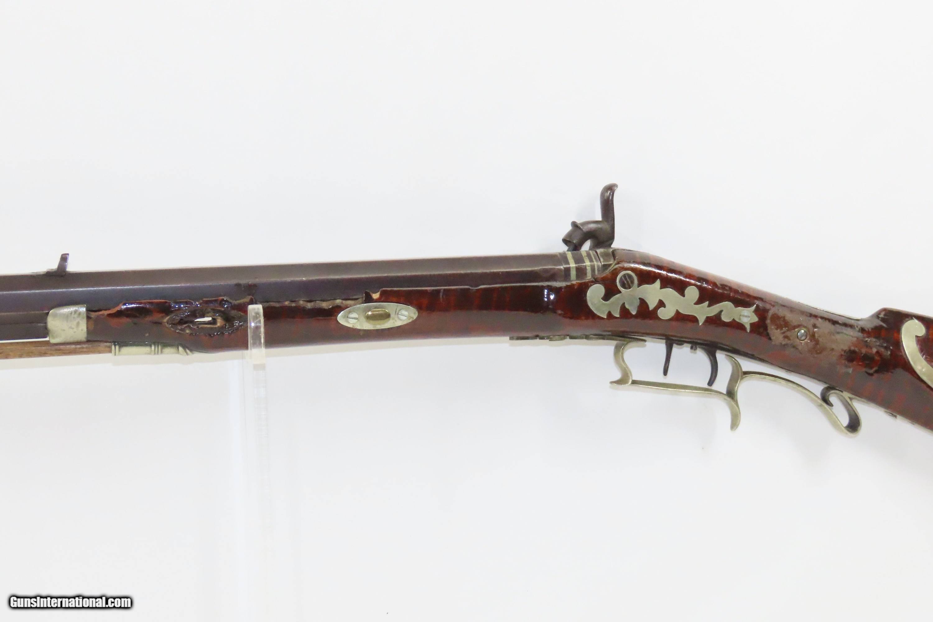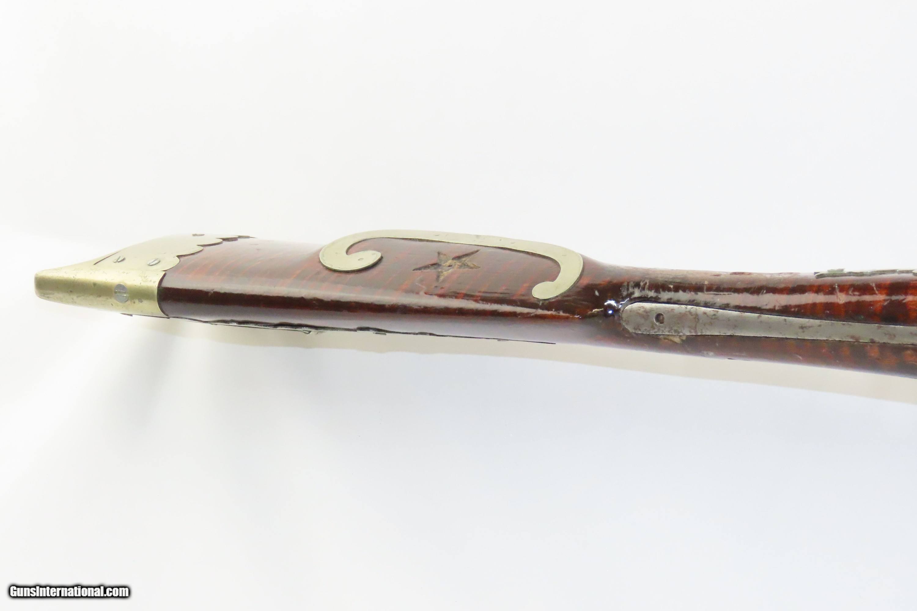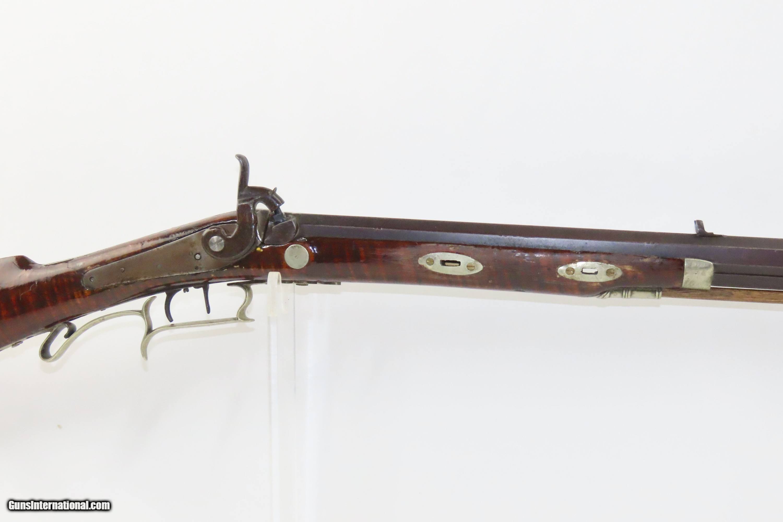 Description: SILVER INLAID Antique Half Stock BACK ACTION .42 Perc. AMERICAN Long Rifle Mid-1800s HOMESTEAD/HUNTING Rifle Here we present an antique Back Action Half Stock American Percussion Long Rifle, made circa the mid-19th Century. Its stout octagonal barrel is in .42 caliber, large enough to take small to medium sized game or to defend the homestead against unwanted aggression. Rifle manufacture in the mid-to-late 19th Century was rapidly changing over from thousands of craftsmen all over the United States and on the Frontier making and selling their wares, to the large factories with standardized assembly lines and modern manufacturing techniques. Many makers’ names of the so-called Kentucky long rifles have been lost over time. This rifle is one such example. The American Long Rifle, more commonly, but less correctly, known as the ‘Kentucky rifle’, was described by Captain John G. W. Dillin in the dedication to his seminal 1924 book, The Kentucky Rifle: “From a flat bar of soft iron, hand forged into a gun barrel; laboriously bored and rifled with crude tools; fitted with a stock hewn from a maple tree in the neighboring forest; and supplied with a lock hammered to shape on the anvil; an unknown smith, in a shop long since silent, fashioned a rifle which changed the whole course of world history; made possible the settlement of a continent; and ultimately freed our country of foreign domination. Light in weight; graceful in line; economical in consumption of powder and lead; fatally precise; distinctly American; it sprang into immediate popularity; and for a hundred years was a model often slightly varied but never radically changed.” These locks were called “back action” because the mainspring hangs behind the tumbler. The back action is often used in single and double rifles, and occasionally in single barrel shotguns where the need for strength requires as little steel as possible be removed from the bar of the action. The overall condition is good. Strong action with fully functioning set trigger. Good bore. This example sports a solid stock and has been lightly refinished. Original, brown barrel patina. Own the original! This is a legitimate antique and not a reproduction. Barrel is 37 inches. Caliber: .42 Percussion Overall condition as seen in photos. Very Fast. Very Safe. FREE SHIPPING WORLDWIDE. Delivered directly to your door by express mail! Guaranteed AUTHENTIC & Includes CERTIFICATE OF AUTHENTICITY. ancestryguns $1850 #233521 SOLD Antique: Yes |