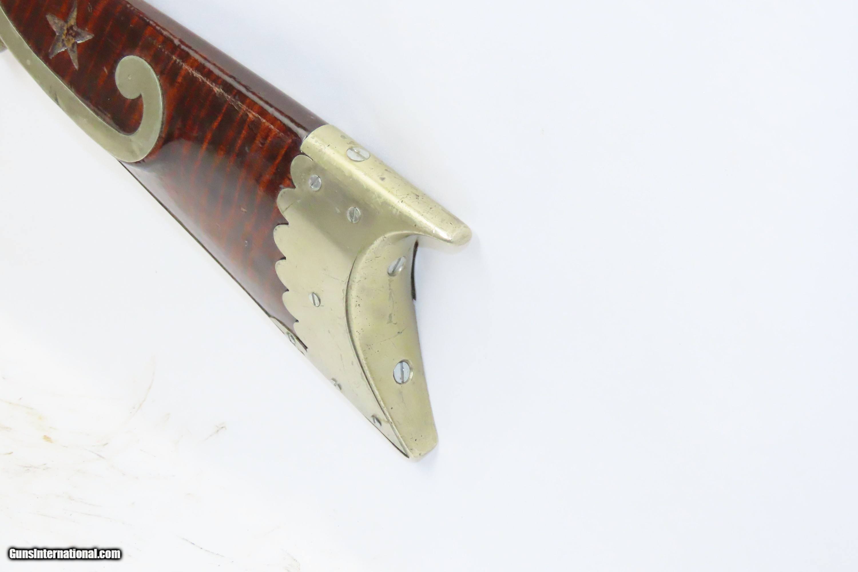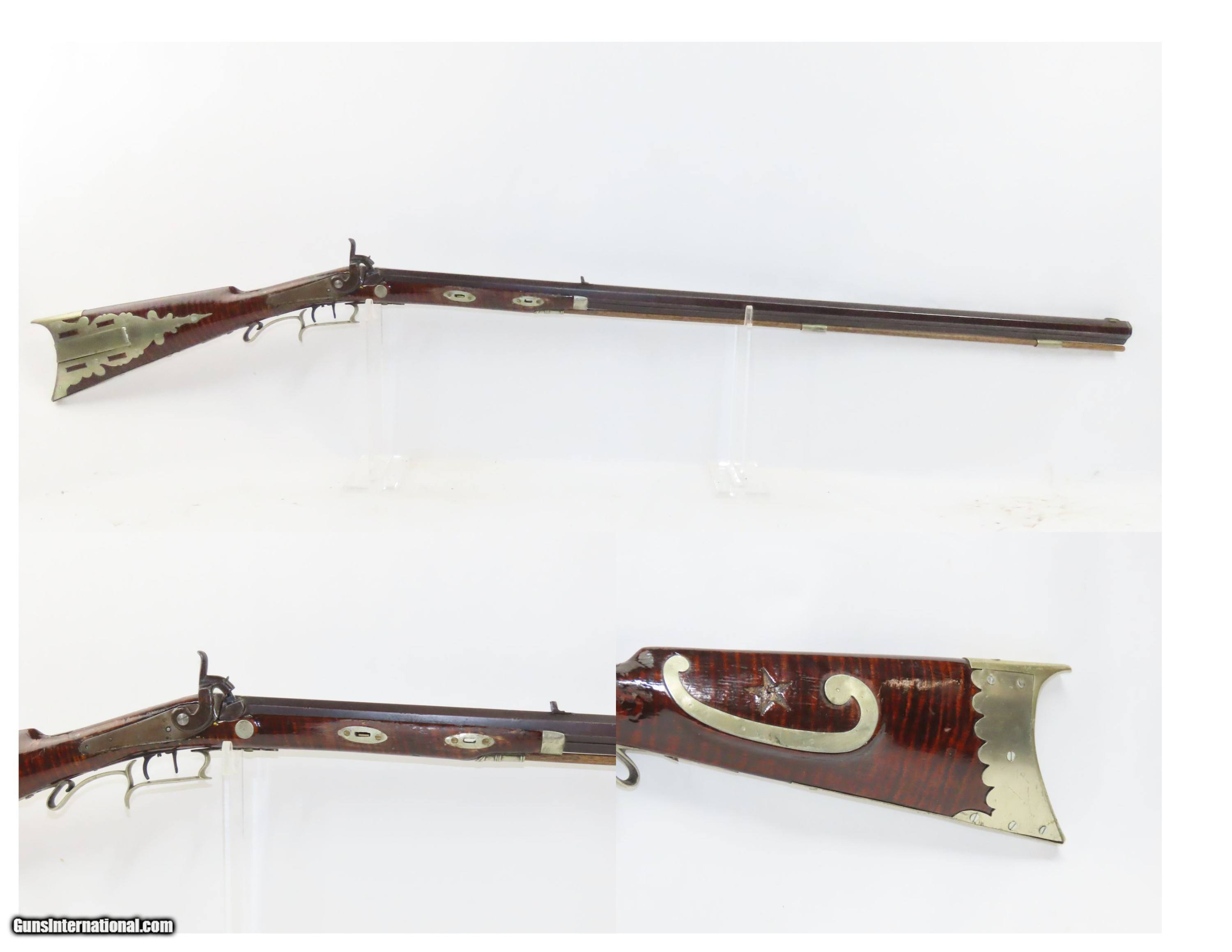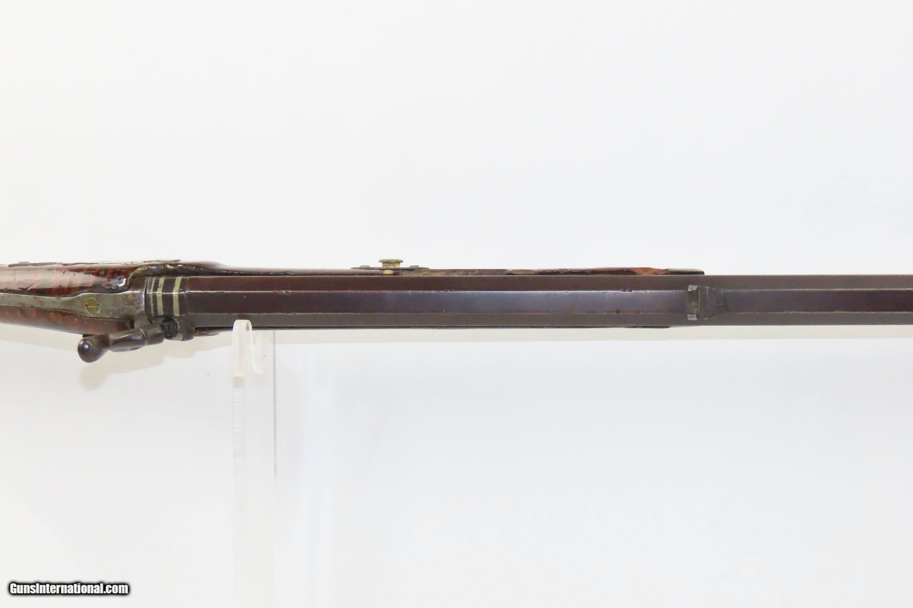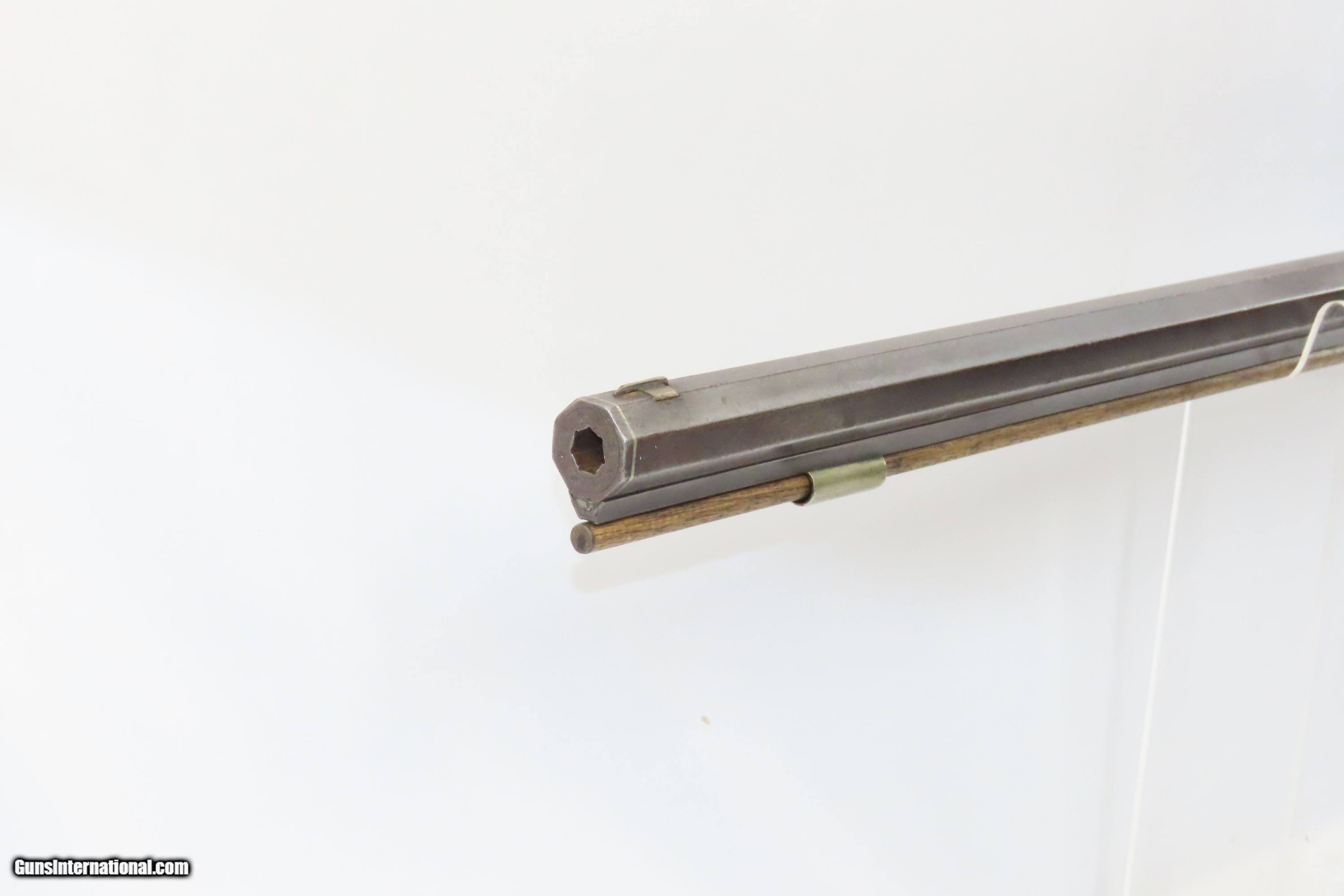 Description: SILVER INLAID Antique Half Stock BACK ACTION .42 Perc. AMERICAN Long Rifle Mid-1800s HOMESTEAD/HUNTING Rifle Here we present an antique Back Action Half Stock American Percussion Long Rifle, made circa the mid-19th Century. Its stout octagonal barrel is in .42 caliber, large enough to take small to medium sized game or to defend the homestead against unwanted aggression. Rifle manufacture in the mid-to-late 19th Century was rapidly changing over from thousands of craftsmen all over the United States and on the Frontier making and selling their wares, to the large factories with standardized assembly lines and modern manufacturing techniques. Many makers’ names of the so-called Kentucky long rifles have been lost over time. This rifle is one such example. The American Long Rifle, more commonly, but less correctly, known as the ‘Kentucky rifle’, was described by Captain John G. W. Dillin in the dedication to his seminal 1924 book, The Kentucky Rifle: “From a flat bar of soft iron, hand forged into a gun barrel; laboriously bored and rifled with crude tools; fitted with a stock hewn from a maple tree in the neighboring forest; and supplied with a lock hammered to shape on the anvil; an unknown smith, in a shop long since silent, fashioned a rifle which changed the whole course of world history; made possible the settlement of a continent; and ultimately freed our country of foreign domination. Light in weight; graceful in line; economical in consumption of powder and lead; fatally precise; distinctly American; it sprang into immediate popularity; and for a hundred years was a model often slightly varied but never radically changed.” These locks were called “back action” because the mainspring hangs behind the tumbler. The back action is often used in single and double rifles, and occasionally in single barrel shotguns where the need for strength requires as little steel as possible be removed from the bar of the action. The overall condition is good. Strong action with fully functioning set trigger. Good bore. This example sports a solid stock and has been lightly refinished. Original, brown barrel patina. Own the original! This is a legitimate antique and not a reproduction. Barrel is 37 inches. Caliber: .42 Percussion Overall condition as seen in photos. Very Fast. Very Safe. FREE SHIPPING WORLDWIDE. Delivered directly to your door by express mail! Guaranteed AUTHENTIC & Includes CERTIFICATE OF AUTHENTICITY. ancestryguns $1850 #233521 SOLD Antique: Yes |