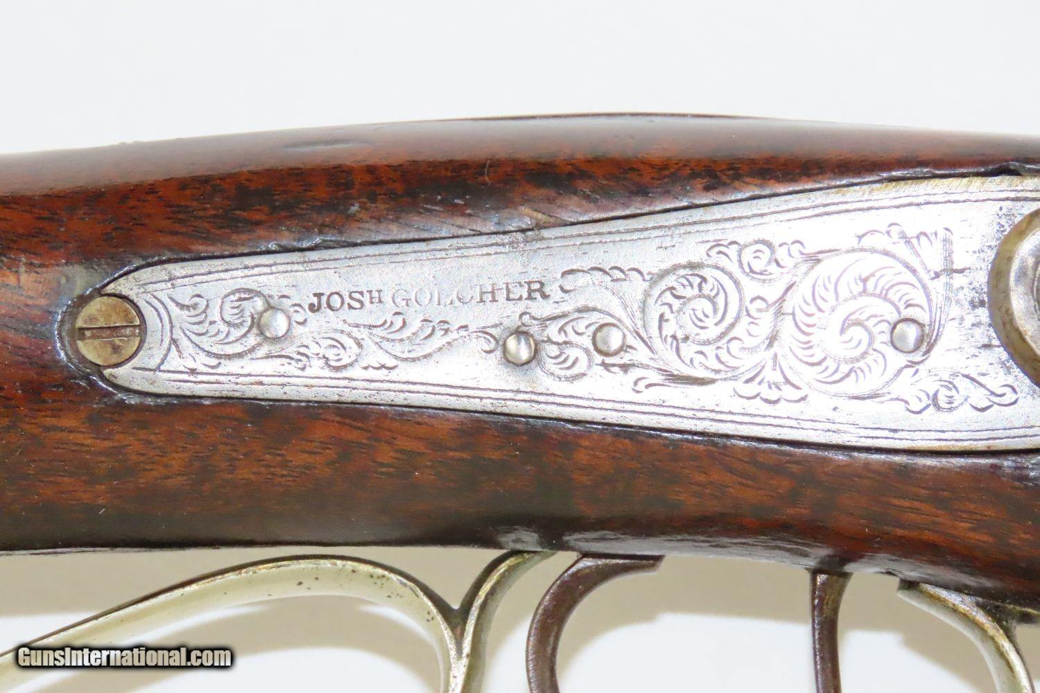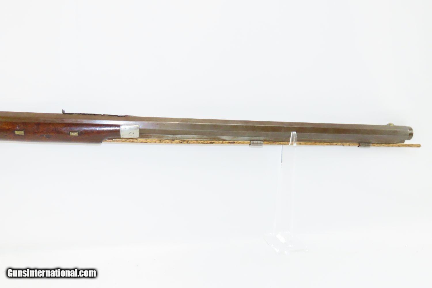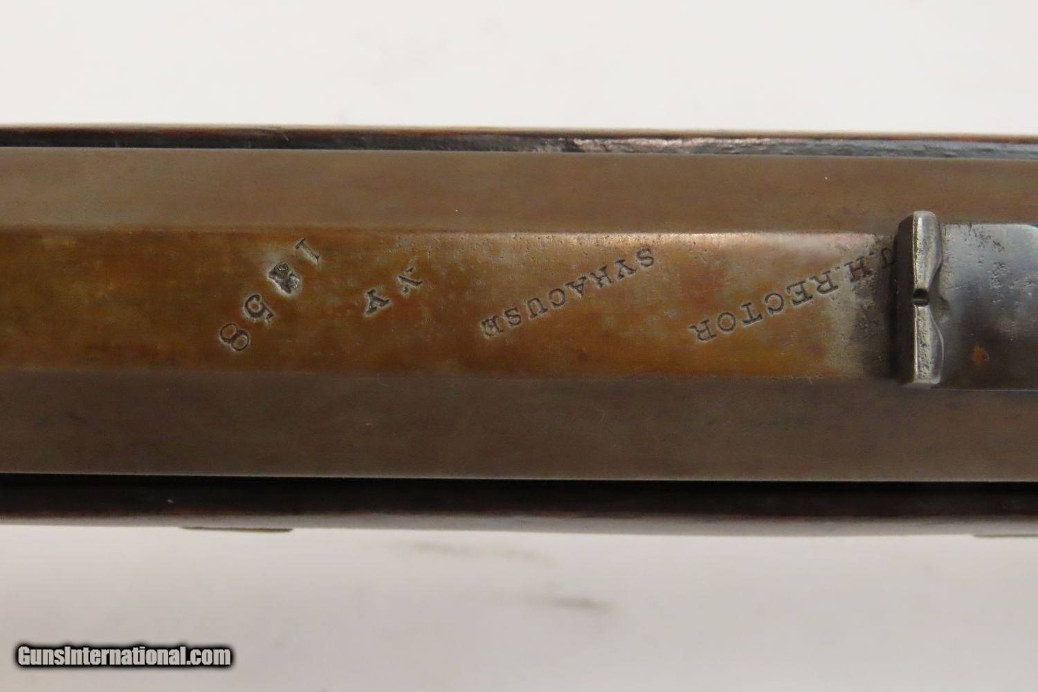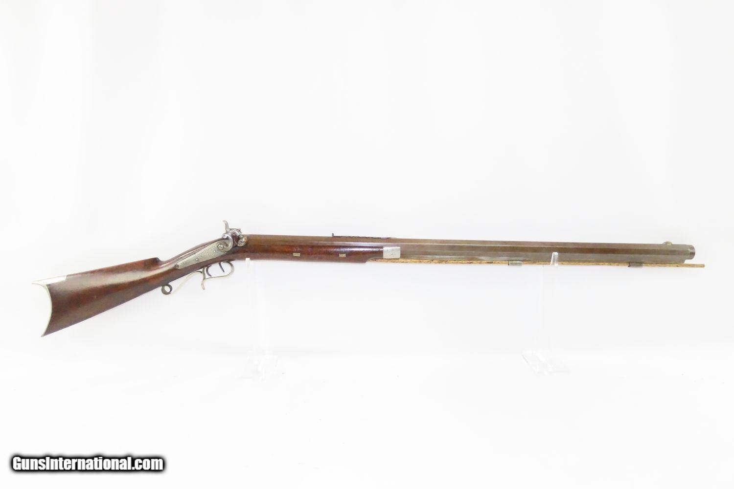 Description: SYRACUSE, NY Antique J.H. RECTOR Half-Stock BACK ACTION .41 Caliber RIFLE NEW YORK Long Rifle Made Circa the 1840s Here we present an antique J.H. Rector Half Stock Percussion Target Rifle, made circa 1858 by John H. Rector. John Rector was a local gunsmith in Syracuse, NY who produced high quality firearms from the 1830’s through the 1860’s. Rector’s specialty was heavy percussion target rifles and somewhat lighter plains rifles for westward expansion. A historical directory from 1850 shows that his gun making business was located on Water Street in Syracuse. This rifle features a heavy octagonal barrel in .41 caliber. “J. H. RECTOR SYRACUSE NY 1858” is engraved on the top flat. “JOSH GOLCHER” is marked on the lock. It has scroll engravings on the breech and tang. German silver décor. Double set triggers. There is a threaded aperture for a tang-mounted rear aperture sight. About 12 pounds, 15 ounces. This is a very nice target rifle from a well-known New York State gun maker! The overall condition is very good. The action is strong. The small adjustment screw for the set trigger is absent. The bore is dark gray with good rifling. A very nice, heavy New York target rifle from the mid-19th Century! Own the original! This is a legitimate antique and not a reproduction. Barrel is 33-3/4 inches. Caliber: .41 Overall condition as seen in photos. Very Fast. Very Safe. FREE SHIPPING WORLDWIDE. Delivered directly to your door by express mail! Guaranteed AUTHENTIC & Includes CERTIFICATE OF AUTHENTICITY. ancestryguns $1495 #20326 SOLD Antique: Yes |