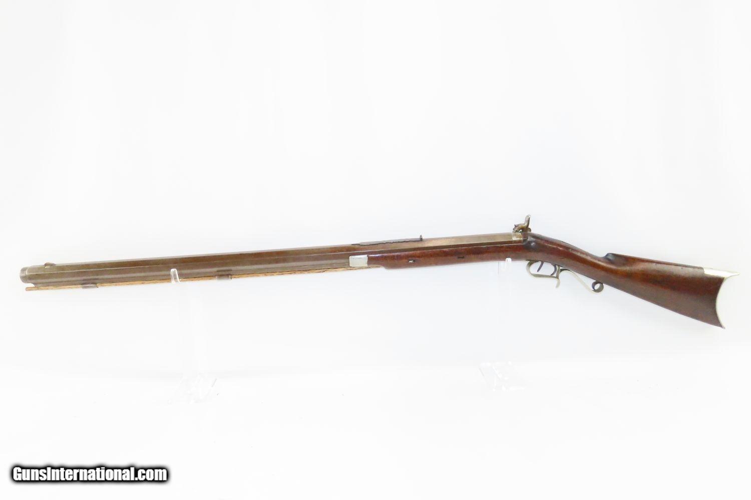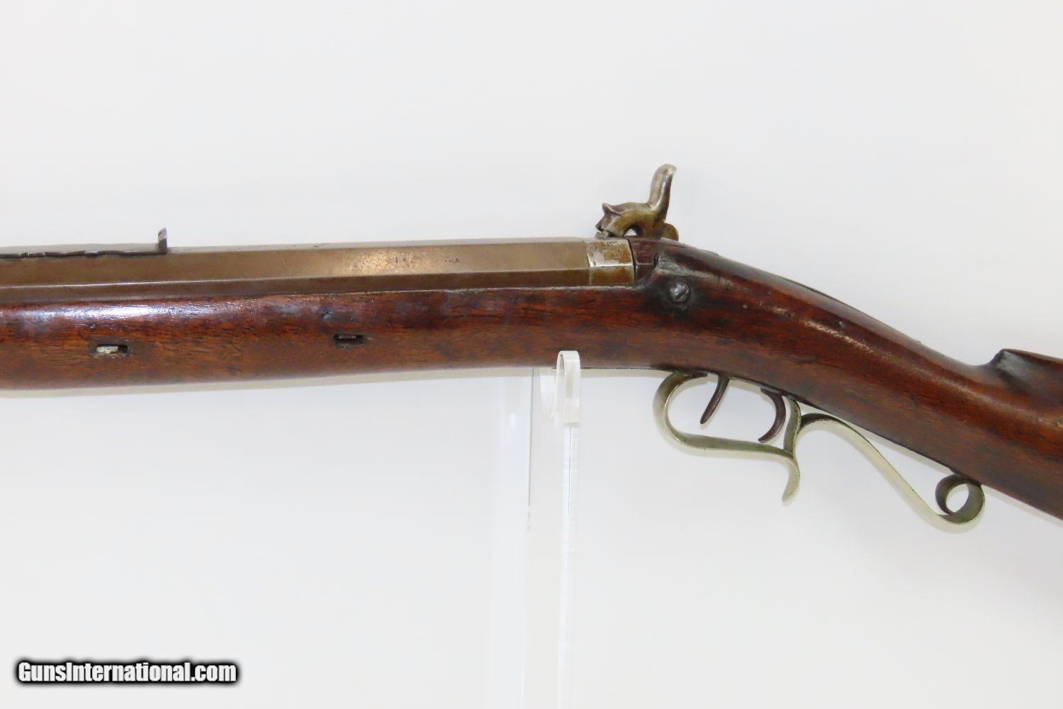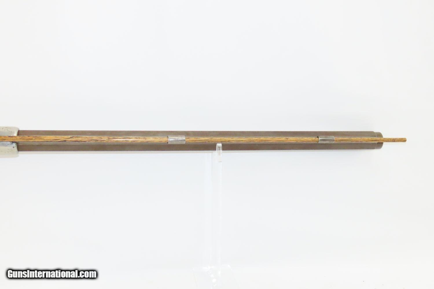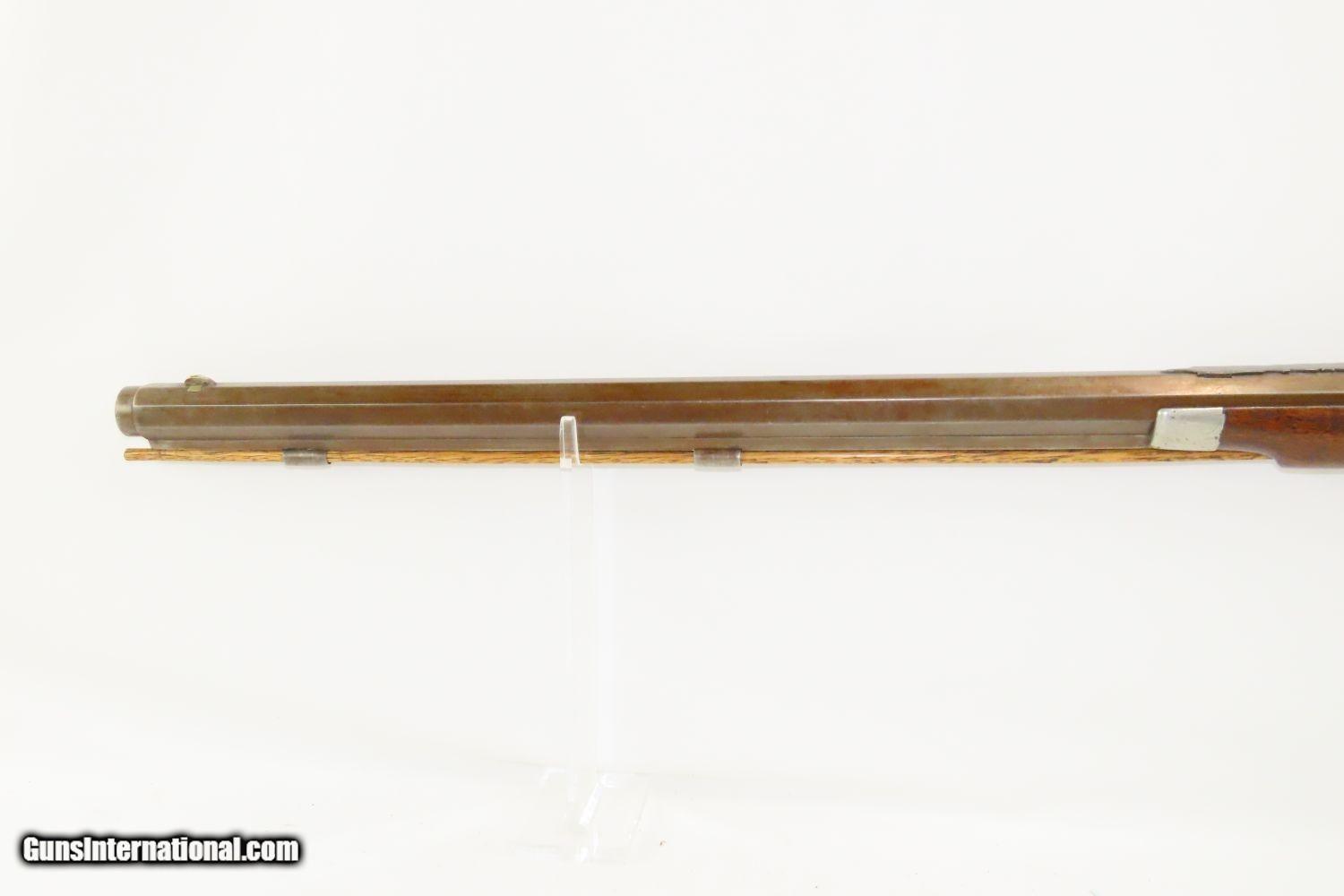 Description: SYRACUSE, NY Antique J.H. RECTOR Half-Stock BACK ACTION .41 Caliber RIFLE NEW YORK Long Rifle Made Circa the 1840s Here we present an antique J.H. Rector Half Stock Percussion Target Rifle, made circa 1858 by John H. Rector. John Rector was a local gunsmith in Syracuse, NY who produced high quality firearms from the 1830’s through the 1860’s. Rector’s specialty was heavy percussion target rifles and somewhat lighter plains rifles for westward expansion. A historical directory from 1850 shows that his gun making business was located on Water Street in Syracuse. This rifle features a heavy octagonal barrel in .41 caliber. “J. H. RECTOR SYRACUSE NY 1858” is engraved on the top flat. “JOSH GOLCHER” is marked on the lock. It has scroll engravings on the breech and tang. German silver décor. Double set triggers. There is a threaded aperture for a tang-mounted rear aperture sight. About 12 pounds, 15 ounces. This is a very nice target rifle from a well-known New York State gun maker! The overall condition is very good. The action is strong. The small adjustment screw for the set trigger is absent. The bore is dark gray with good rifling. A very nice, heavy New York target rifle from the mid-19th Century! Own the original! This is a legitimate antique and not a reproduction. Barrel is 33-3/4 inches. Caliber: .41 Overall condition as seen in photos. Very Fast. Very Safe. FREE SHIPPING WORLDWIDE. Delivered directly to your door by express mail! Guaranteed AUTHENTIC & Includes CERTIFICATE OF AUTHENTICITY. ancestryguns $1495 #20326 SOLD Antique: Yes |