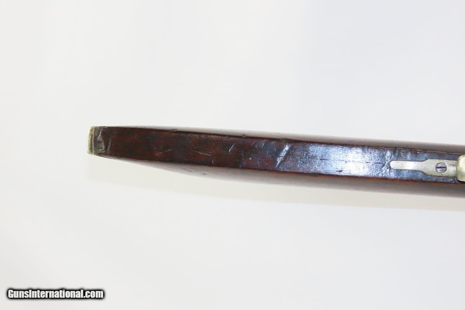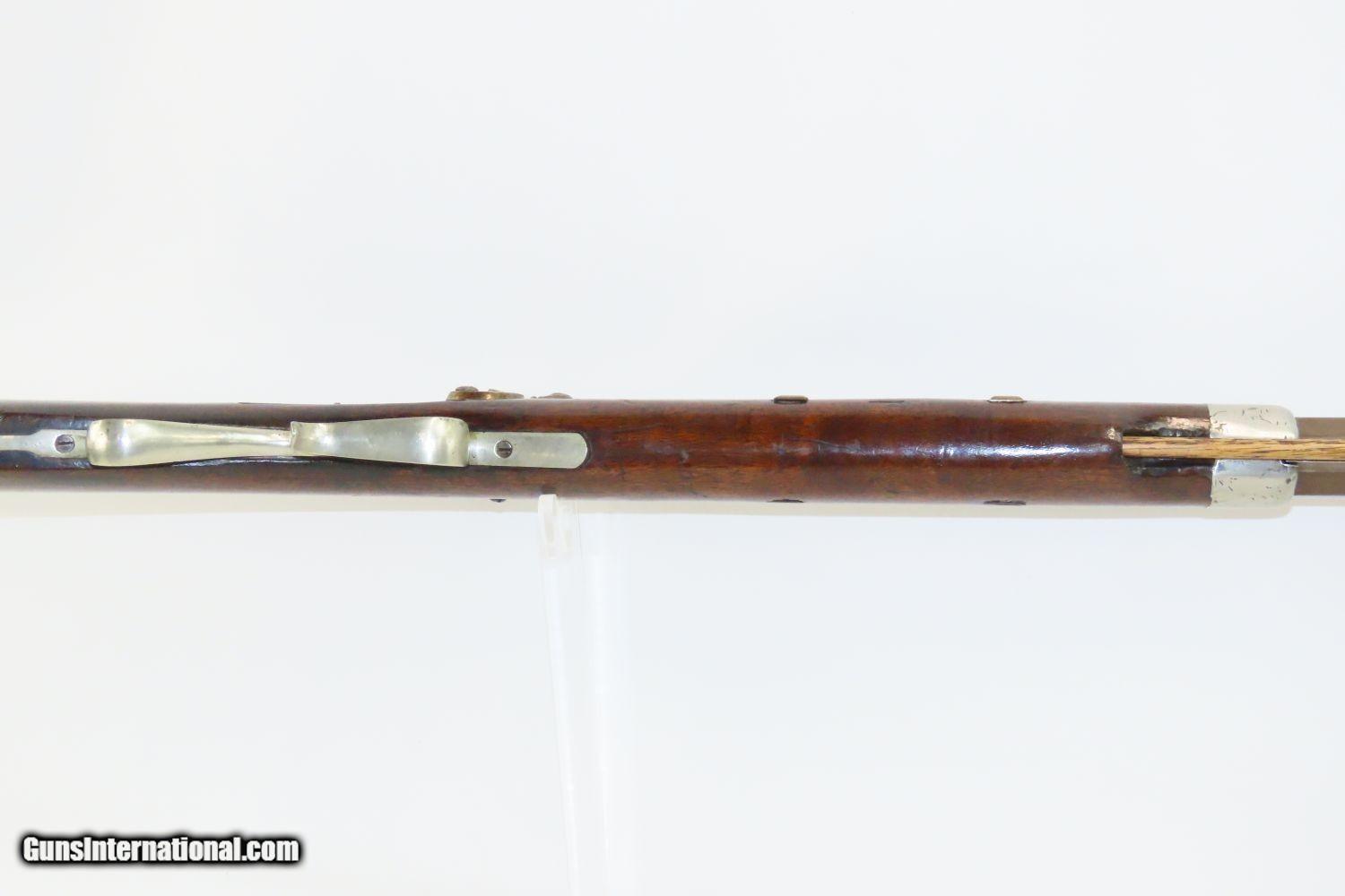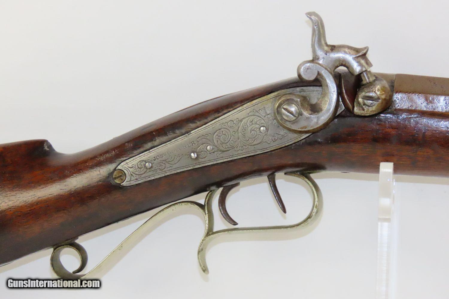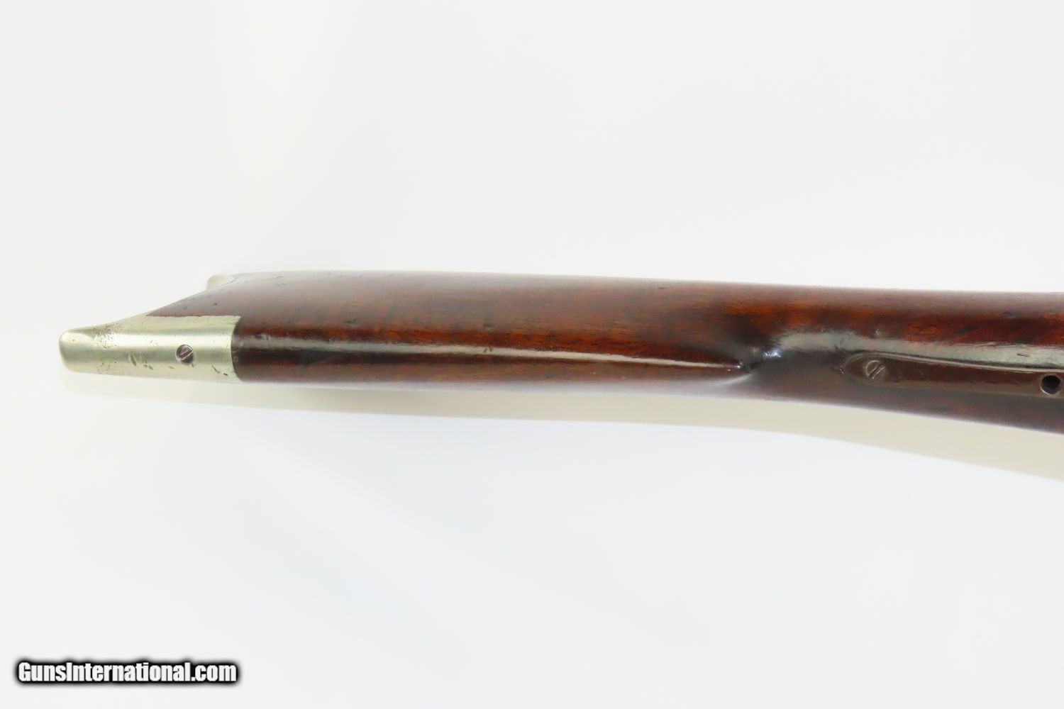 Description: SYRACUSE, NY Antique J.H. RECTOR Half-Stock BACK ACTION .41 Caliber RIFLE NEW YORK Long Rifle Made Circa the 1840s Here we present an antique J.H. Rector Half Stock Percussion Target Rifle, made circa 1858 by John H. Rector. John Rector was a local gunsmith in Syracuse, NY who produced high quality firearms from the 1830’s through the 1860’s. Rector’s specialty was heavy percussion target rifles and somewhat lighter plains rifles for westward expansion. A historical directory from 1850 shows that his gun making business was located on Water Street in Syracuse. This rifle features a heavy octagonal barrel in .41 caliber. “J. H. RECTOR SYRACUSE NY 1858” is engraved on the top flat. “JOSH GOLCHER” is marked on the lock. It has scroll engravings on the breech and tang. German silver décor. Double set triggers. There is a threaded aperture for a tang-mounted rear aperture sight. About 12 pounds, 15 ounces. This is a very nice target rifle from a well-known New York State gun maker! The overall condition is very good. The action is strong. The small adjustment screw for the set trigger is absent. The bore is dark gray with good rifling. A very nice, heavy New York target rifle from the mid-19th Century! Own the original! This is a legitimate antique and not a reproduction. Barrel is 33-3/4 inches. Caliber: .41 Overall condition as seen in photos. Very Fast. Very Safe. FREE SHIPPING WORLDWIDE. Delivered directly to your door by express mail! Guaranteed AUTHENTIC & Includes CERTIFICATE OF AUTHENTICITY. ancestryguns $1495 #20326 SOLD Antique: Yes |