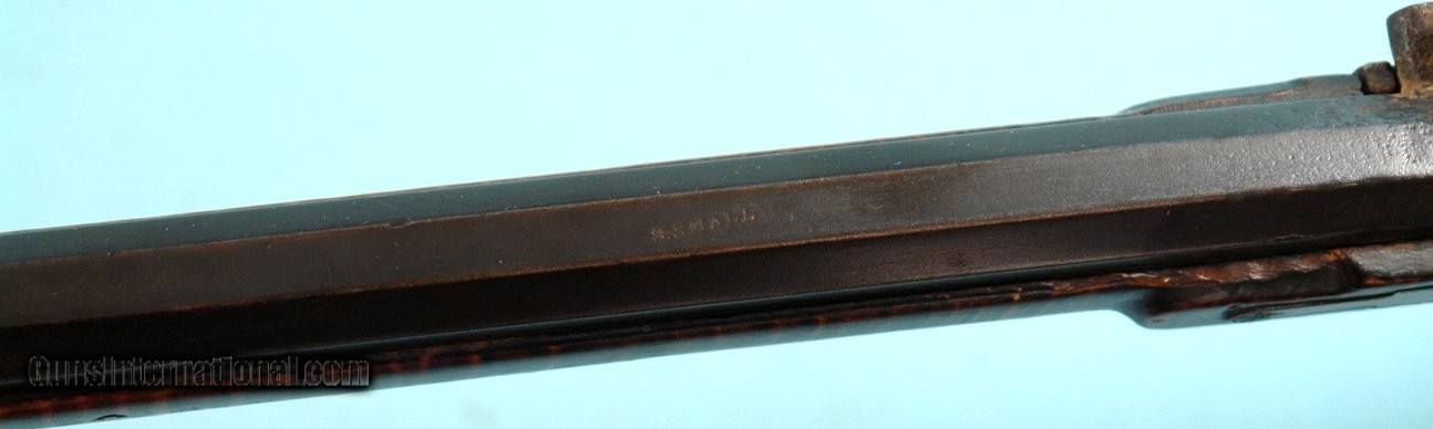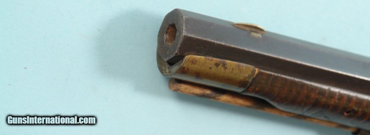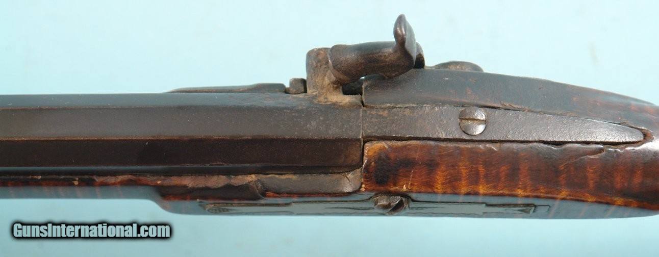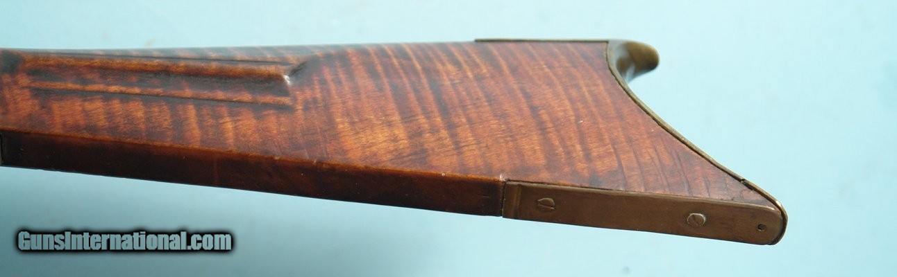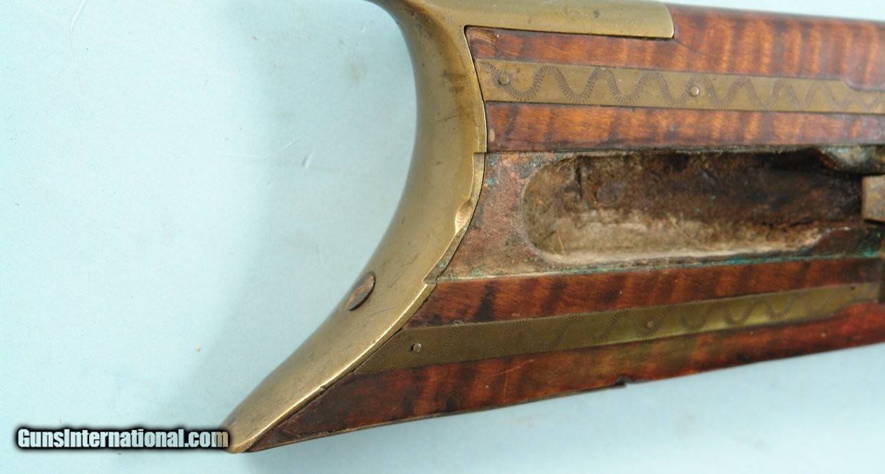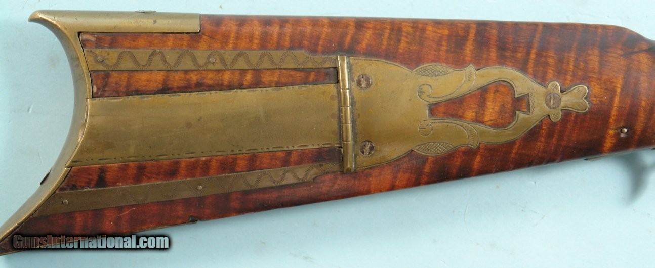 Description: VERY FINE COLUMBIANA COUNTY, OHIO TIGER MAPLE PERCUSSION LONGRIFLE BY SAMUEL SMALL CIRCA 1830’S. 56” o/a with 40” octagon rifled .42 caliber barrel stamped on the top flat in block letters “S. SMALL” who was from New Lisbon, Ohio which is on the northern border of Pennsylvania and exhibits many of the characteristics of Western Pennsylvania School rifles. Original front and rear sights. Highly figured tiger maple stock with brass mounts and very fine engraved brass patch box. Double set triggers. All original excellent condition with original brown and patina on barrel and all the original stock finish with nice handling patina. Very good bore and working order. Extra nice Ohio longrifle. SOLD Antique: Yes |