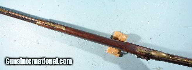 Description: WEST VIRGINIA PERCUSSION HALF STOCK RIFLE CIRCA 1850. .45 cal. rifled octagon 36” unsigned barrel. Cherry stock with brass mounts and patchbox with acorn patchbox. Distinctive brass “Keyhole” side plate and extended side plate and lock plate moldings on stock typical of West Virginia rifles of the period. “Acorn” finial patchbox also seen on many rifles from the area as well. Double set triggers and hickory ramrod. Original patina overall with lock and triggers in working order. Very good bore with good rifling. SOLD Antique: Yes |