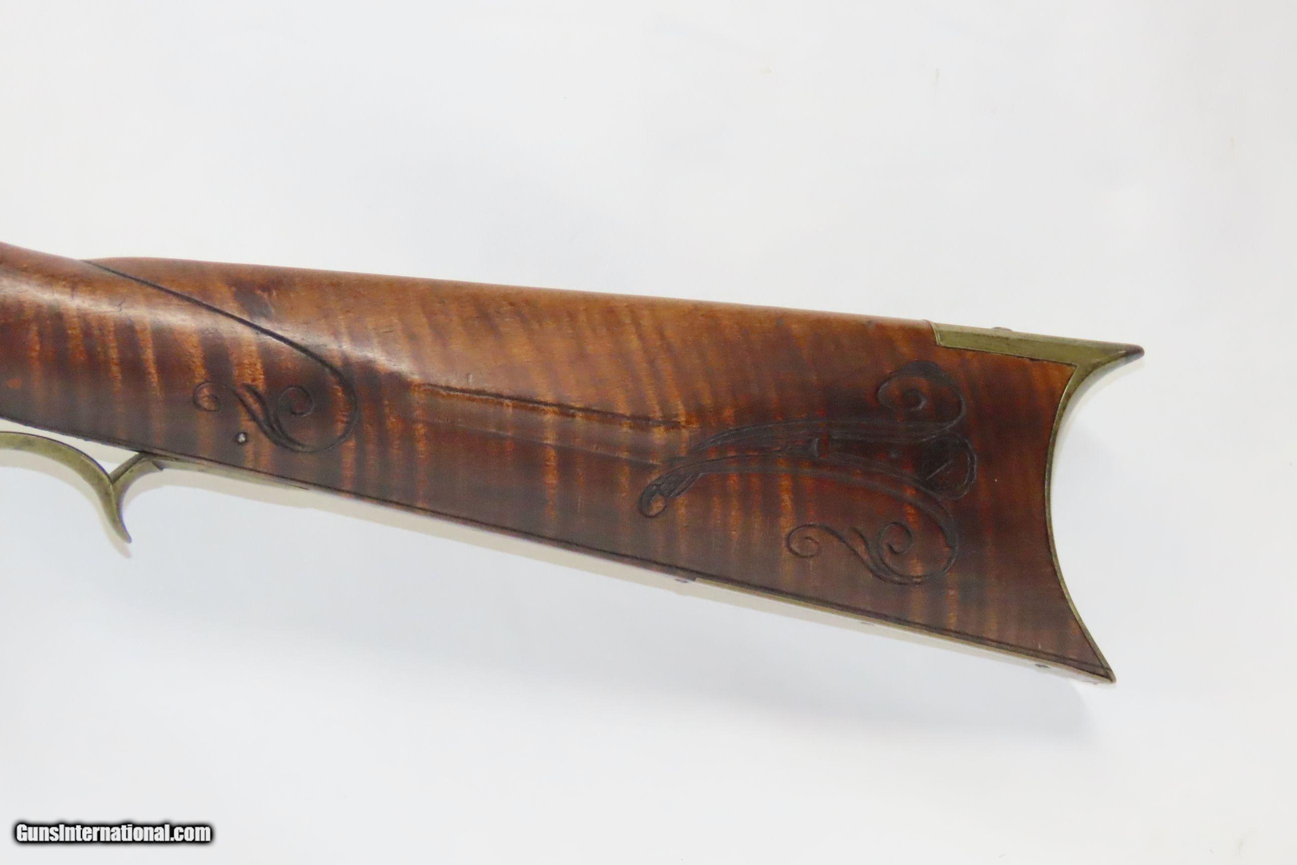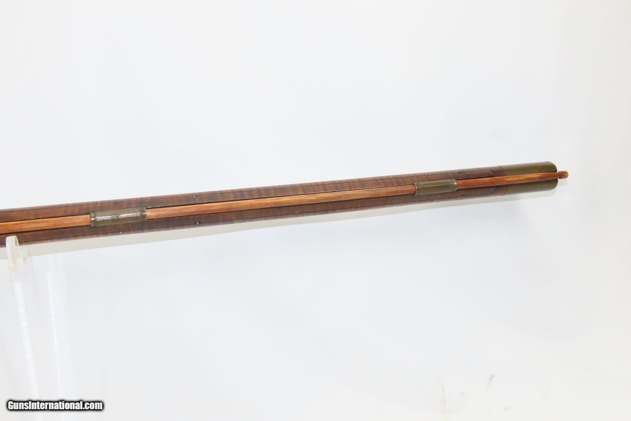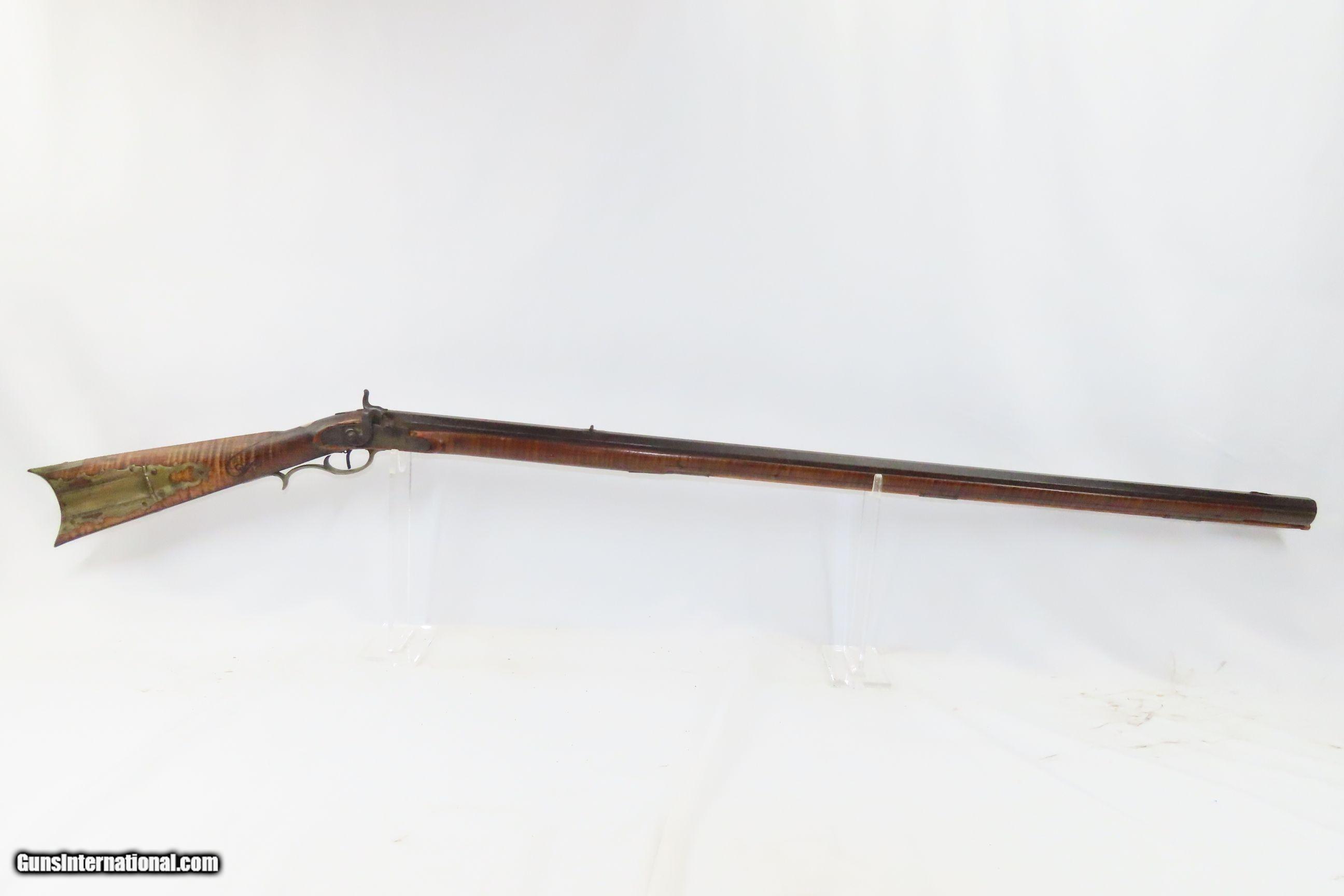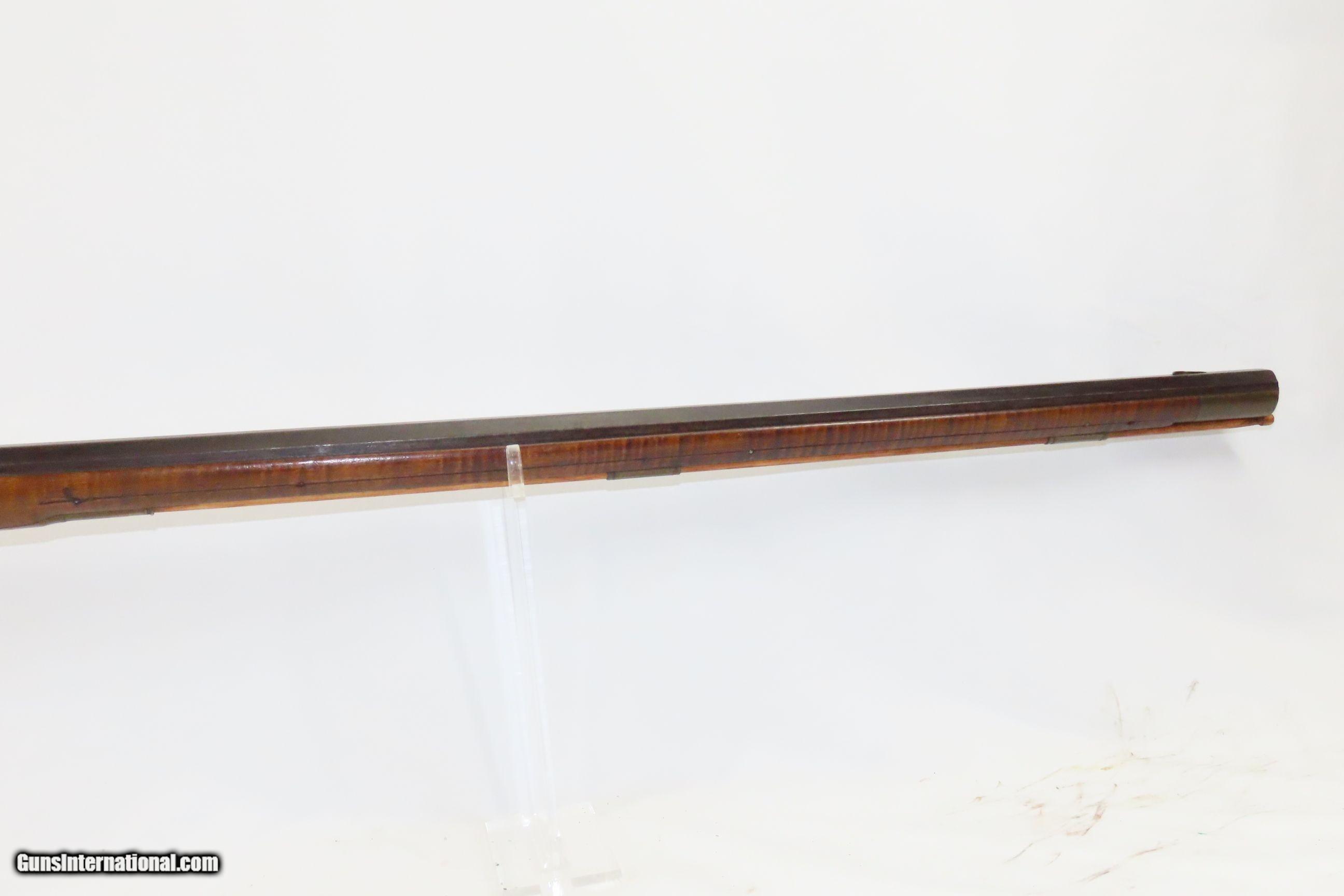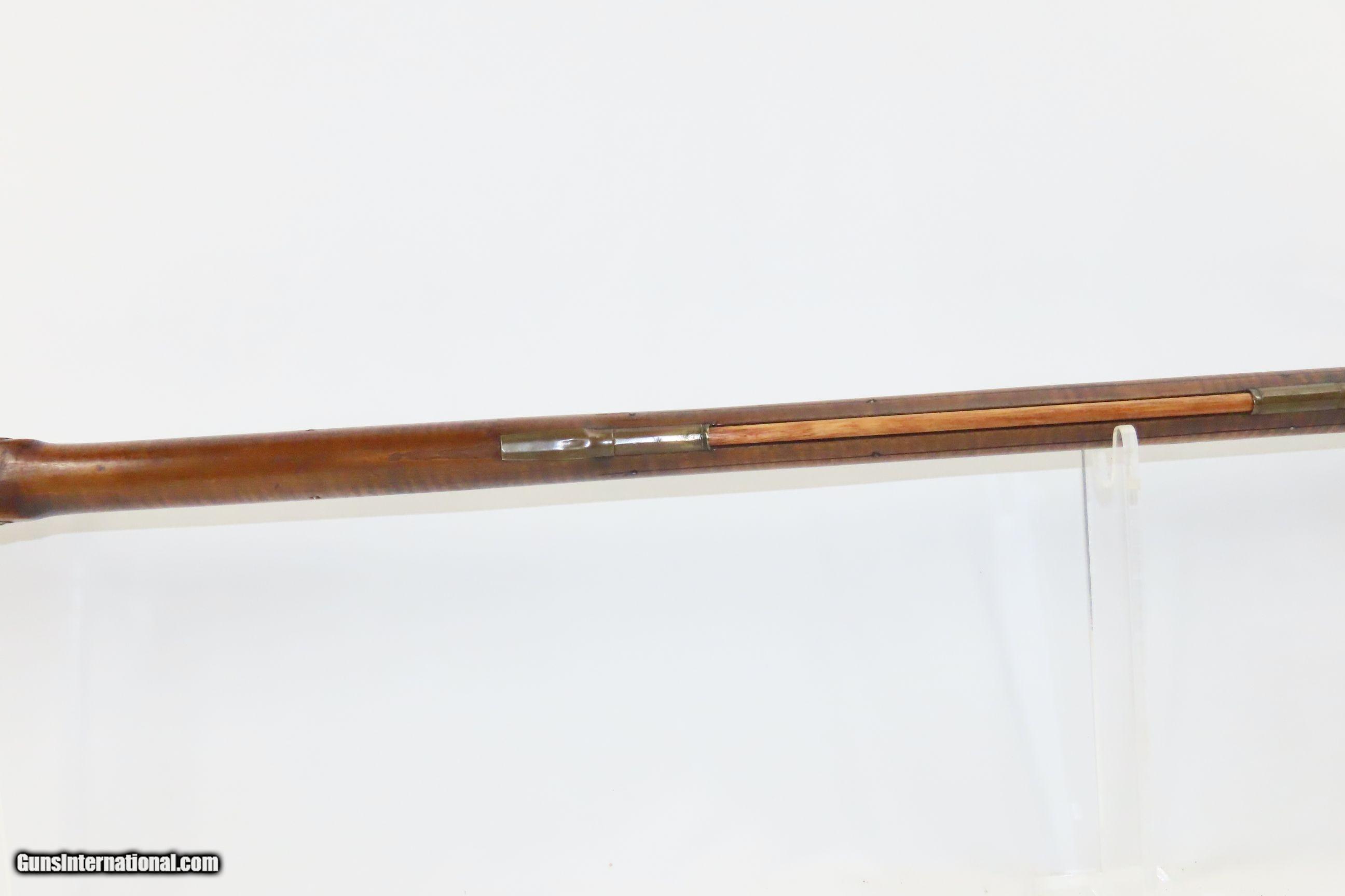 Description: WINCHESTER, VIRGINIA Long Rifle by J LAUCK .46 PIONEER HOMESTEAD VA Antique Shenandoah Valley, Frederick County Family of Makers Here we present an antique Long Rifle by Lauck, made circa the early-to-mid-1800s in Winchester, Virginia. The Lauck family produced multiple gunmakers in the Shenandoah Valley. Of the Lauck family of gunmakers, Gewirz lists Daniel, James, & Peter (1753), Simon (1795) Jacob (1816), John (1820), William (1840), and William P. (1850). The family were known for their choice of wood for their stocks, as well as the incised carving done, with “C scroll” typical of their work. Large, pierced brass patchboxes with a 4-petaled flower finial were another hallmark. According to the Preservation of Historic Winchester group, the house and smithy of Simon Lauck still stands on South Loudoun Street. Simon, along with his brothers Peter (he owned the Red Lion Tavern) & Abraham fought in the Revolutionary War under General Washington. Local tradition has it that they were part of Daniel Morgan’s honor guard and, having German as one of their languages, were able to translate between their officers and captured Hessian soldiers. Gluckman & Satterlee note that at least one Lauck made long rifle is known to have been used by a Confederate soldier during the American Civil War, and it is highly likely that many more were as well, given the prolificity of the family’s production and the geographical position of this gunmaking center of Virginia. The overall condition is very good. Original finish. The action is strong. The bore is dusty and untouched with thin rifling. The barrel is signed “J. Lauck” on the top flat. The full-length stock is solid with nice striped maple grain and bearing incised scrolls. Nice, large, pierced patchbox typical of the family. This is a wonderful example of a Shenandoah rifle and of the Lauck family’s work in particular. Own the original! This is a legitimate antique and not a reproduction. Barrel is 40-1/4 inches. Caliber: .46 Percussion Overall condition as seen in photos. Very Fast. Very Safe. FREE SHIPPING WORLDWIDE. Delivered directly to your door by express mail! Guaranteed AUTHENTIC & Includes CERTIFICATE OF AUTHENTICITY. ancestryguns $4400 #230021 SOLD Antique: Yes |