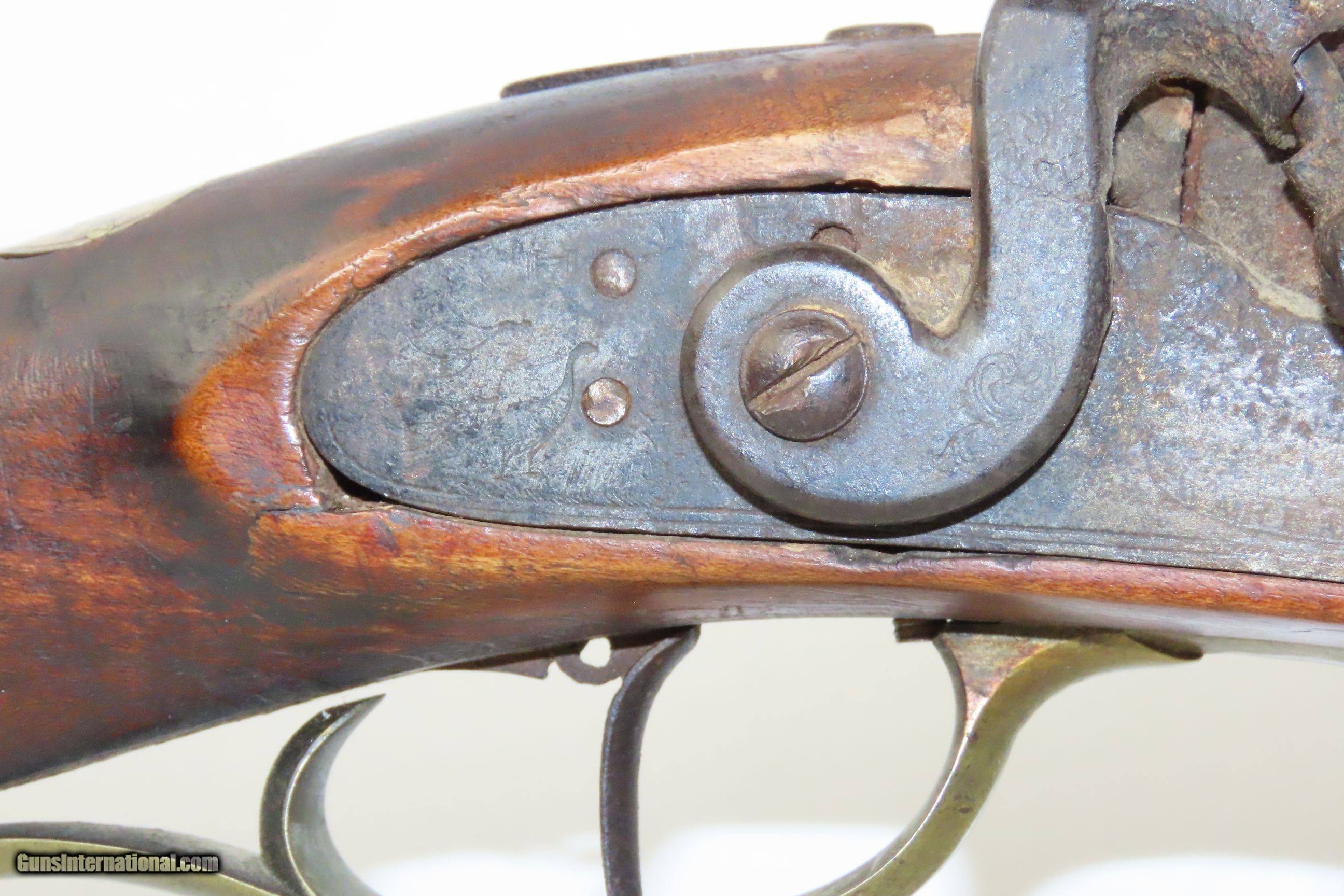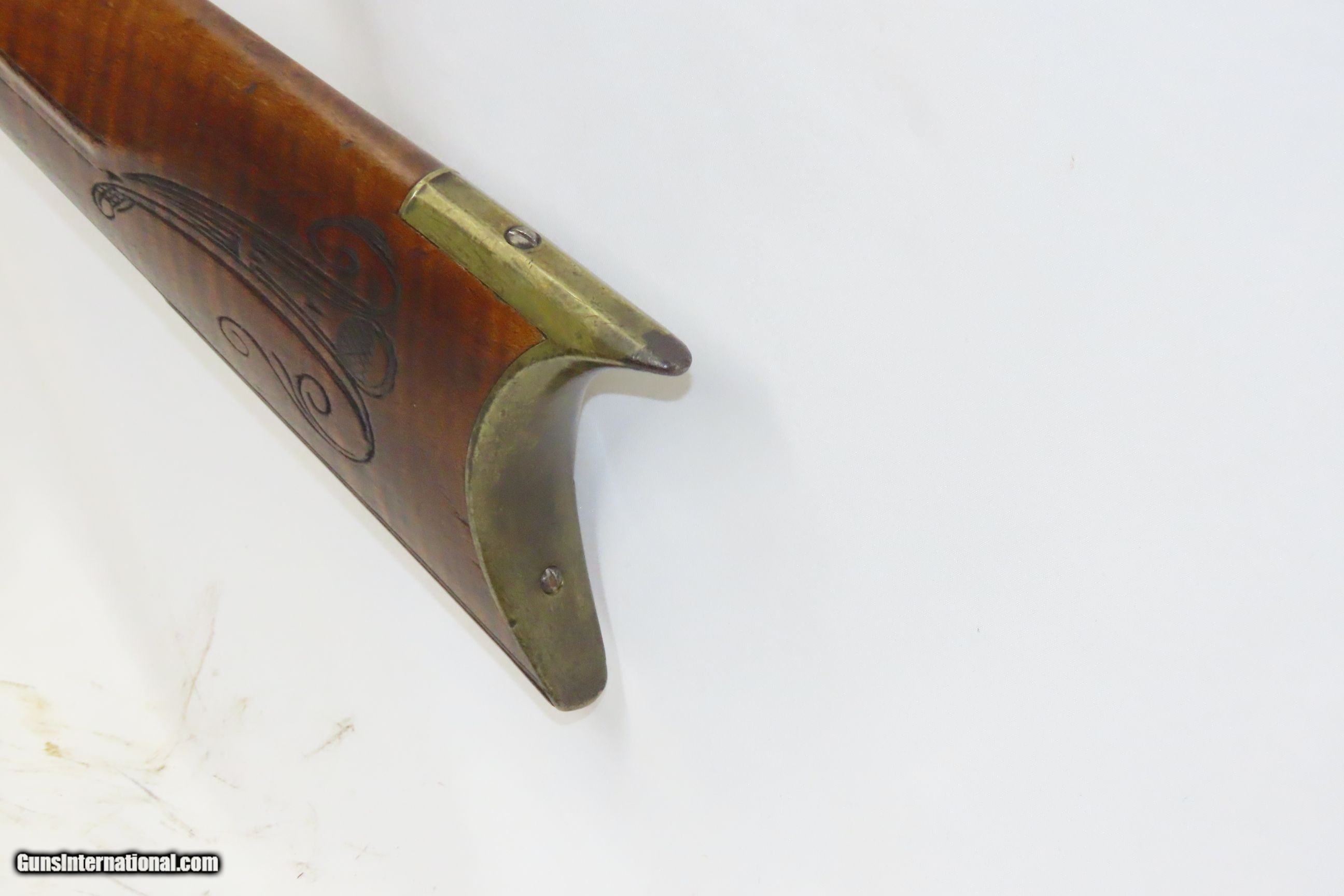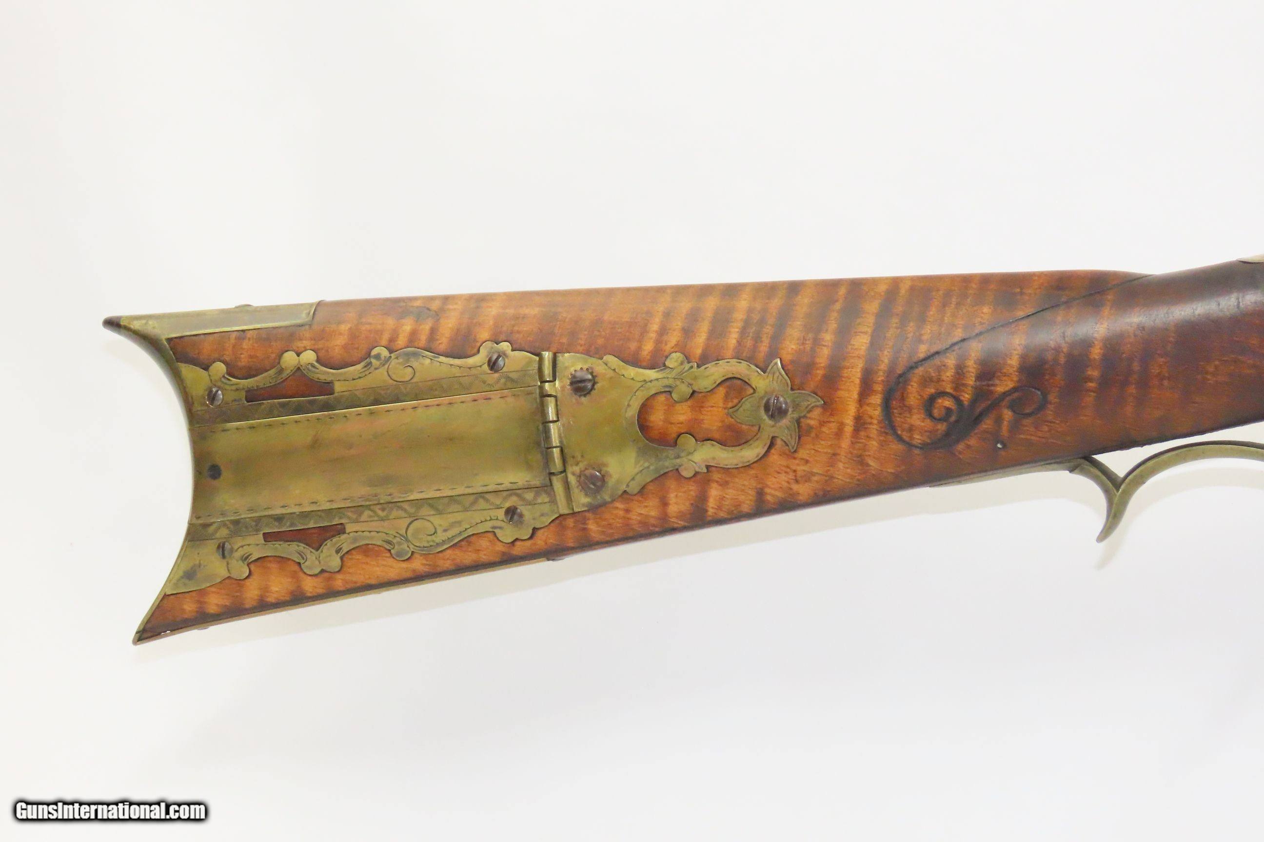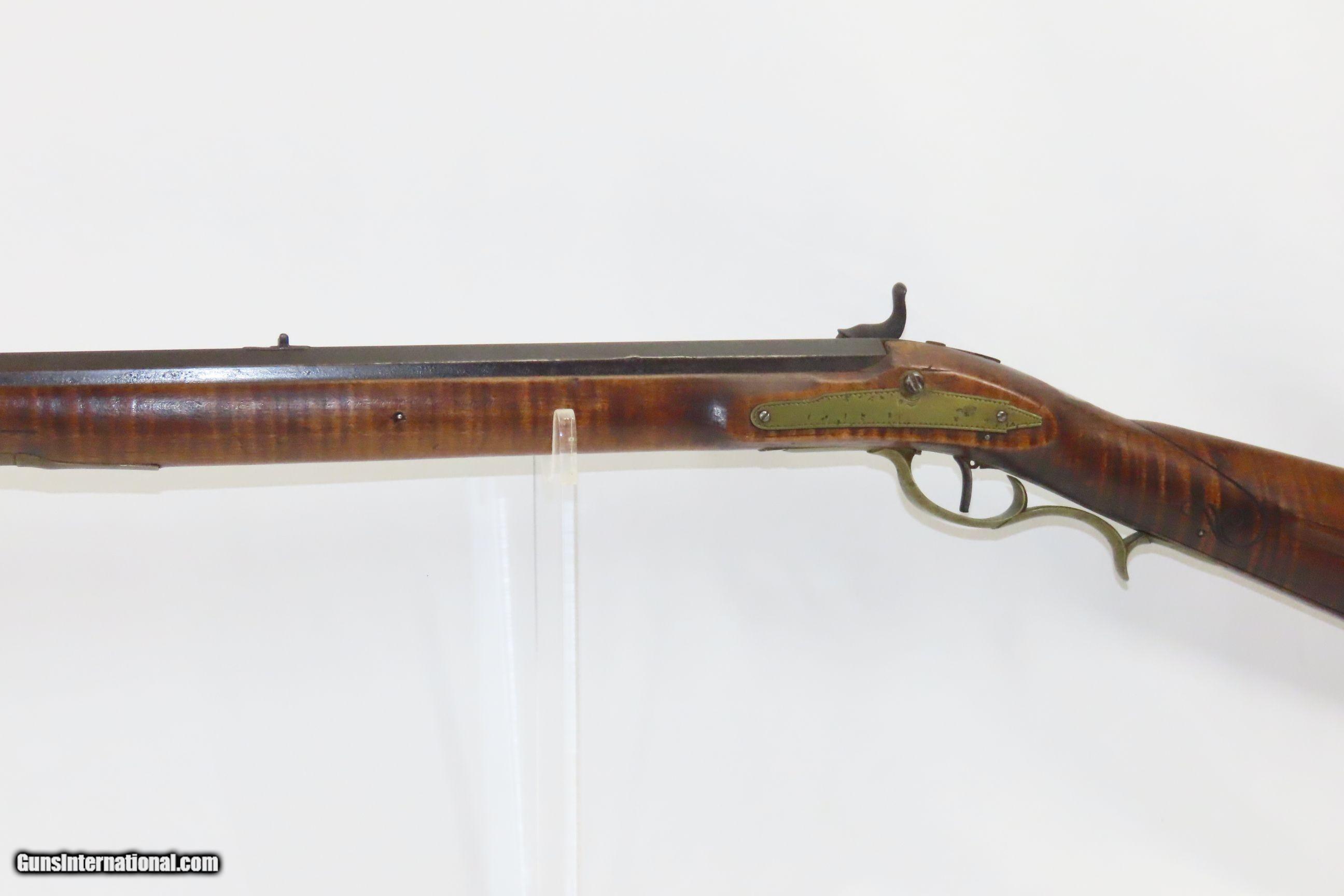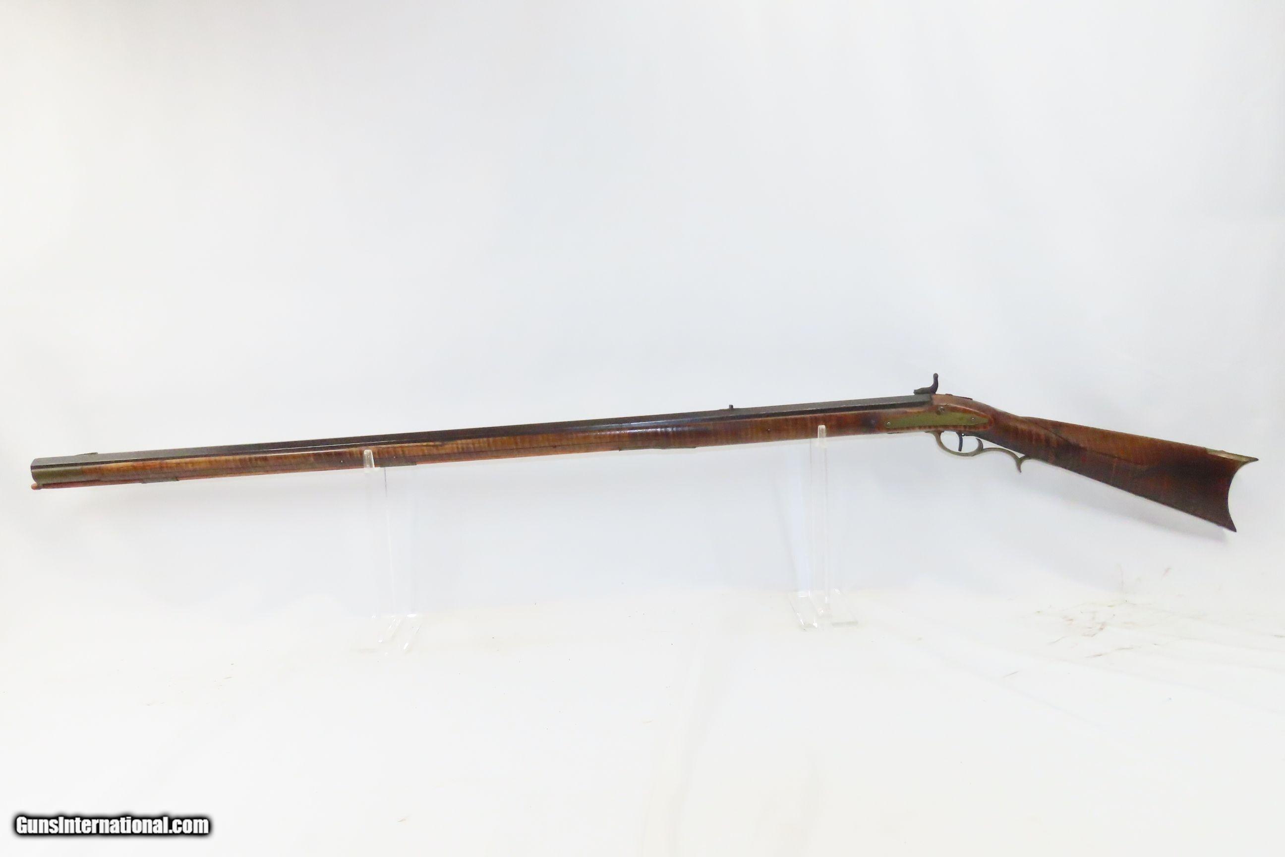 Description: WINCHESTER, VIRGINIA Long Rifle by J LAUCK .46 PIONEER HOMESTEAD VA Antique Shenandoah Valley, Frederick County Family of Makers Here we present an antique Long Rifle by Lauck, made circa the early-to-mid-1800s in Winchester, Virginia. The Lauck family produced multiple gunmakers in the Shenandoah Valley. Of the Lauck family of gunmakers, Gewirz lists Daniel, James, & Peter (1753), Simon (1795) Jacob (1816), John (1820), William (1840), and William P. (1850). The family were known for their choice of wood for their stocks, as well as the incised carving done, with “C scroll” typical of their work. Large, pierced brass patchboxes with a 4-petaled flower finial were another hallmark. According to the Preservation of Historic Winchester group, the house and smithy of Simon Lauck still stands on South Loudoun Street. Simon, along with his brothers Peter (he owned the Red Lion Tavern) & Abraham fought in the Revolutionary War under General Washington. Local tradition has it that they were part of Daniel Morgan’s honor guard and, having German as one of their languages, were able to translate between their officers and captured Hessian soldiers. Gluckman & Satterlee note that at least one Lauck made long rifle is known to have been used by a Confederate soldier during the American Civil War, and it is highly likely that many more were as well, given the prolificity of the family’s production and the geographical position of this gunmaking center of Virginia. The overall condition is very good. Original finish. The action is strong. The bore is dusty and untouched with thin rifling. The barrel is signed “J. Lauck” on the top flat. The full-length stock is solid with nice striped maple grain and bearing incised scrolls. Nice, large, pierced patchbox typical of the family. This is a wonderful example of a Shenandoah rifle and of the Lauck family’s work in particular. Own the original! This is a legitimate antique and not a reproduction. Barrel is 40-1/4 inches. Caliber: .46 Percussion Overall condition as seen in photos. Very Fast. Very Safe. FREE SHIPPING WORLDWIDE. Delivered directly to your door by express mail! Guaranteed AUTHENTIC & Includes CERTIFICATE OF AUTHENTICITY. ancestryguns $4400 #230021 SOLD Antique: Yes |