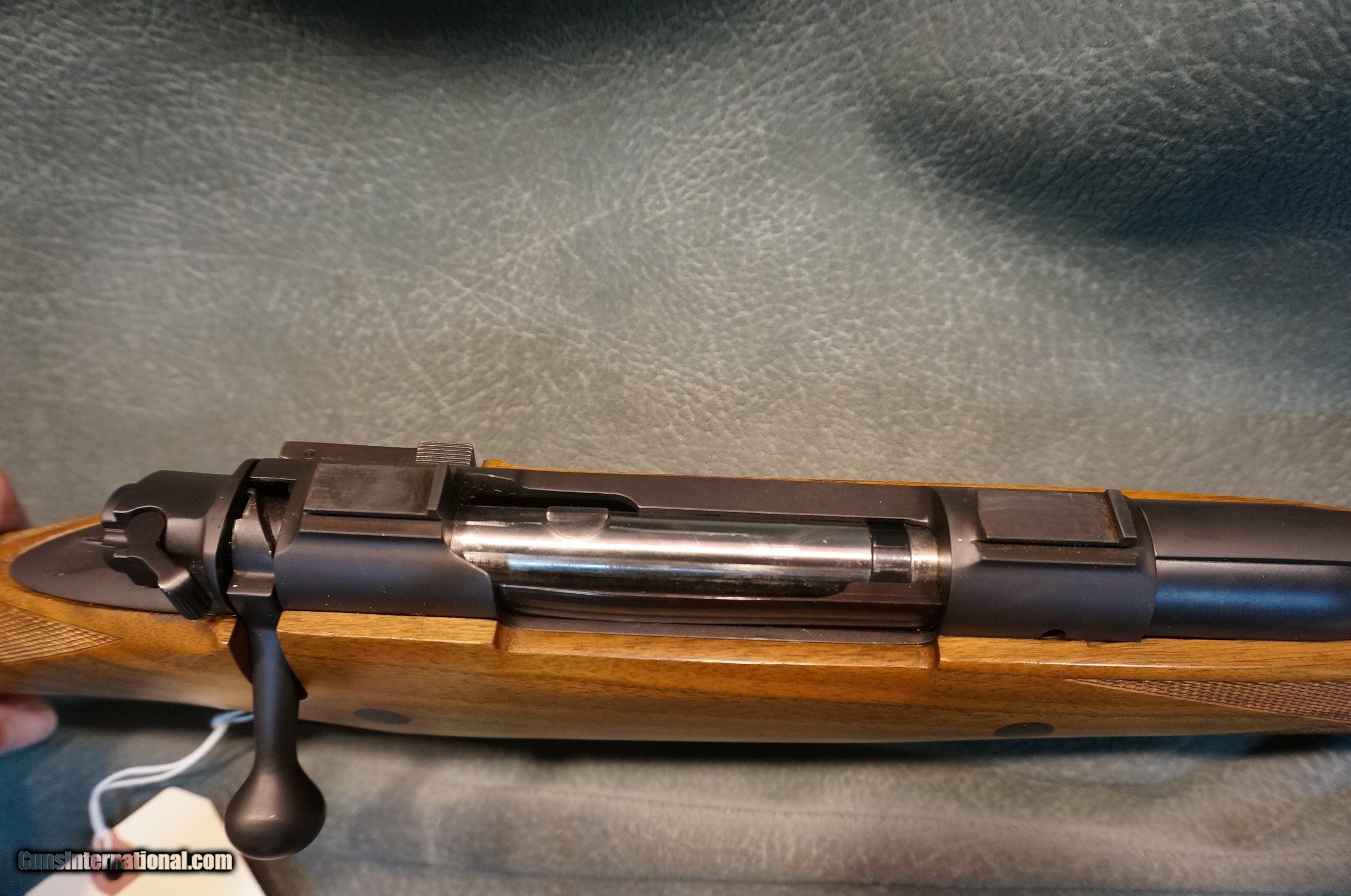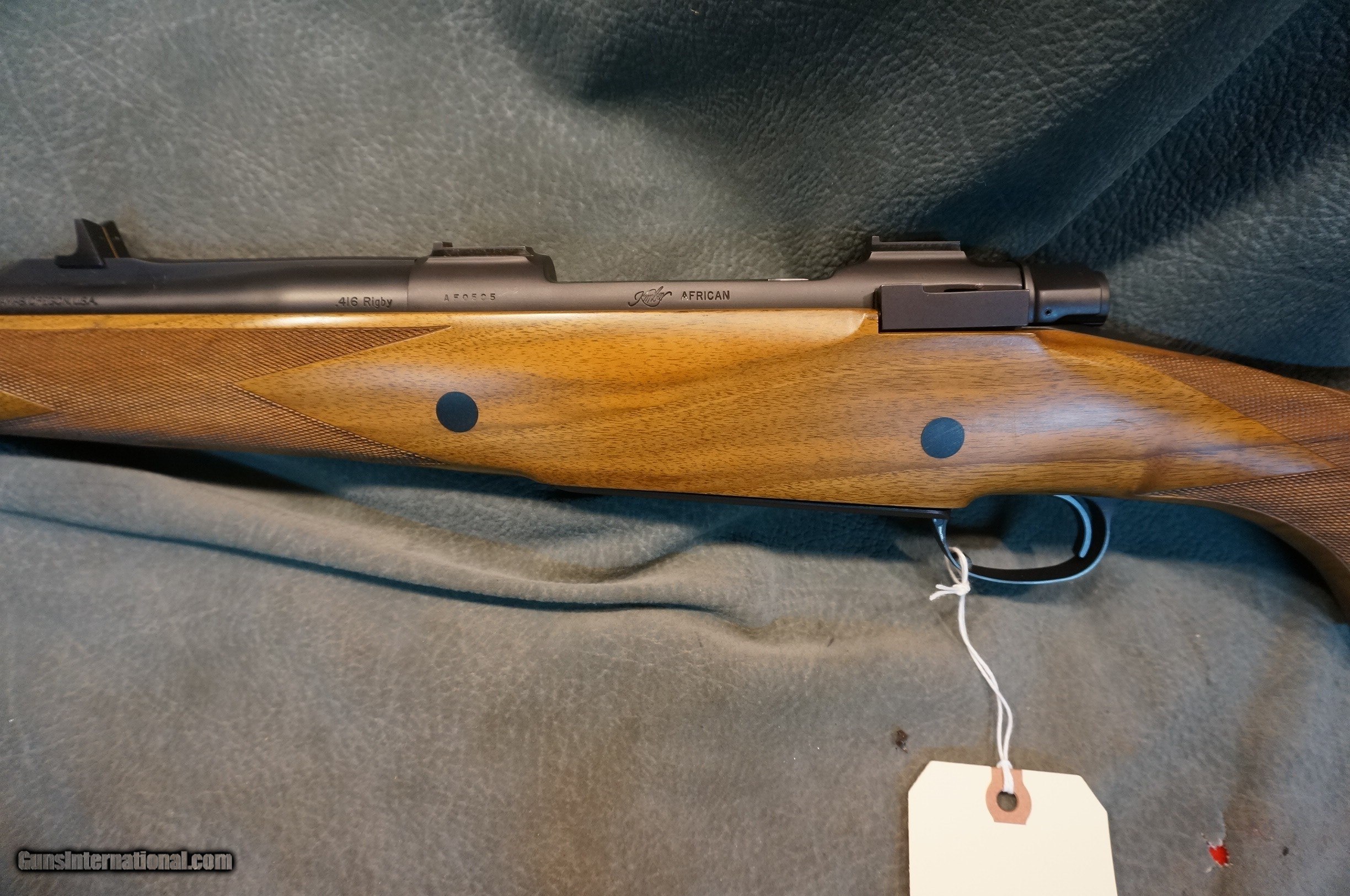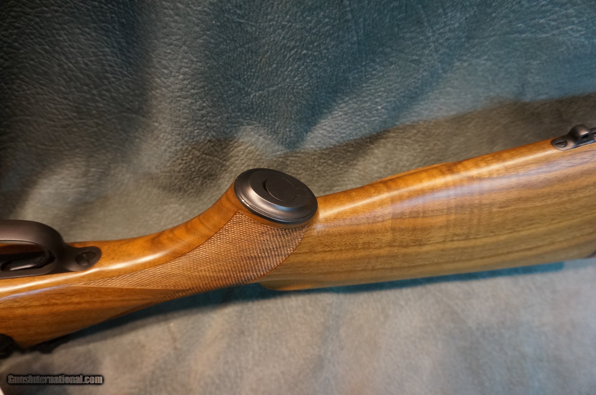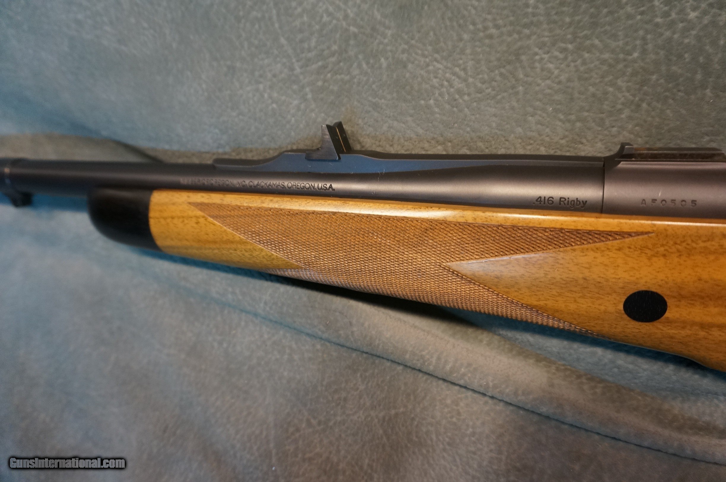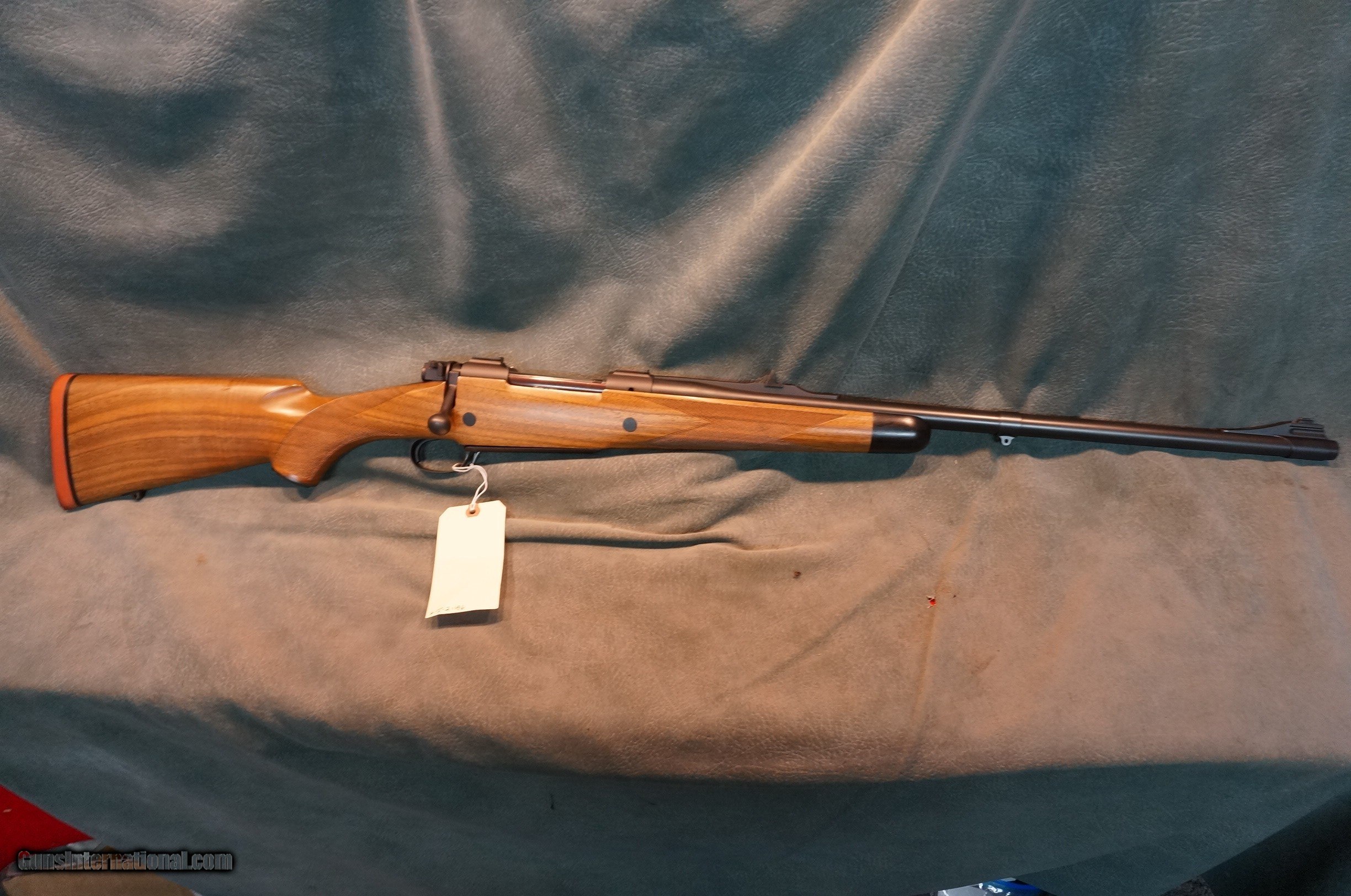 Description: Kimber of Oregon Model 89BGR 416 Rigby African,24" barrel with quarter rib rear sight with gold line,flip up banded front sight,double square bridge receiver,serial #AF0505,pretty wood,cheekpiece,wrap checkering,ebony forend tip,2 crossbolts,trap door grip cap with extra sight blade,inletted rear swivel and barrel band. GUN COLLECTIONS WANTED FOR CASH! We buy, sell, consign and trade new and used firearms.We will pay finders fees and travel for large collections. This is our 46th year in business. We offer 90 day layaways with 20% down. No return on layaways. Firearms will need to be transferred through a FFL dealer. Prices reflect a cash discount. There will be 3% added to credit card sales. We trade for gold and silver. THANK YOU! SOLD |