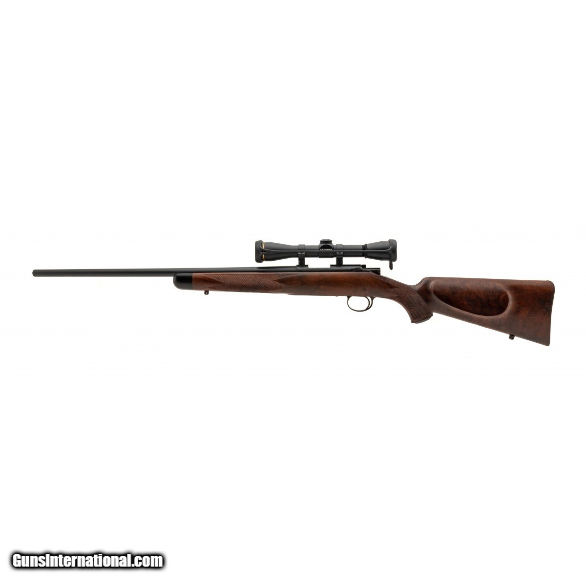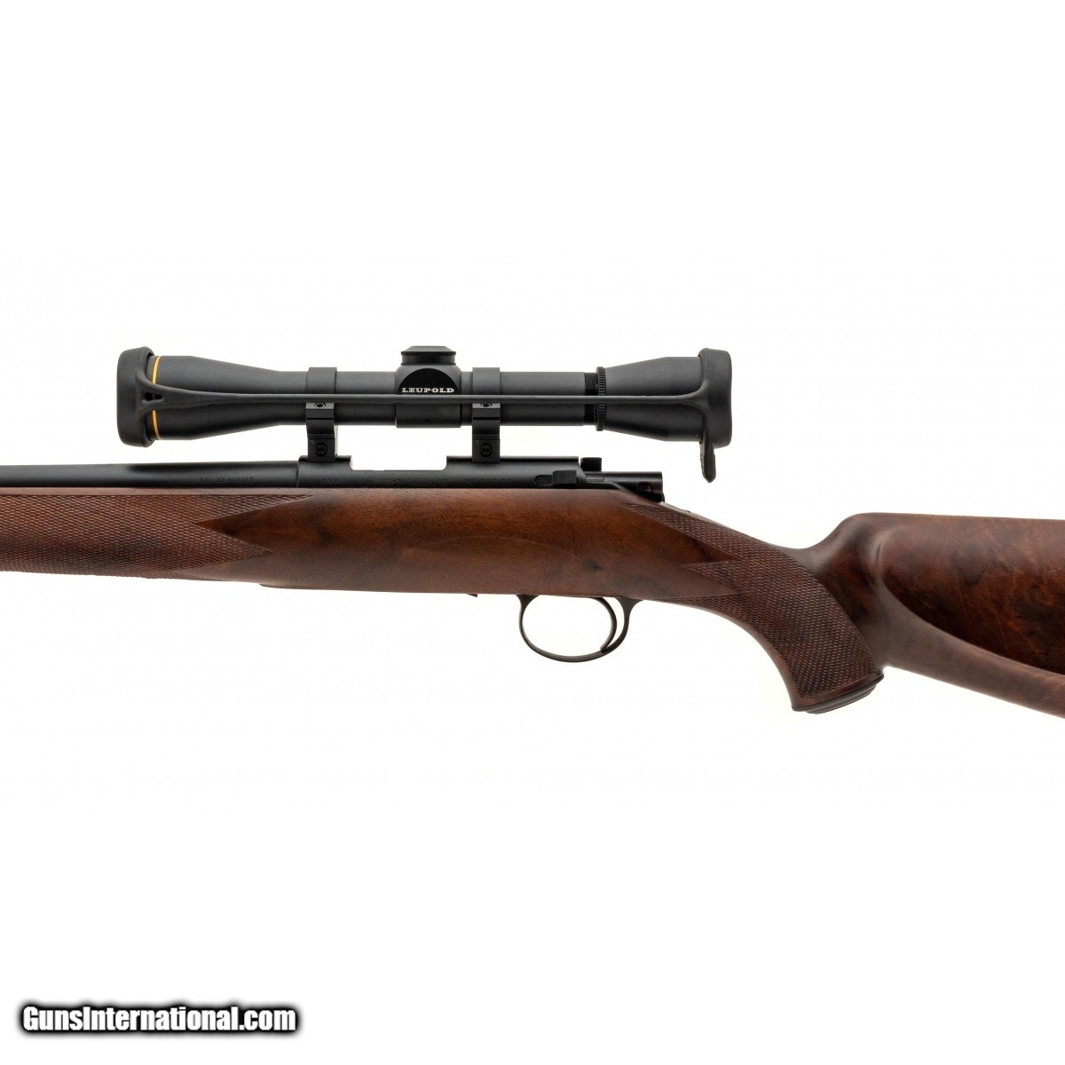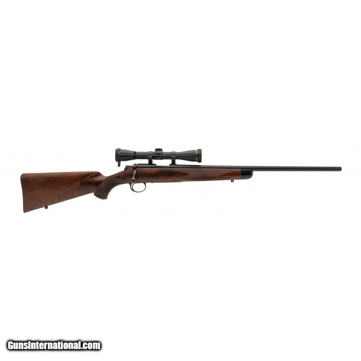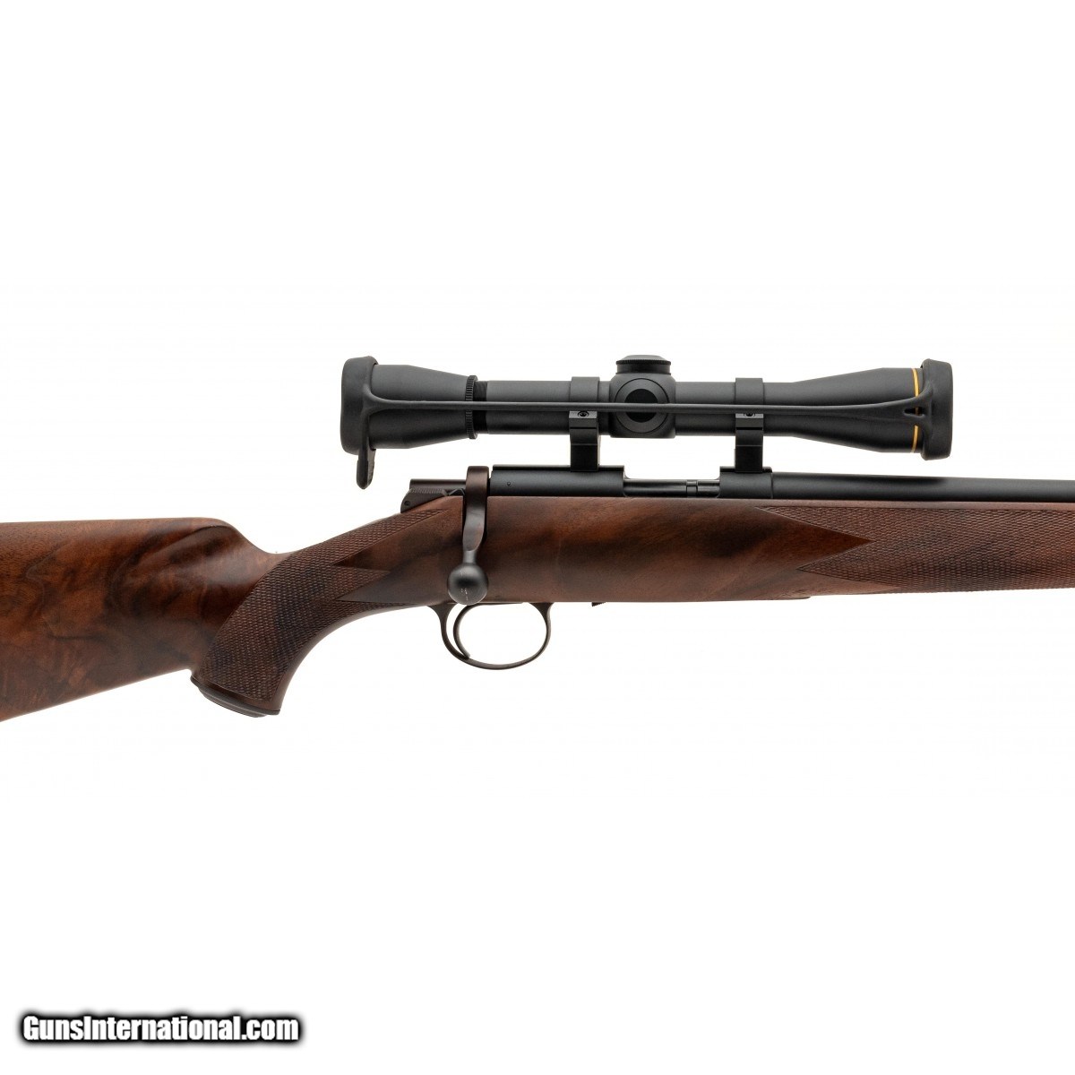 Description: " SN: HS7. 1980's production .22 Hornet with a 22"" barrel. Bore is excellent. Top of the line deluxe repeater sporting rifle with matte blue finish and figured walnut. Has been expertly refinished and is in excellent overall condition with some wear on the butt plate. Has a Leupold 4X scope. Consignment. SOLD |