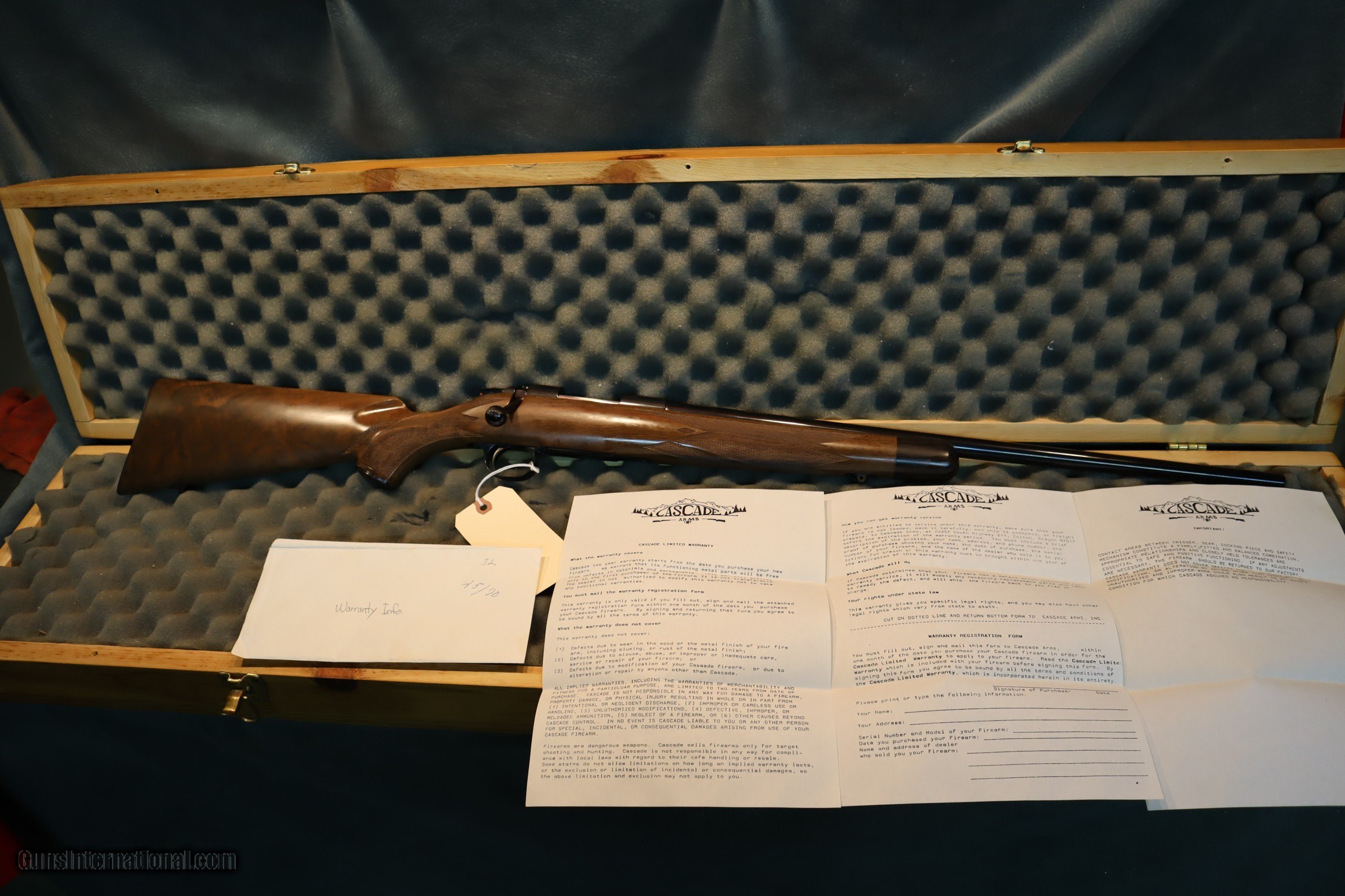 Description: Cascade Arms Excelsior 17 Mach IV 22" barrel,serial #014,fancy deluxe walnut stock with great color and figure,cheekpiece with shadow line,point wrap checkering with ribbons,ebony forend tip,niedner checkered steel buttplate,inletted swivels,skeleton grip cap,checkered bolt knob,with factory serial numbered wood box and warranty papers.Butch used to work at the Kimber of Oregon factory with Dan Cooper from Cooper rifles.Awesome rifle! GUN COLLECTIONS WANTED FOR CASH! We buy, sell, consign and trade new and used firearms.We will pay finders fees and travel for large collections. This is our 47th year in business. We offer 90 day layaways with 20% down. No return on layaways. Firearms will need to be transferred through a FFL dealer. Prices reflect a cash discount. There will be 3% added to credit card sales. We trade for gold and silver. THANK YOU! SOLD |